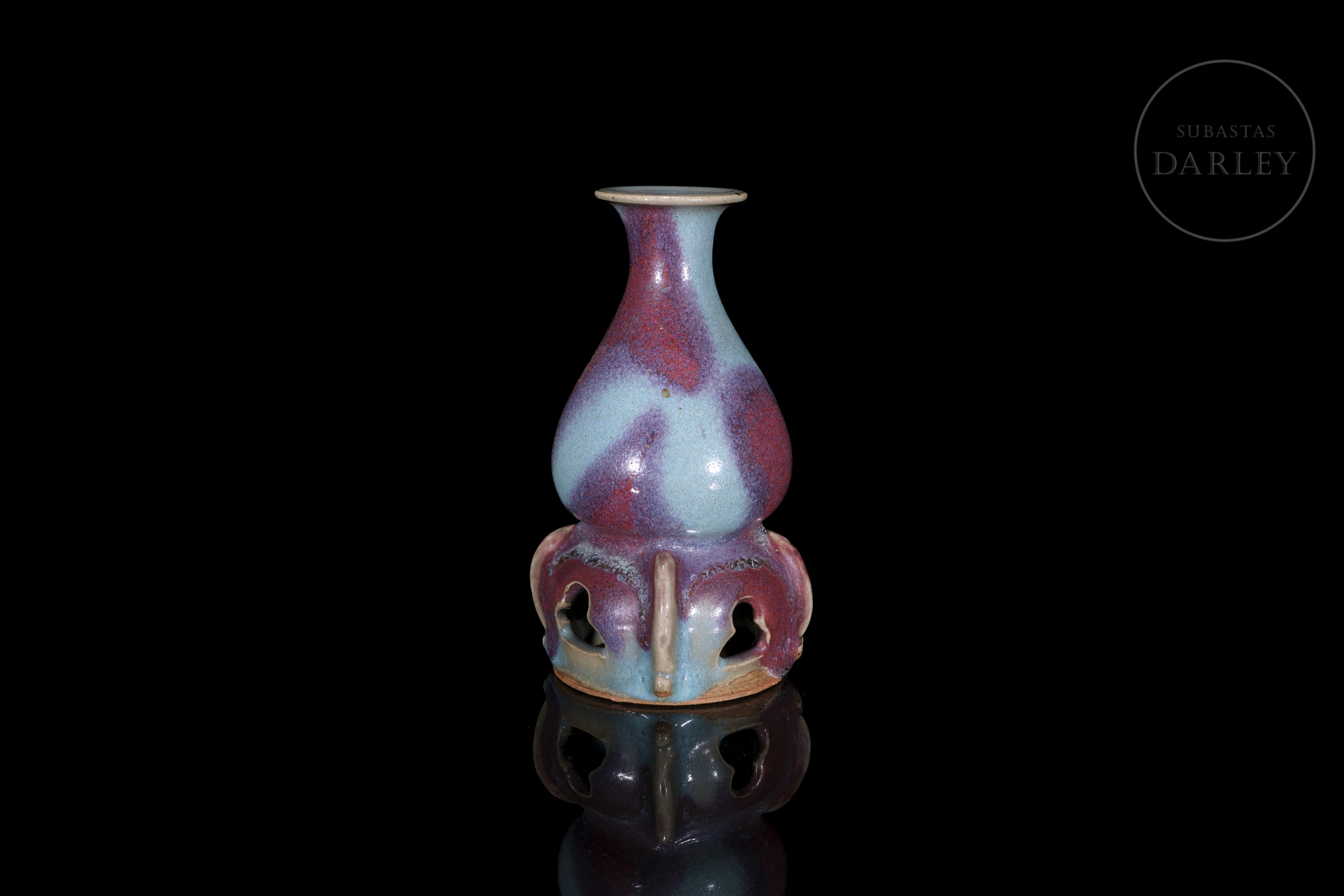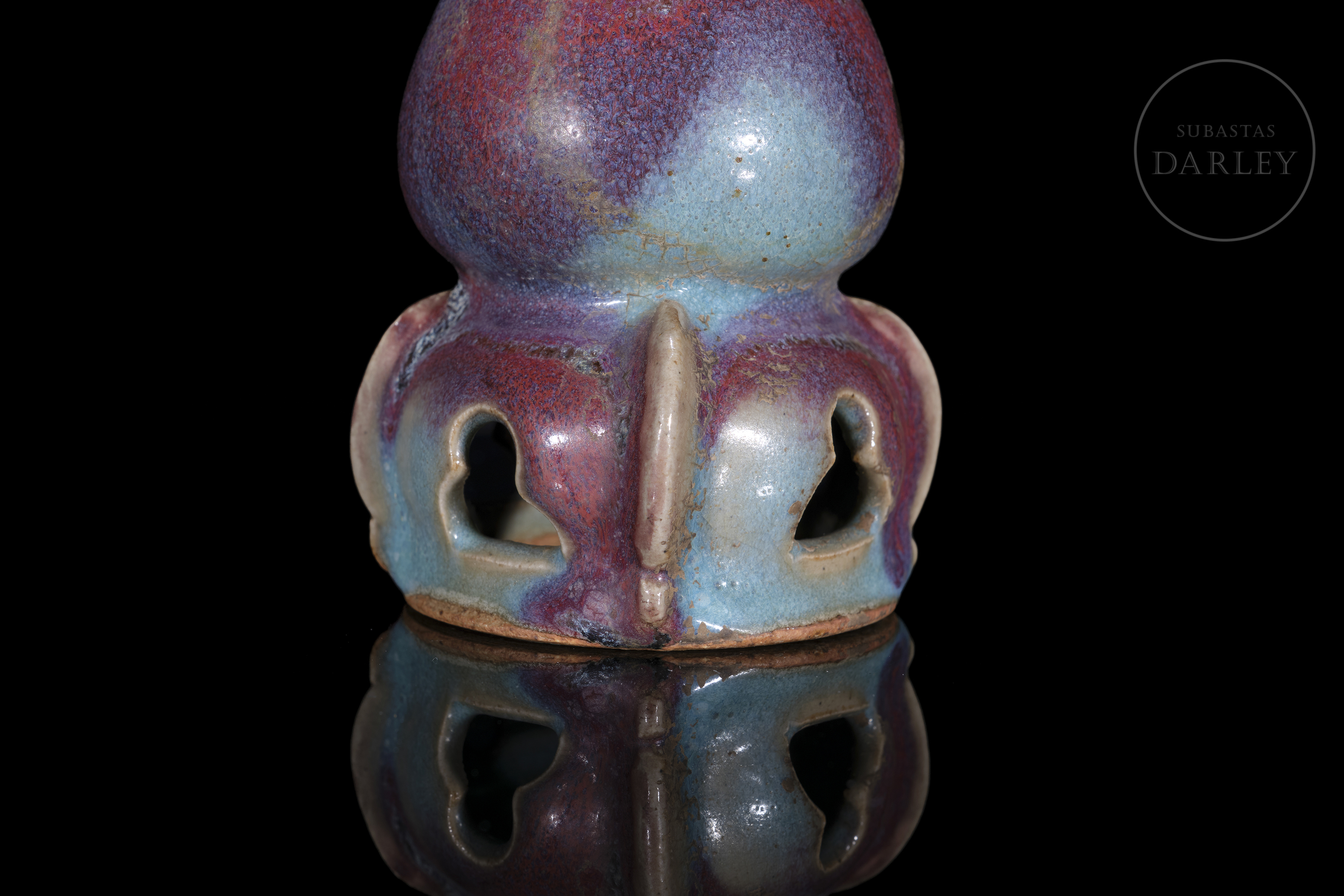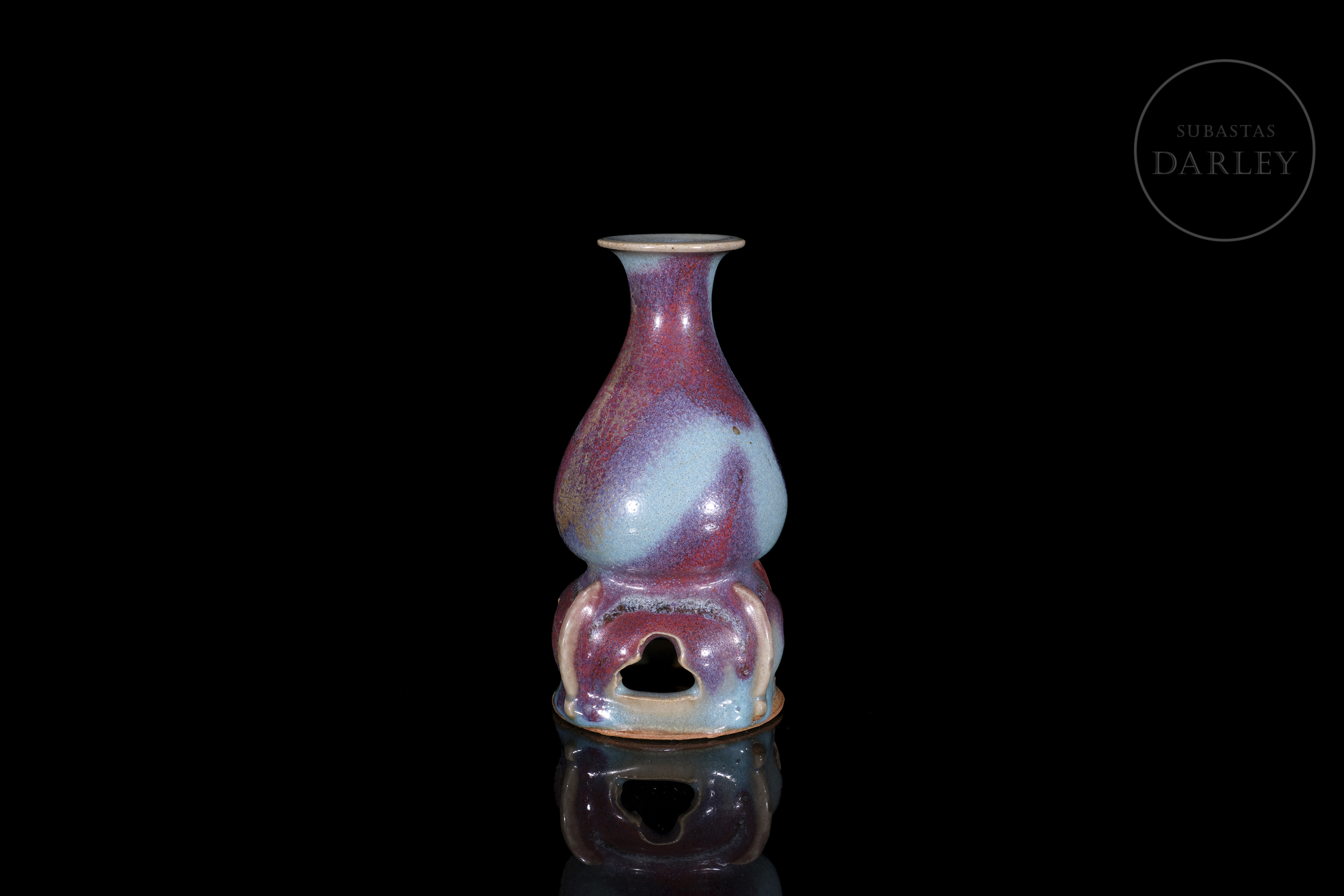 Realizado en gres, cubierto por un esmalte grueso y opulento de tonalidad azul cielo con intensas manchas de color púrpura. Presenta un cuerpo piriforme de cuello corto y boca expandida, que se asienta sobre una base calada de estilo arquitectónico. La base presenta cuatro aperturas caladas en forma de arco. Dinastía Song (960–1279) o posterior.
