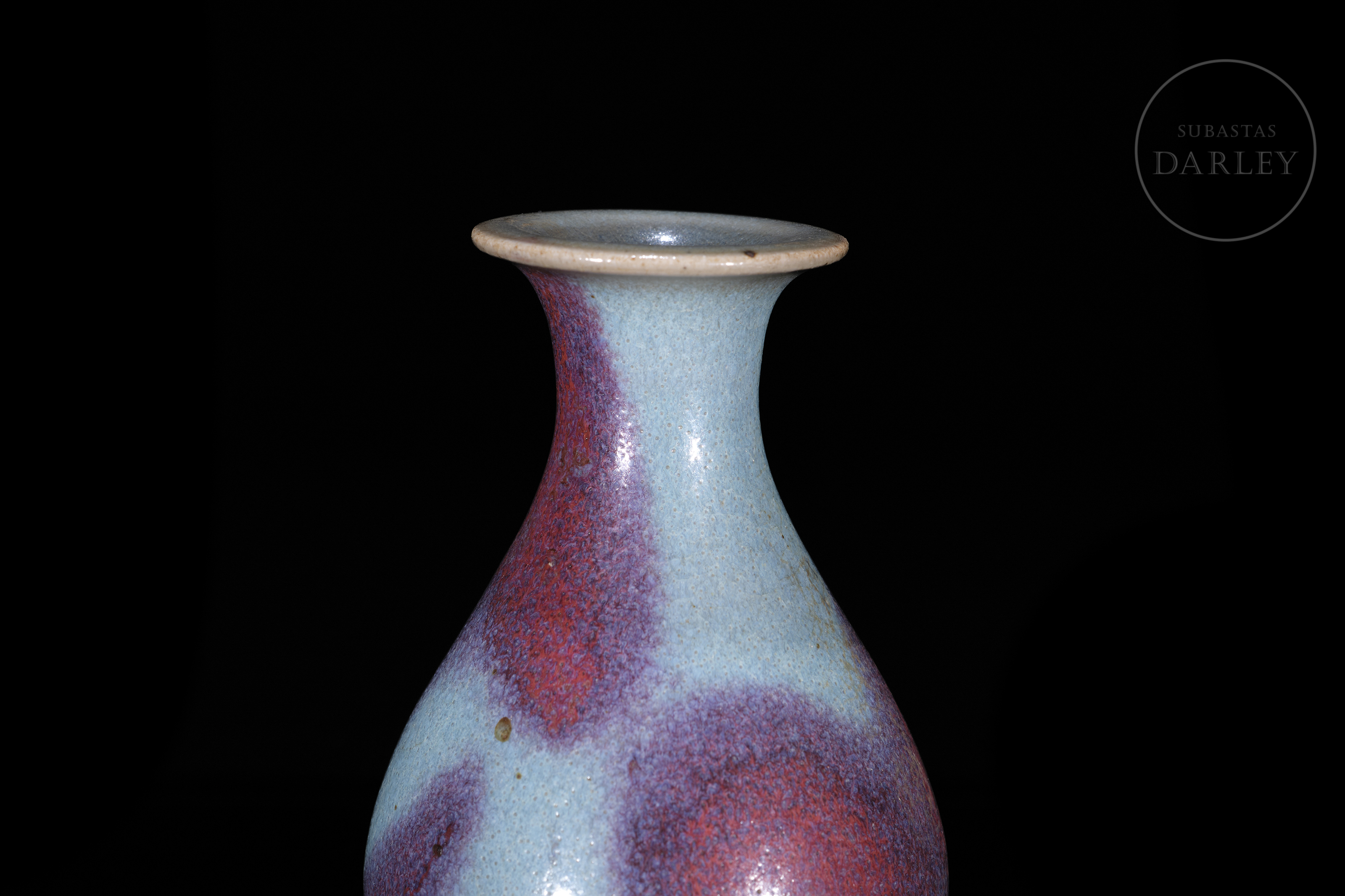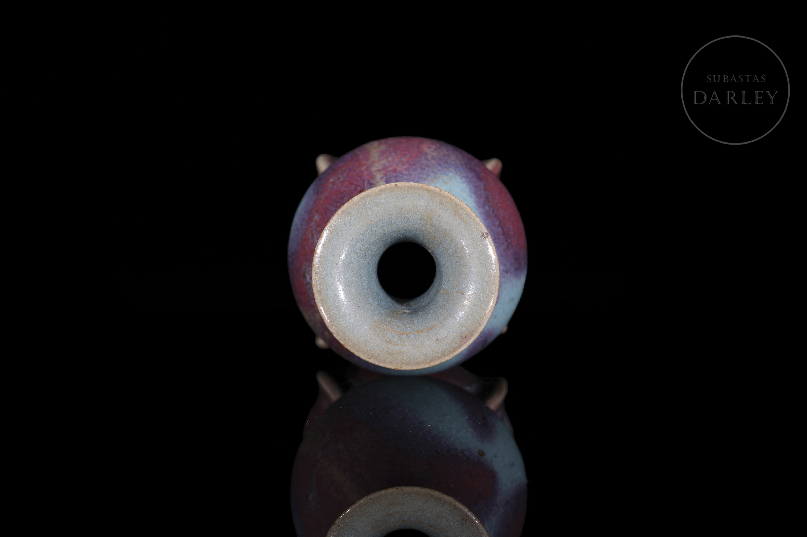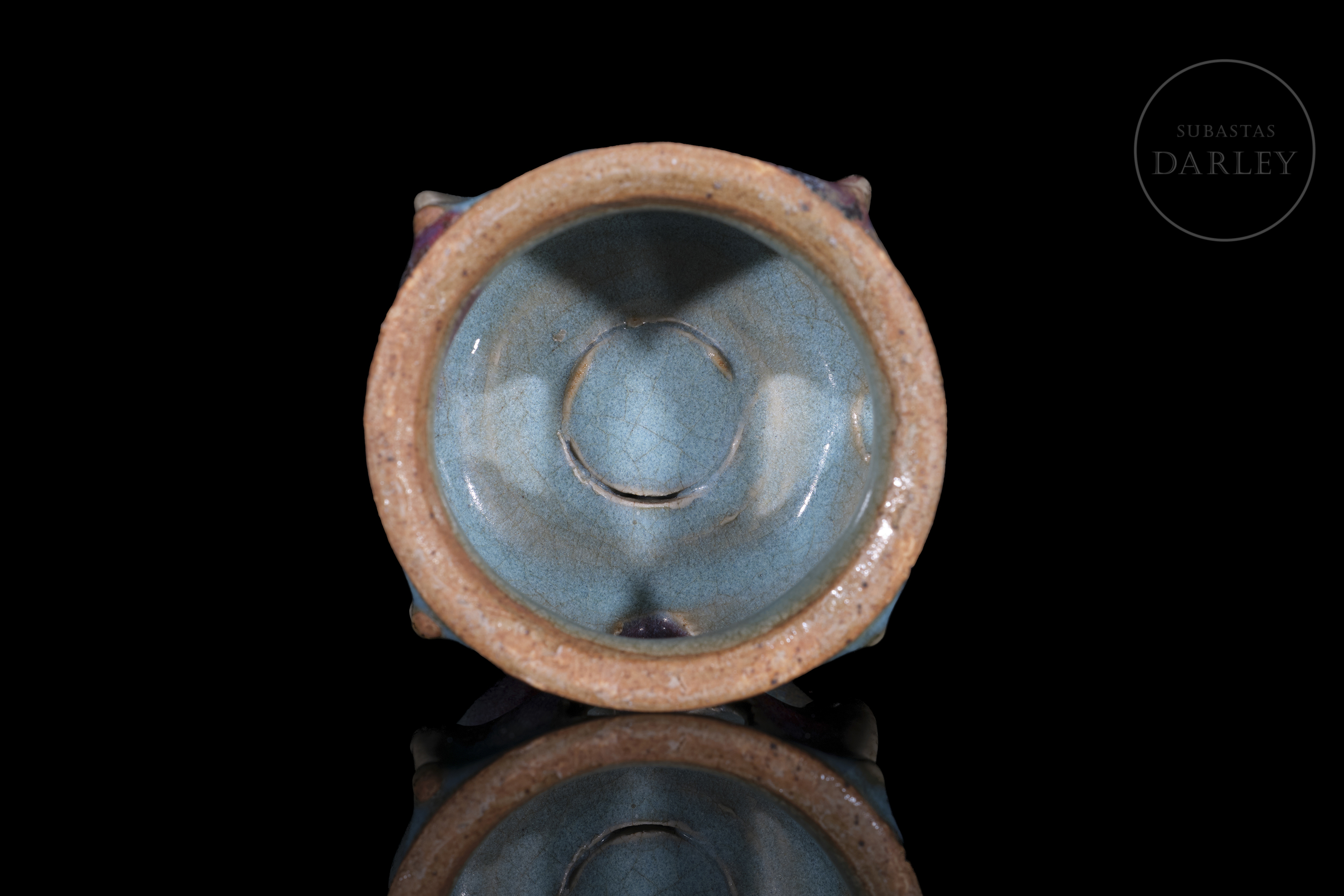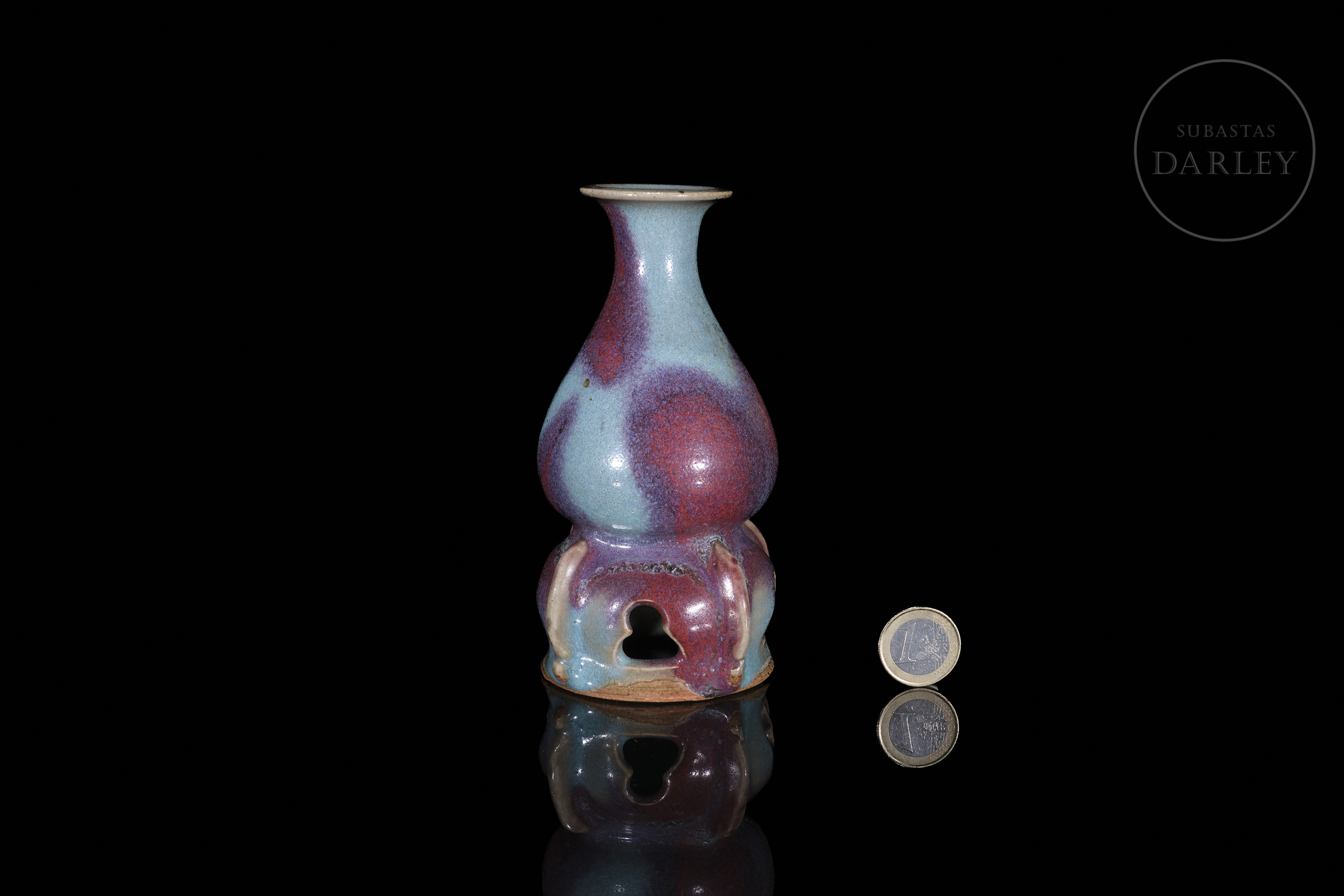 Realizado en gres, cubierto por un esmalte grueso y opulento de tonalidad azul cielo con intensas manchas de color púrpura. Presenta un cuerpo piriforme de cuello corto y boca expandida, que se asienta sobre una base calada de estilo arquitectónico. La base presenta cuatro aperturas caladas en forma de arco. Dinastía Song (960–1279) o posterior.