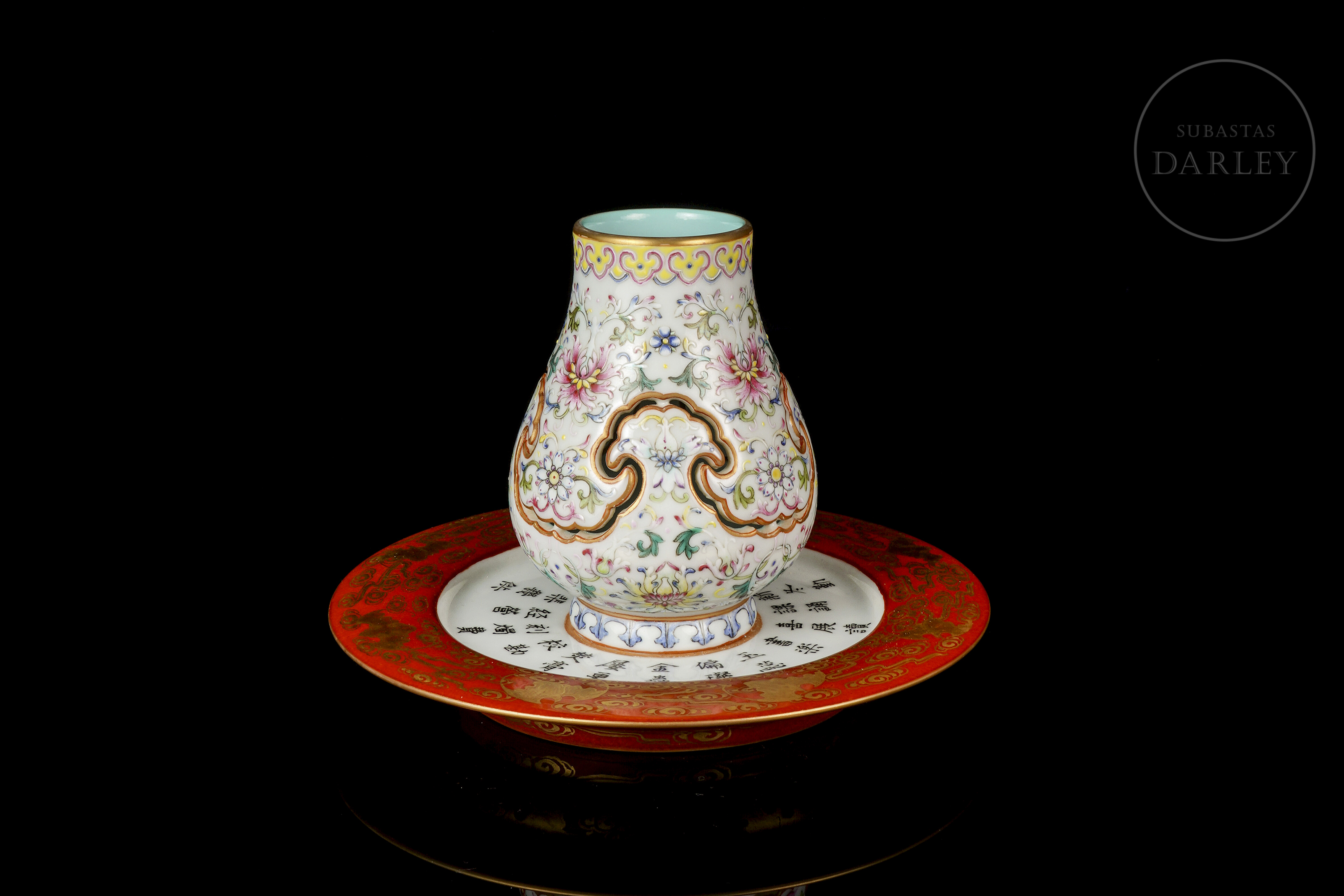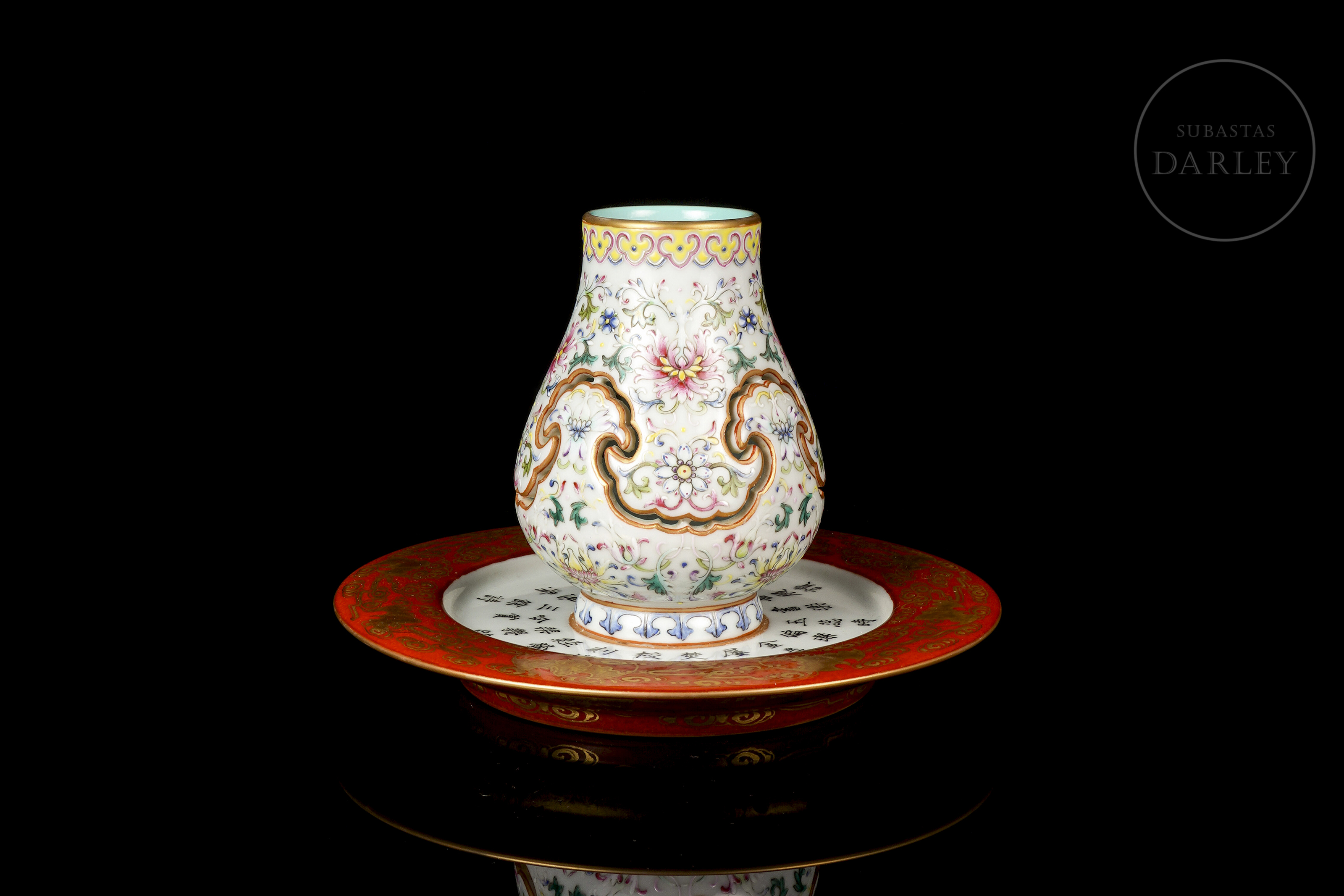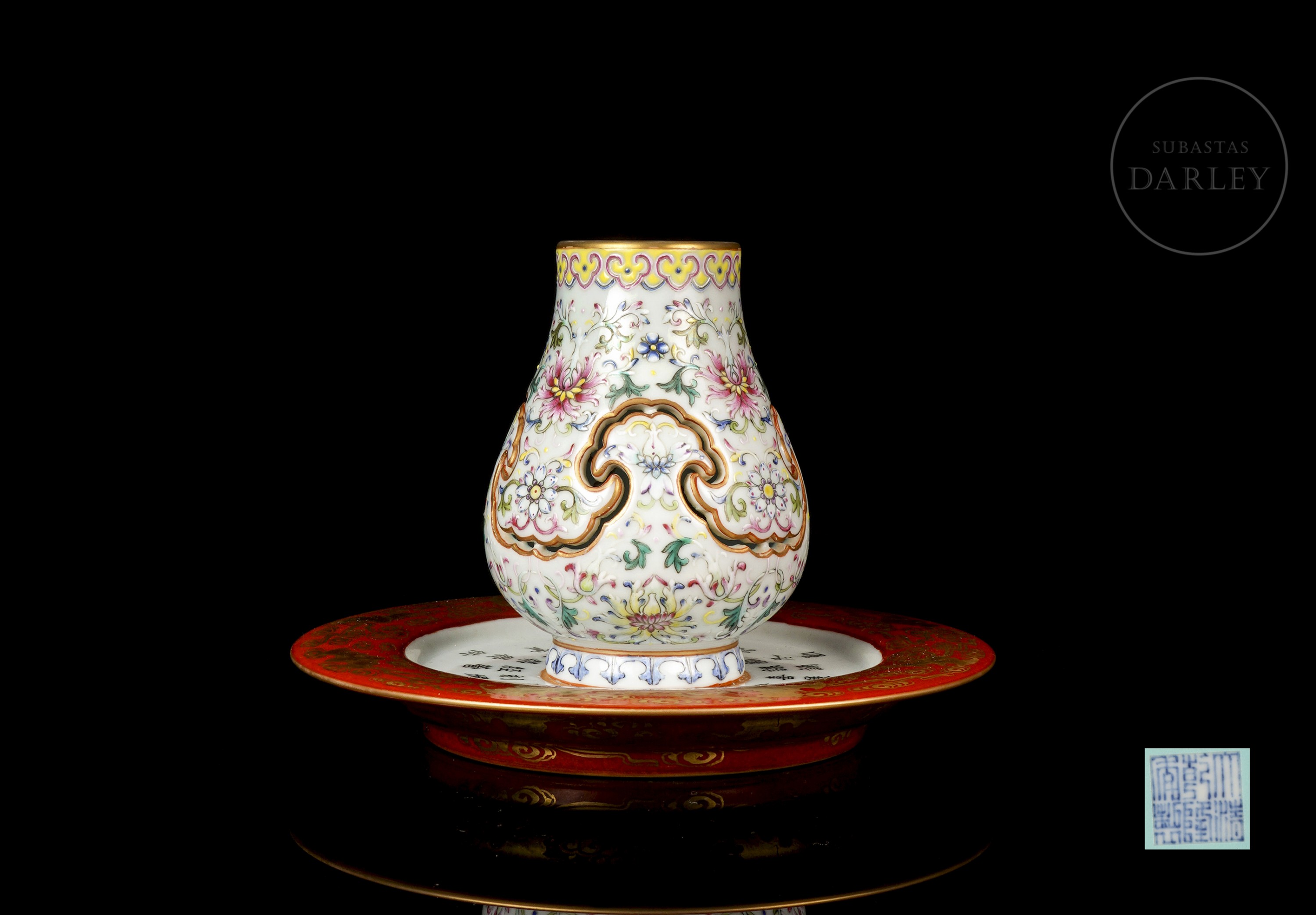 Conjunto de jarrón y plato-base en porcelana. El jarrón, de tipo jiaotai ping, está decorado en la paleta de la familia rosa con roleos florales y medallones calados. La base presenta inscripciones y un borde rojo y dorado. Contiene el sello de seis caracteres “大清乾隆年制”.