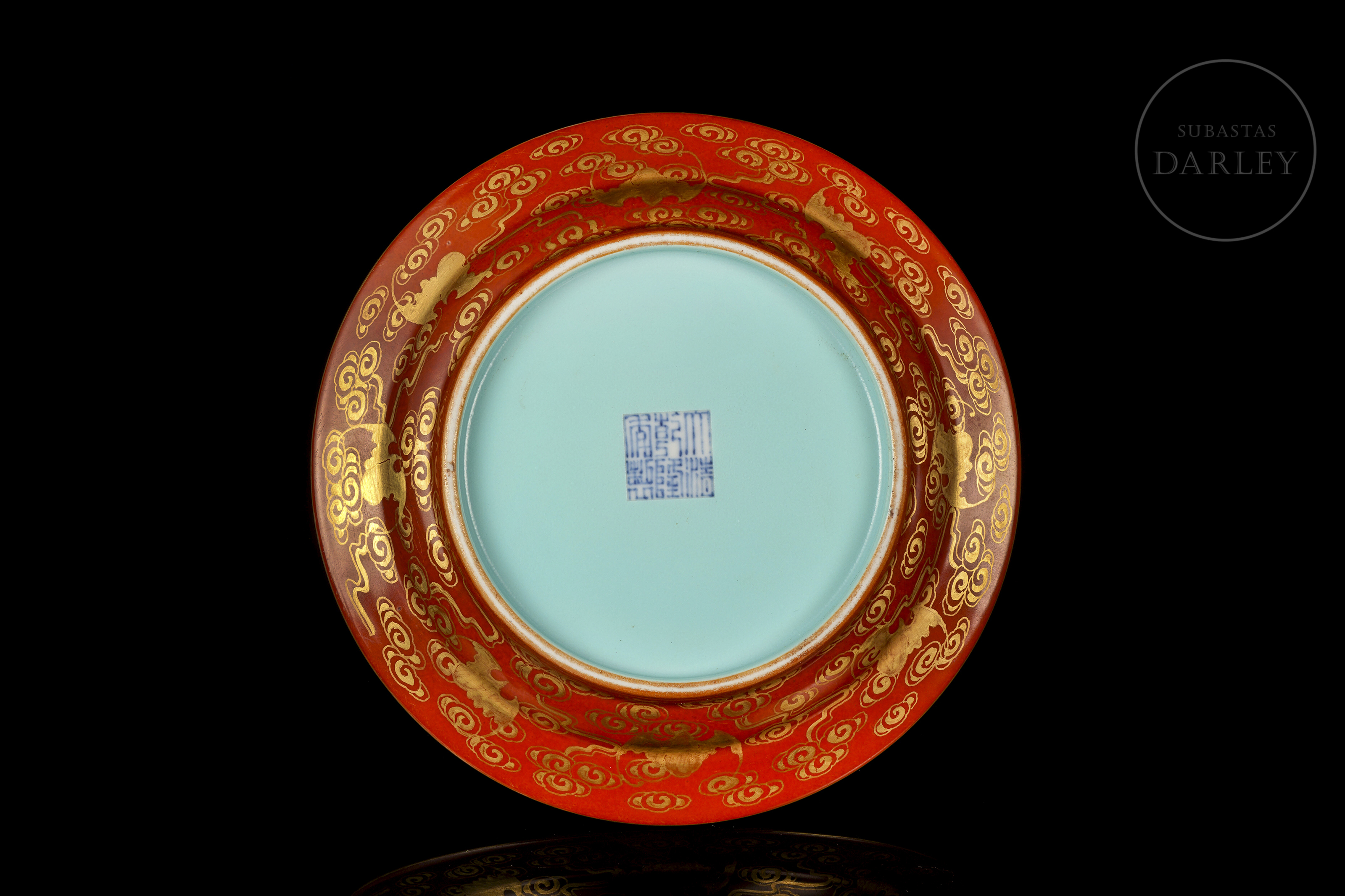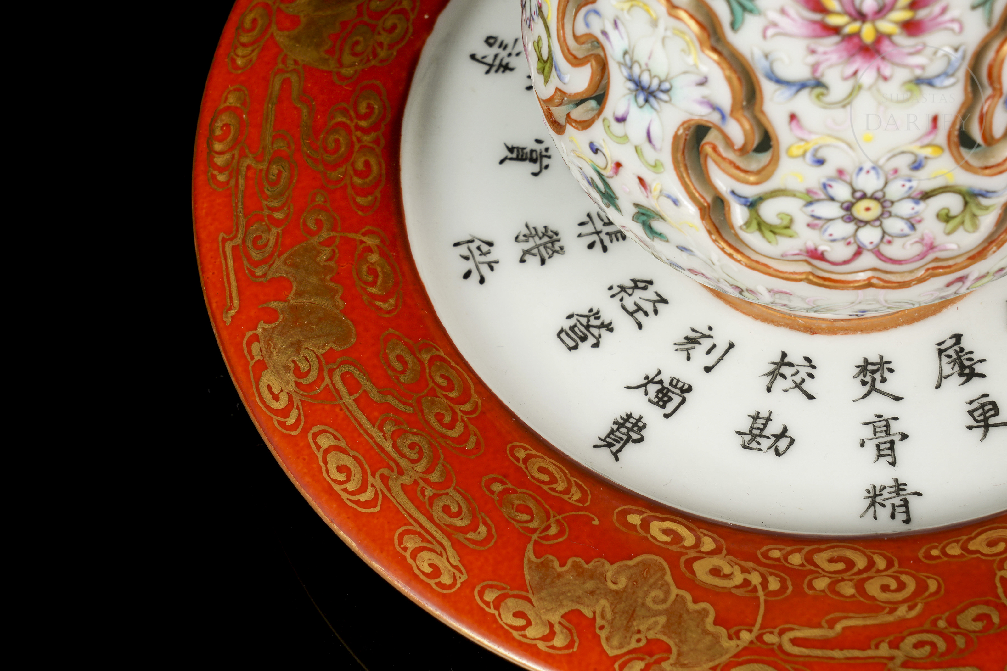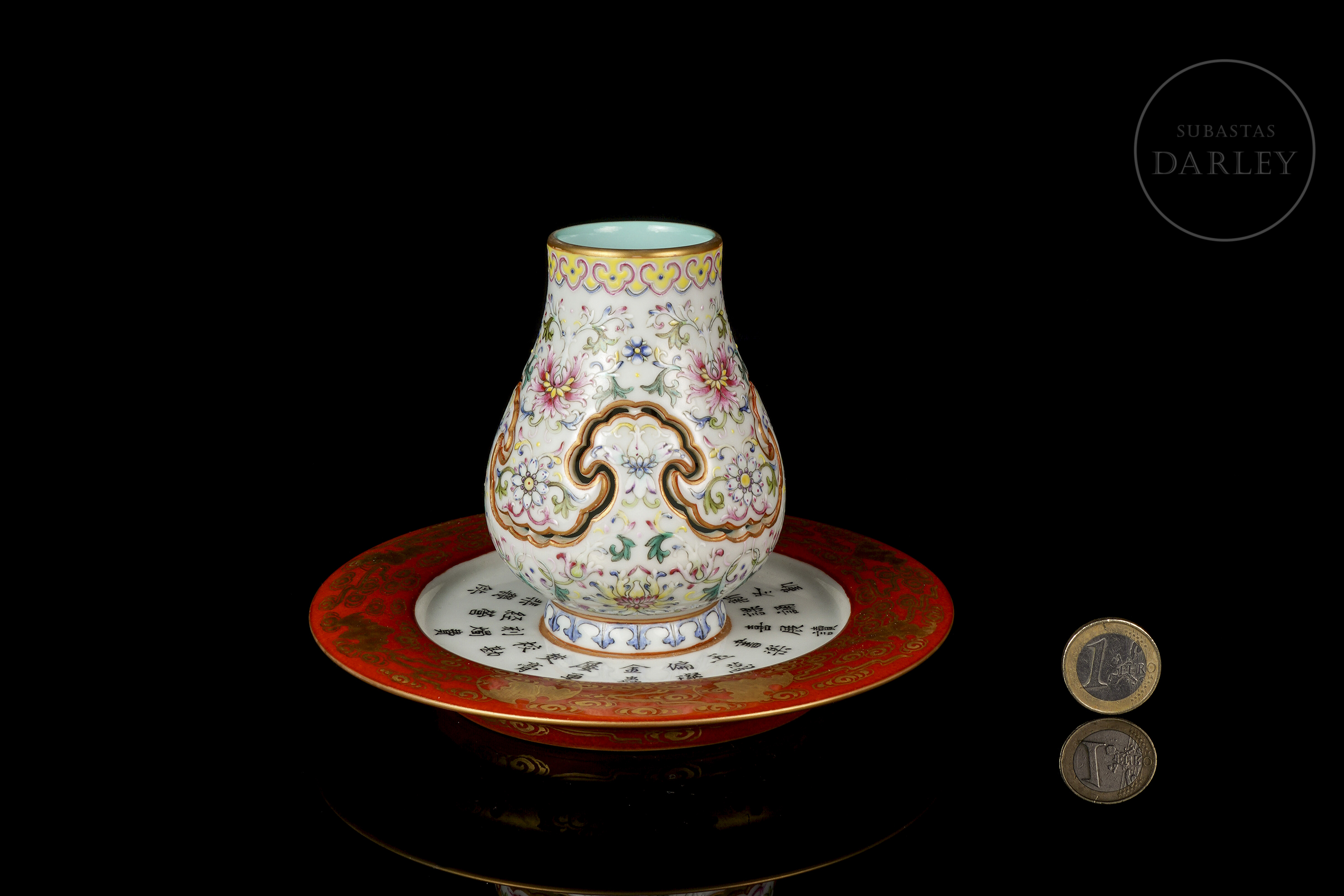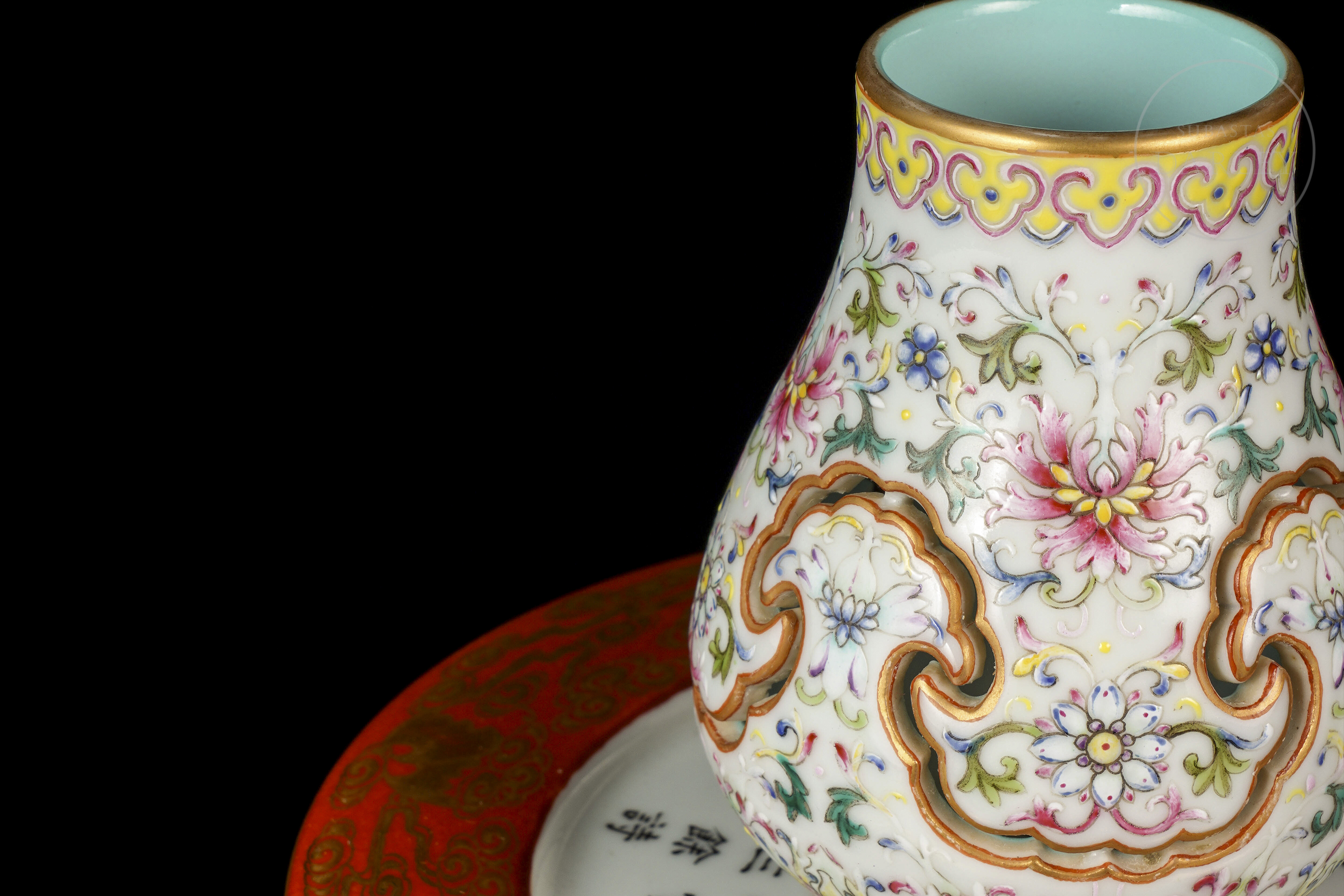 Conjunto de jarrón y plato-base en porcelana. El jarrón, de tipo jiaotai ping, está decorado en la paleta de la familia rosa con roleos florales y medallones calados. La base presenta inscripciones y un borde rojo y dorado. Contiene el sello de seis caracteres “大清乾隆年制”.