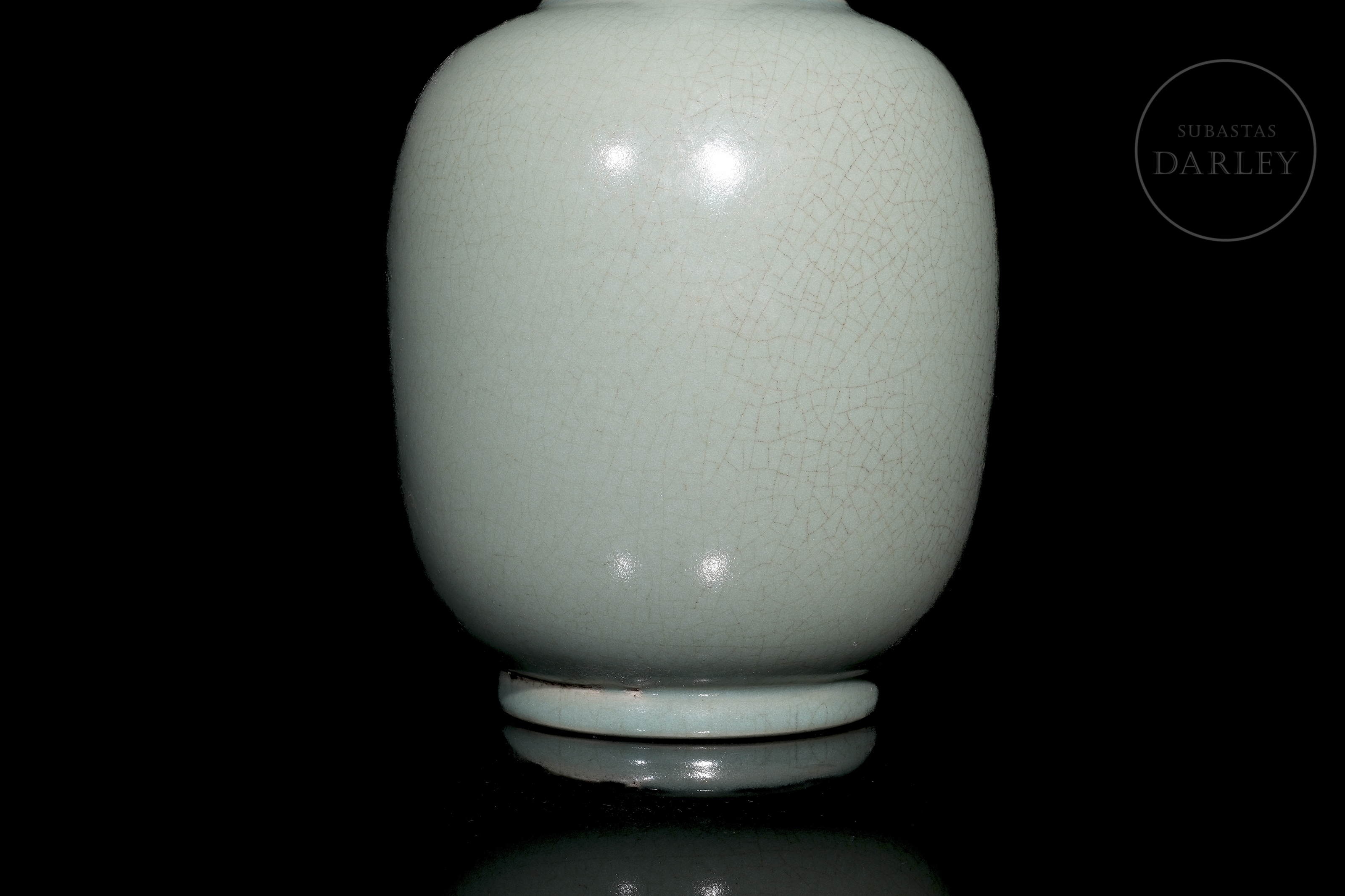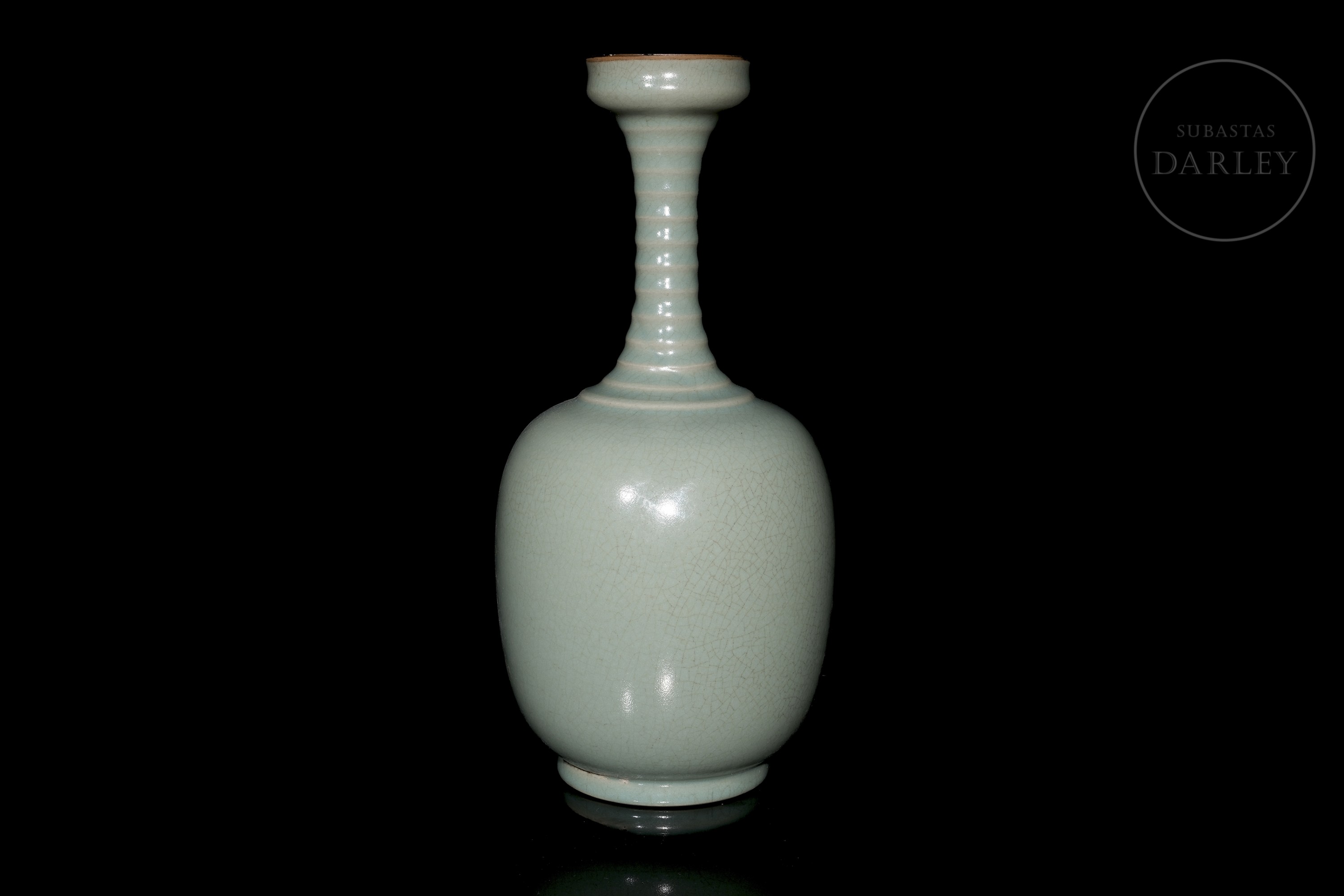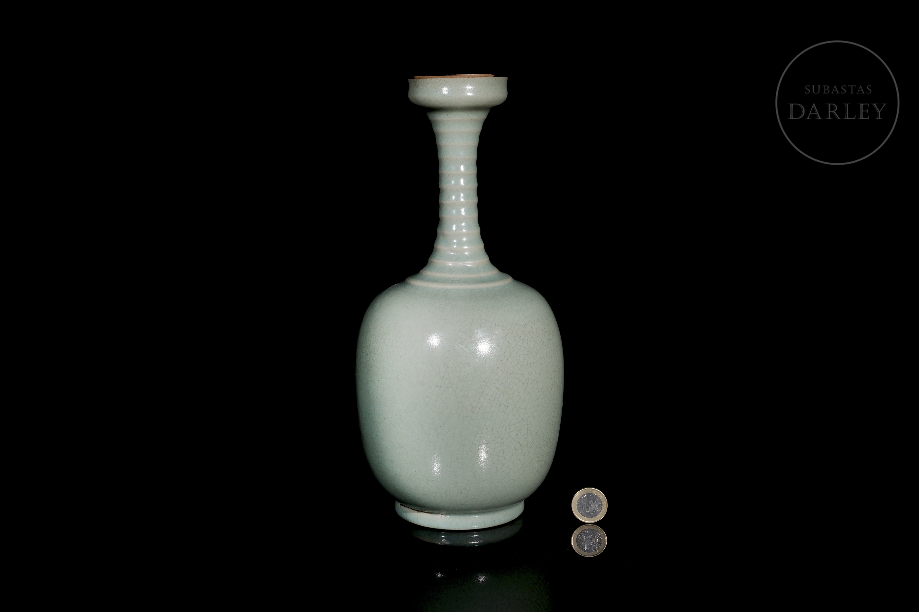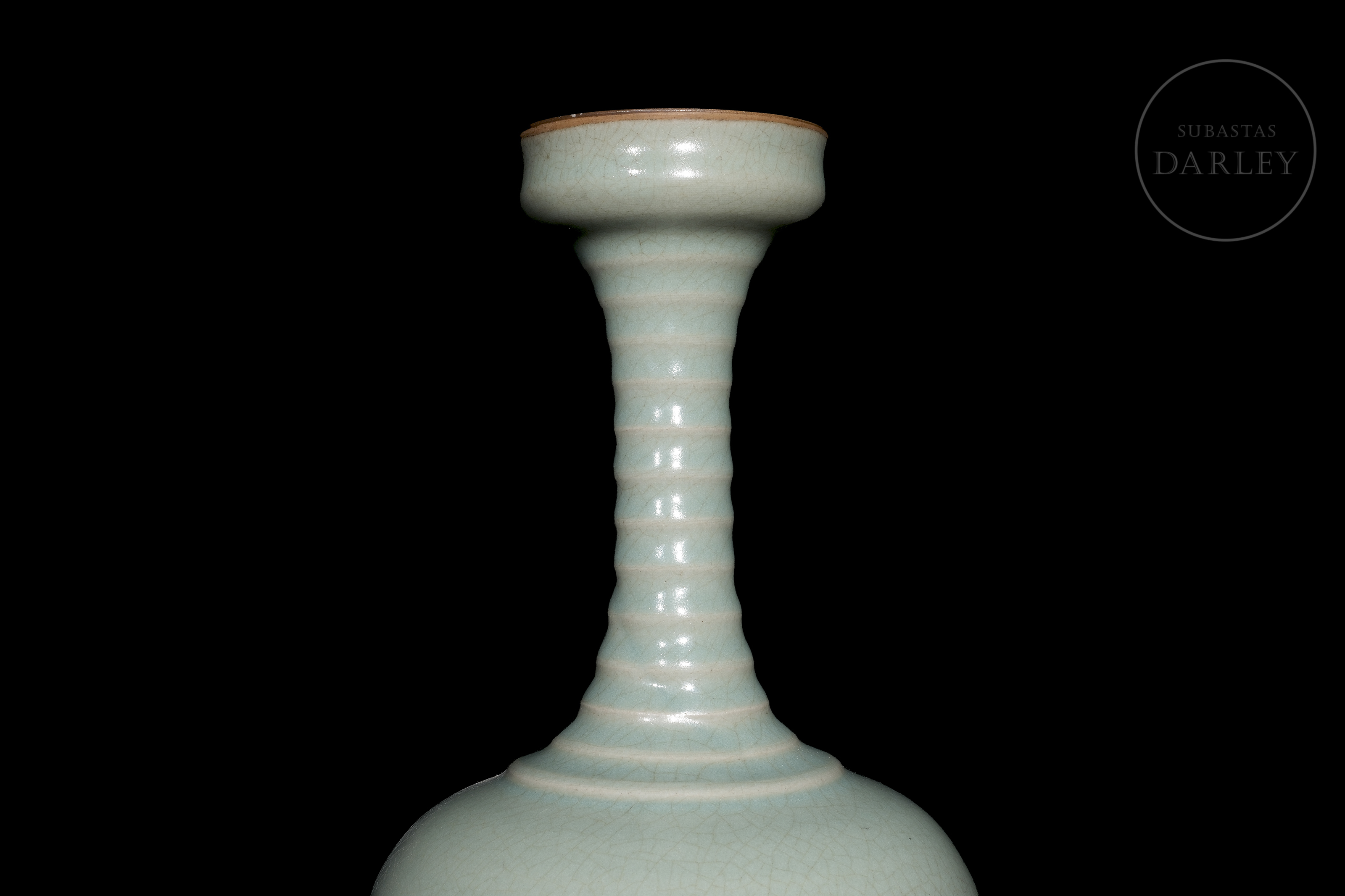 Elegante jarrón de porcelana de cuerpo globular y un cuello alto y esbelto, decorado con una superposición de finos anillos horizontales en relieve a modo de "marcas de cuerda" (xianwen). La pieza está cubierta por un esmalte de color celadón grisáceo, con una fina red de craquelado en toda su superficie. Dinastía Song (960 - 1279) o posterior.