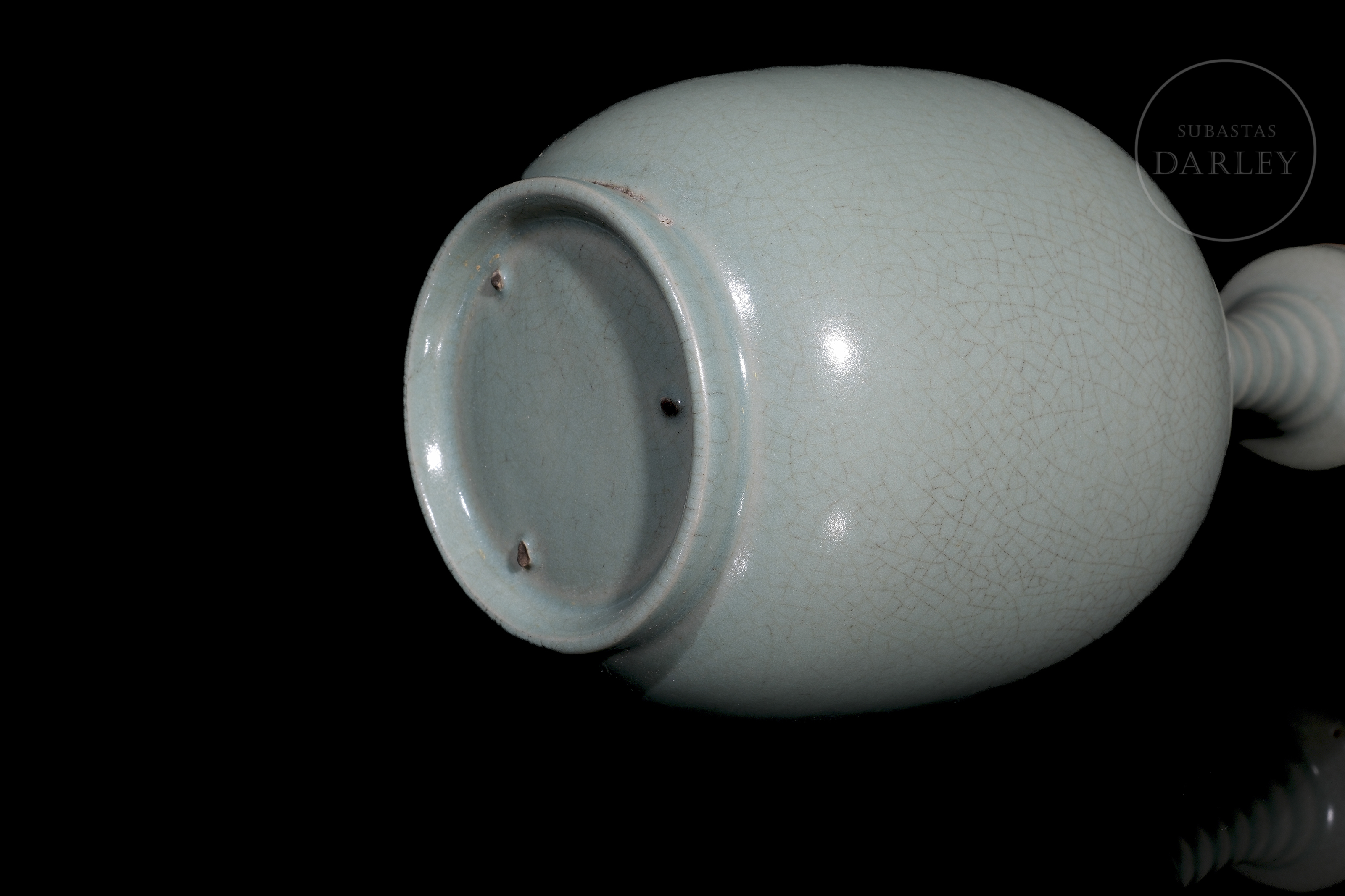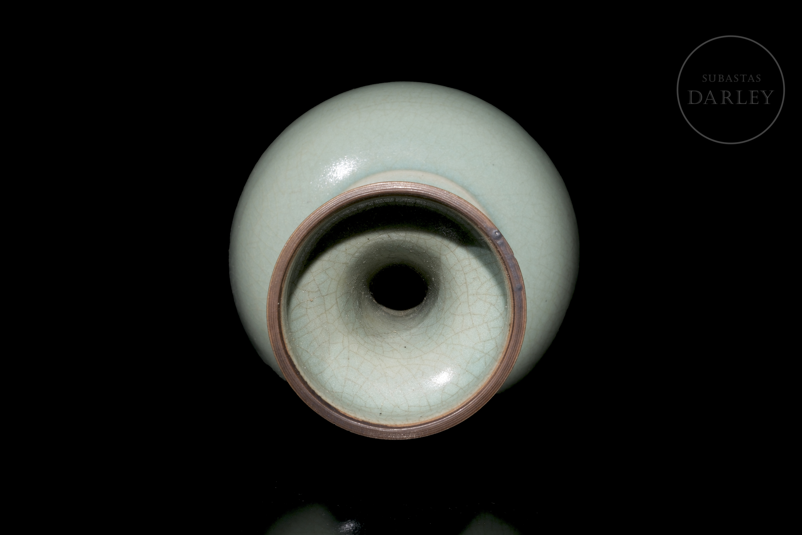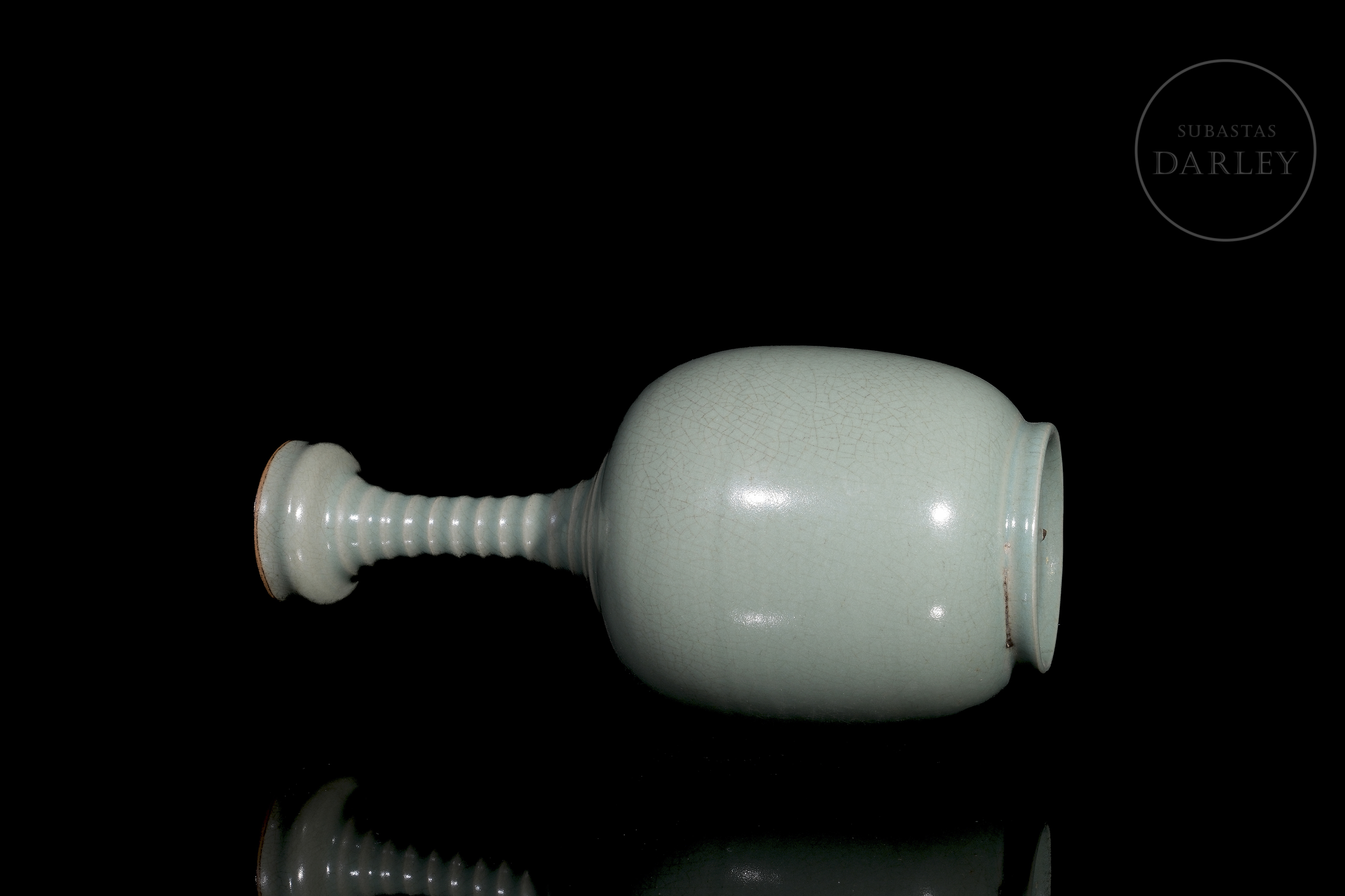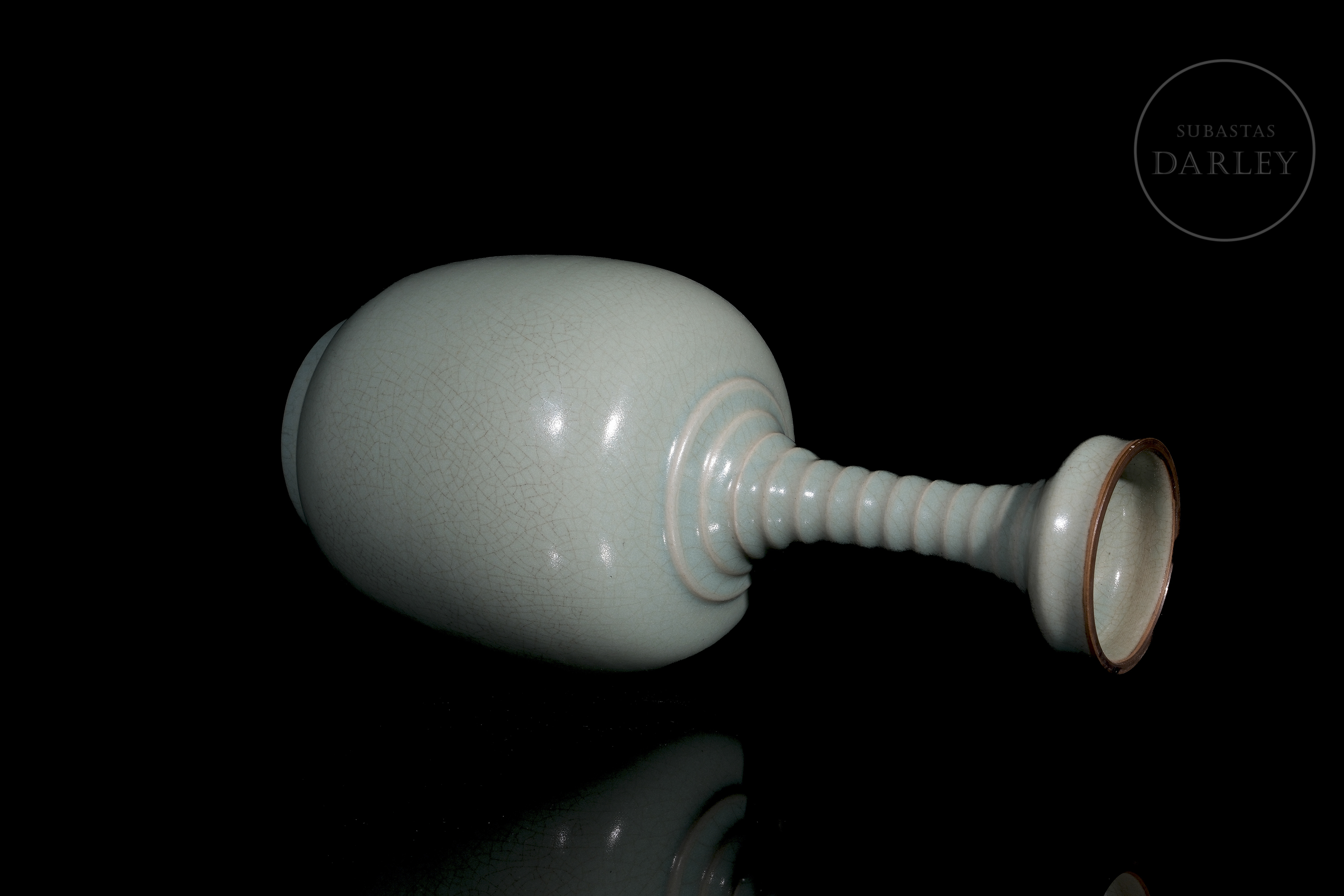 Elegante jarrón de porcelana de cuerpo globular y un cuello alto y esbelto, decorado con una superposición de finos anillos horizontales en relieve a modo de "marcas de cuerda" (xianwen). La pieza está cubierta por un esmalte de color celadón grisáceo, con una fina red de craquelado en toda su superficie. Dinastía Song (960 - 1279) o posterior.
