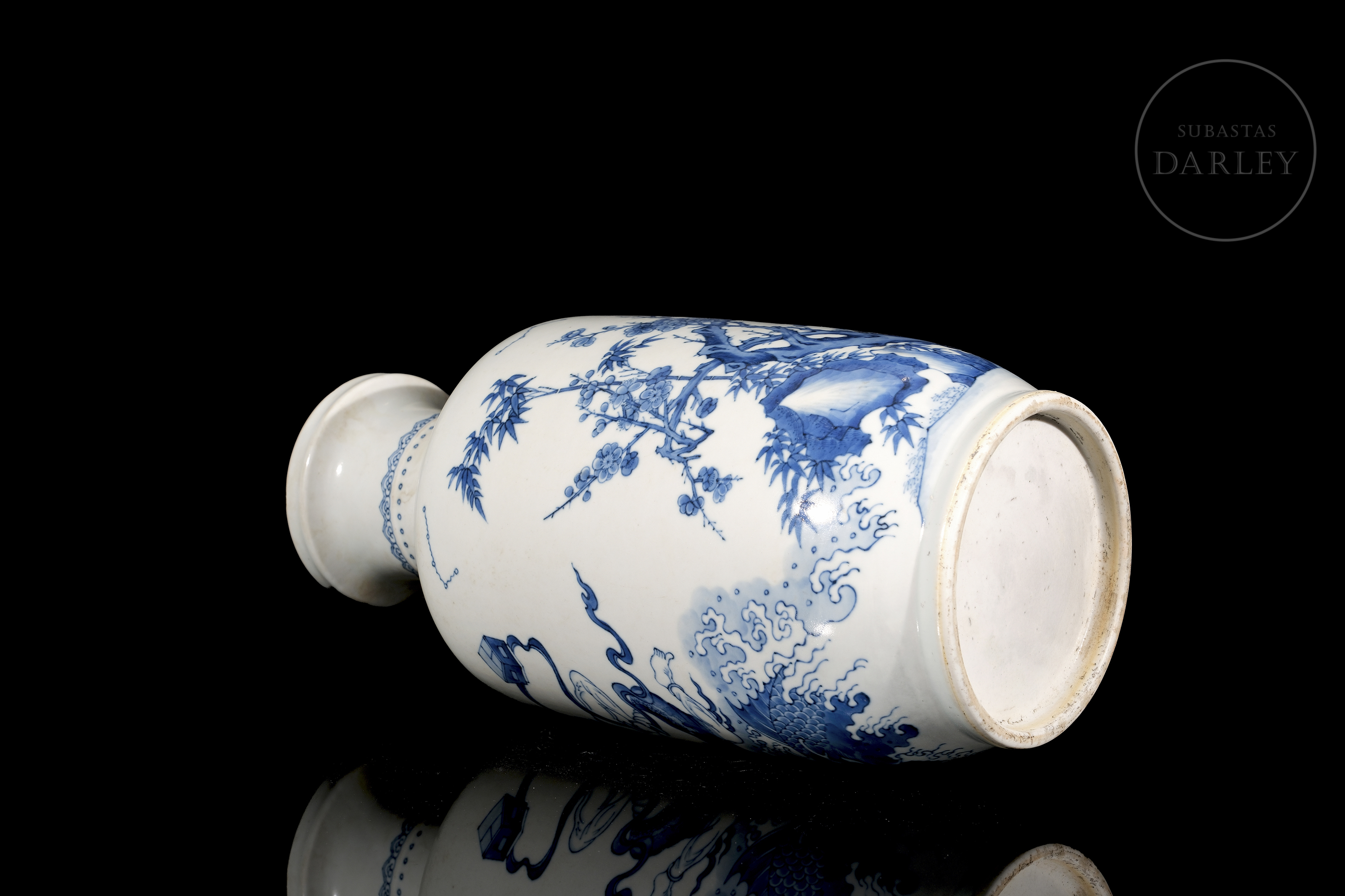 Jarrón de porcelana de tipo abalaustrado, con hombros anchos y cuello corto. Pintado en un intenso azul cobalto con una escena continua con una deidad inmortal, que se desplaza sobre un mar embravecido. La otra cara muestra una escena más serena con un gran prunus en flor junto a rocas y una grulla.
