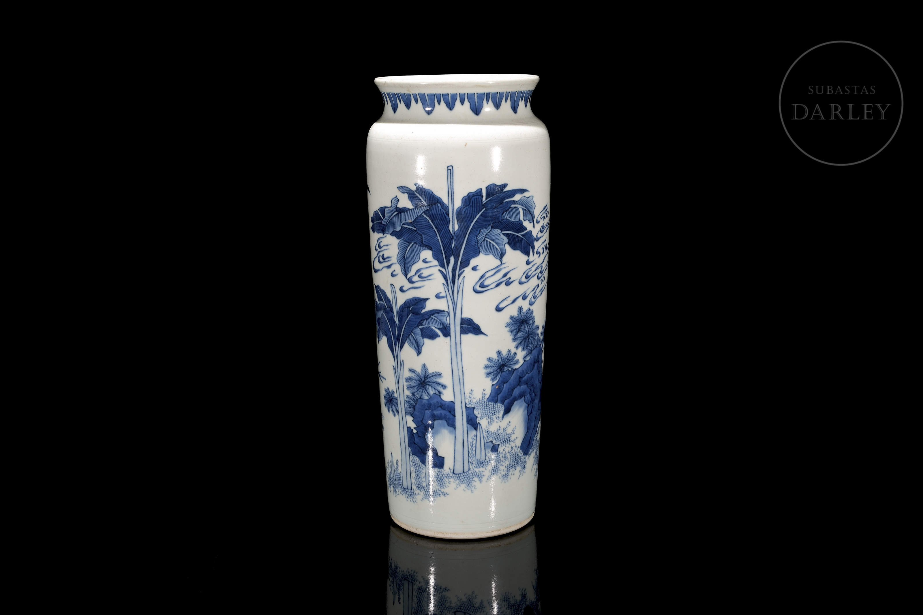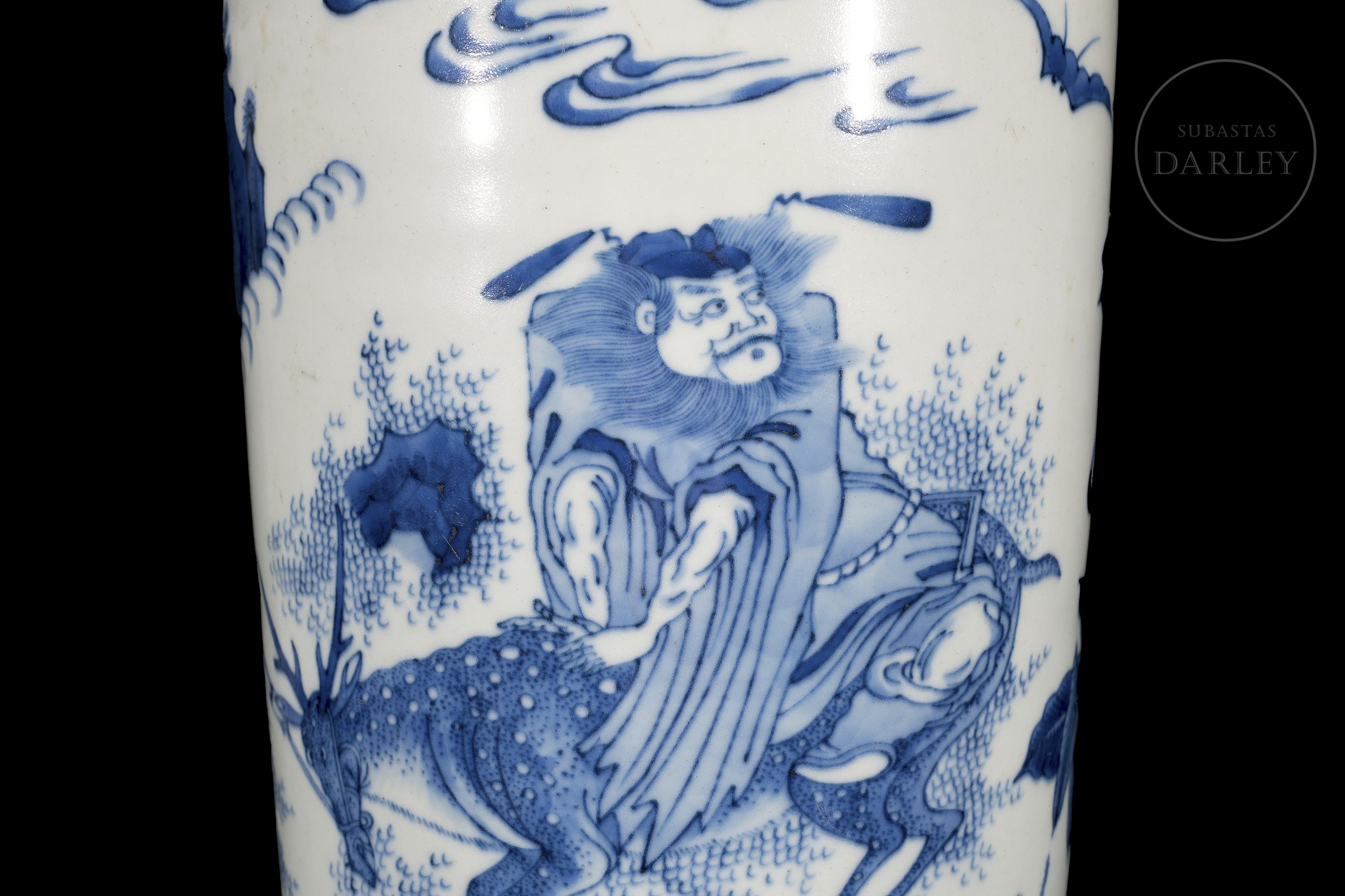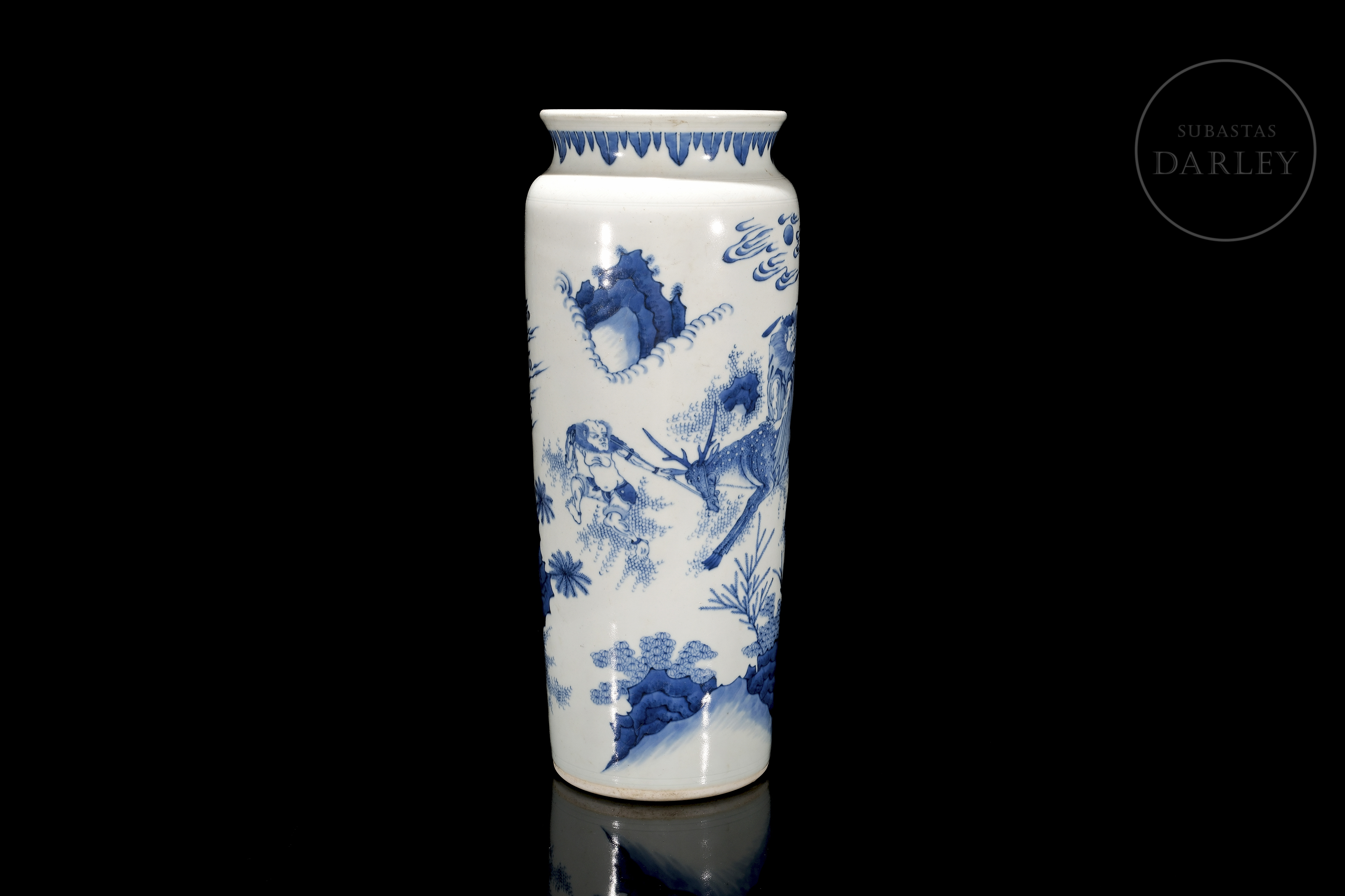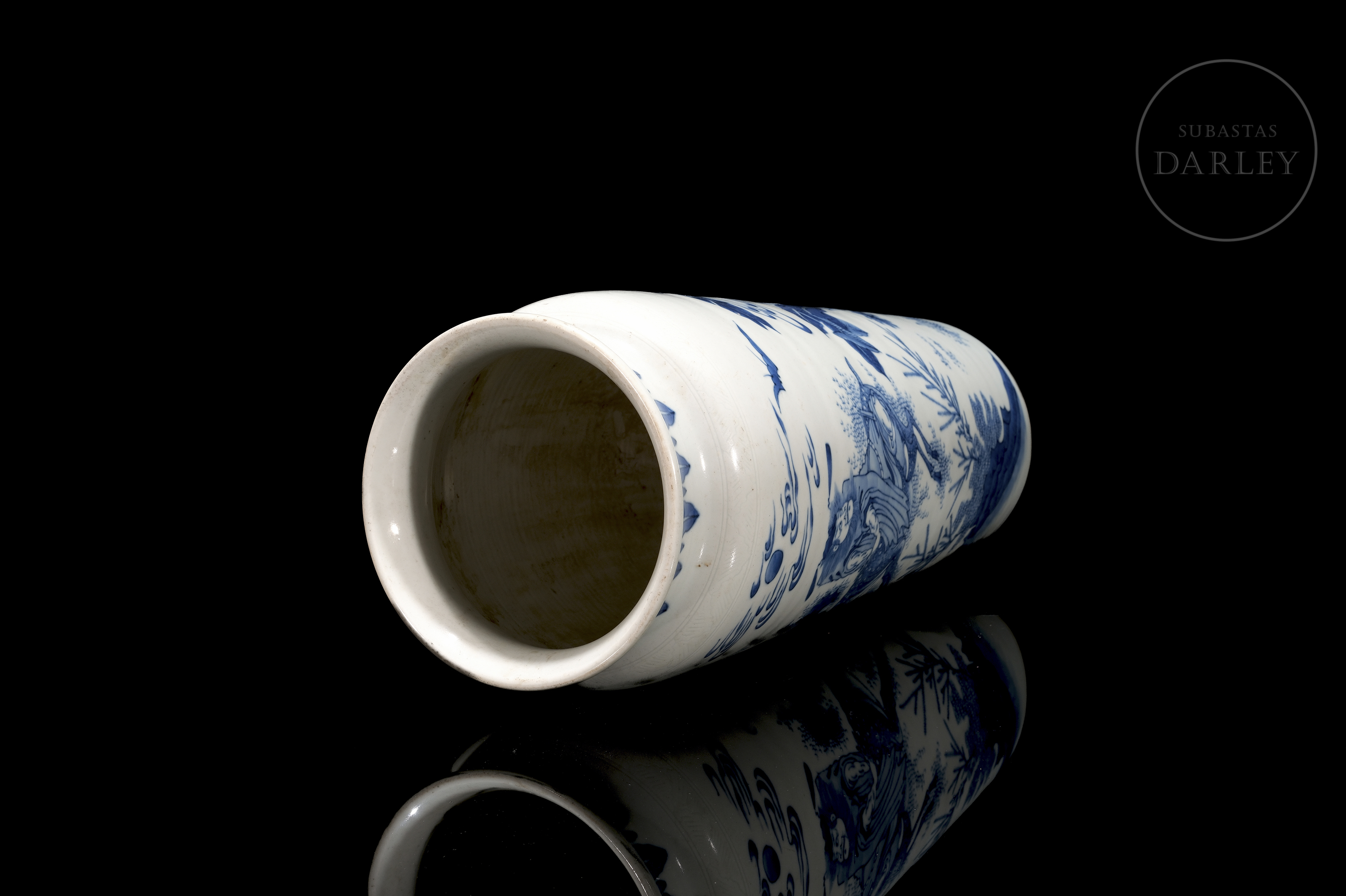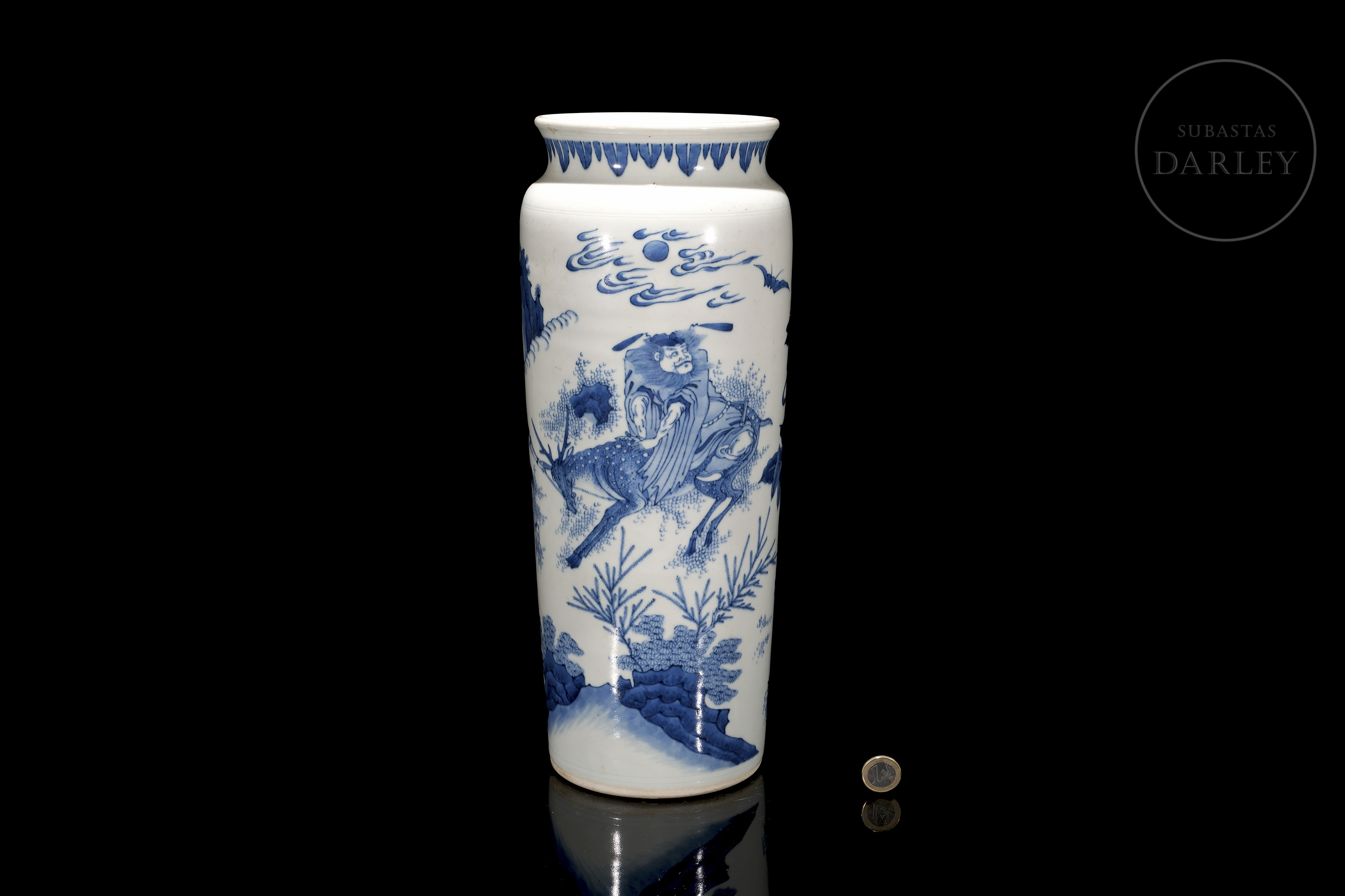 Búcaro o cubilete para pinceles (bitong), realizado en porcelana, con cuerpo cilíndrico que se ensancha ligeramente hacia los hombros. El exterior se encuentra adornado en azul cobalto con una escena continua, que representa a un dignatario o guerrero a lomos de un ciervo en un paisaje con pinos, bananeros y formaciones rocosas.