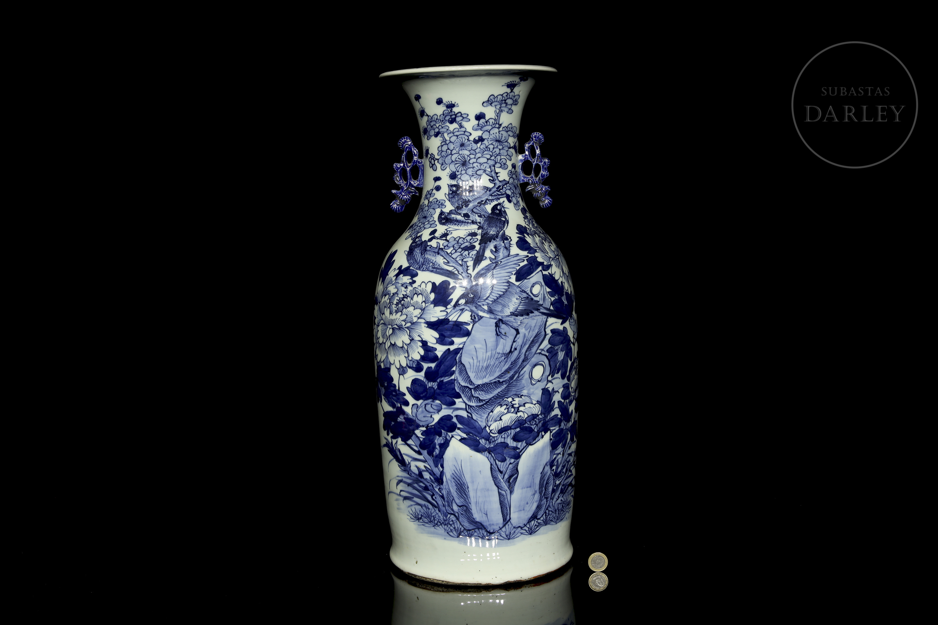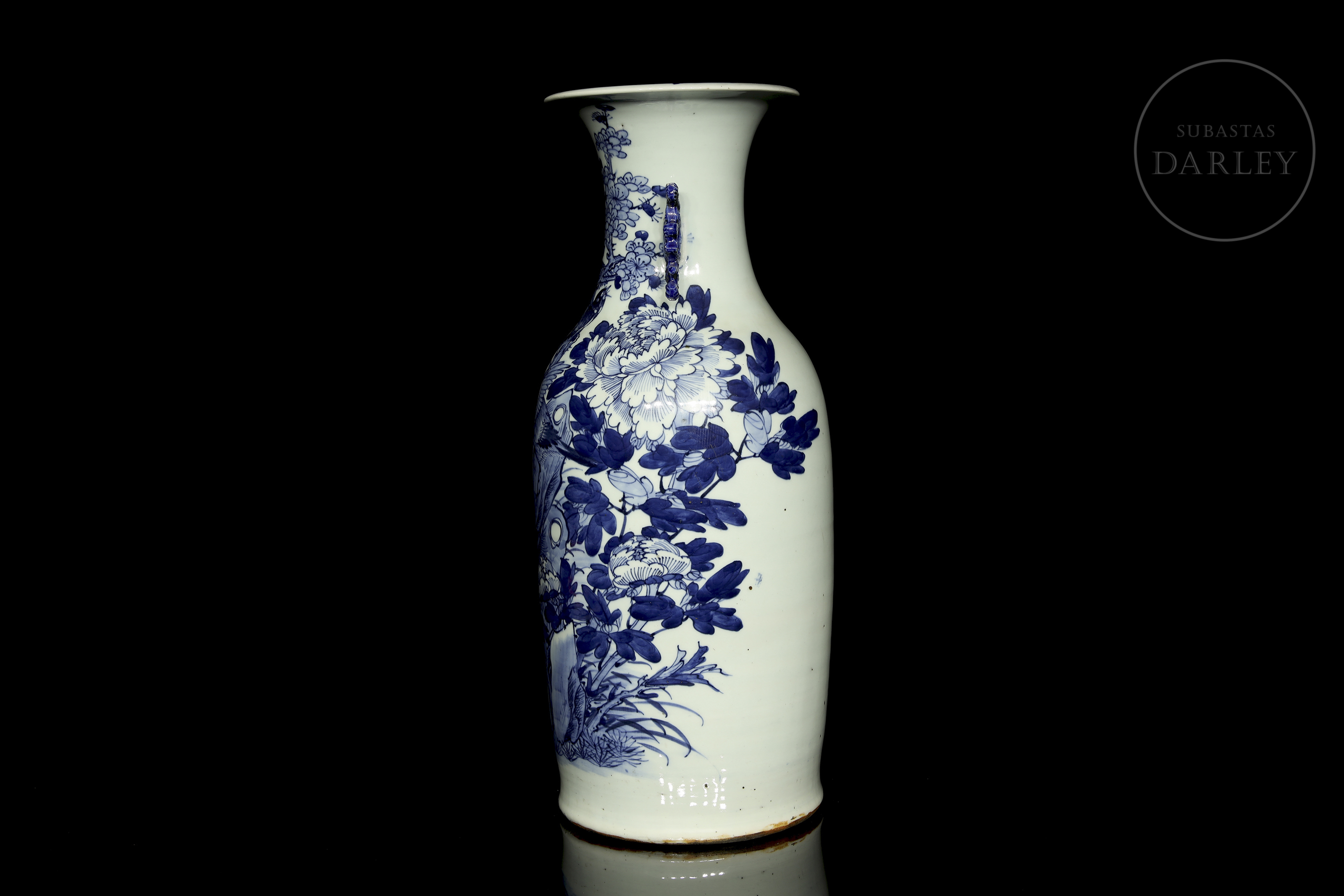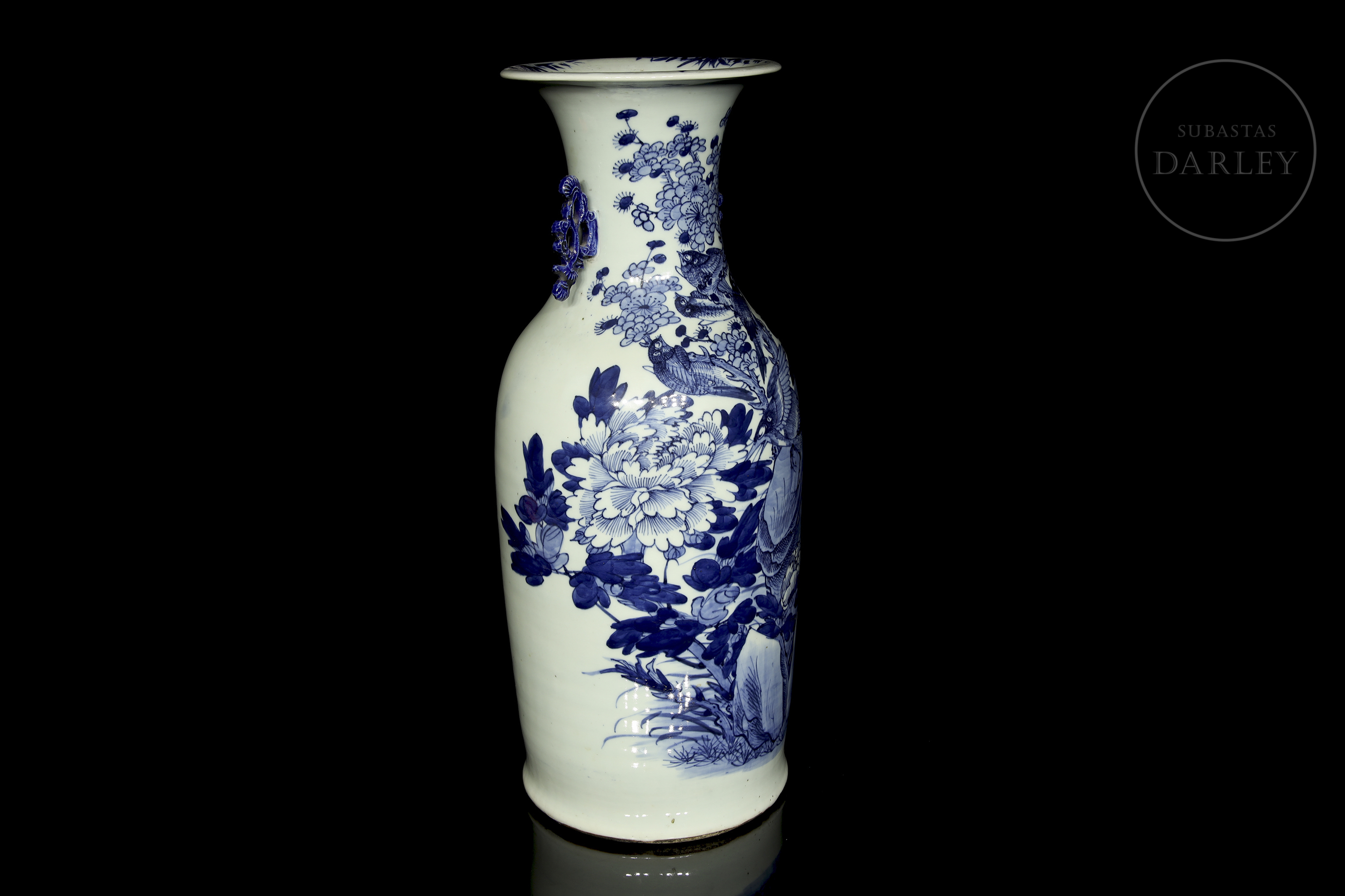 Jarrón de porcelana esmaltada con decoración bajo vidriado en blanco y azul cobalto. Posee un cuerpo cilíndrico que se estrecha ligeramente en el cuello y presenta una boca acampanada. Está decorado con un motivo continuo de pájaros posados entre grandes peonías, rocas y ramajes florales, con el cuello adornado con dos asas modeladas. Dinastía Qing (1644-1912).