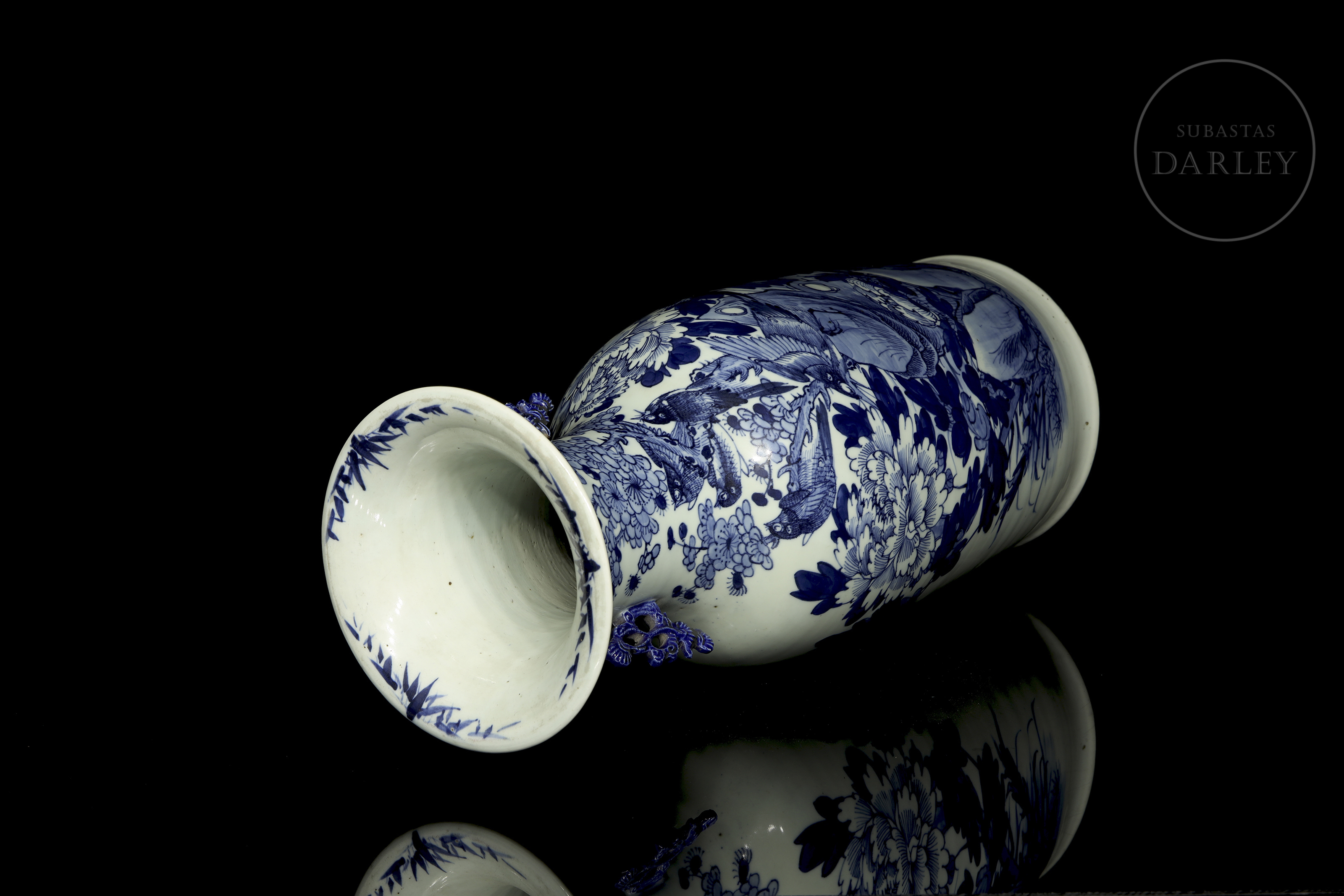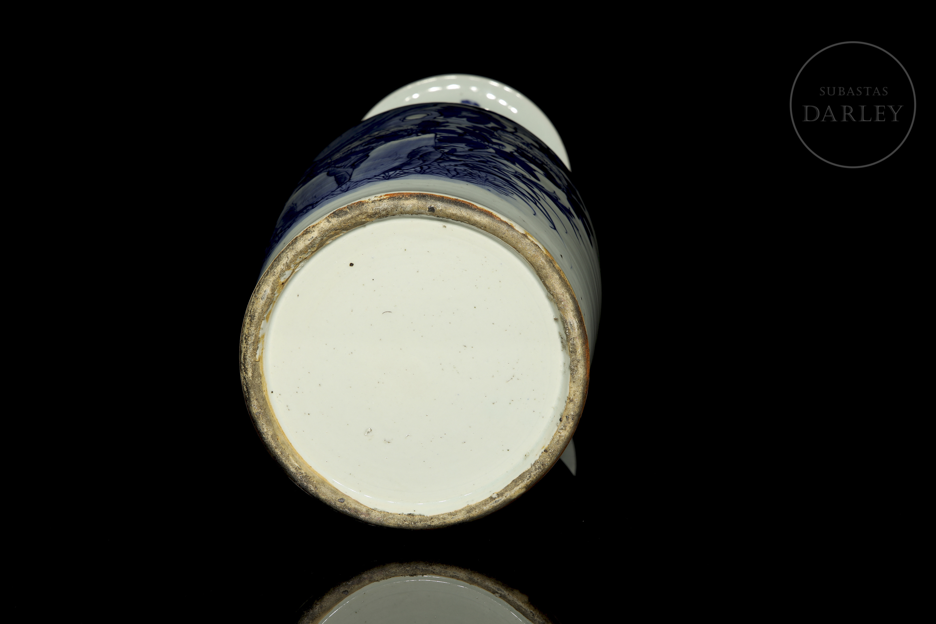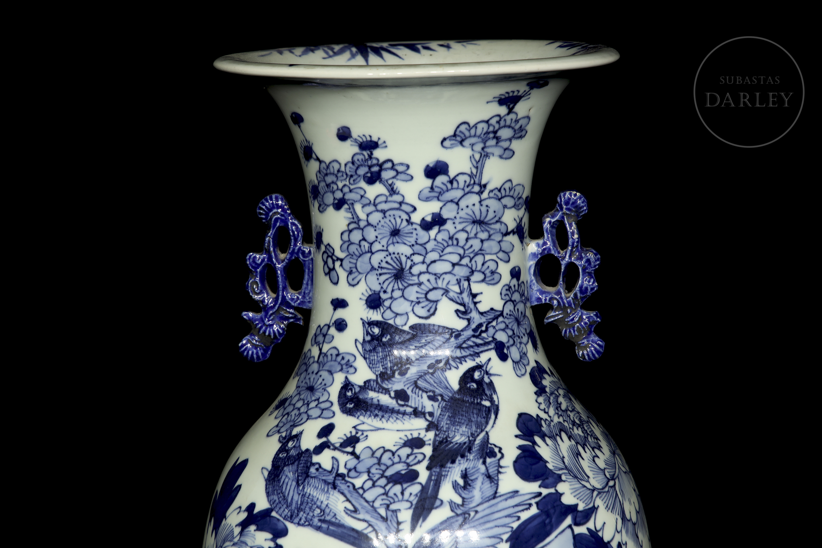 Jarrón de porcelana esmaltada con decoración bajo vidriado en blanco y azul cobalto. Posee un cuerpo cilíndrico que se estrecha ligeramente en el cuello y presenta una boca acampanada. Está decorado con un motivo continuo de pájaros posados entre grandes peonías, rocas y ramajes florales, con el cuello adornado con dos asas modeladas. Dinastía Qing (1644-1912).