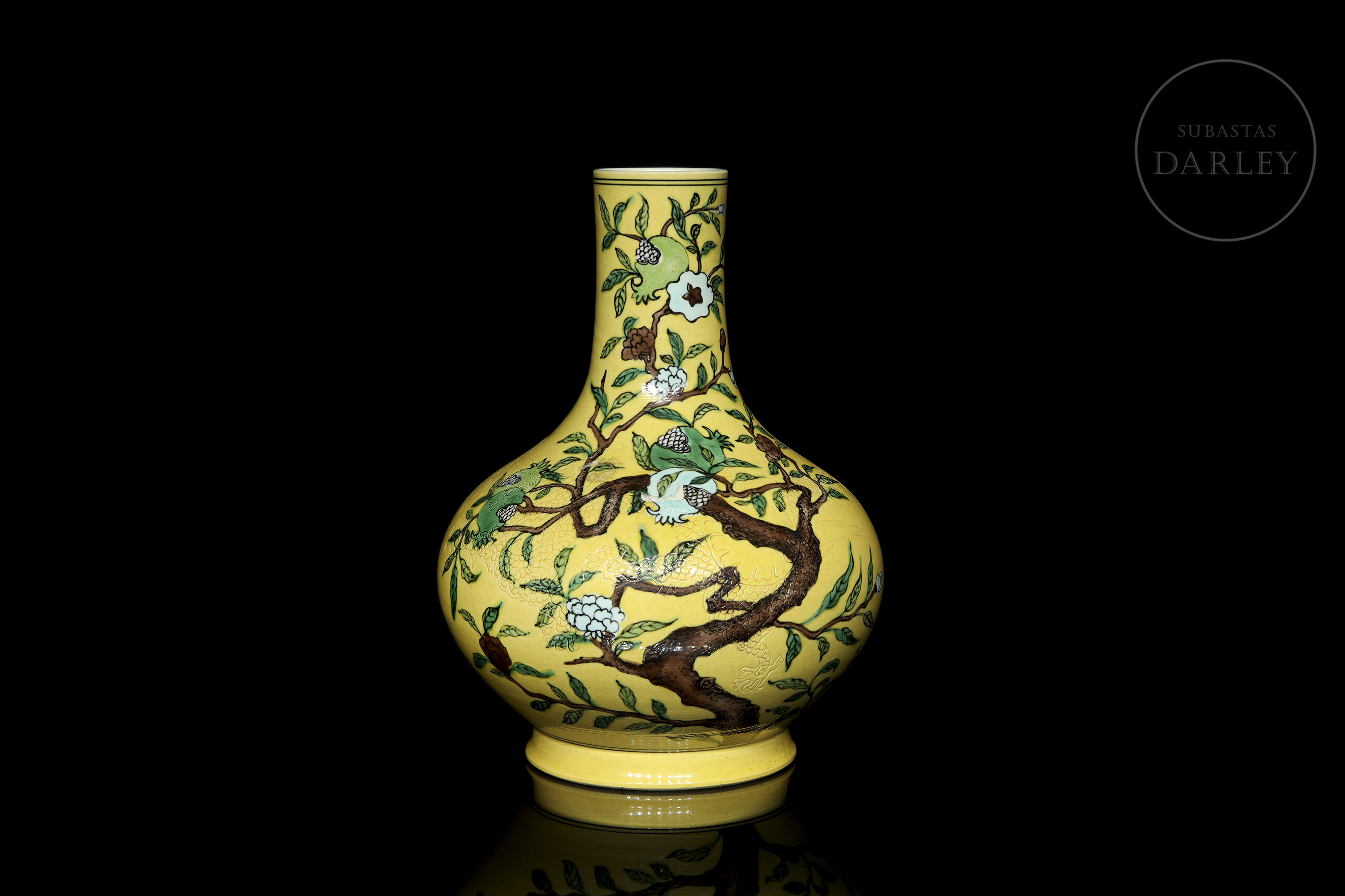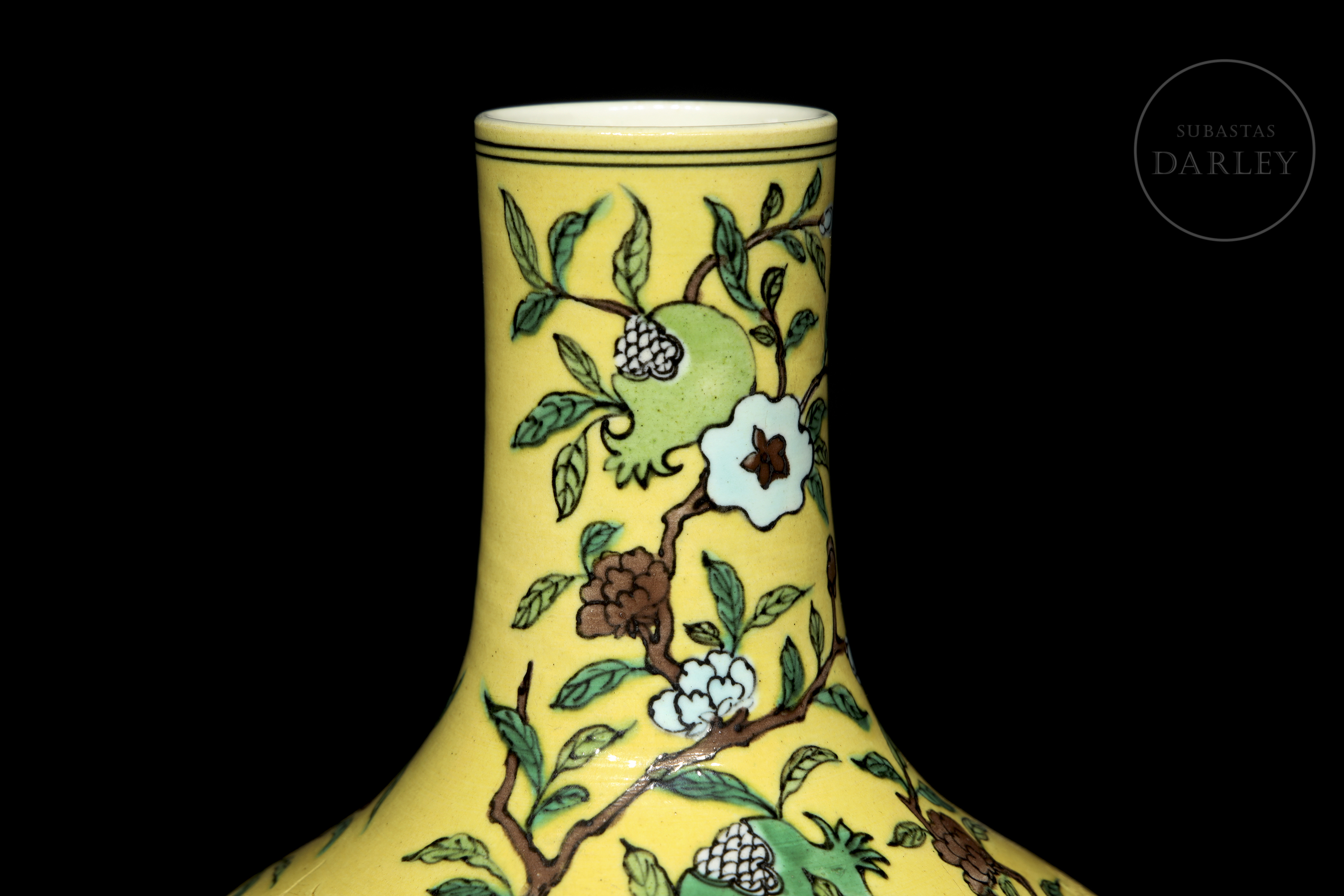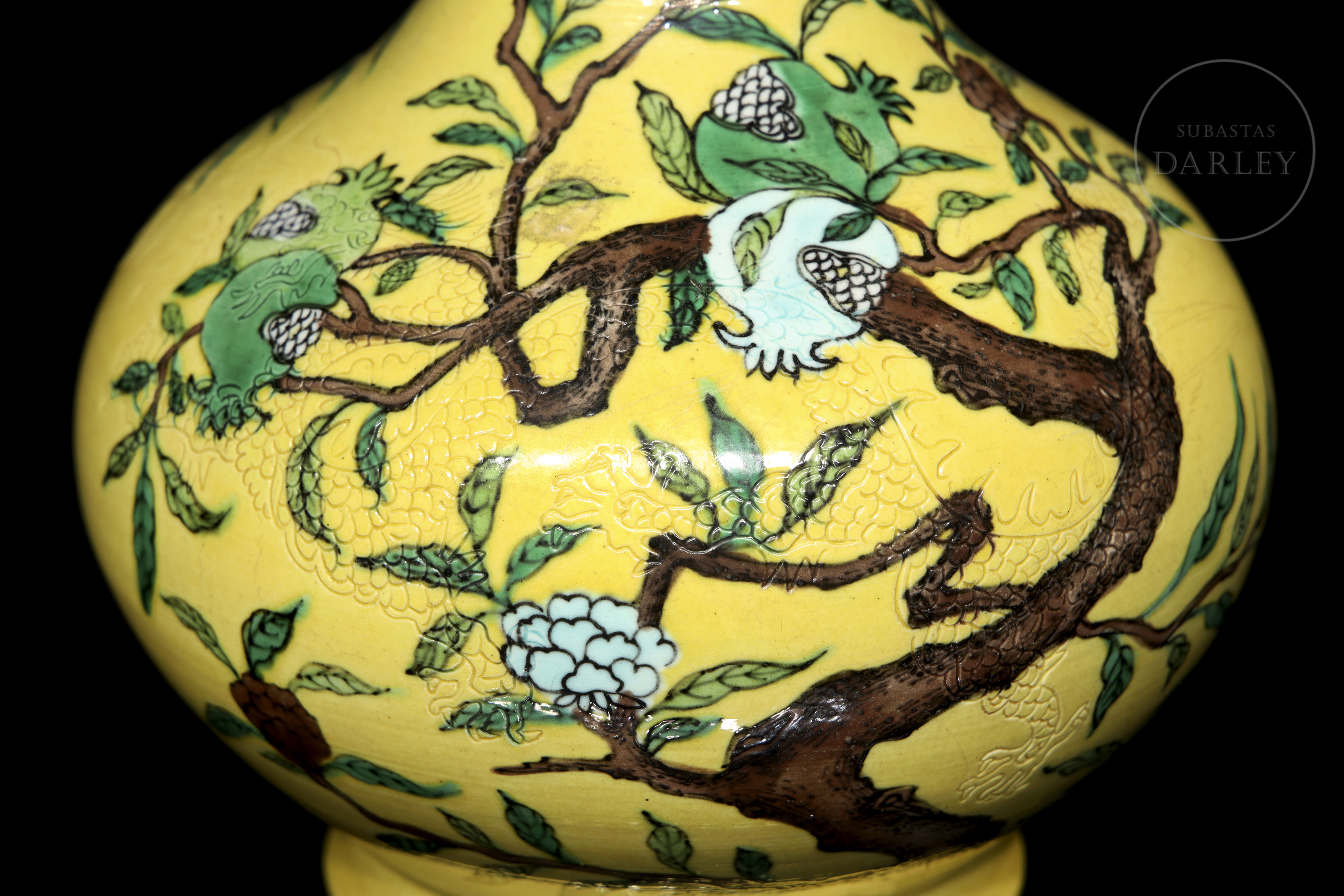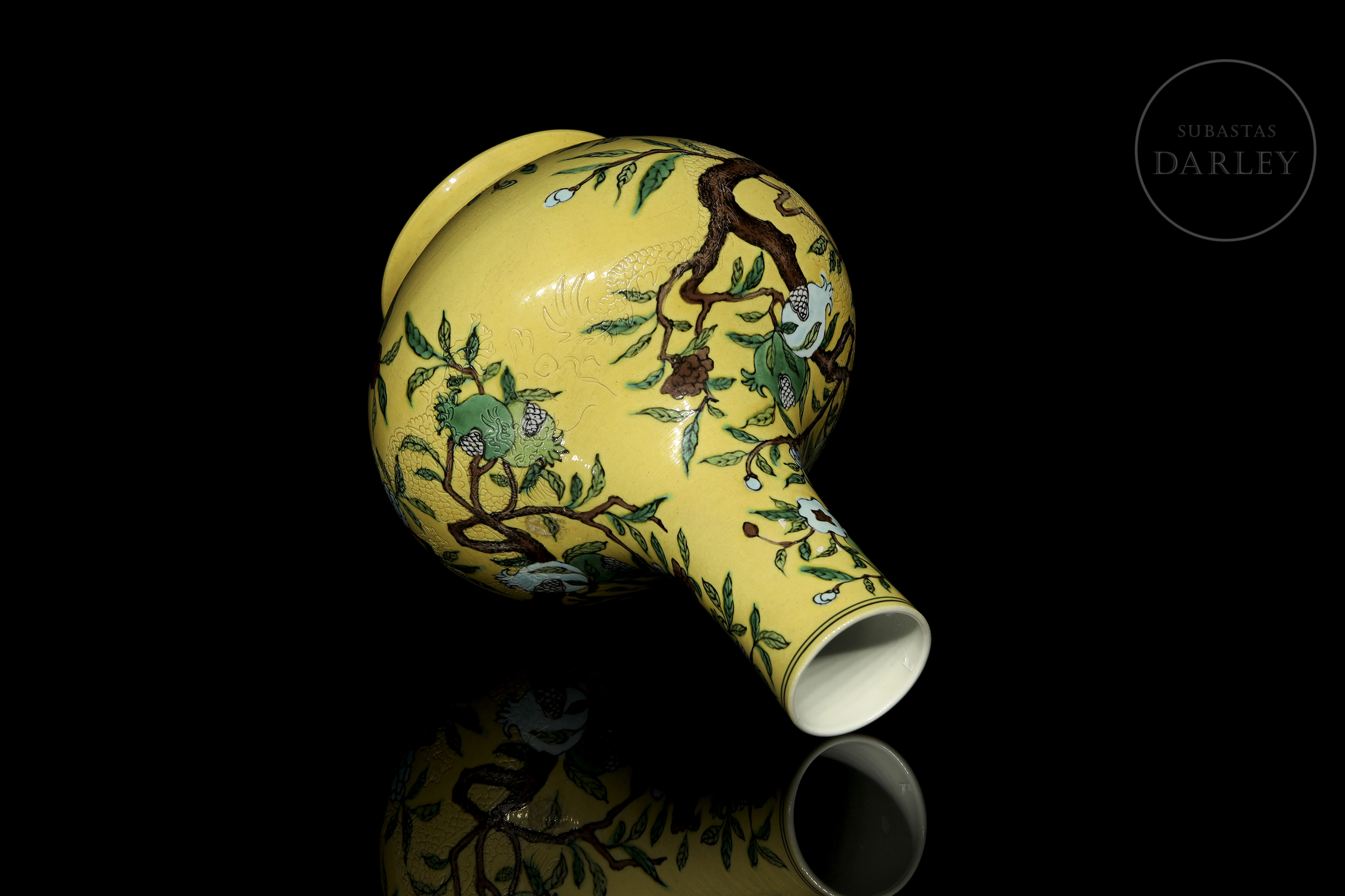 Jarrón de porcelana, con un corto pie sobre el que se dispone un cuerpo abultado y chato, coronado por un alargado cuello cilíndrico. El jarrón se encuentra cubierto por un vibrante esmalte de color amarillo, que sirve de fondo para dos tipos de hermosas decoraciones superpuestas, por un lado, se observa la imagen de un feroz dragón, de cuerpo alargado y sinuoso cubierto de escamas, y finalizado en gruesas patas finalizadas en afiladas garras, realizado mediante la técnica de "esgrafiado". Sobre la bestia mitológica se sitúa un hermoso paisaje compuesto por dos gruesas ramas de granado, cubiertas de hojas y frutos de colores. En la base se dispone un sello de seis caracteres "大清康熙年制" realizado en azul bajo vidriado.