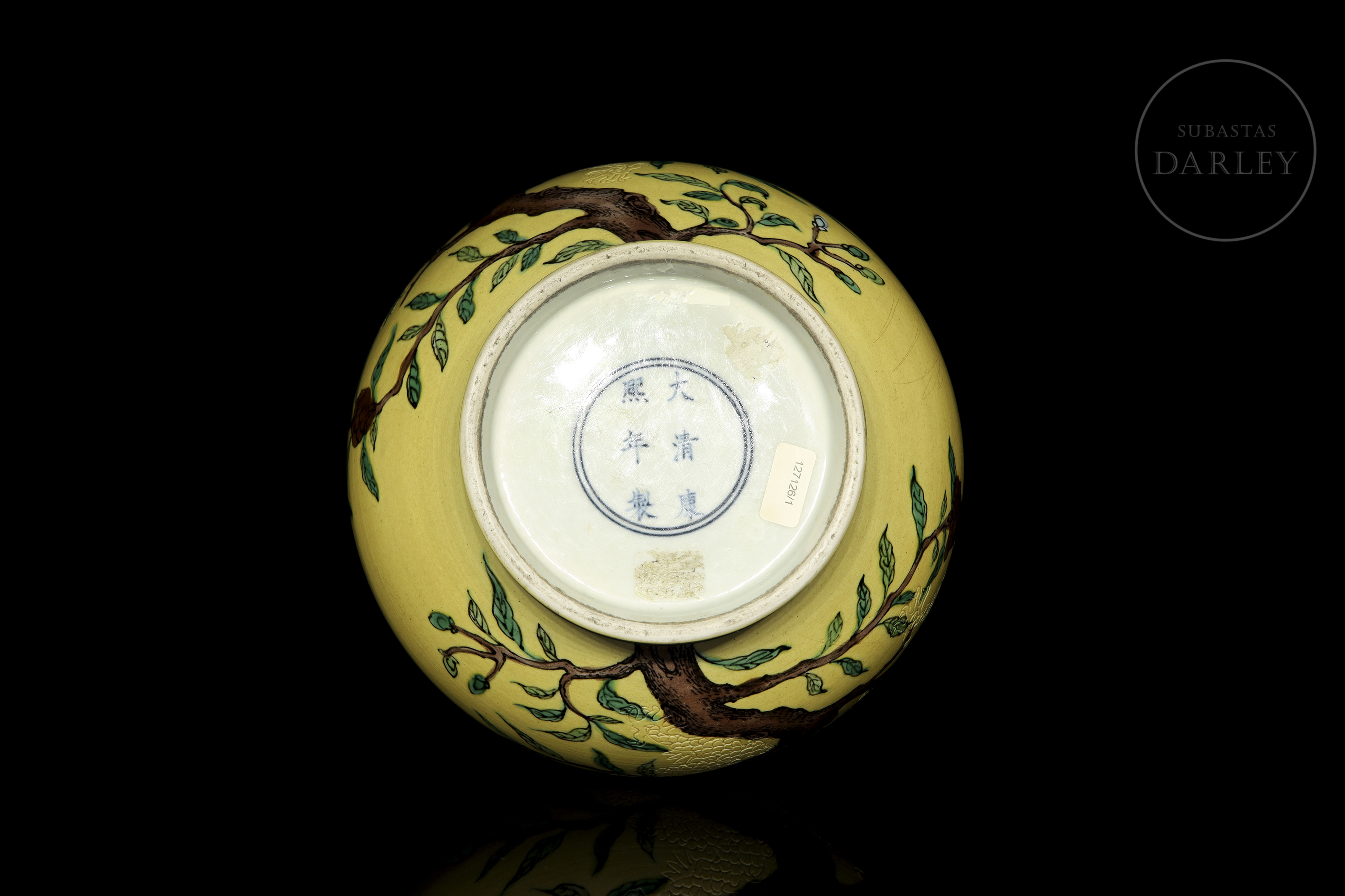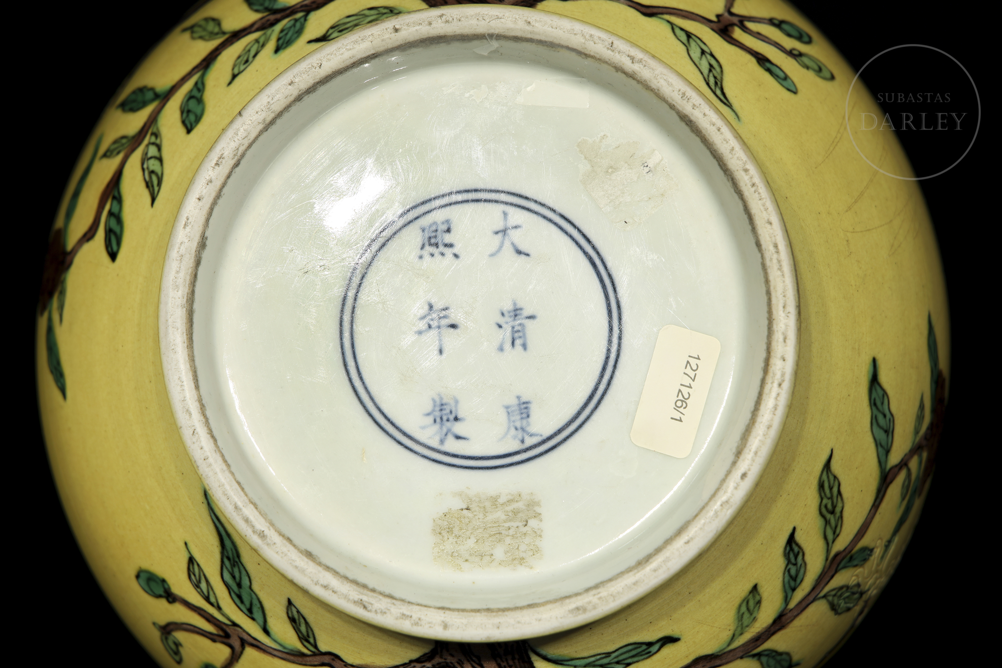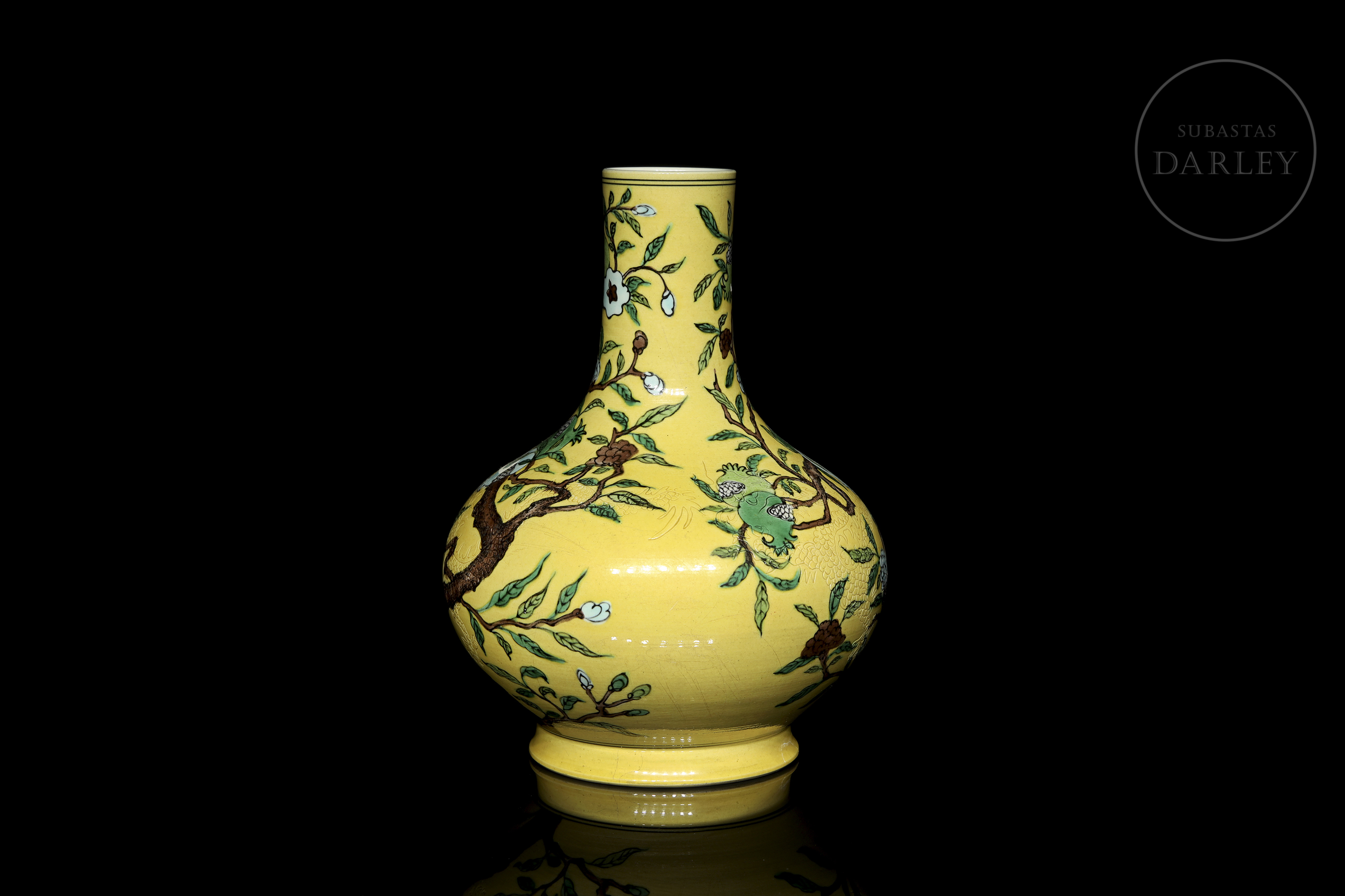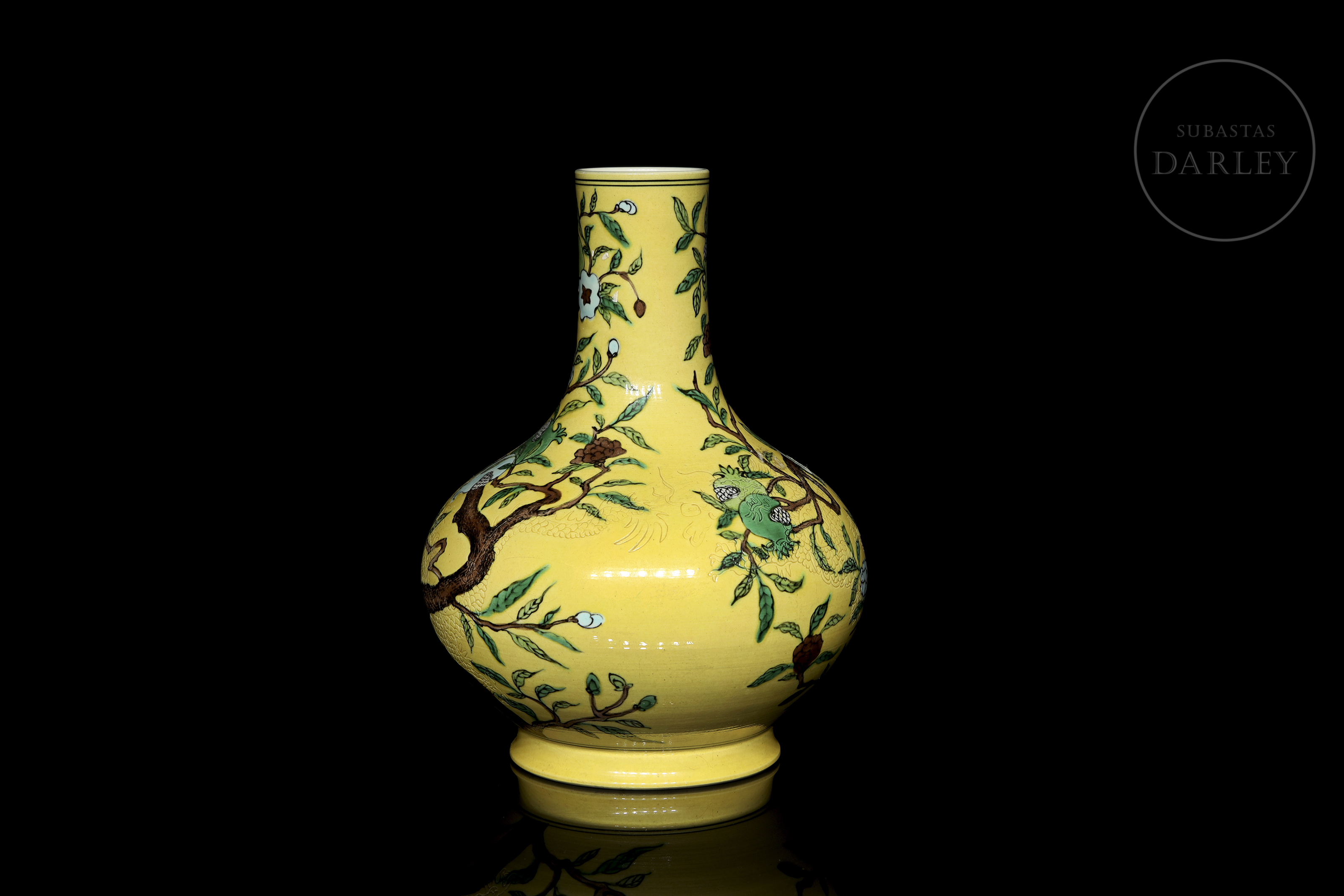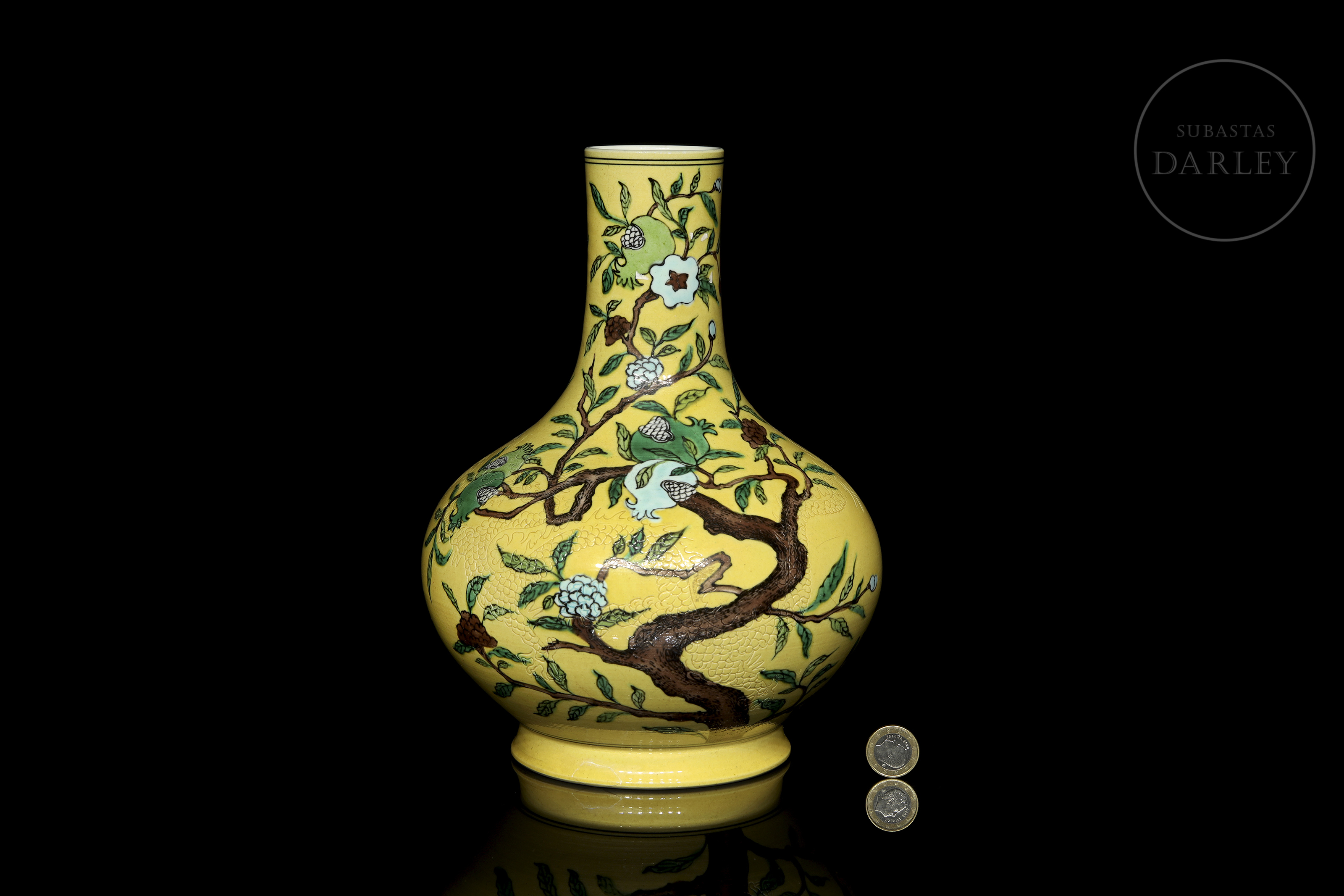 Jarrón de porcelana, con un corto pie sobre el que se dispone un cuerpo abultado y chato, coronado por un alargado cuello cilíndrico. El jarrón se encuentra cubierto por un vibrante esmalte de color amarillo, que sirve de fondo para dos tipos de hermosas decoraciones superpuestas, por un lado, se observa la imagen de un feroz dragón, de cuerpo alargado y sinuoso cubierto de escamas, y finalizado en gruesas patas finalizadas en afiladas garras, realizado mediante la técnica de "esgrafiado". Sobre la bestia mitológica se sitúa un hermoso paisaje compuesto por dos gruesas ramas de granado, cubiertas de hojas y frutos de colores. En la base se dispone un sello de seis caracteres "大清康熙年制" realizado en azul bajo vidriado.