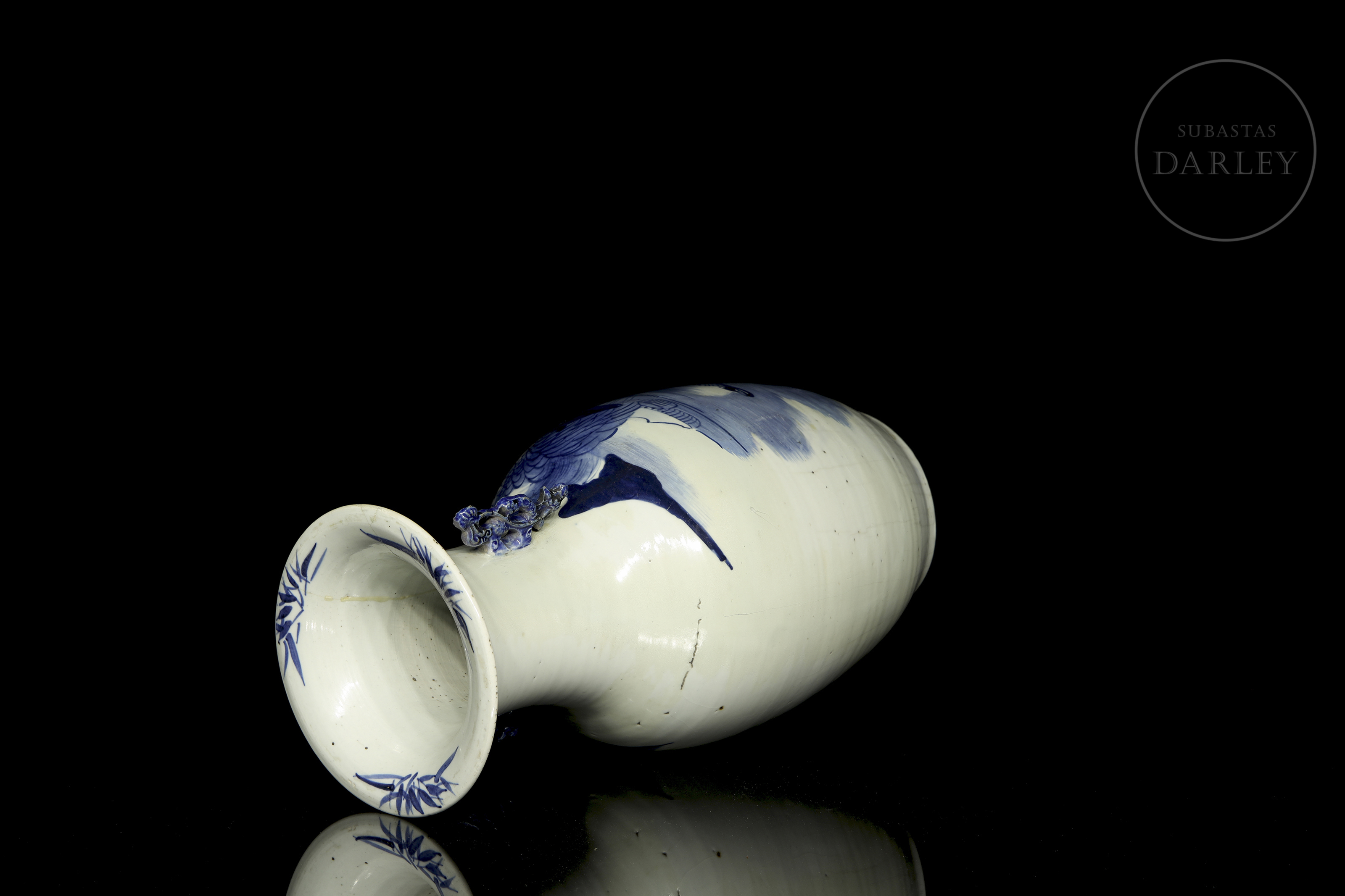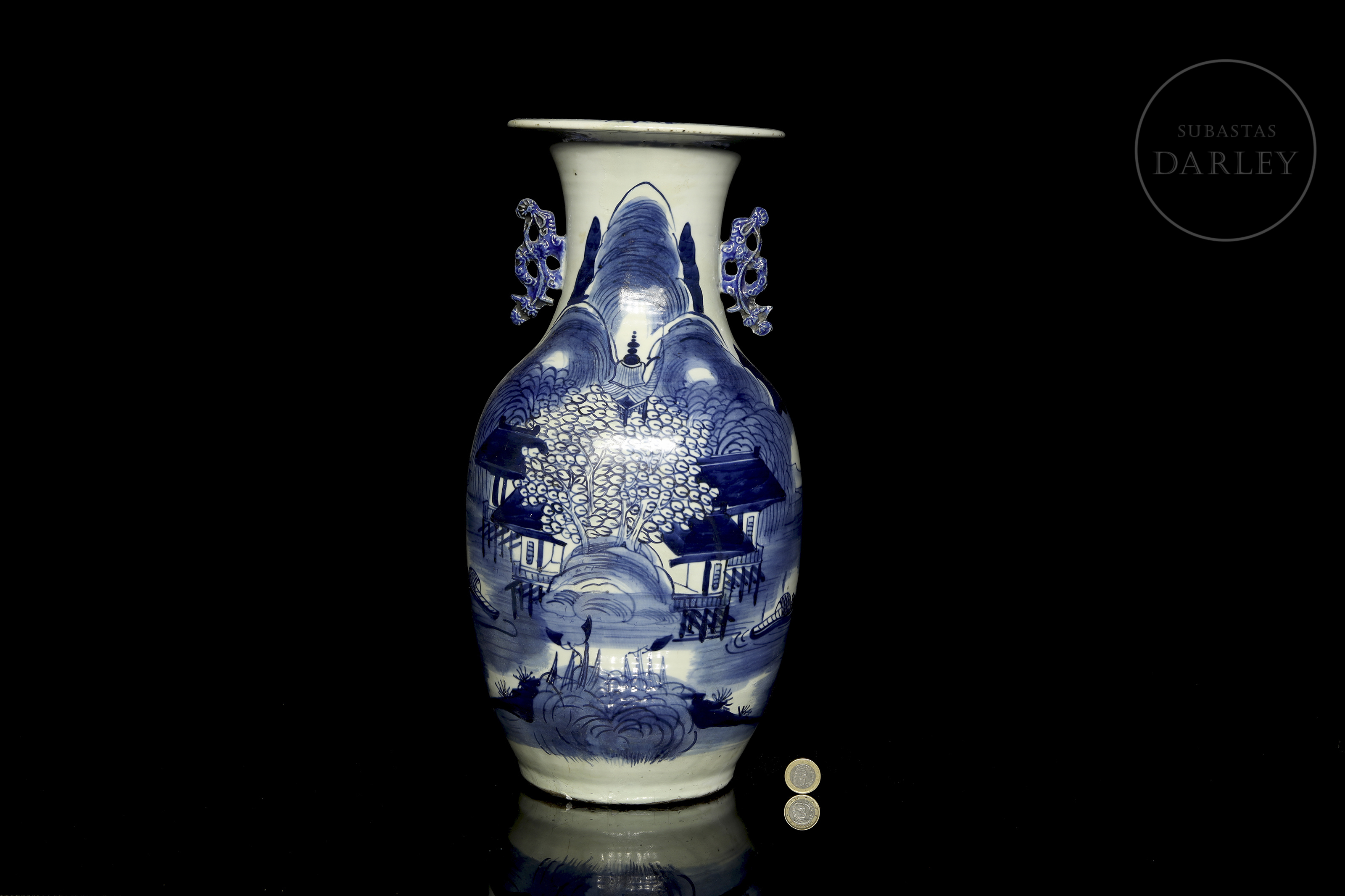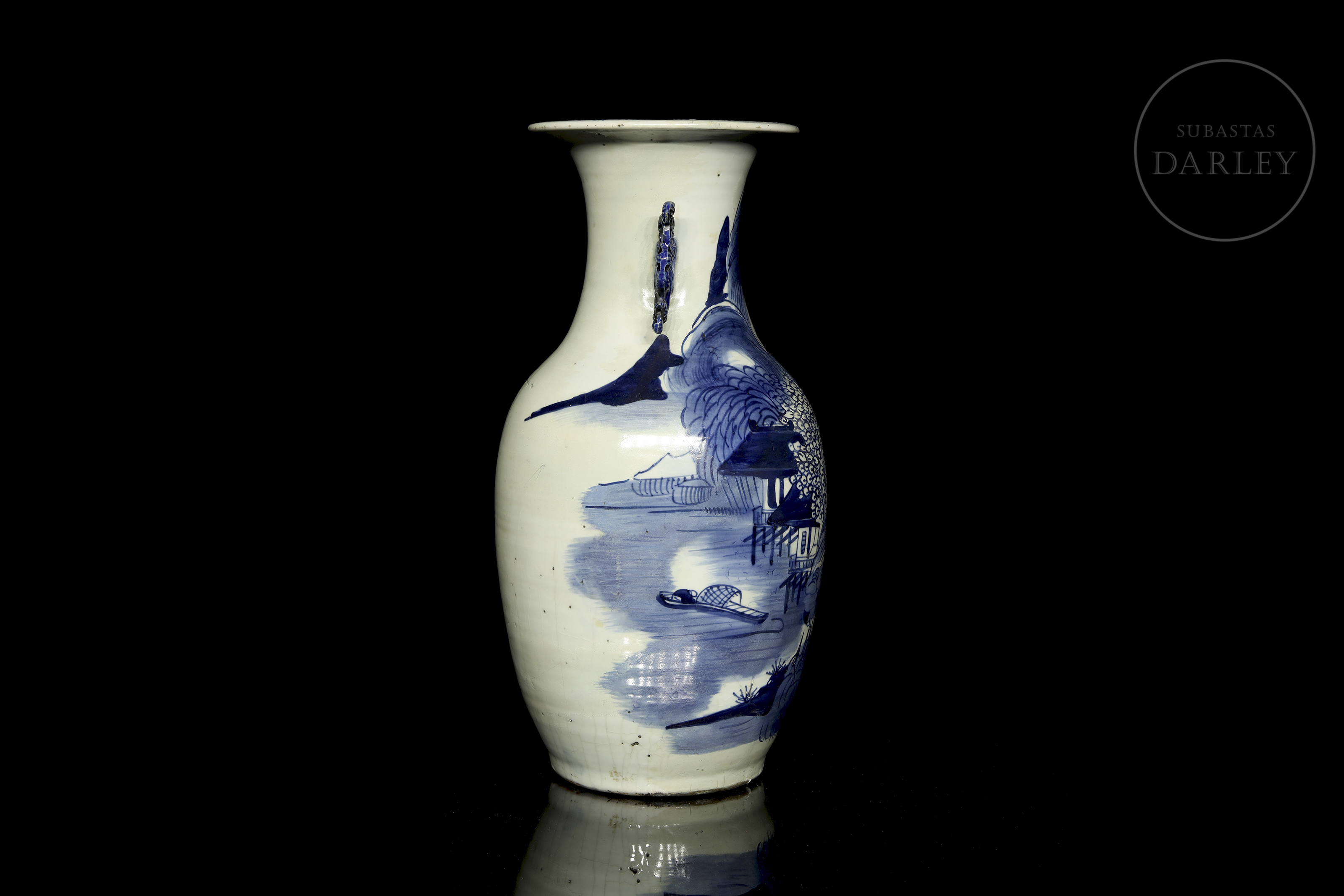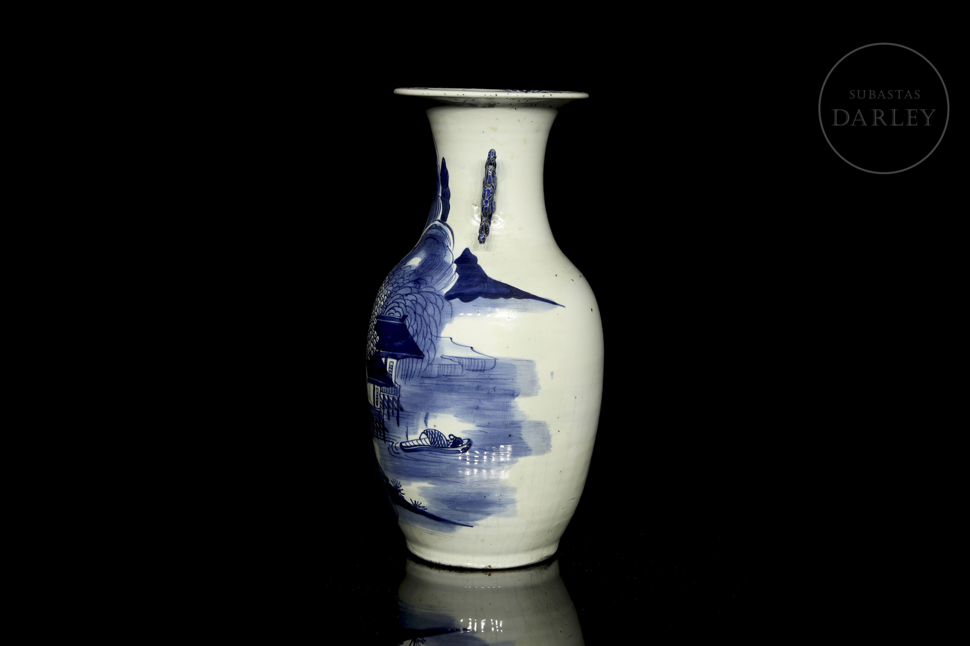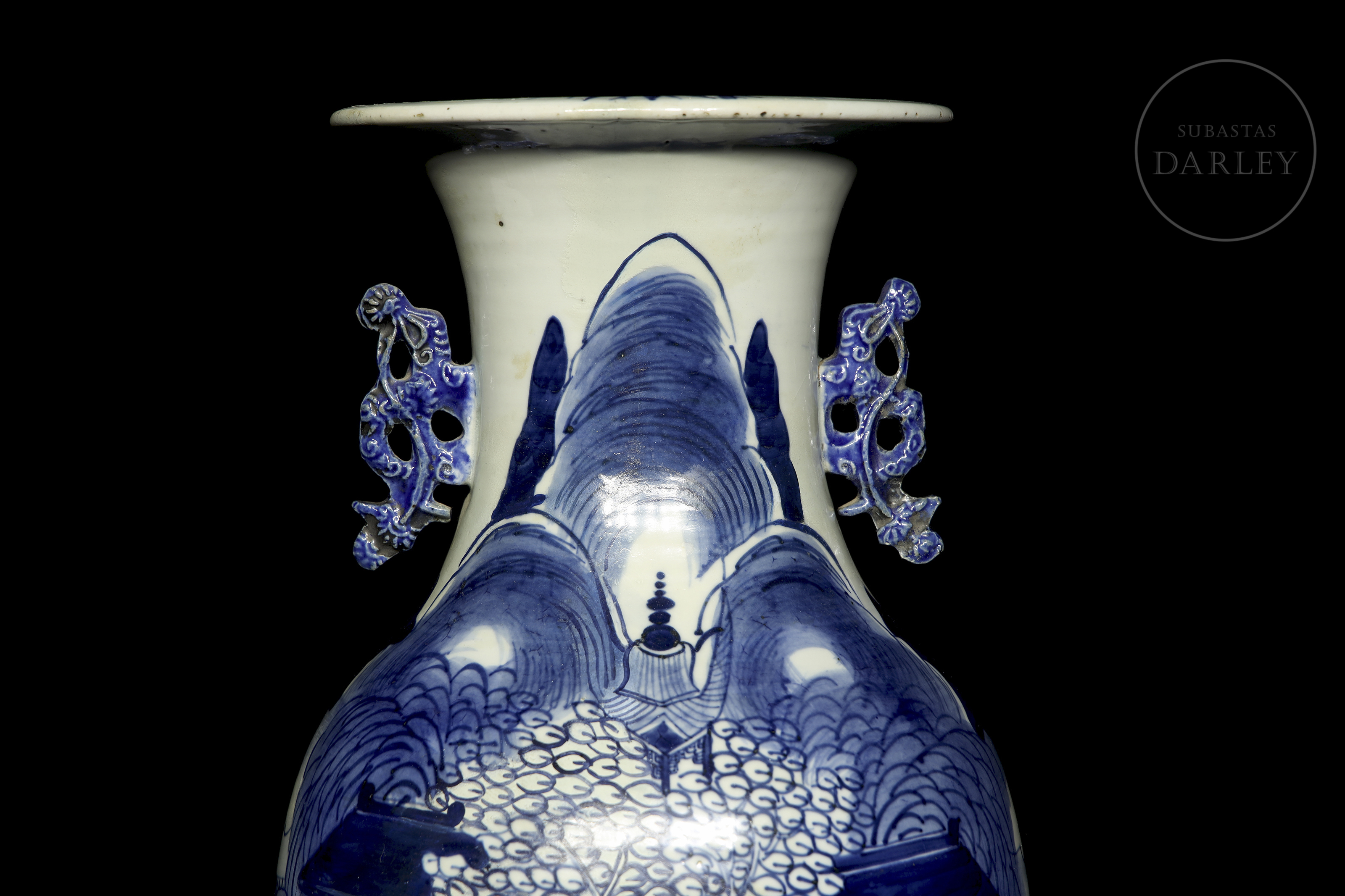 Jarrón de porcelana esmaltada con decoración bajo vidriado en blanco y azul cobalto. Posee un cuerpo alargado con un cuello esbelto y boca abocinada. Está decorado con un paisaje de una gran montaña donde se dispone un templo tradicional entre grandes árboles. El cuello está flanqueado por dos asas modeladas en forma de sinuosas ramas de pino. Dinastía Qing (1644-1912).