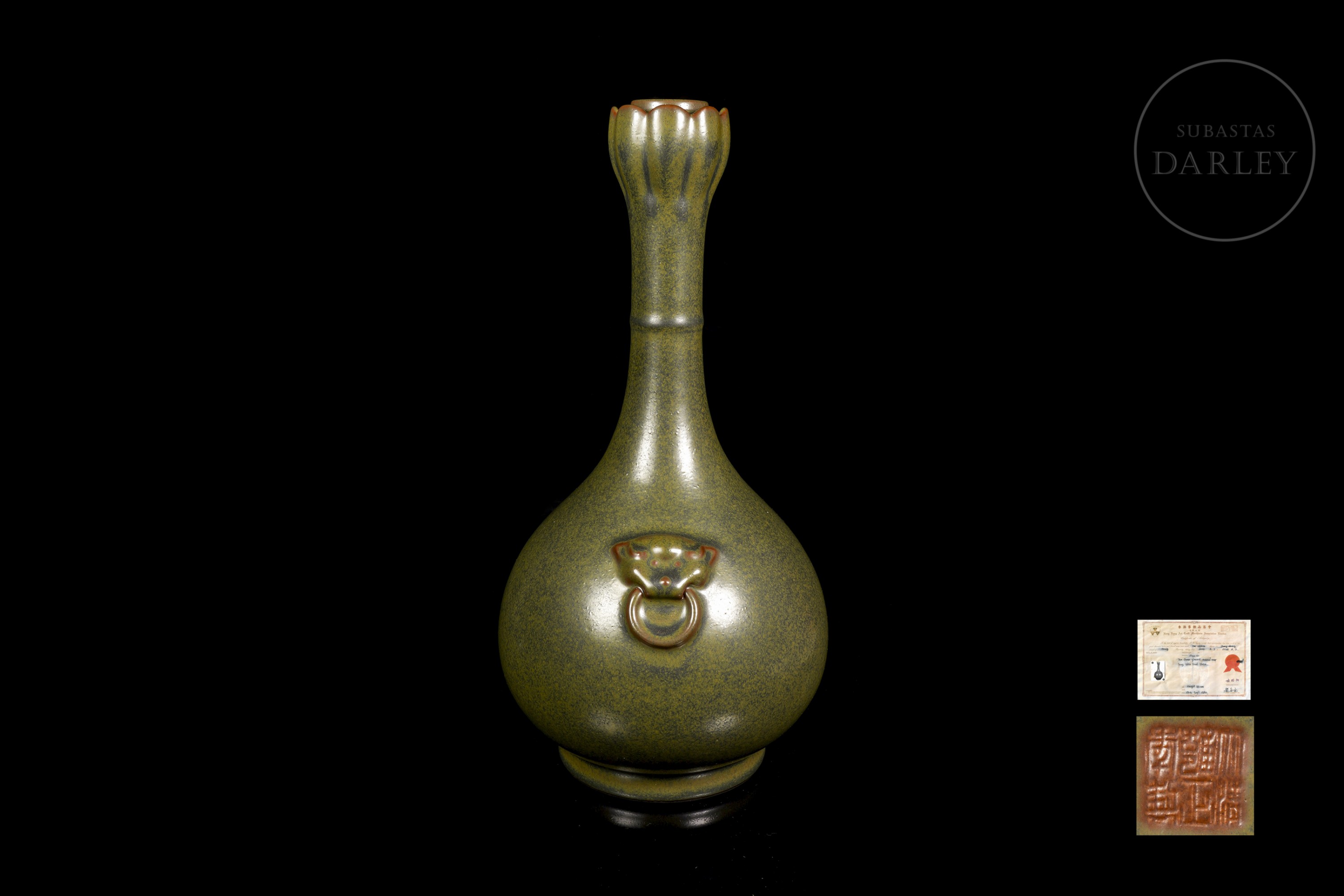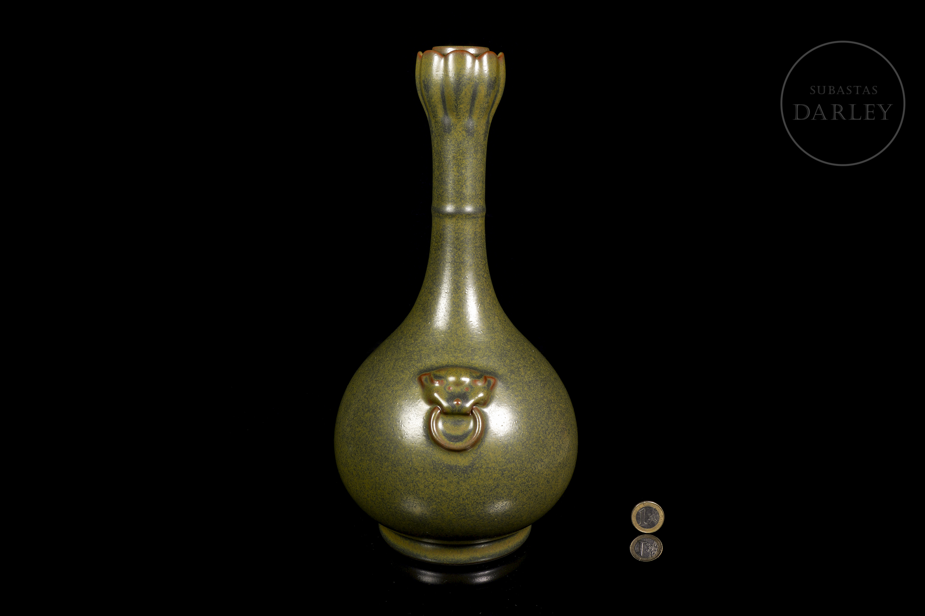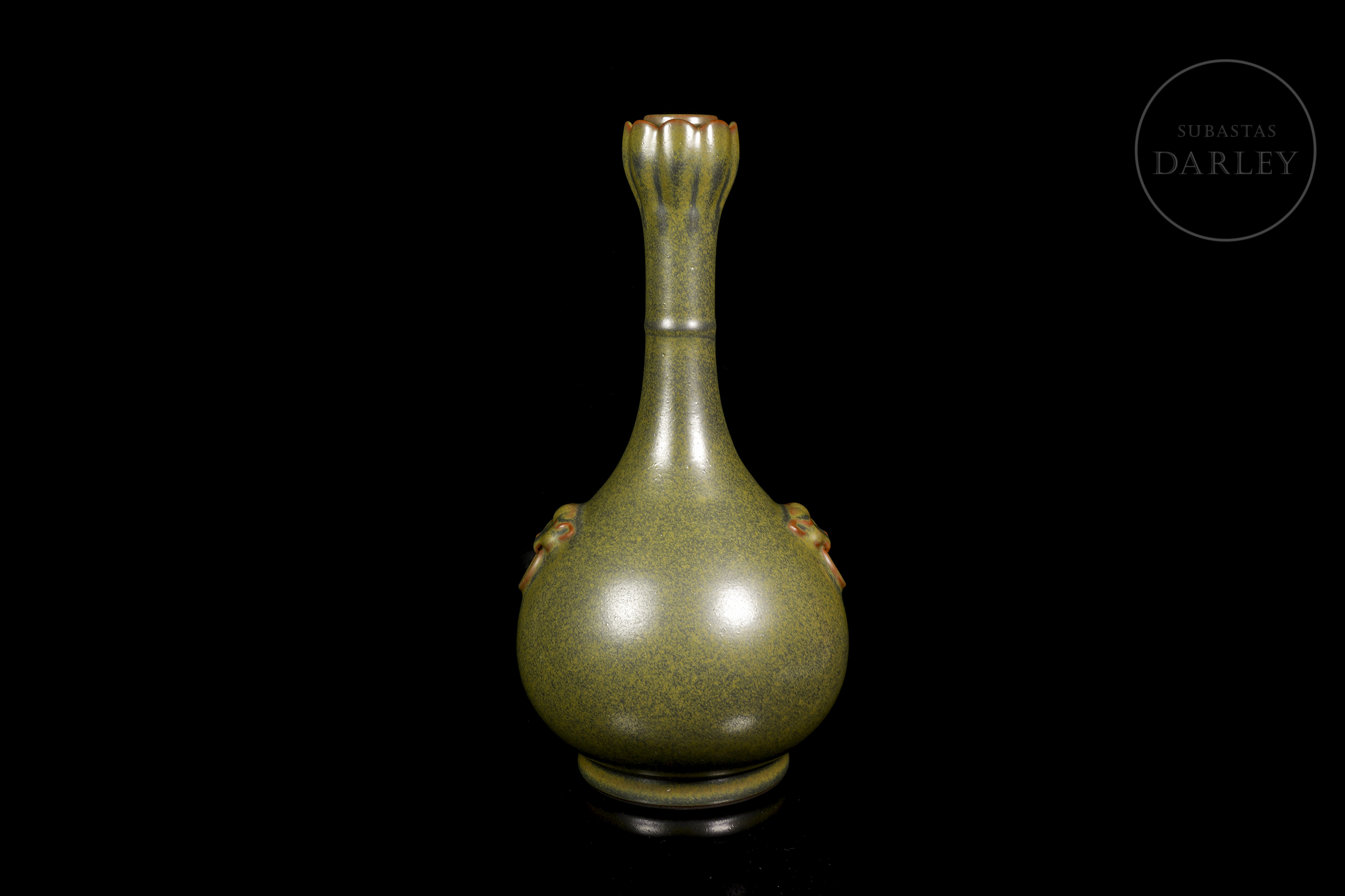 Elegante jarrón de porcelana con un cuerpo globular del que emerge un cuello largo y esbelto, rematado en una boca bulbosa y lobulada de tipo "cabeza de ajo". Sobre los hombros se aplican dos pequeñas asas moldeadas como mascarones con argollas. La pieza está cubierta en su totalidad por un fino esmalte "polvo de té". En la base se encuentra el sello de seis caracteres “大清雍正年制”.