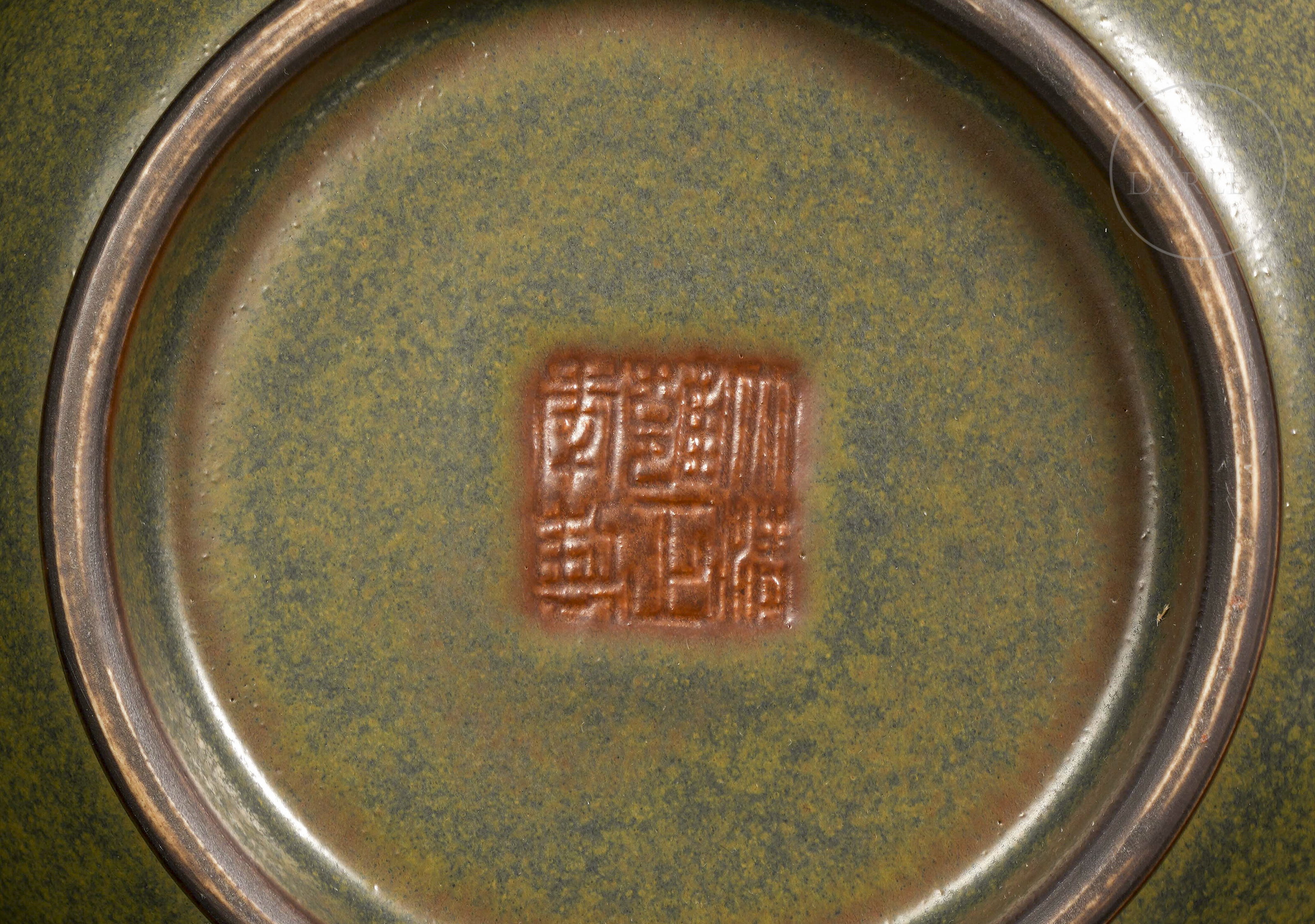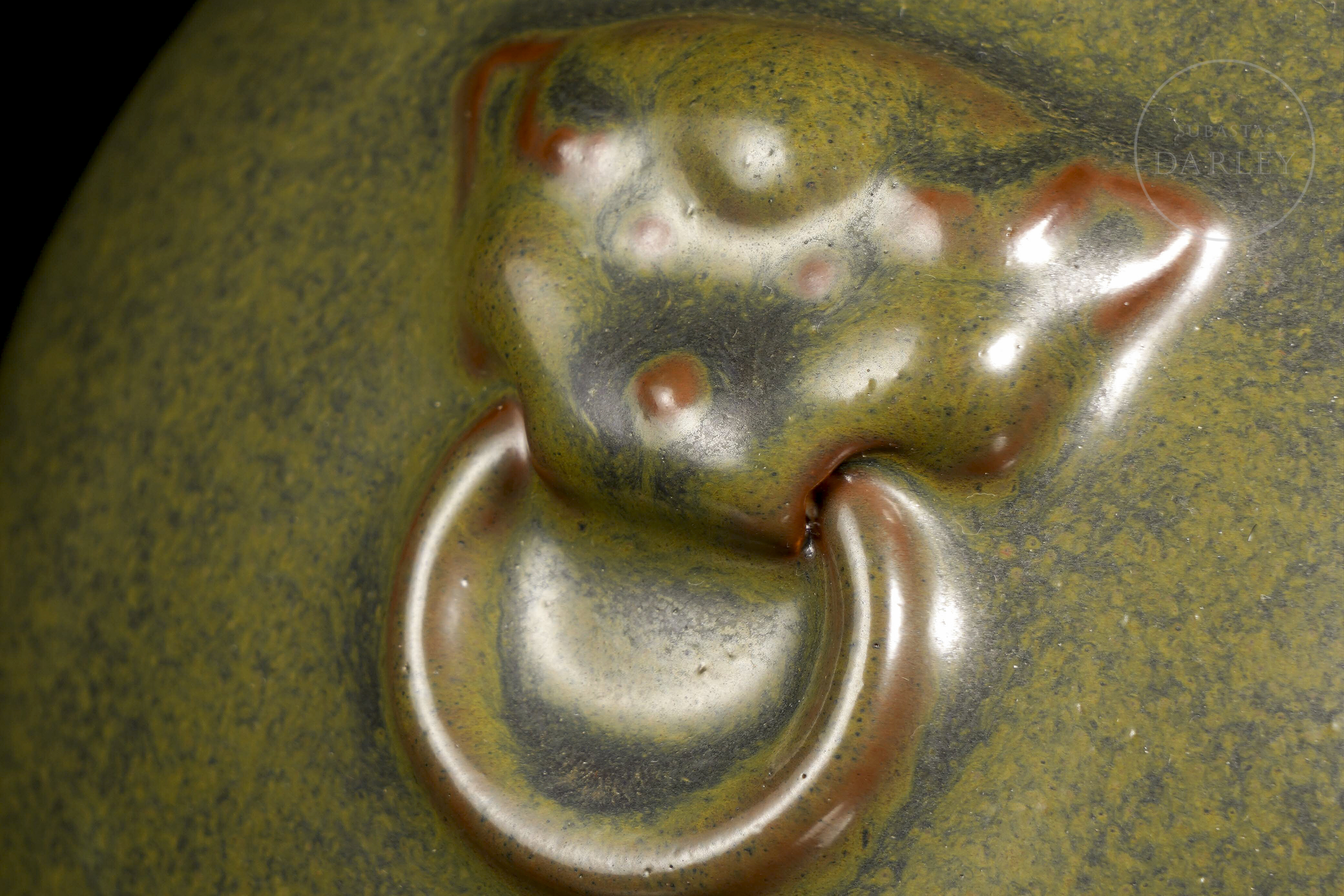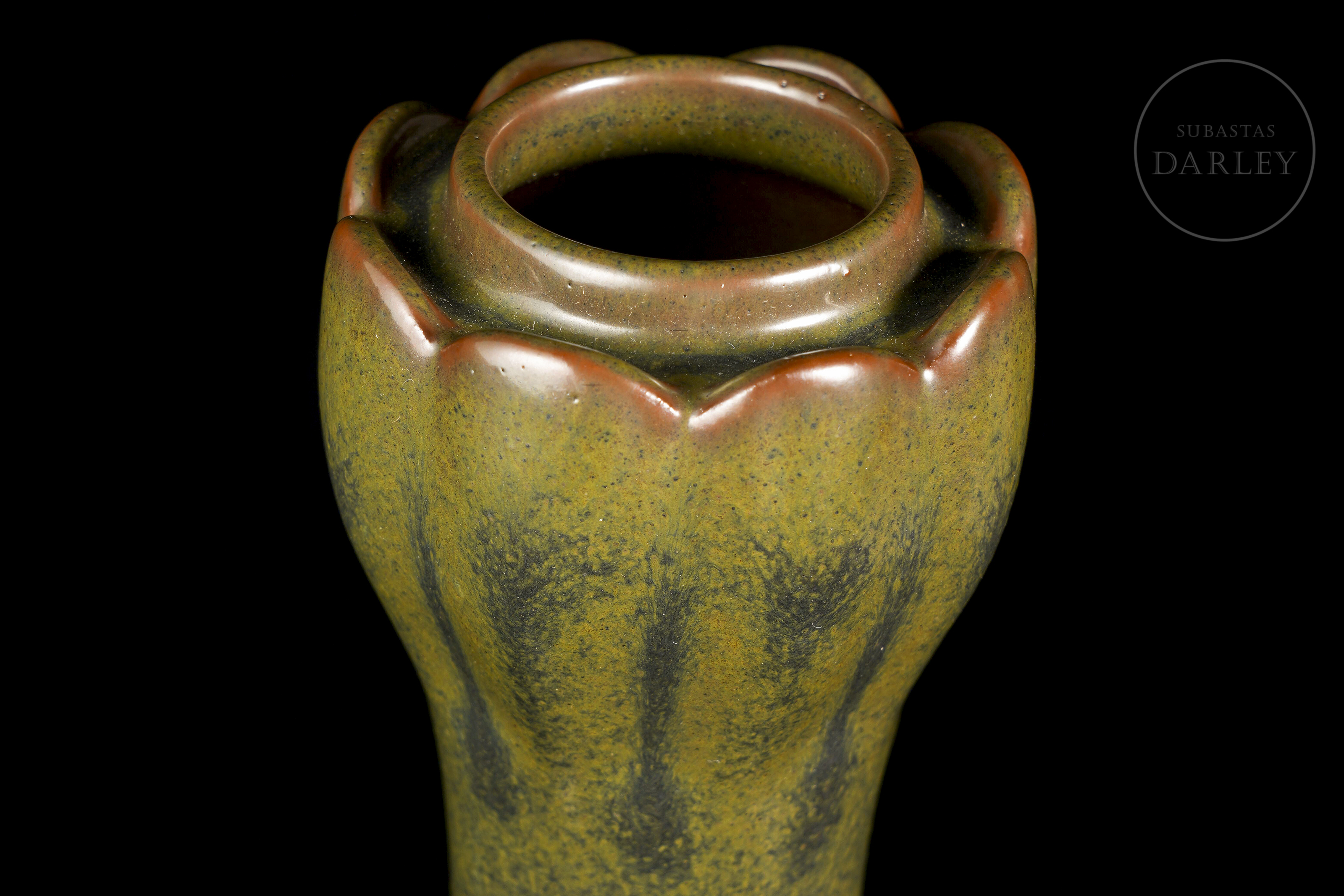 Elegante jarrón de porcelana con un cuerpo globular del que emerge un cuello largo y esbelto, rematado en una boca bulbosa y lobulada de tipo "cabeza de ajo". Sobre los hombros se aplican dos pequeñas asas moldeadas como mascarones con argollas. La pieza está cubierta en su totalidad por un fino esmalte "polvo de té". En la base se encuentra el sello de seis caracteres “大清雍正年制”.