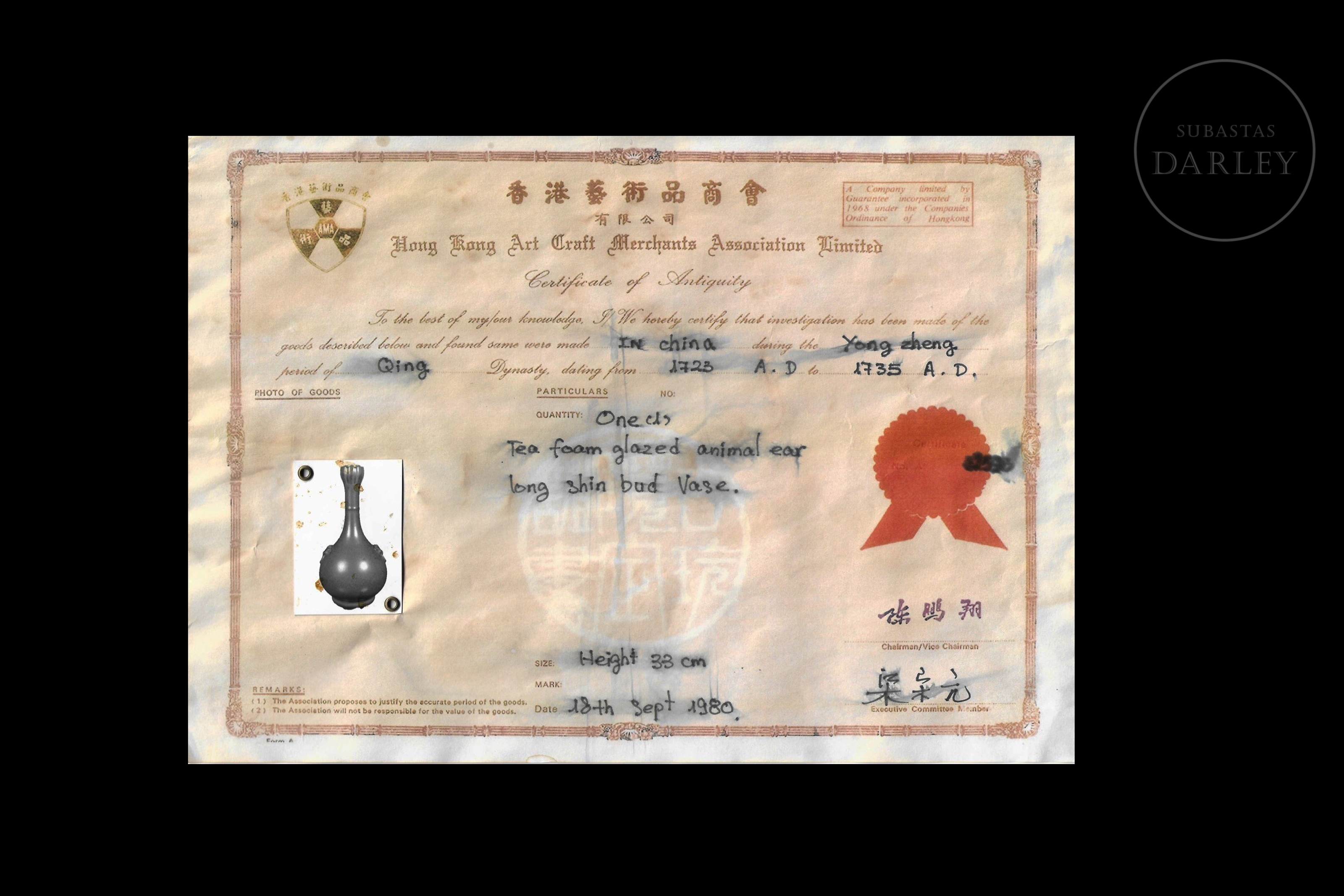 Se acompaña de un certificado de antigüedad de la Hong Kong Art Craft Merchants Association fechado en 1980.