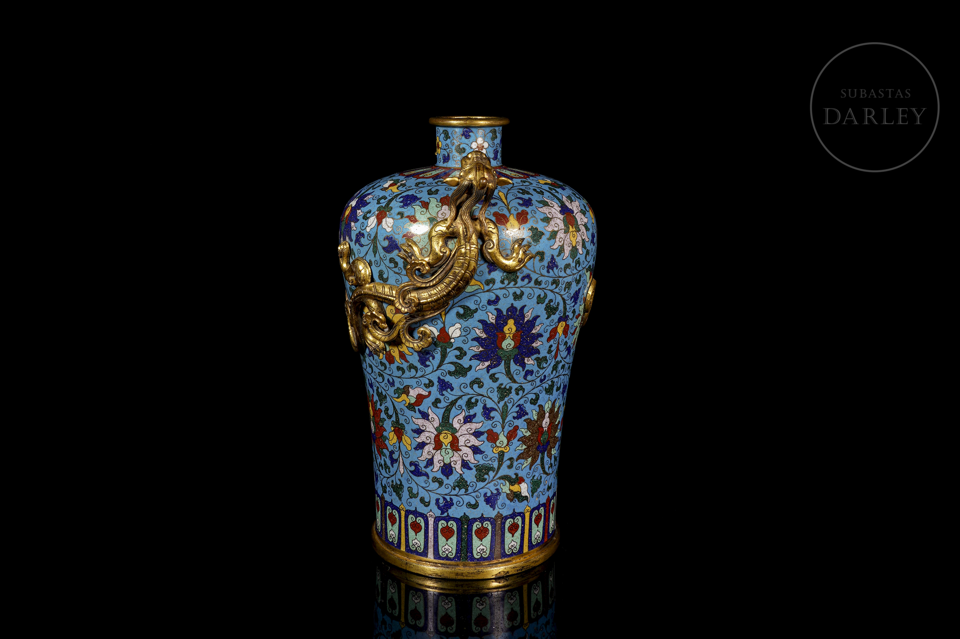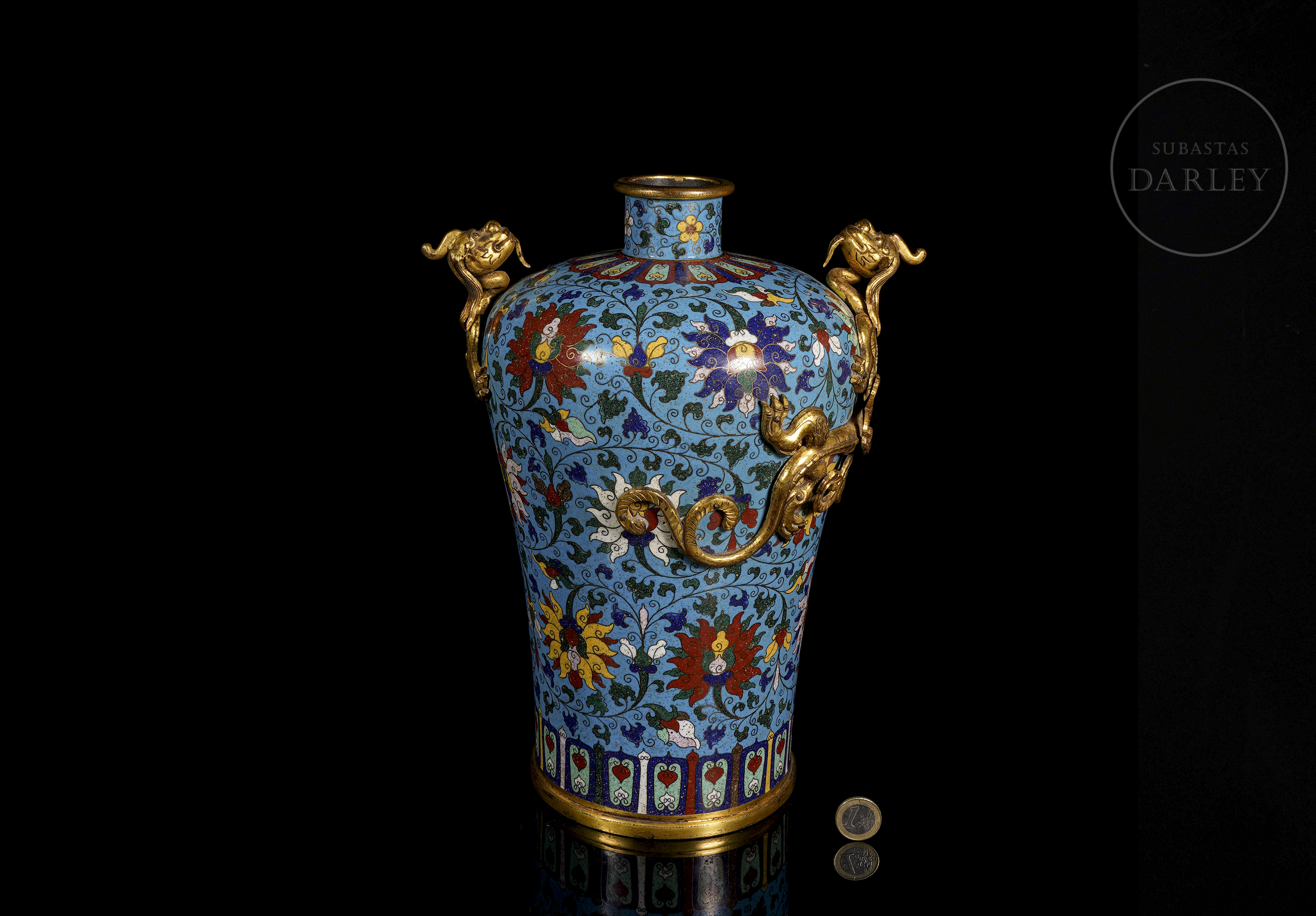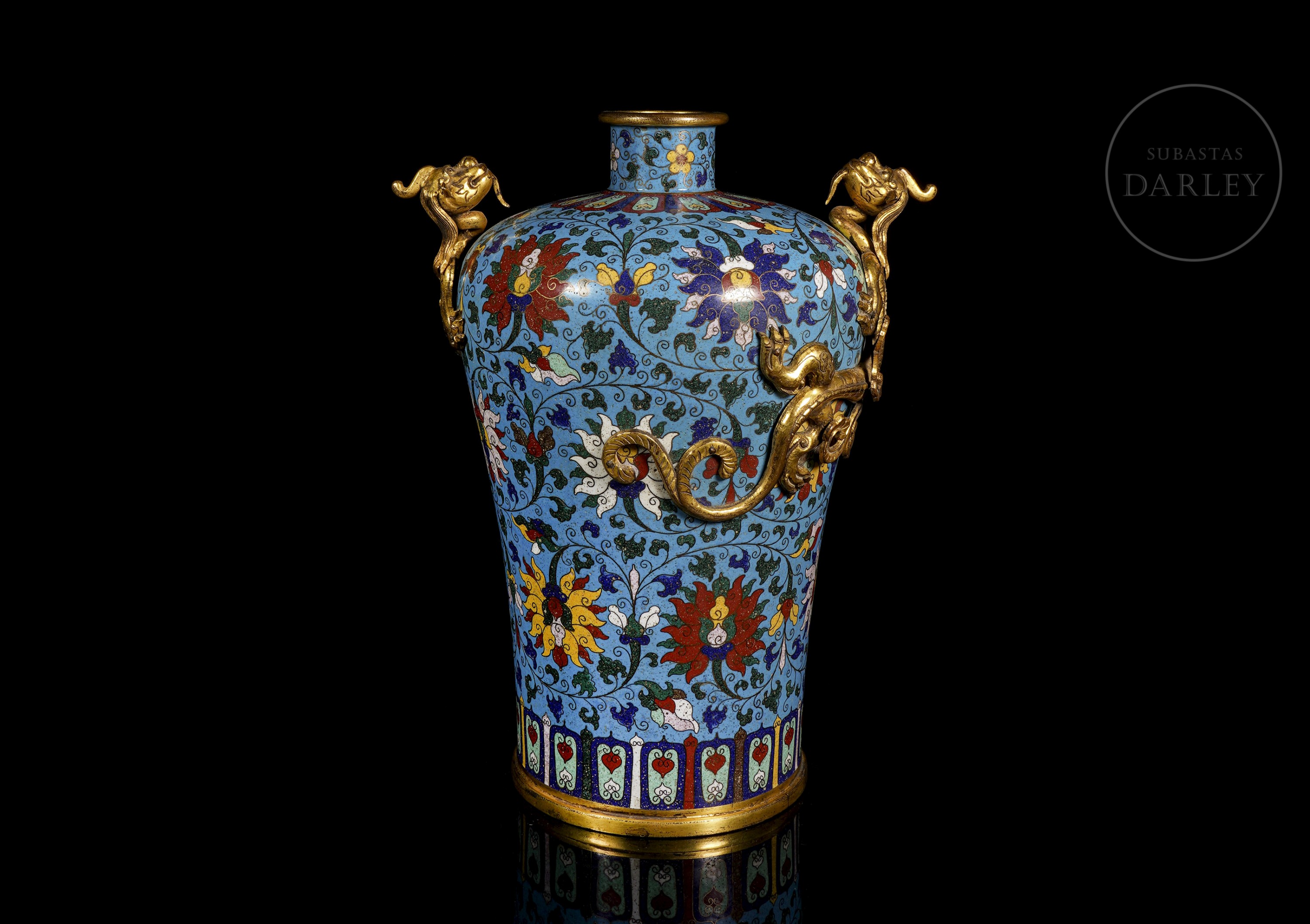 Imponente jarrón de tipo meiping, realizado en esmalte cloisonné sobre un cuerpo de bronce dorado. La superficie está profusamente decorada con un diseño continuo de flores de loto y zarcillos vegetales en esmaltes polícromos sobre un fondo azul turquesa. Dos grandes asas adornan los hombros, esculpidas en metal con un acabado dorado y con forma de dragones chilong de expresión feroz y cuerpo enroscado. La pieza está realizada en el estilo Xuande de la dinastía Ming.