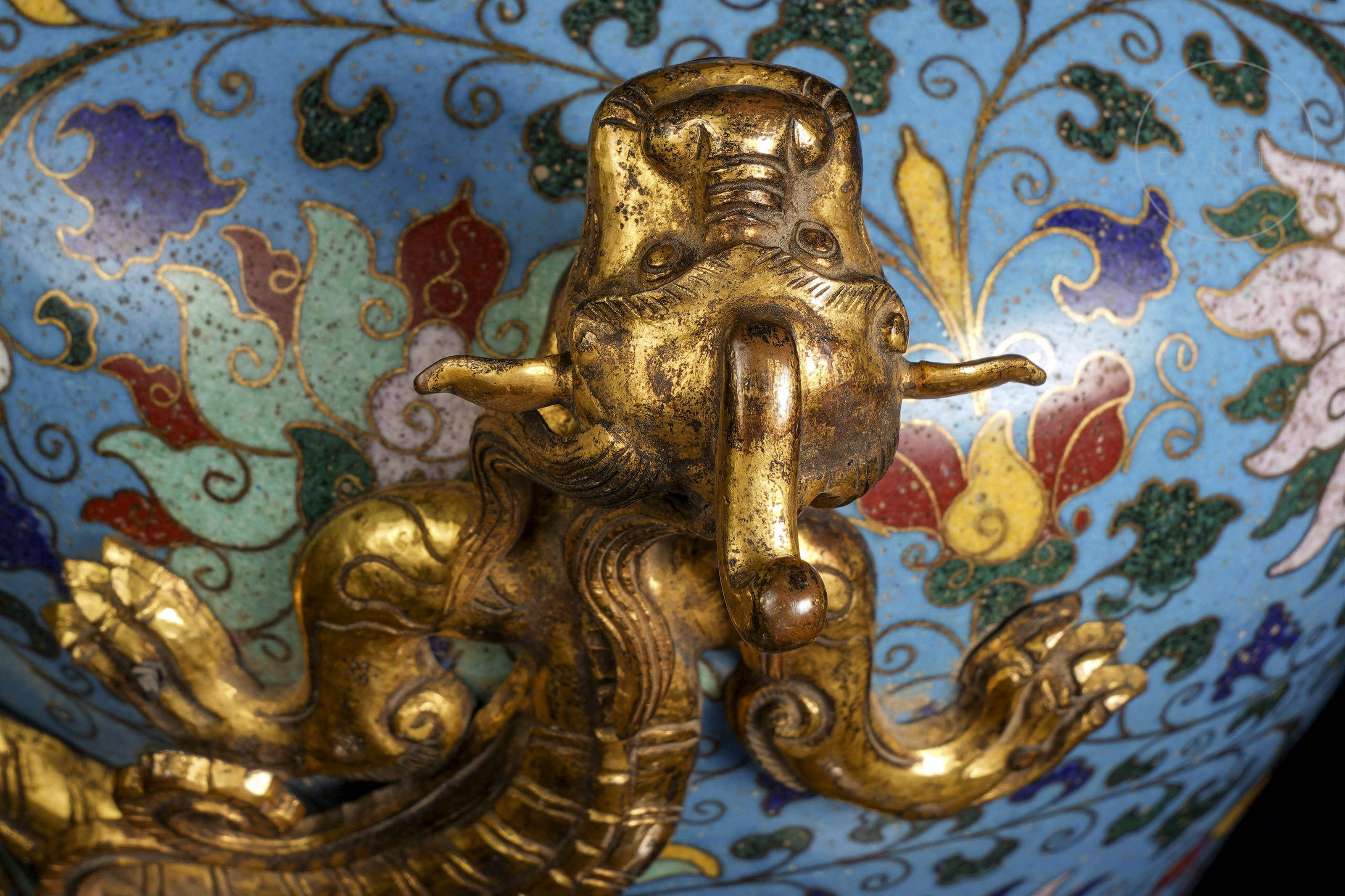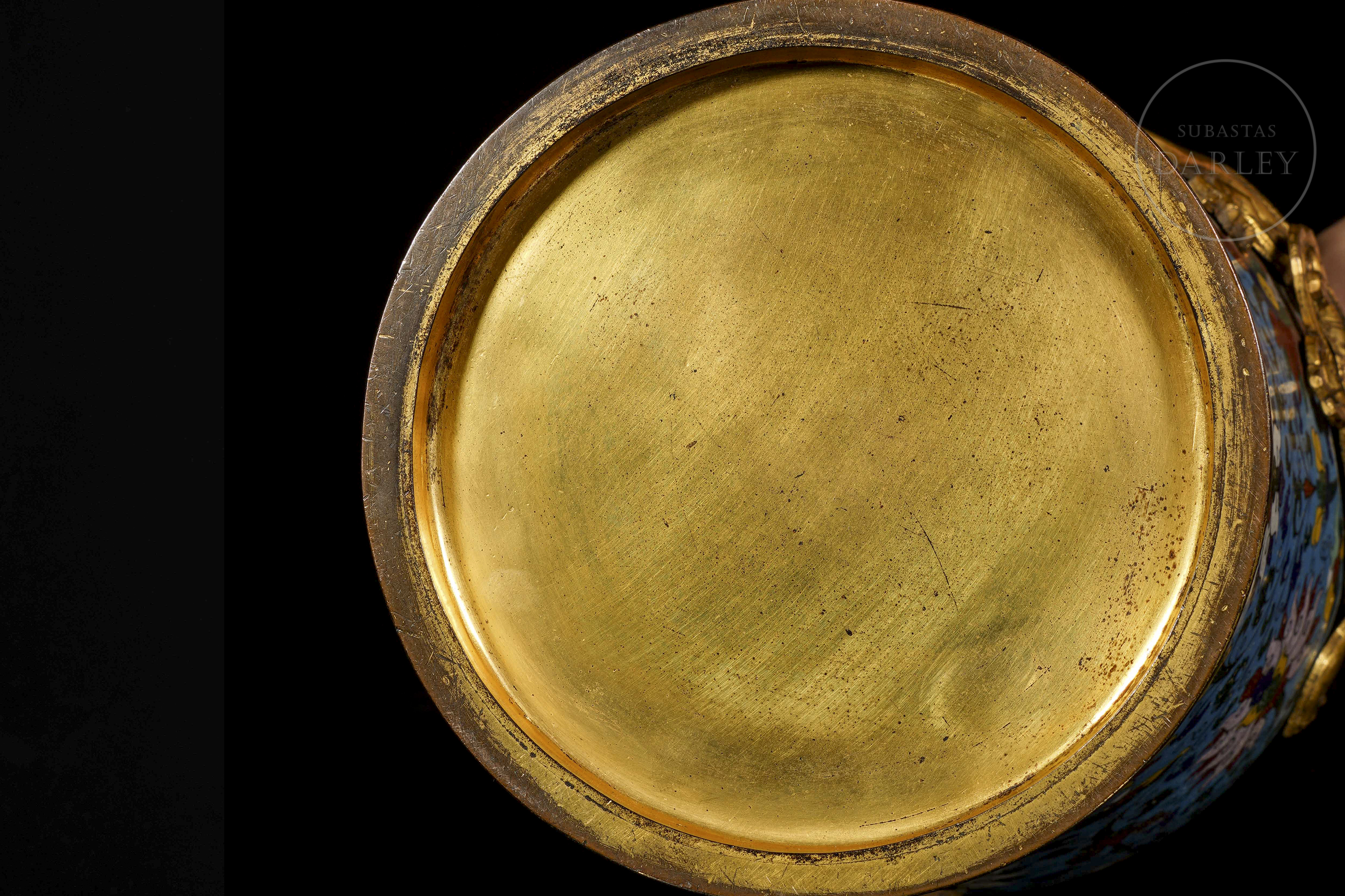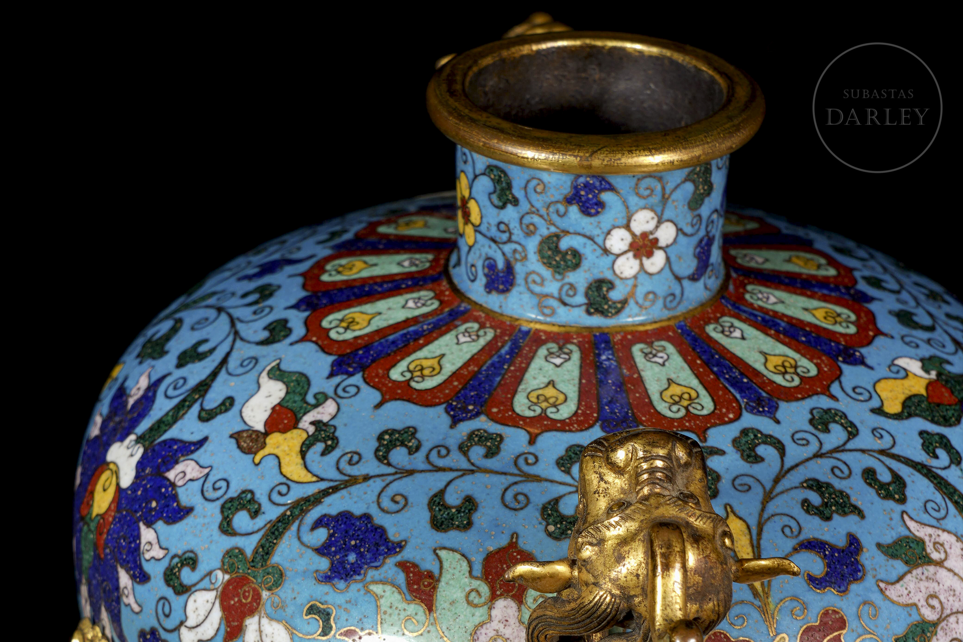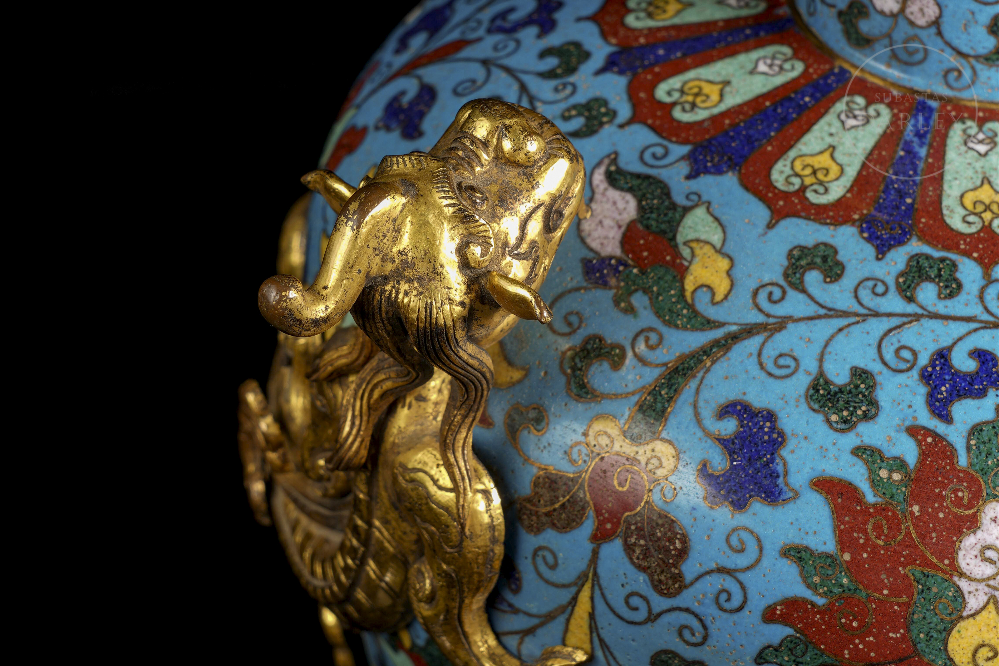 Imponente jarrón de tipo meiping, realizado en esmalte cloisonné sobre un cuerpo de bronce dorado. La superficie está profusamente decorada con un diseño continuo de flores de loto y zarcillos vegetales en esmaltes polícromos sobre un fondo azul turquesa. Dos grandes asas adornan los hombros, esculpidas en metal con un acabado dorado y con forma de dragones chilong de expresión feroz y cuerpo enroscado. La pieza está realizada en el estilo Xuande de la dinastía Ming.