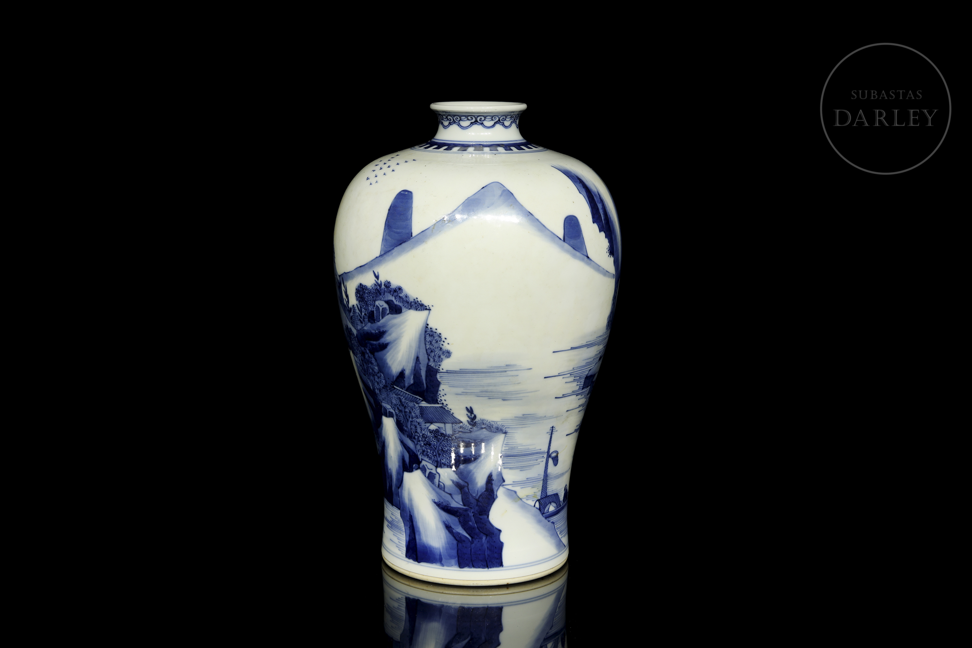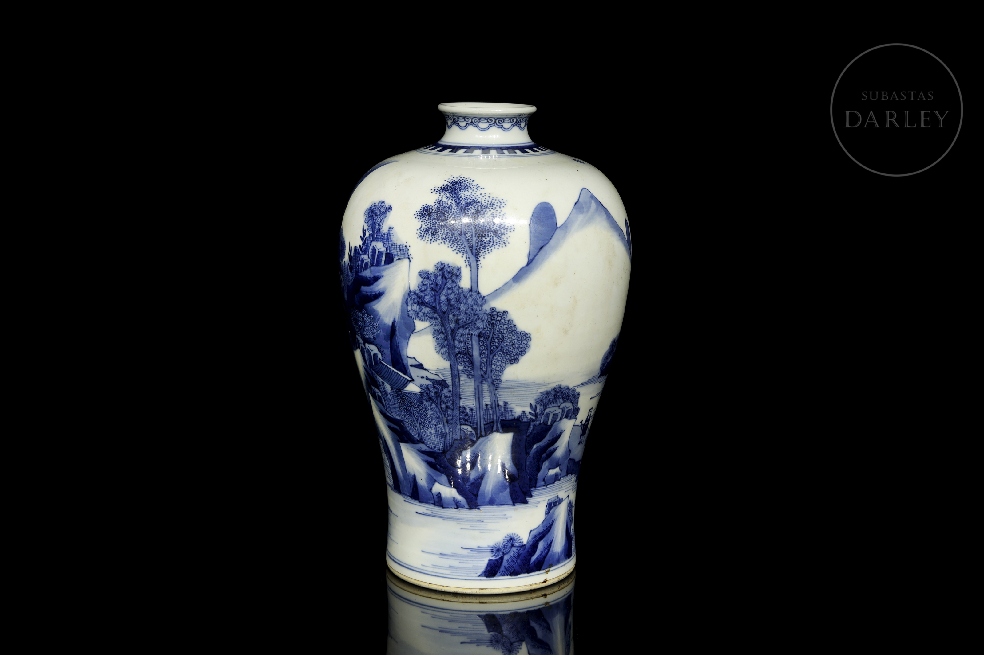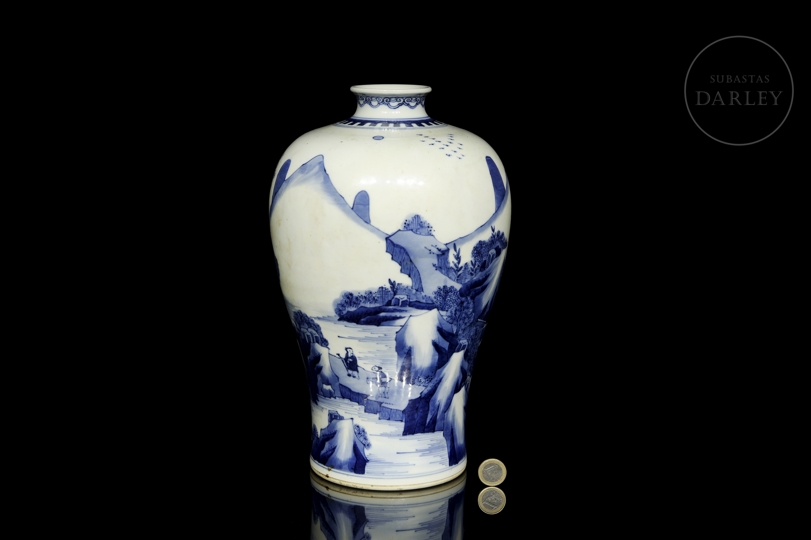 Jarrón meiping de porcelana azul y blanca "Paisaje", dinastía Qing