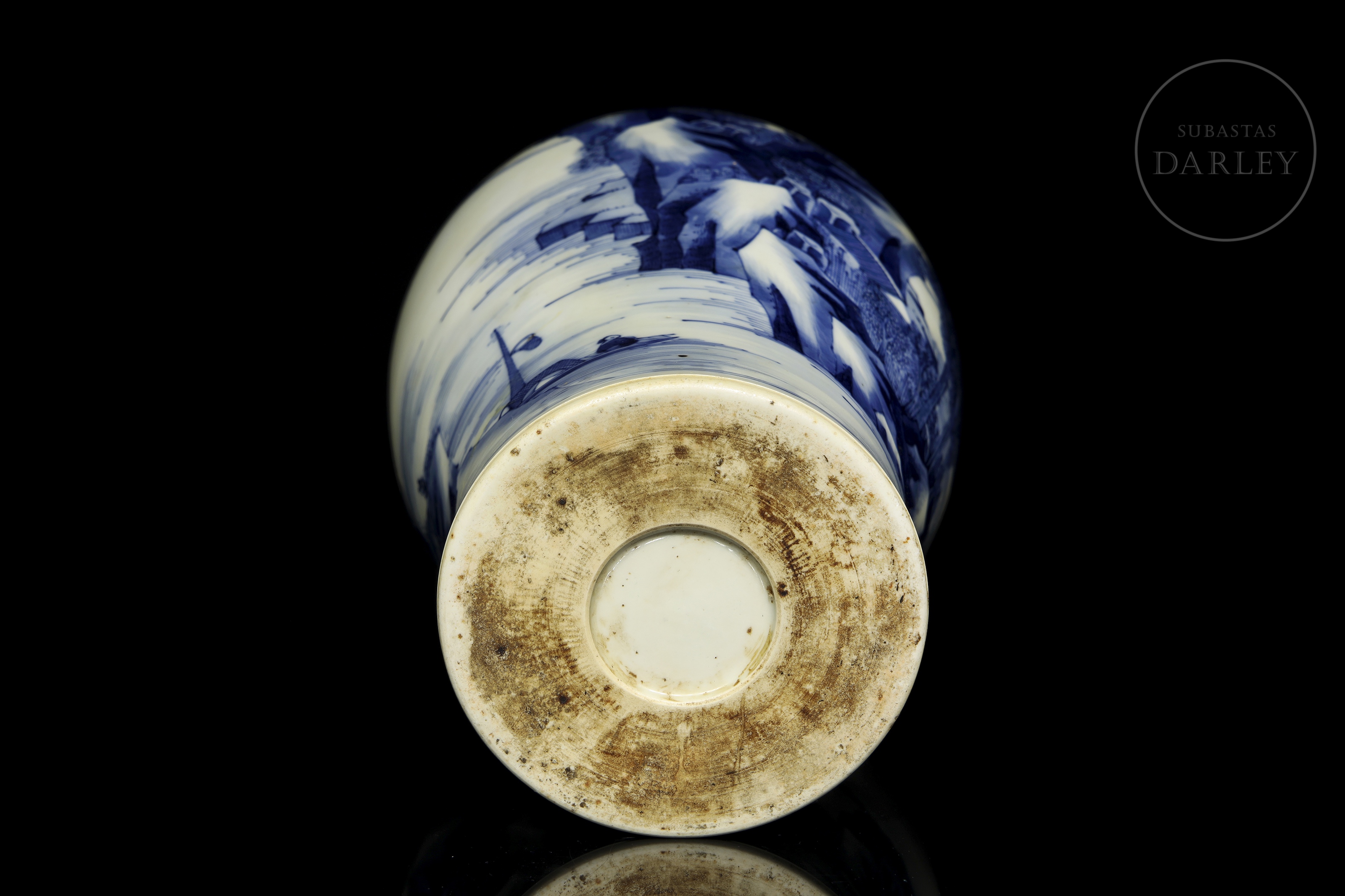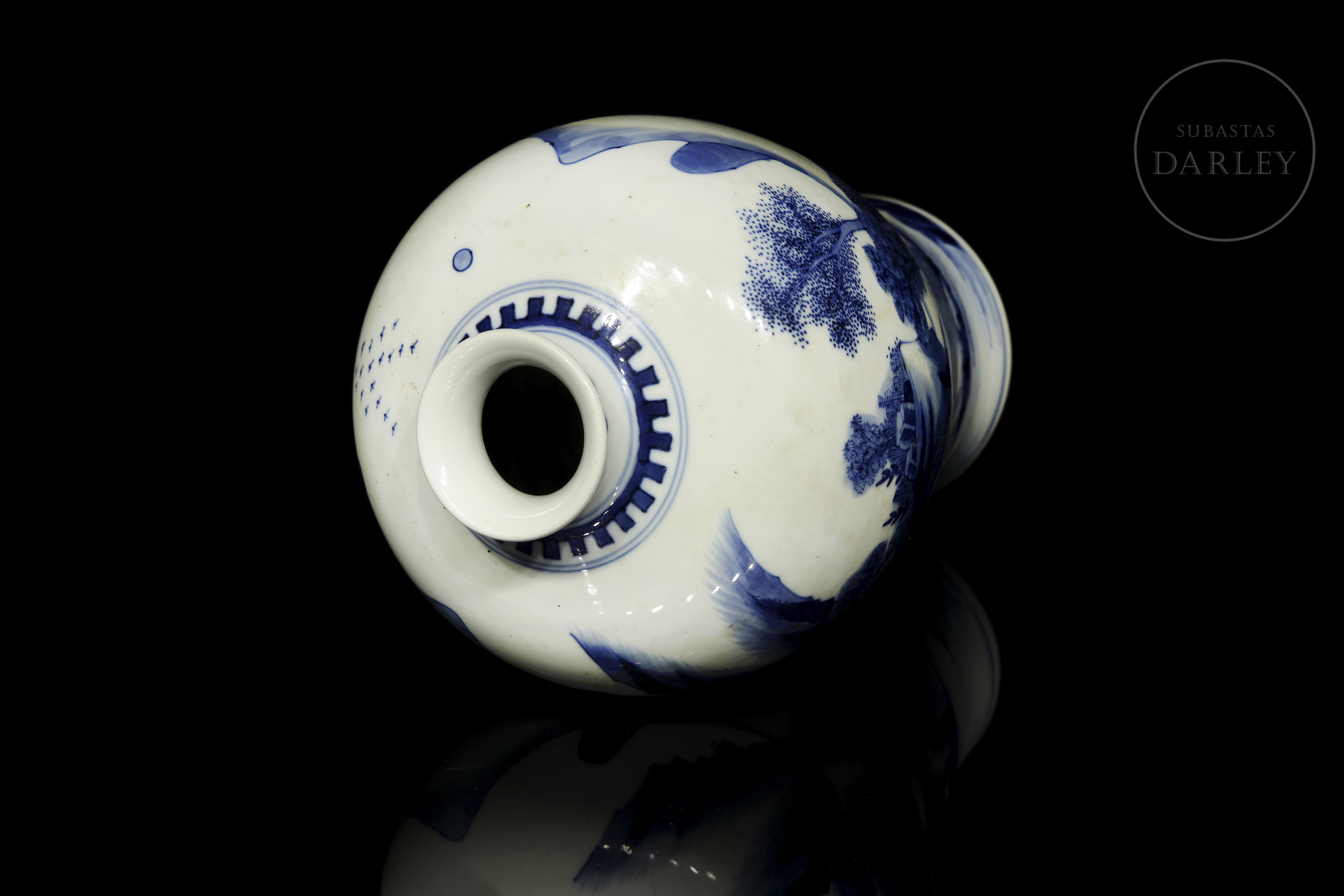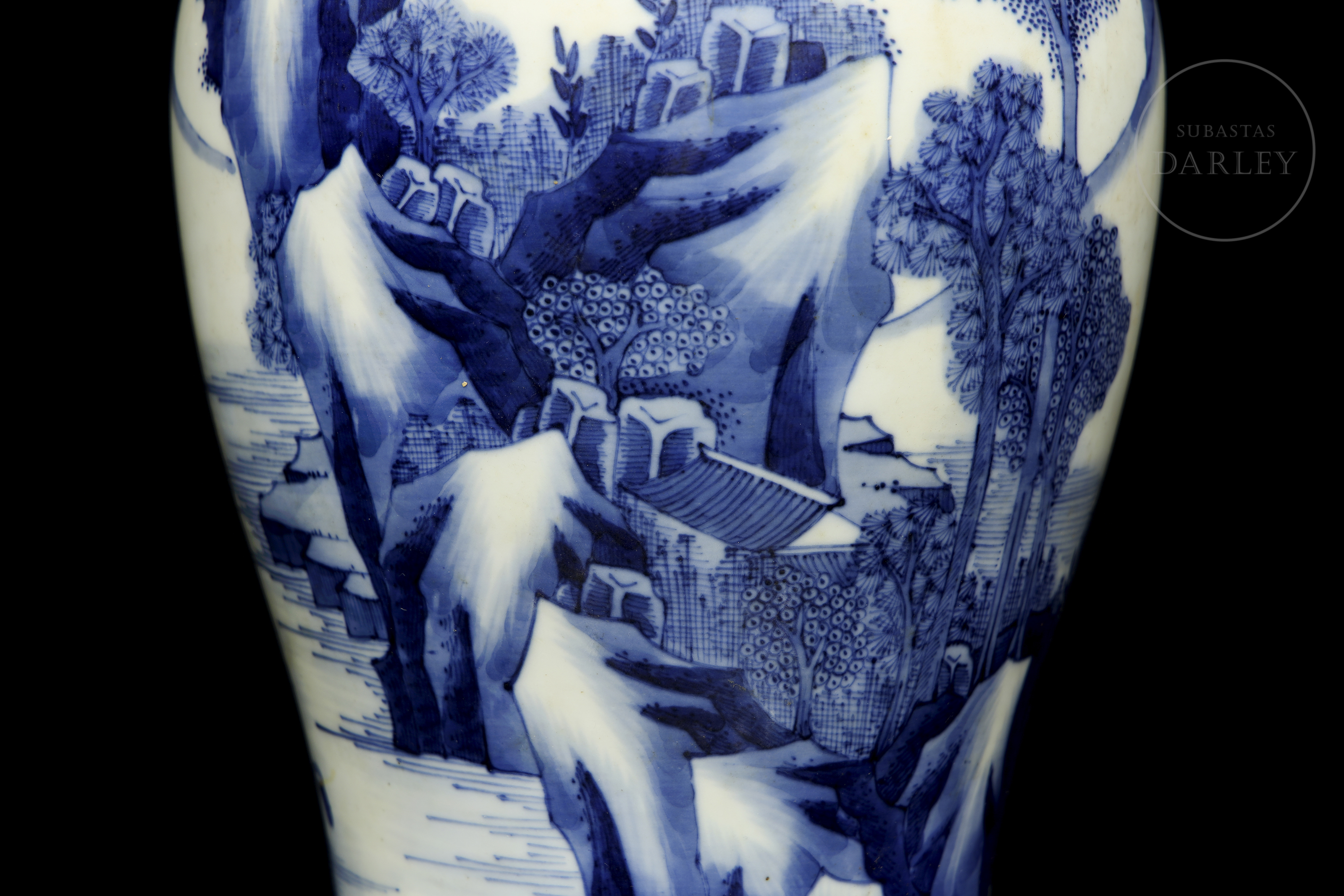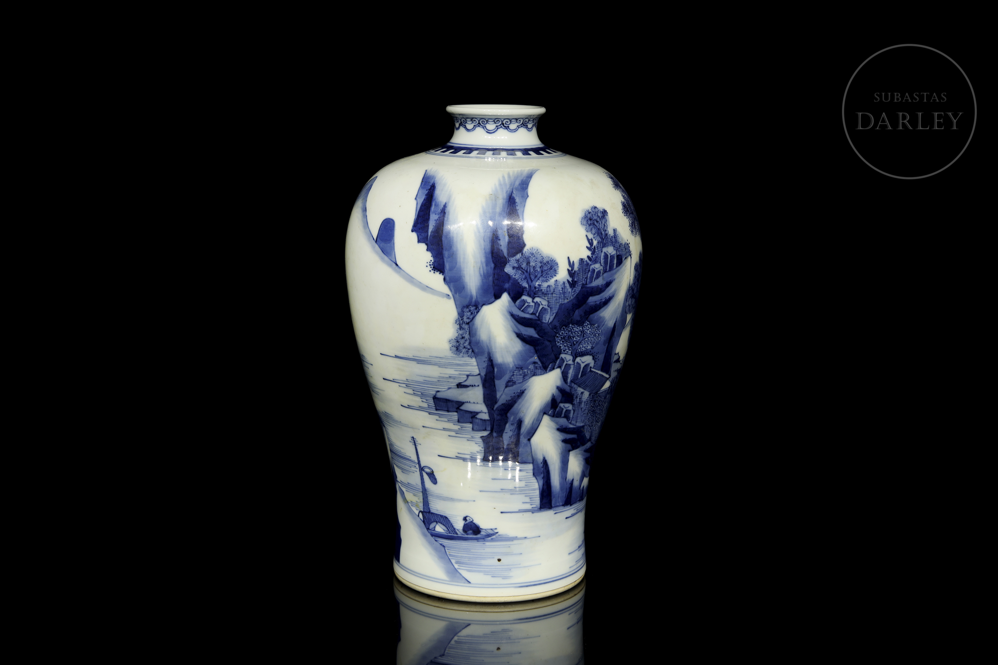Jarrón meiping de porcelana azul y blanca "Paisaje", dinastía Qing