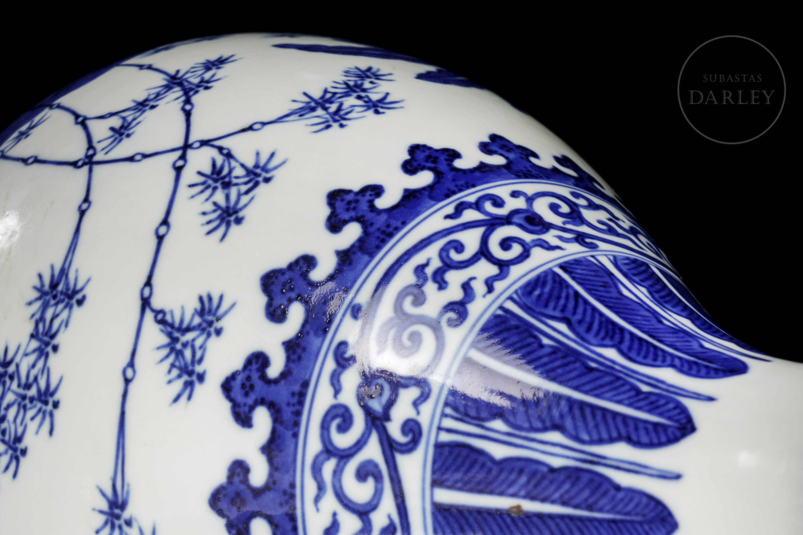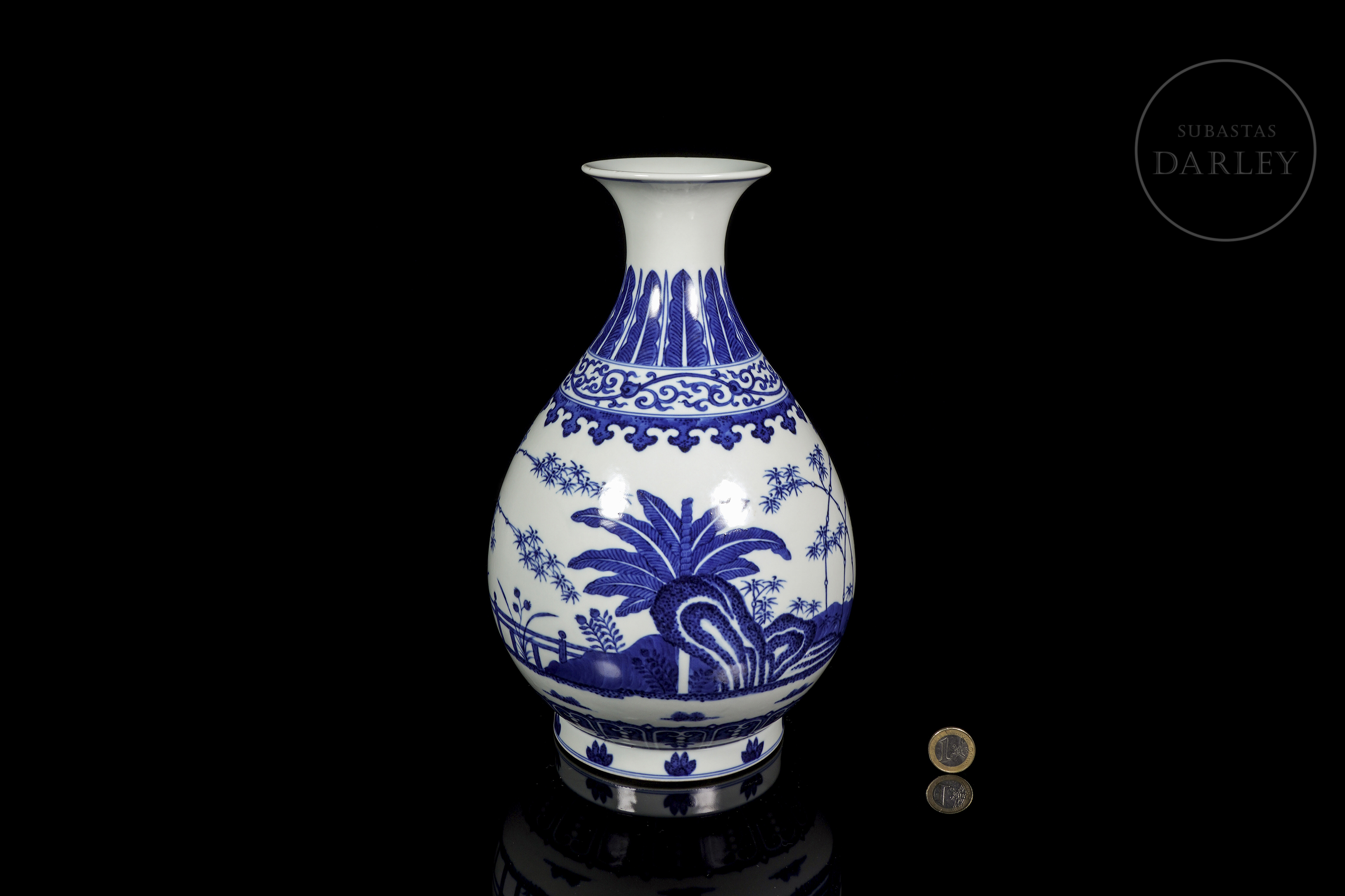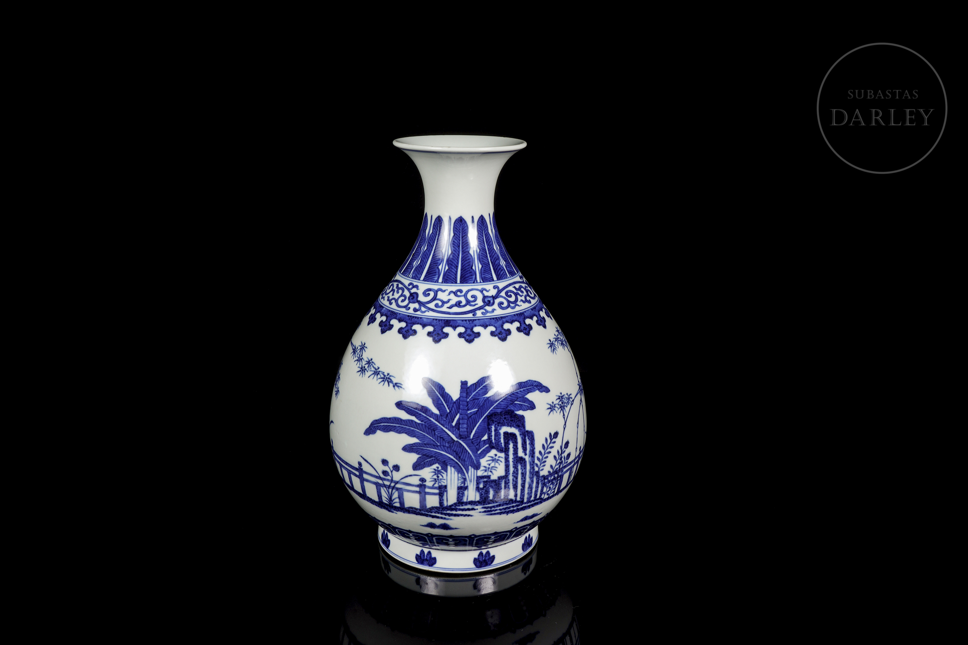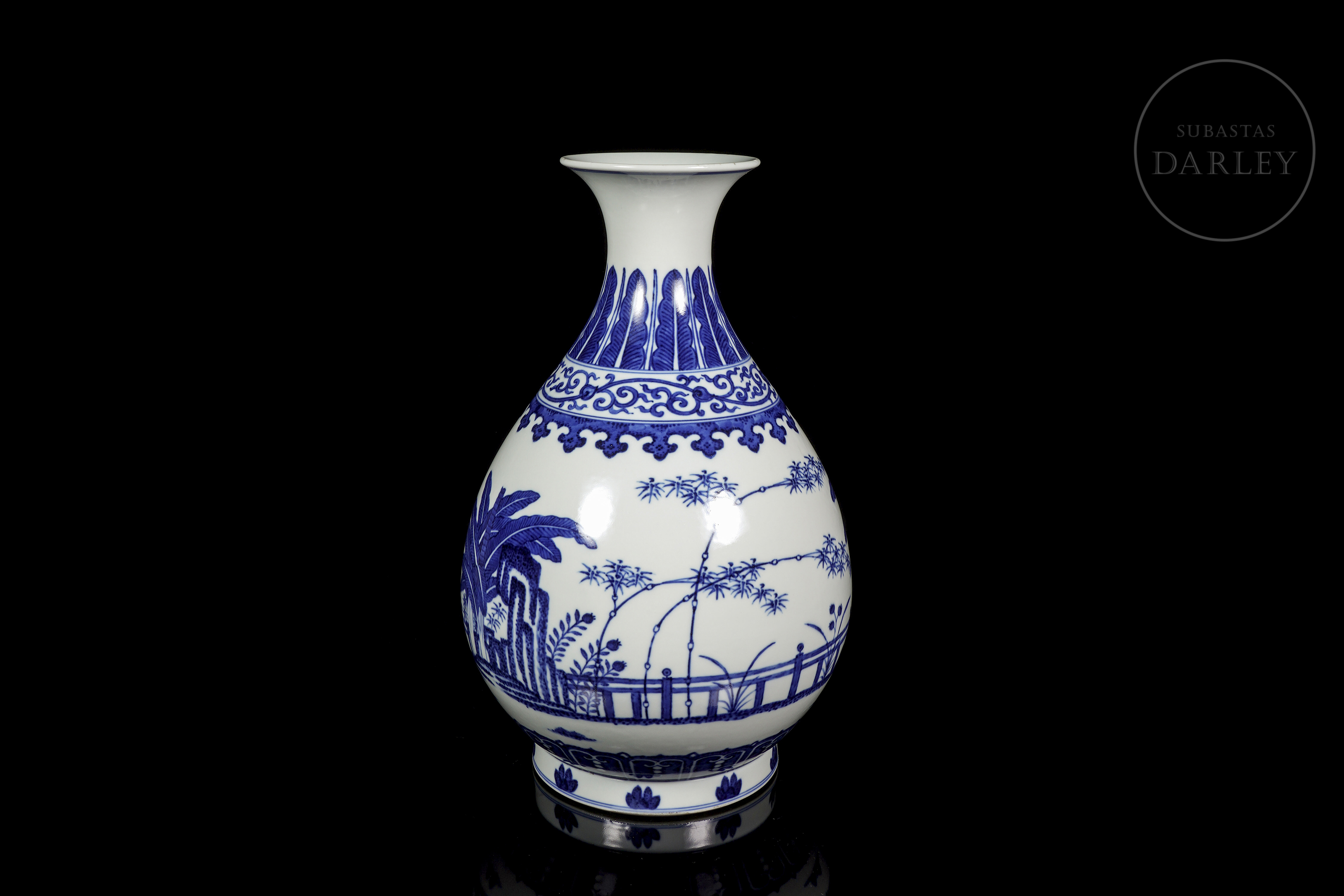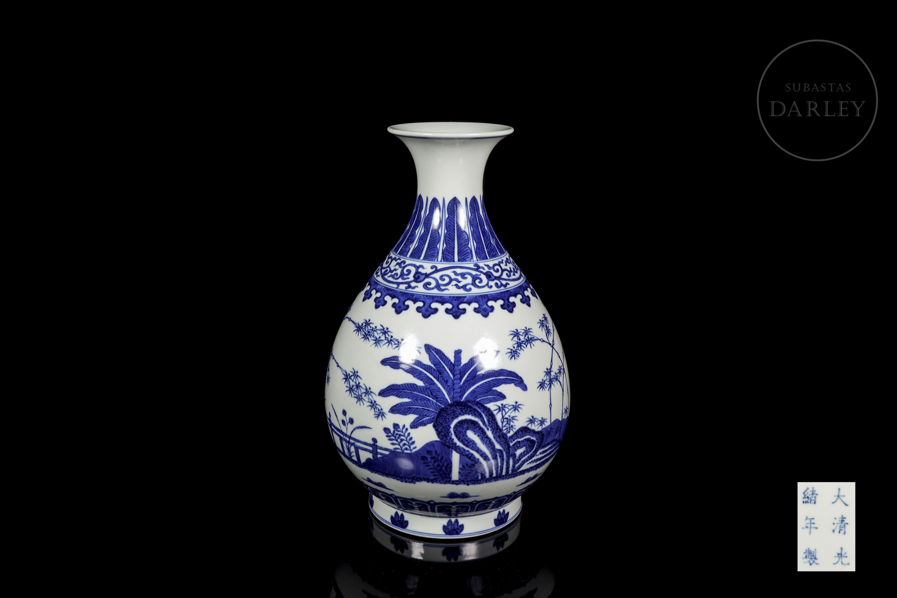 Jarrón Yuhuchun de porcelana en azul y blanco "Paisaje", con marca Guangxu