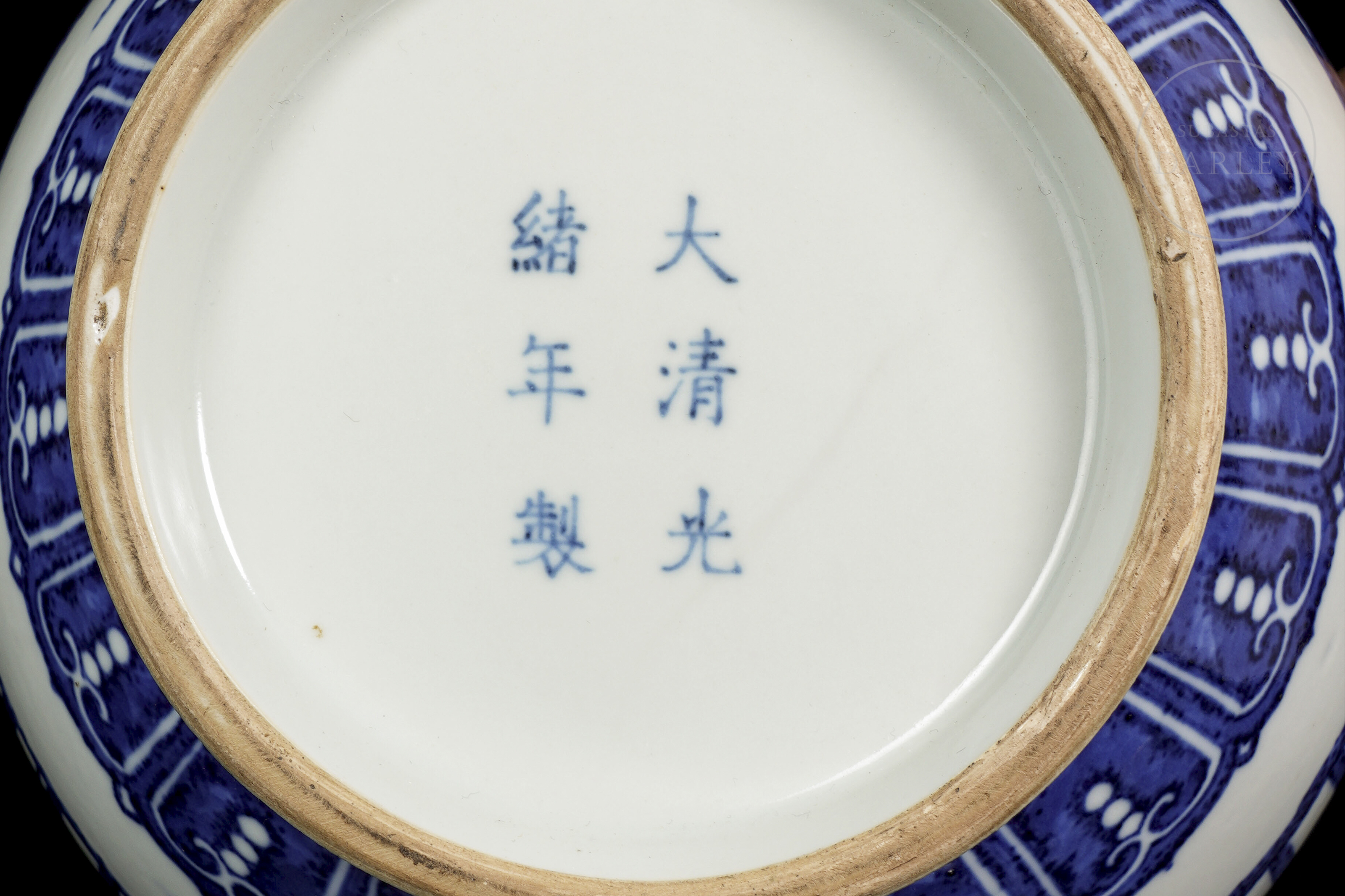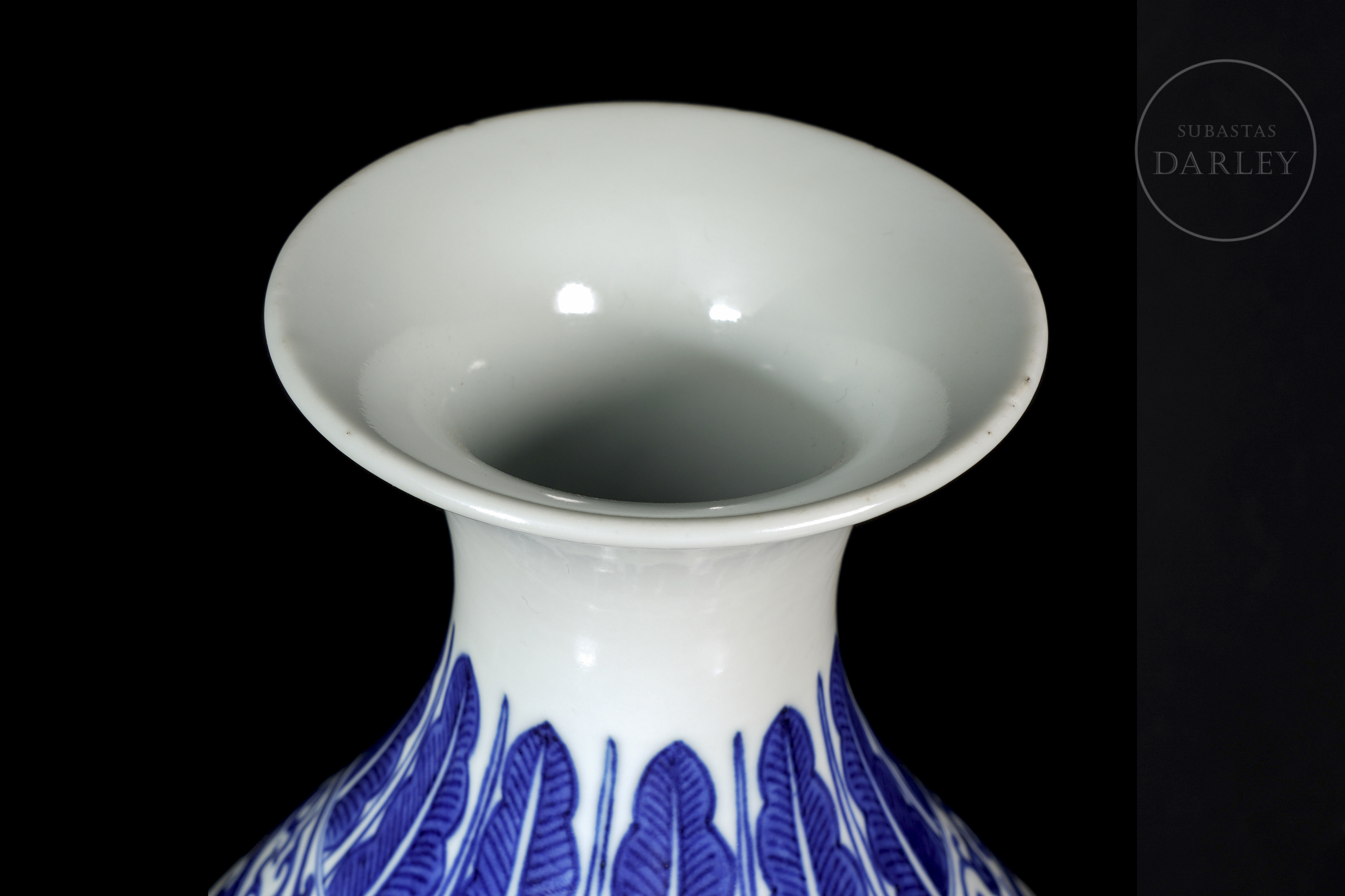Jarrón de porcelana de la elegante forma clásica yuhuchunping, con cuerpo periforme y cuello esbelto que se abre en una boca acampanada. Toda la superficie está decorada en azul cobalto bajo vidriado. El vientre exhibe una escena de jardín con grandes bananeros, plantas y vallas. El cuello y el pie están decorados con cenefas de motivos geométricos y vegetales. En la base se encuentra la marca de seis caracteres “大清光绪年制”.