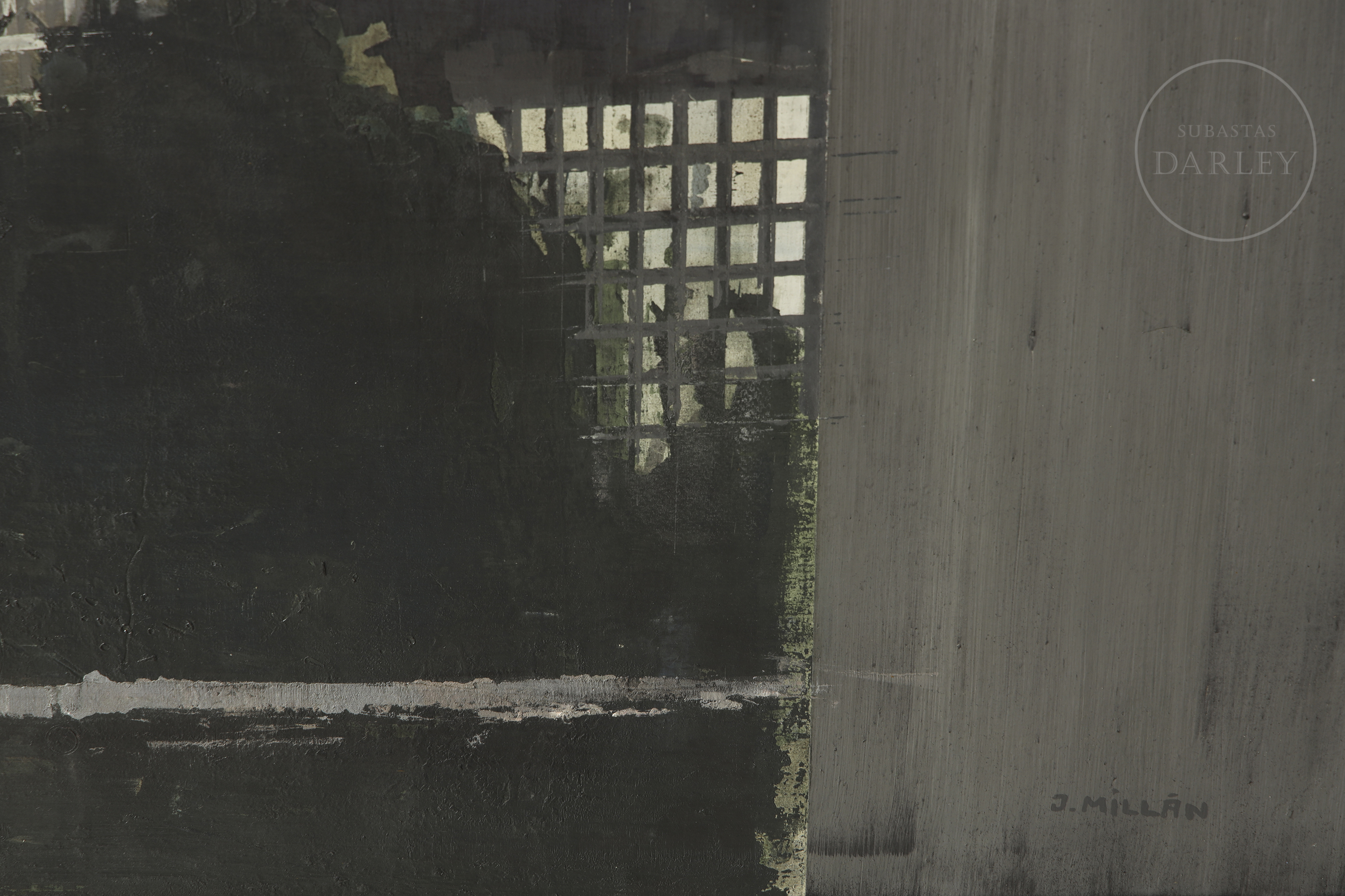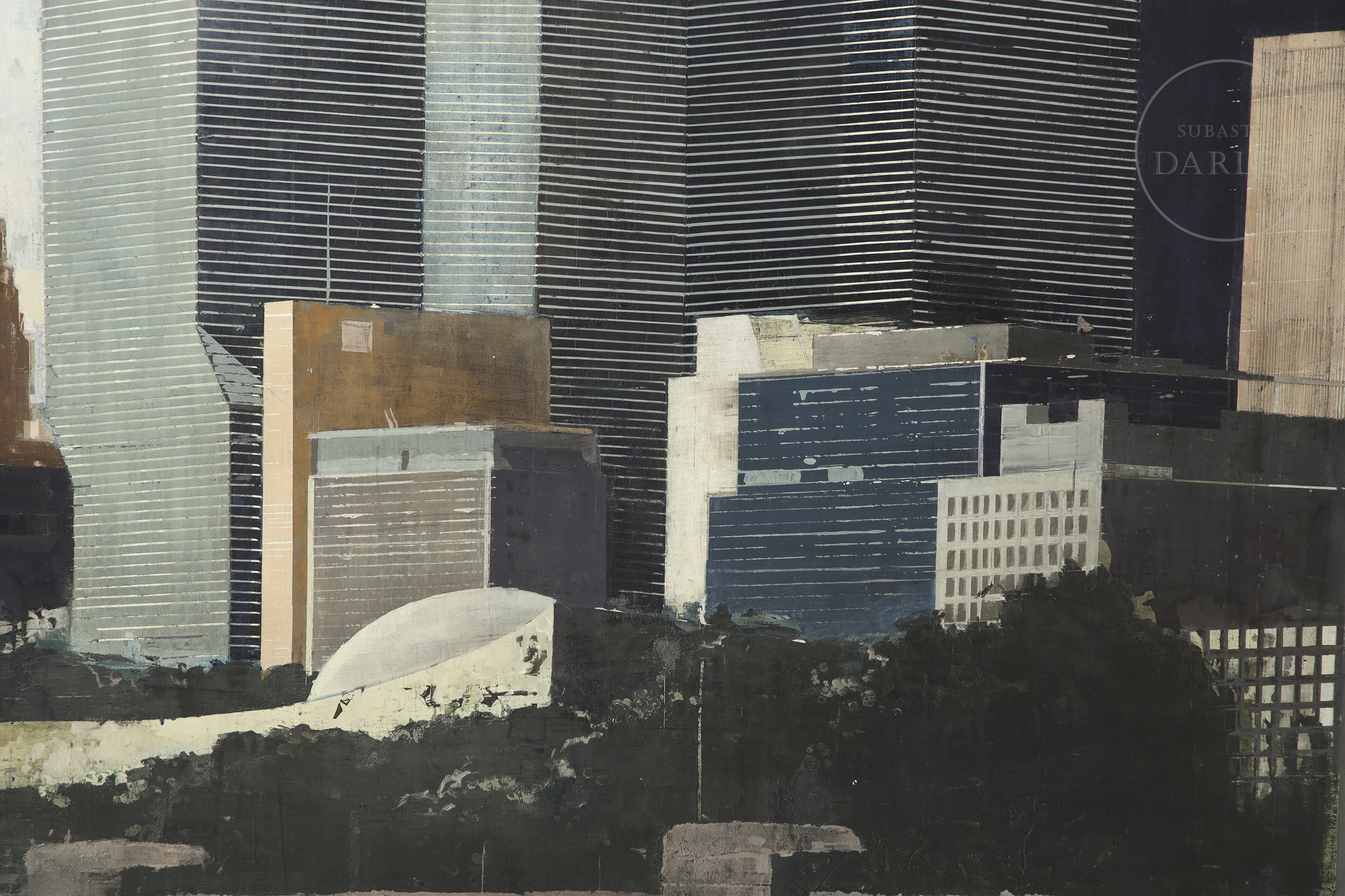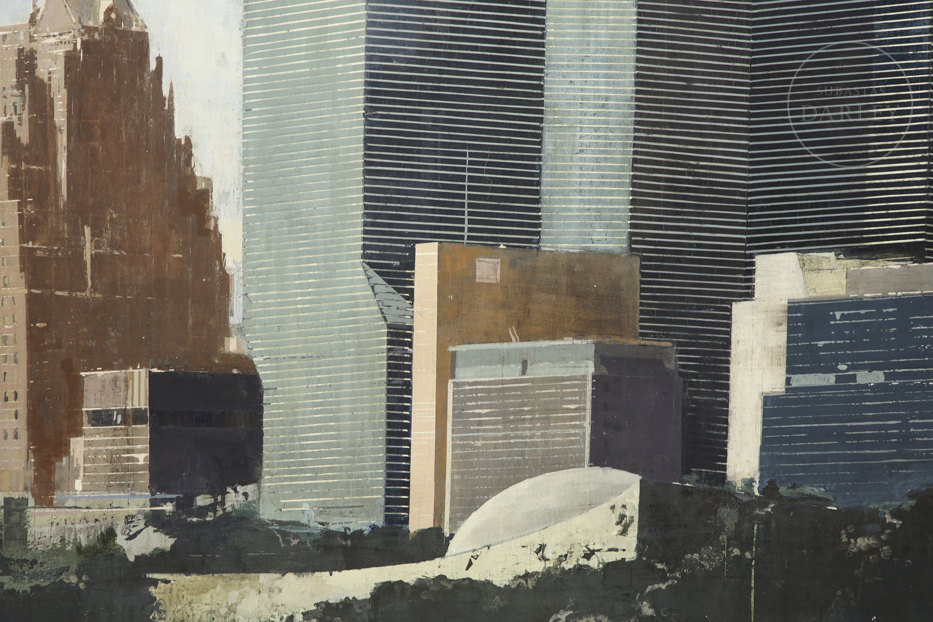 Óleo sobre lienzo. Paisaje urbano de gran formato que representa el complejo de la sede de las Naciones Unidas en Nueva York. Firmado "J. MILLÁN" en el margen inferior derecho. Firmado, titulado y fechado en el reverso.
