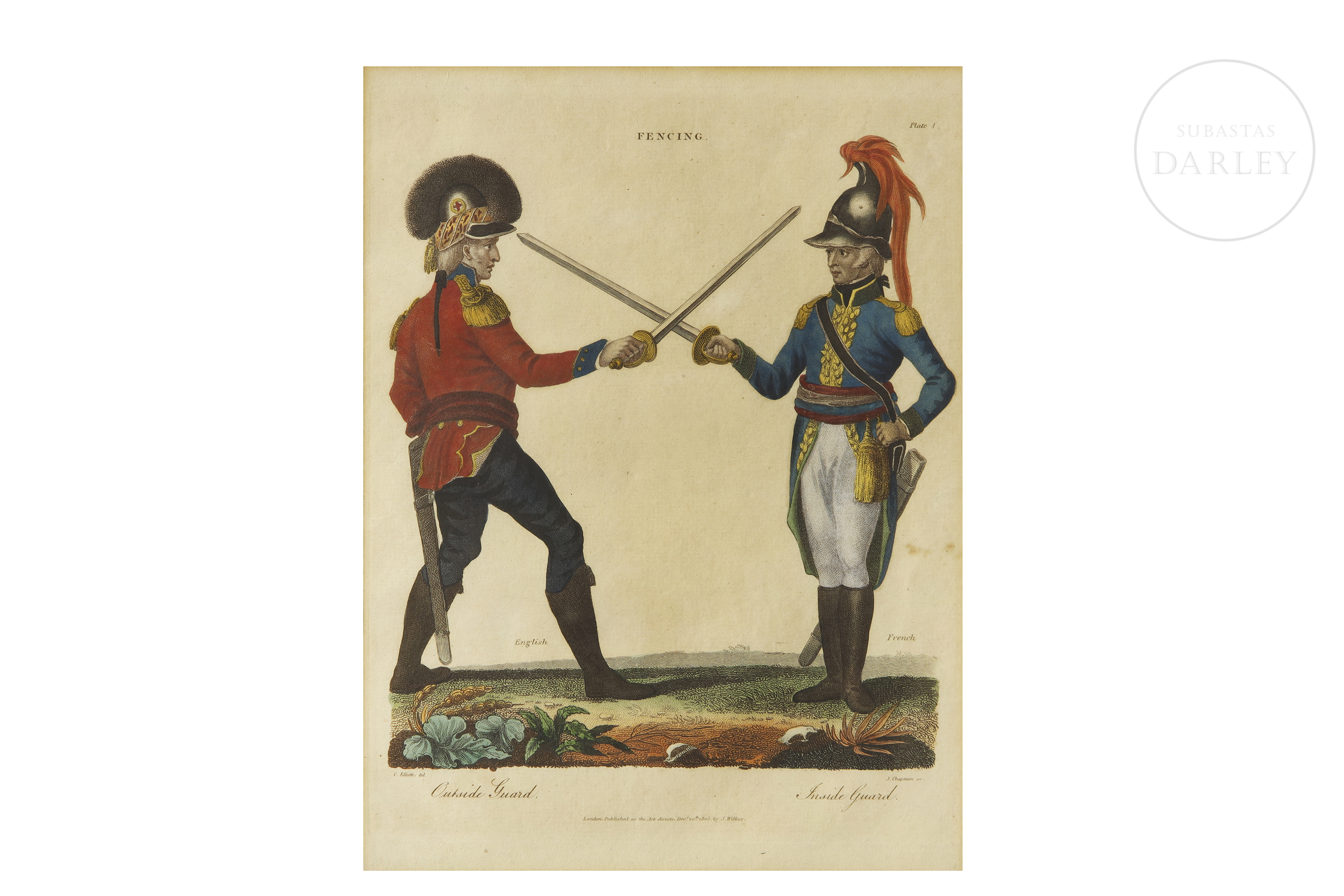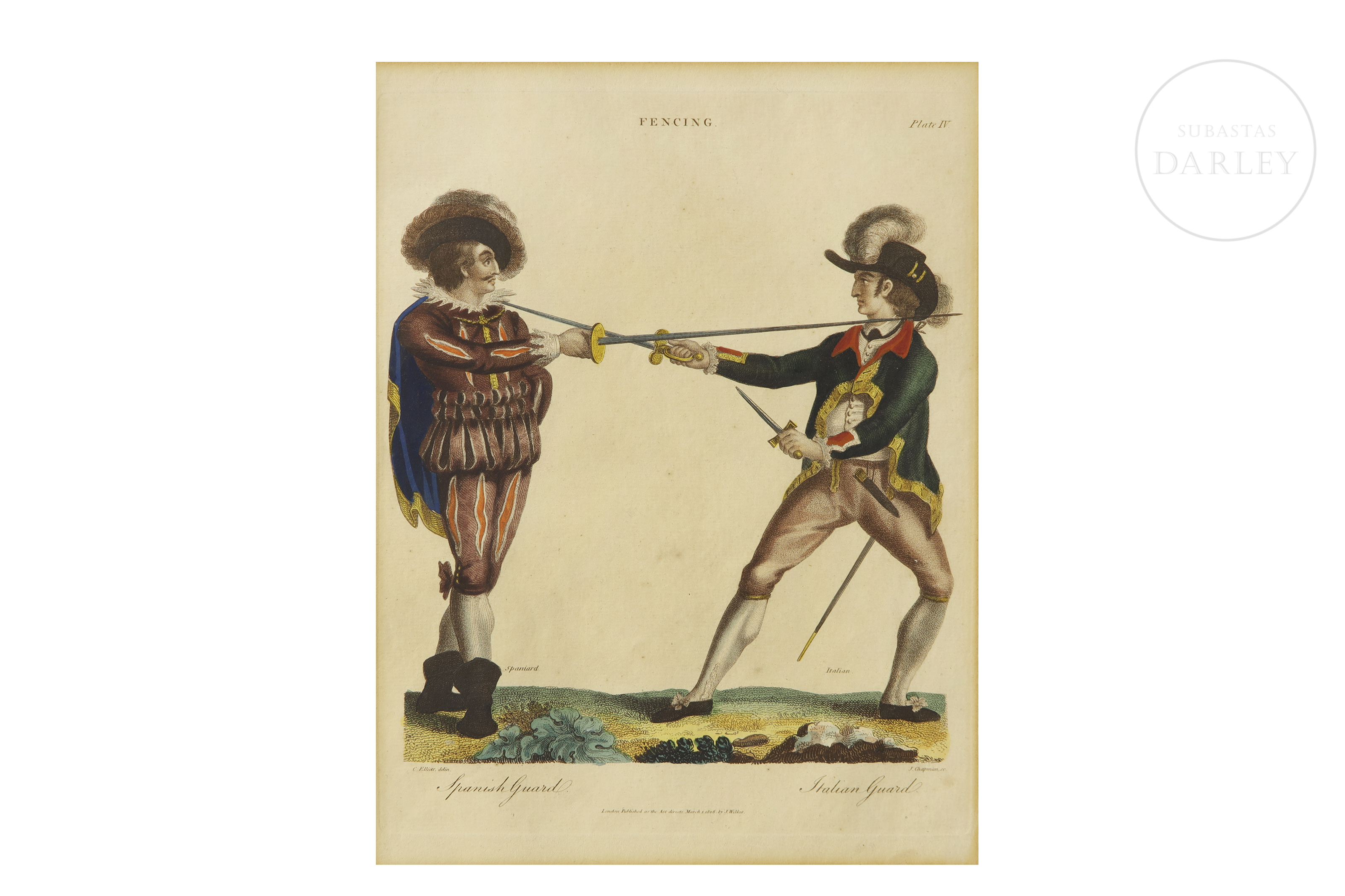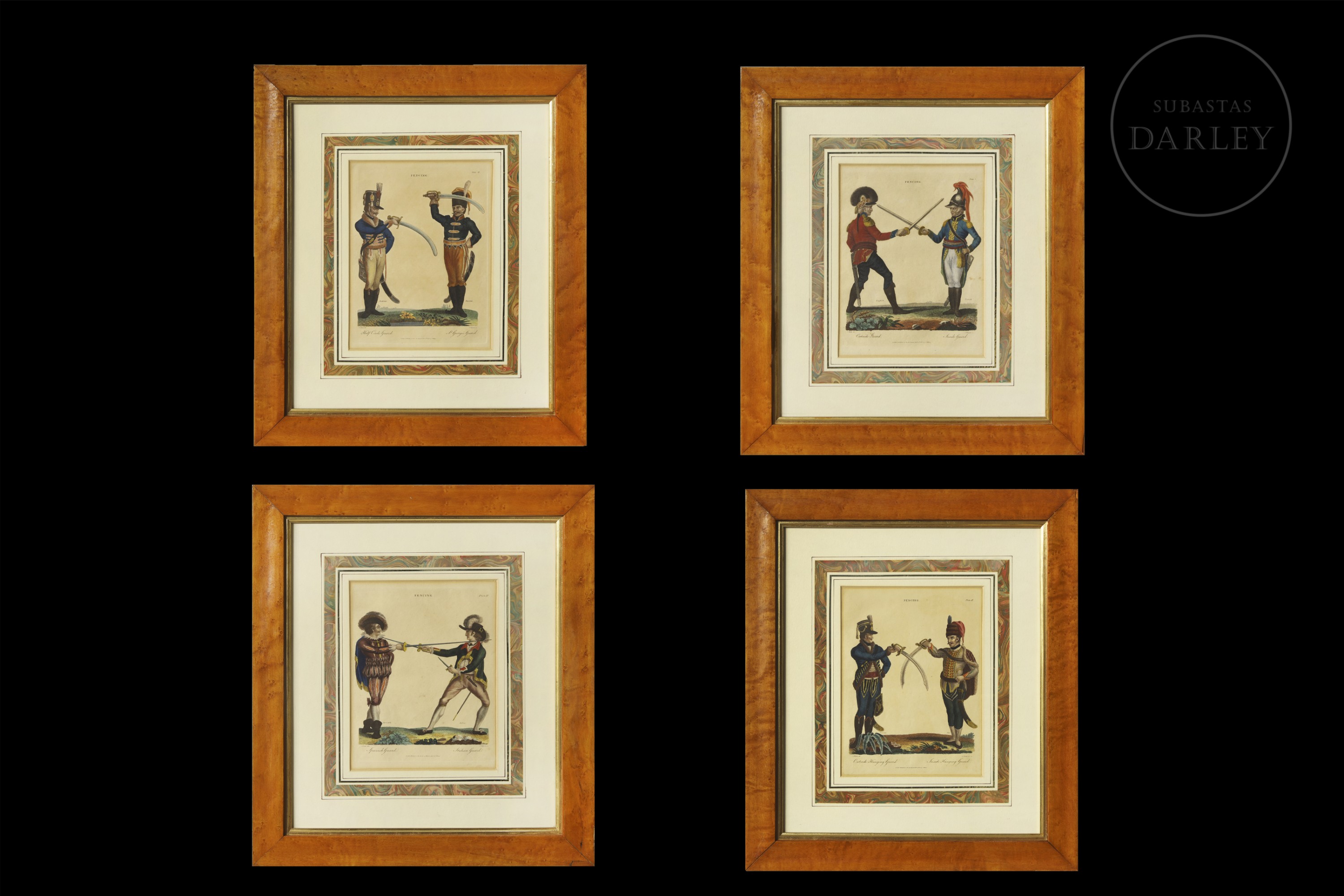 Conjunto de cuatro grabados entintados sobre papel que ilustran diversas posiciones y guardias de esgrima. Presentan a parejas de soldados con uniformes históricos de diferentes naciones.