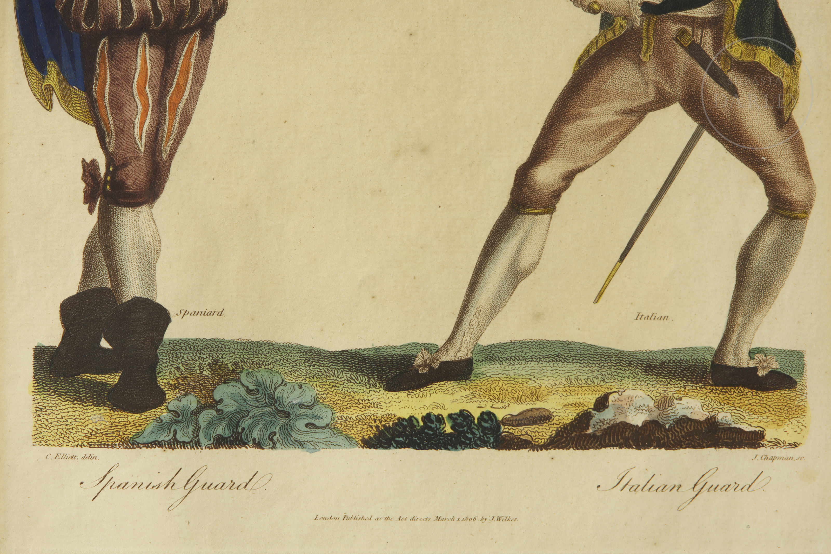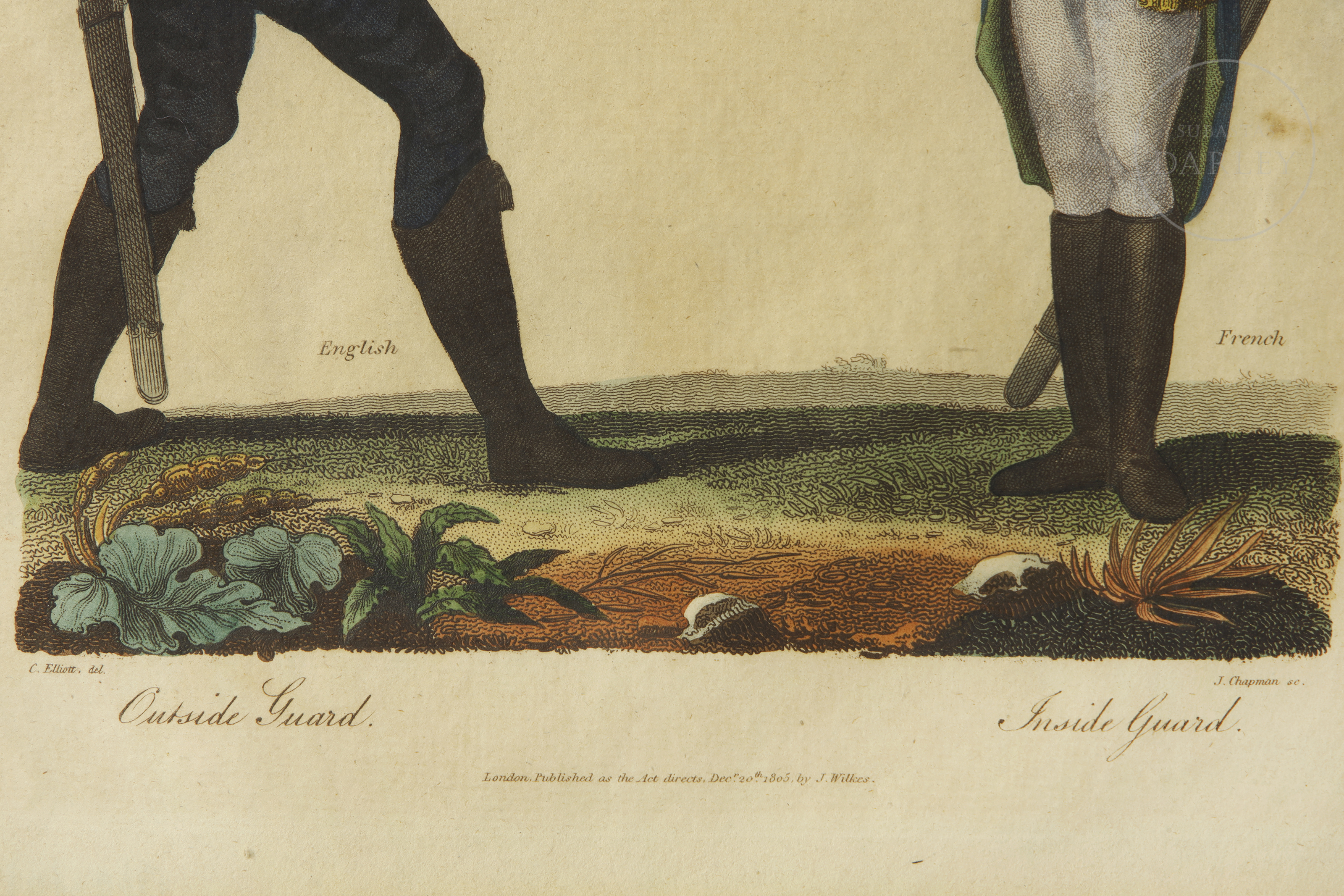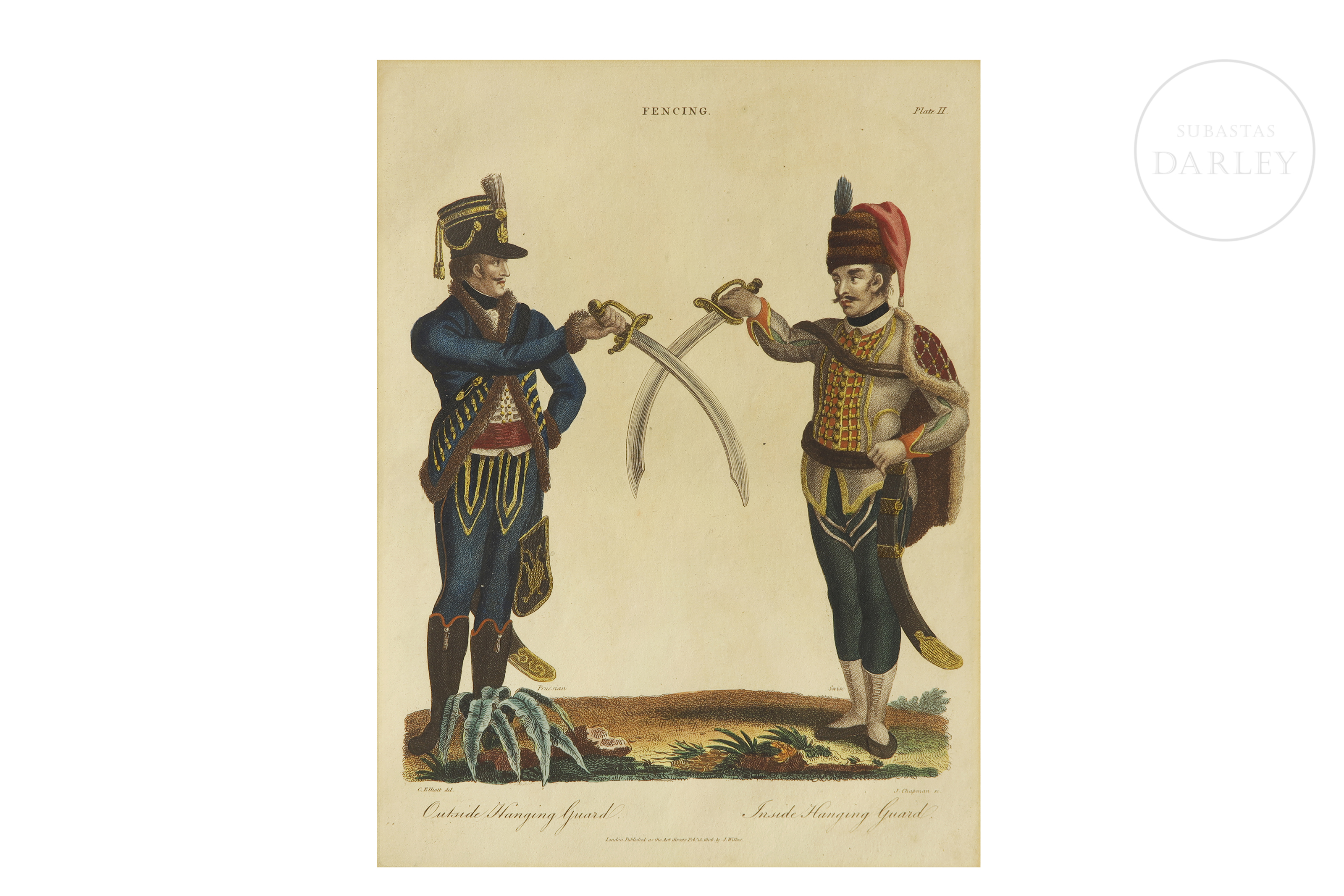 Conjunto de cuatro grabados entintados sobre papel que ilustran diversas posiciones y guardias de esgrima. Presentan a parejas de soldados con uniformes históricos de diferentes naciones.