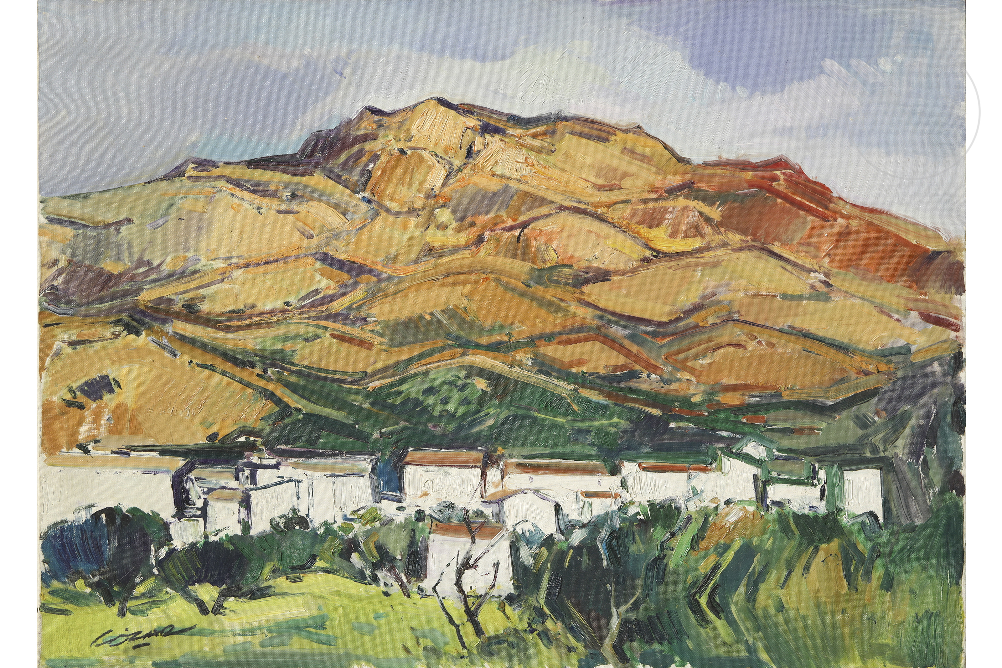 Óleo sobre lienzo. Paisaje andaluz que captura la orografía montañosa de la provincia de Jaén, mostrando un conjunto de arquitecturas rurales integradas en la falda de un monte. Firmado "Cózar" en la esquina inferior izquierda. Titulado y firmado en el reverso.