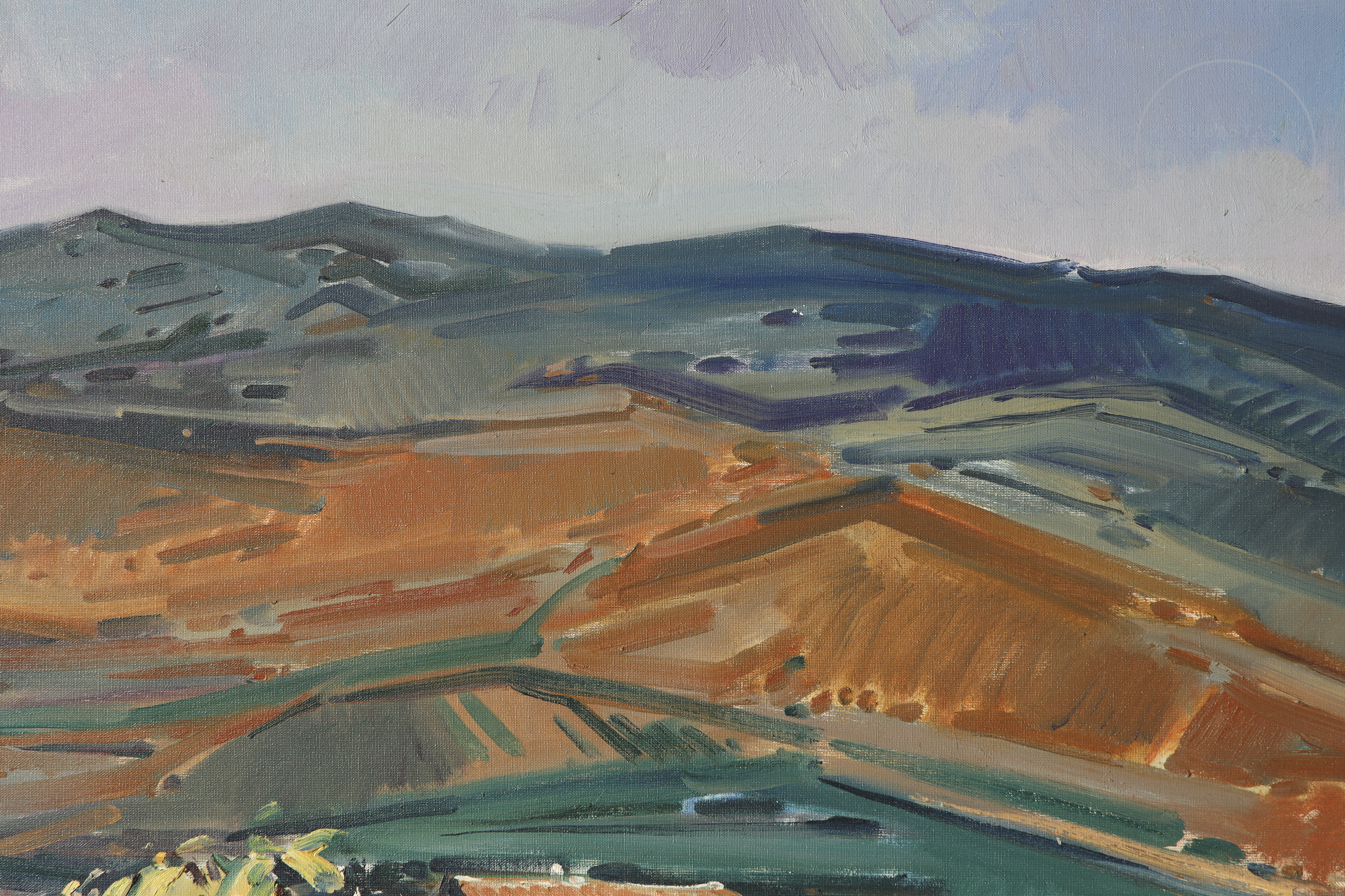 Óleo sobre lienzo. Paisaje tradicional español realizado en una paleta de tonalidades tierra y verdes. Firmado "Cózar" en la esquina inferior derecha. Titulado y firmado en el reverso.
