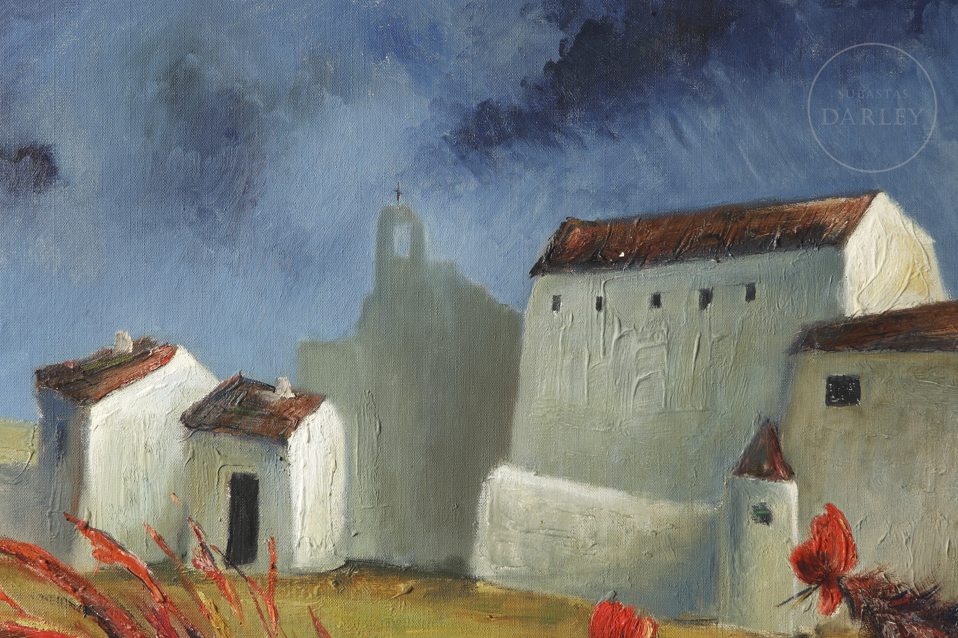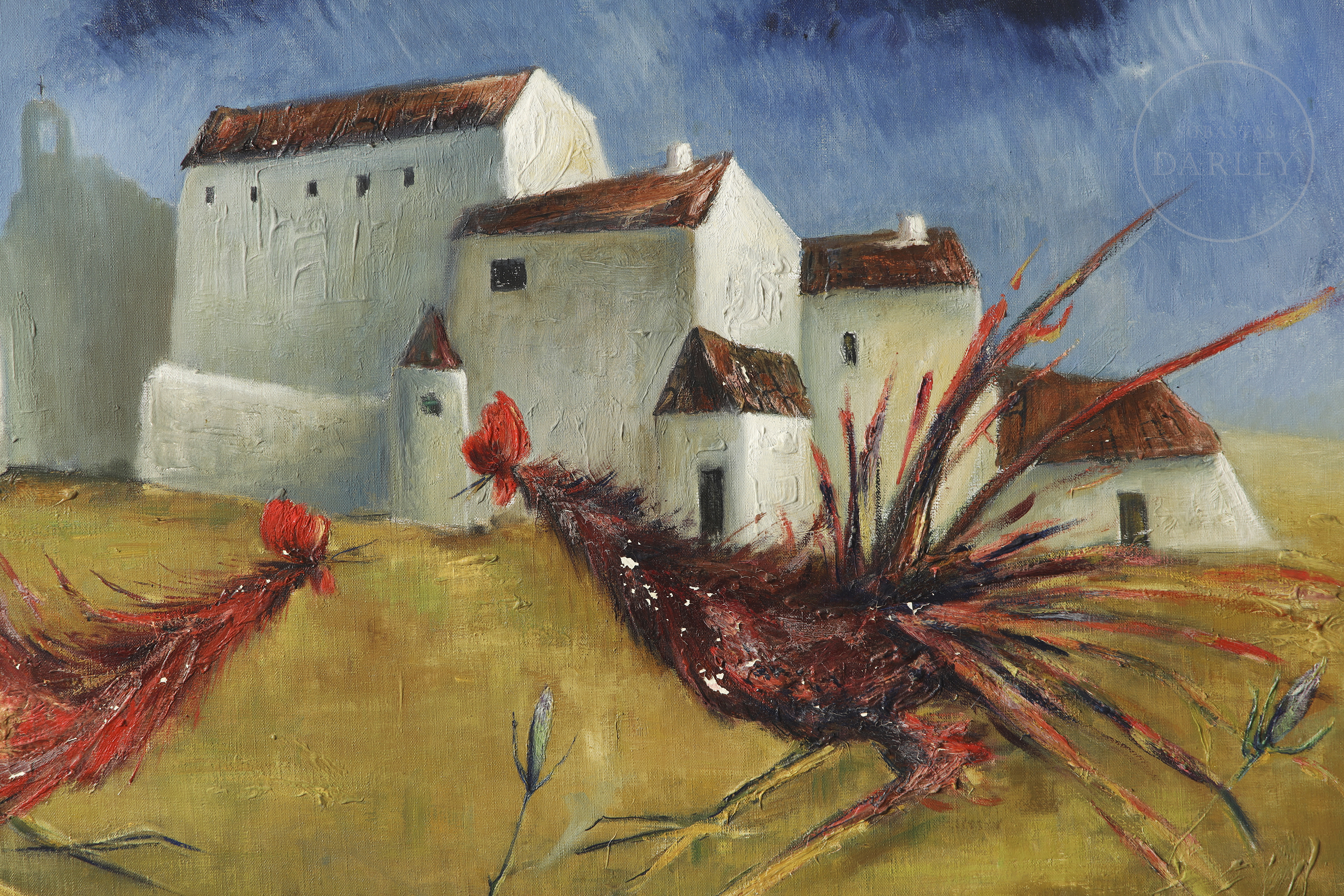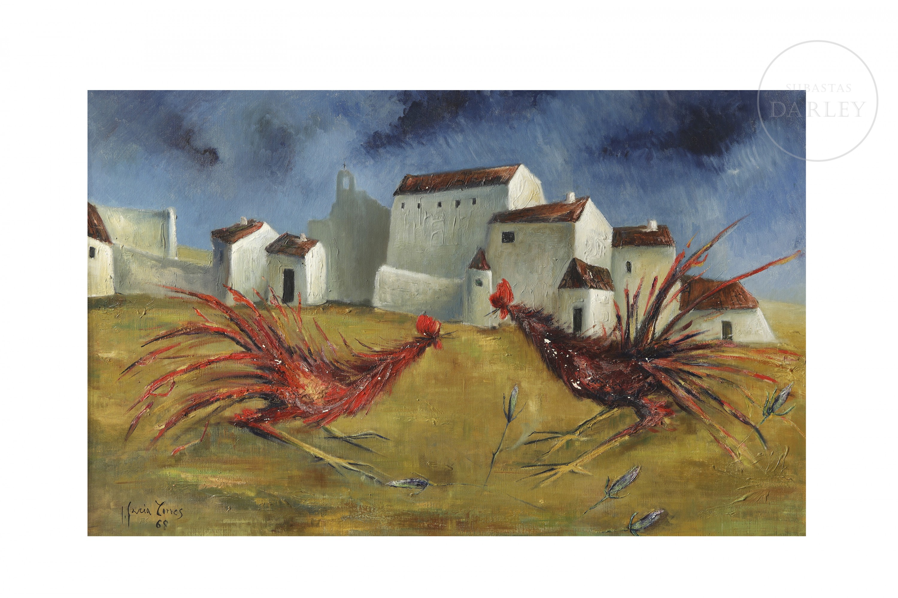 Acrílico sobre lienzo. Composición figurativa de gran formato que representa a dos gallos en actitud de combate frente a un núcleo de casas blancas. Firmado y fechado "J. García Torres/68" en la esquina inferior izquierda.