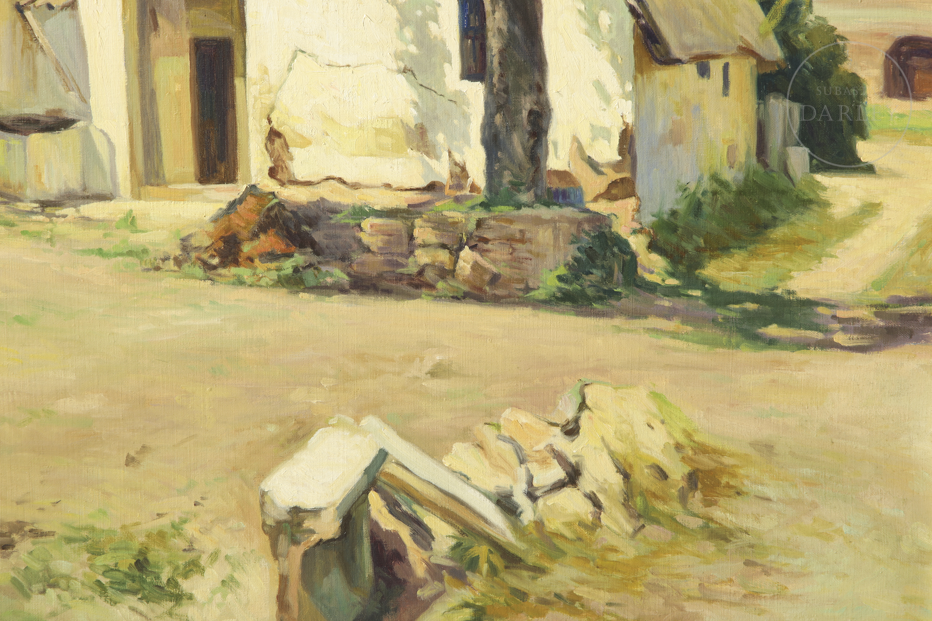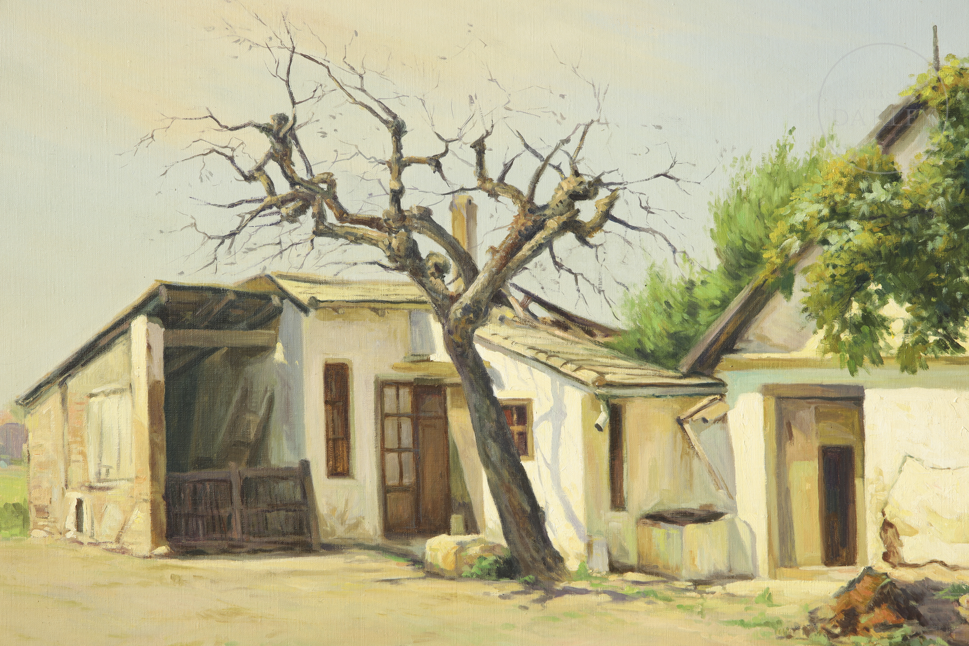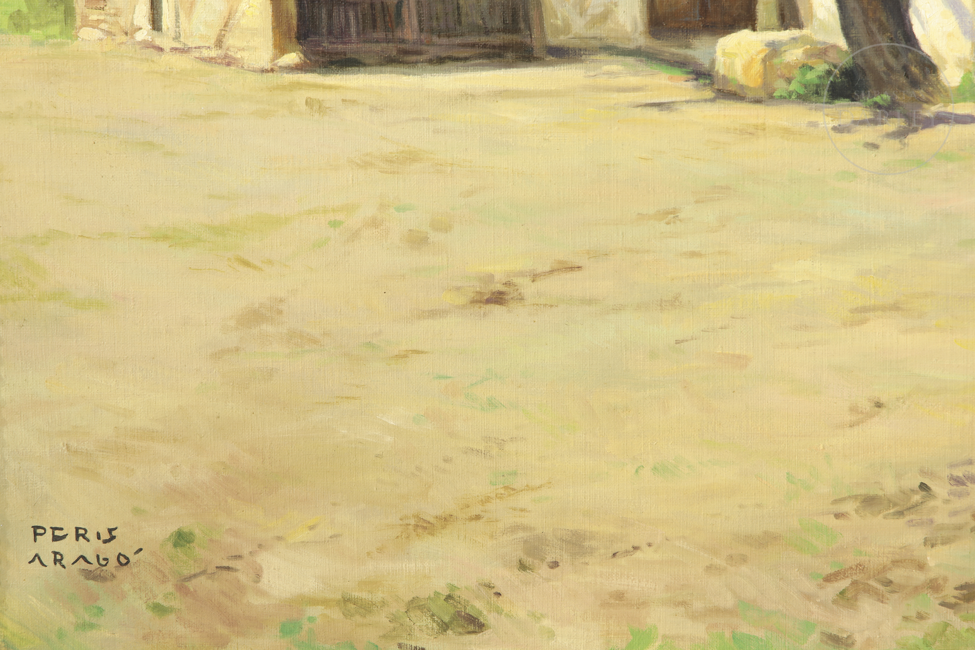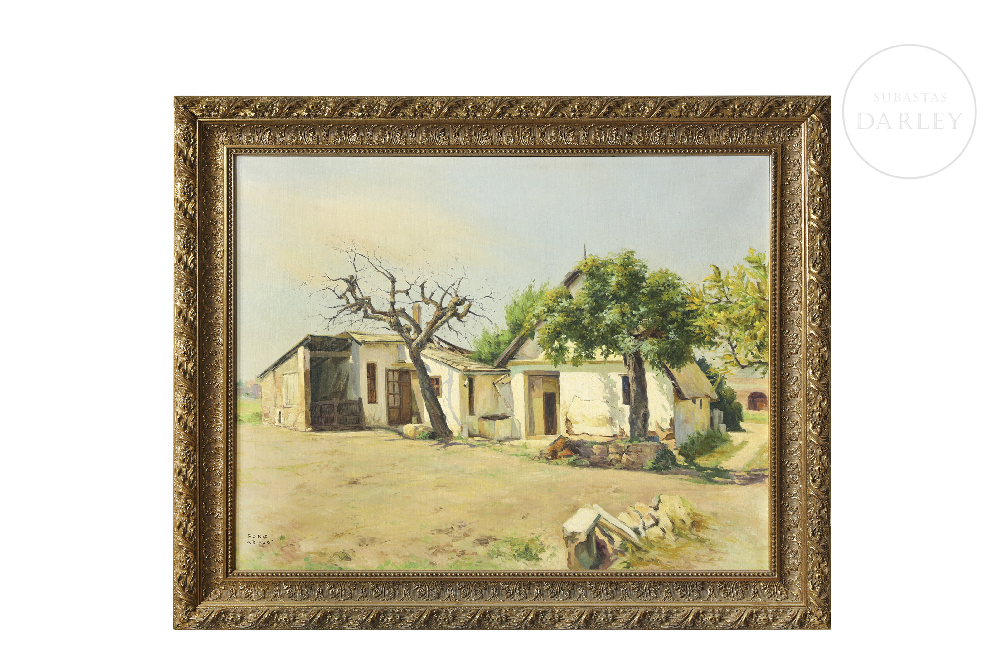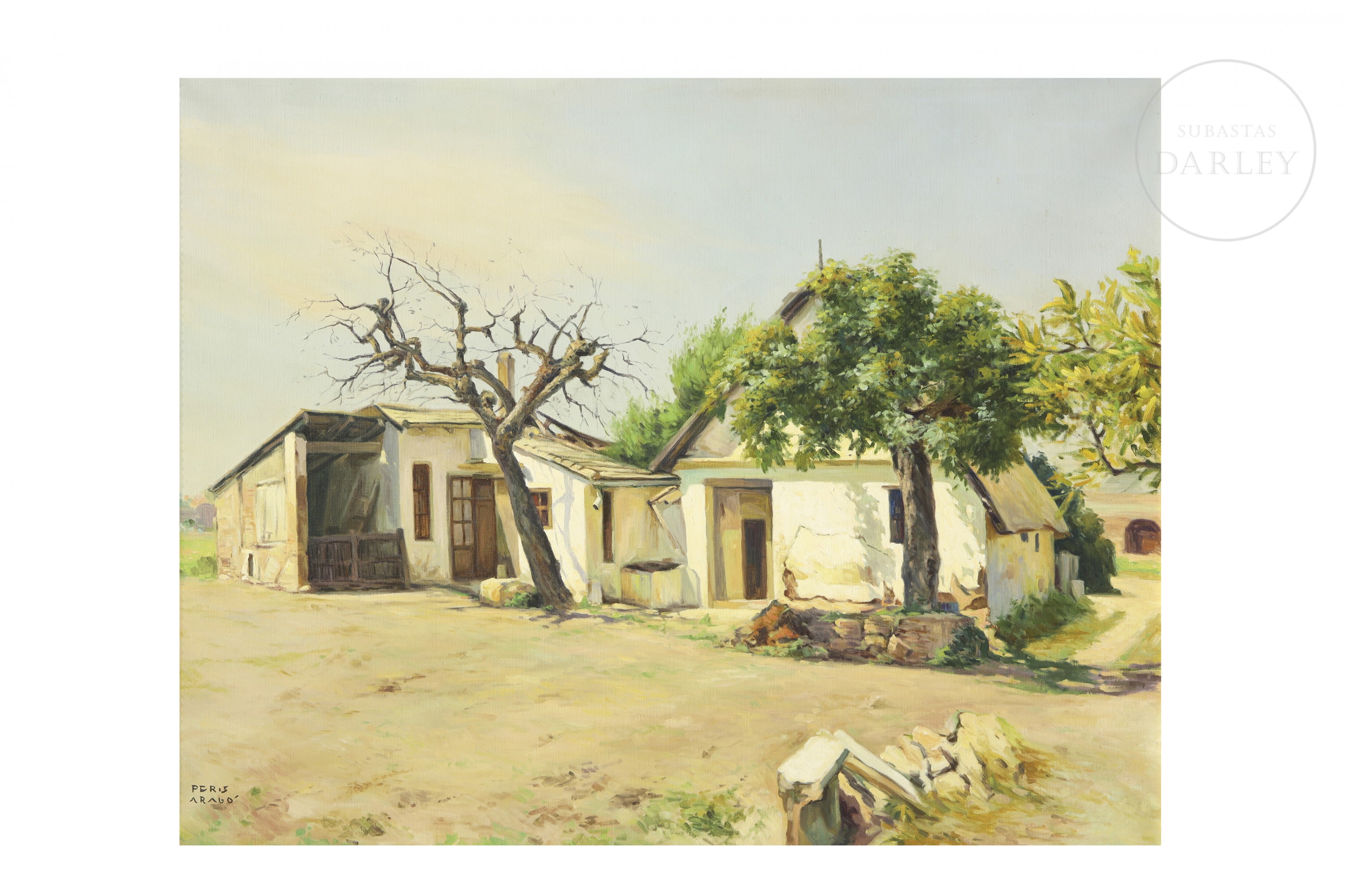 Óleo sobre lienzo. Paisaje en el que destaca la fachada de una antigua barraca valenciana. Firmado "PERIS ARAGÓ" en la esquina inferior izquierda.