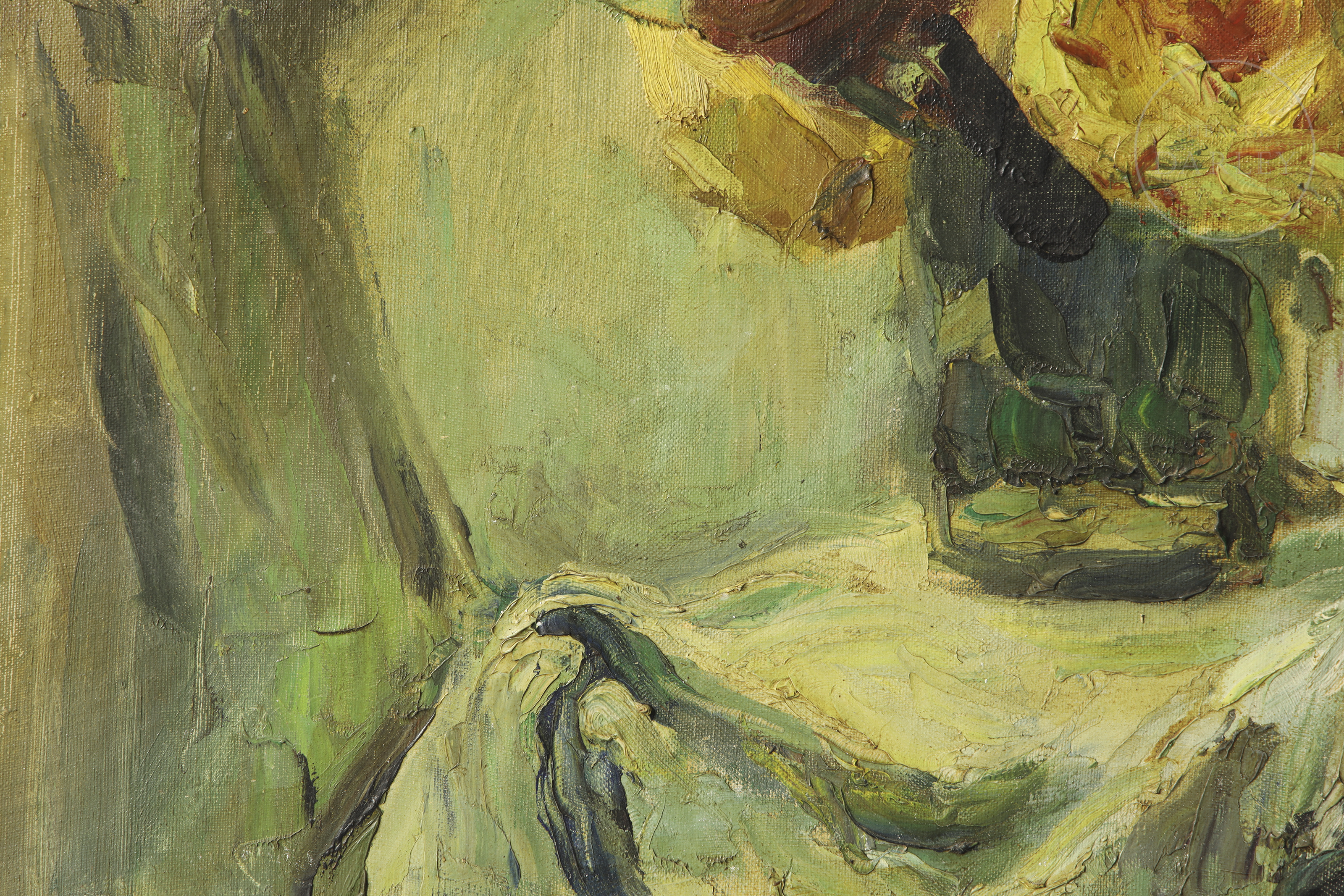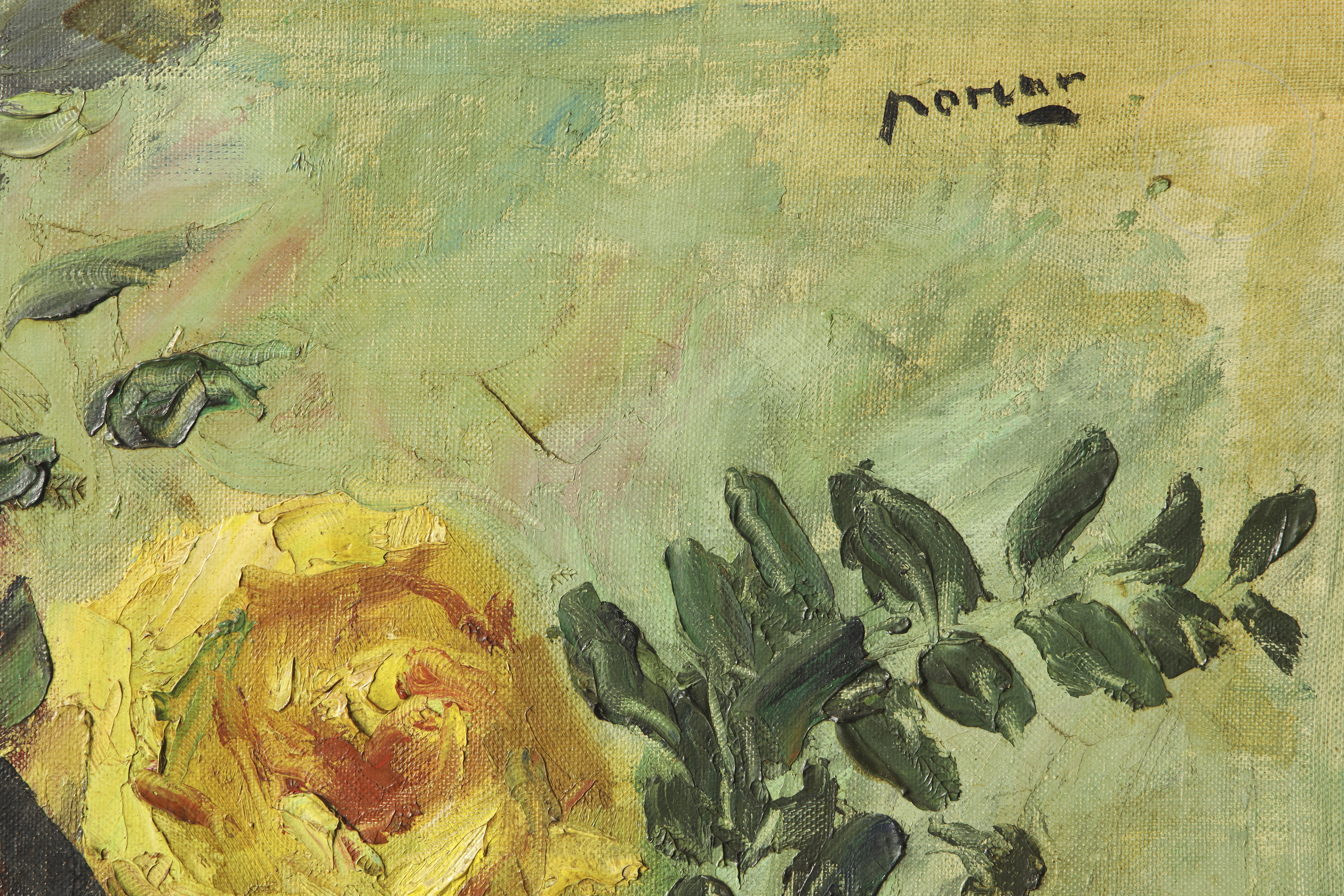 Óleo sobre lienzo. Representa un ramillete de rosas en un jarrón, ejecutada con una pincelada matérica y vibrante. La composición destaca por el uso de tonos ocres y amarillos. Firmado "Porcar" en la esquina superior derecha.