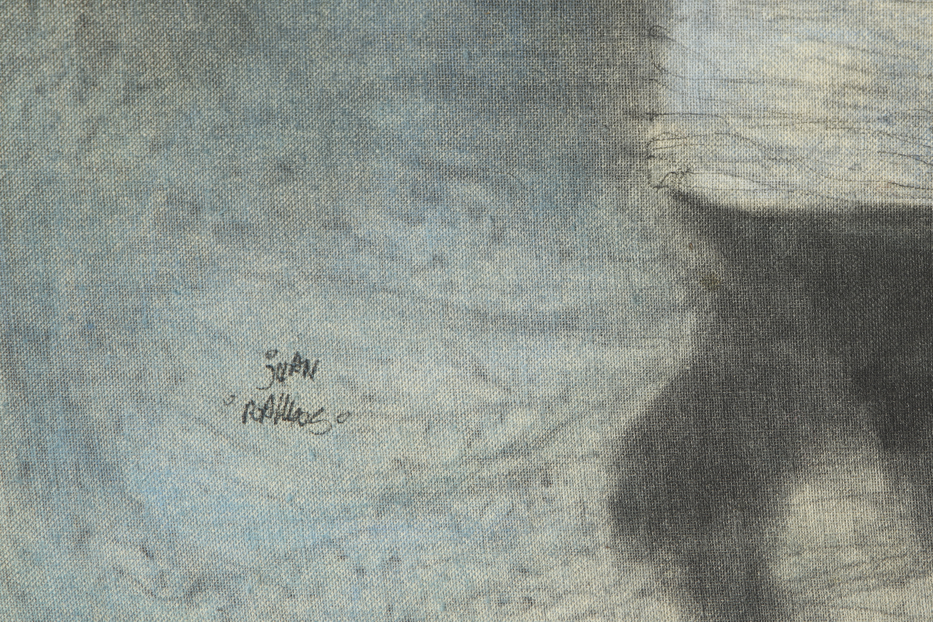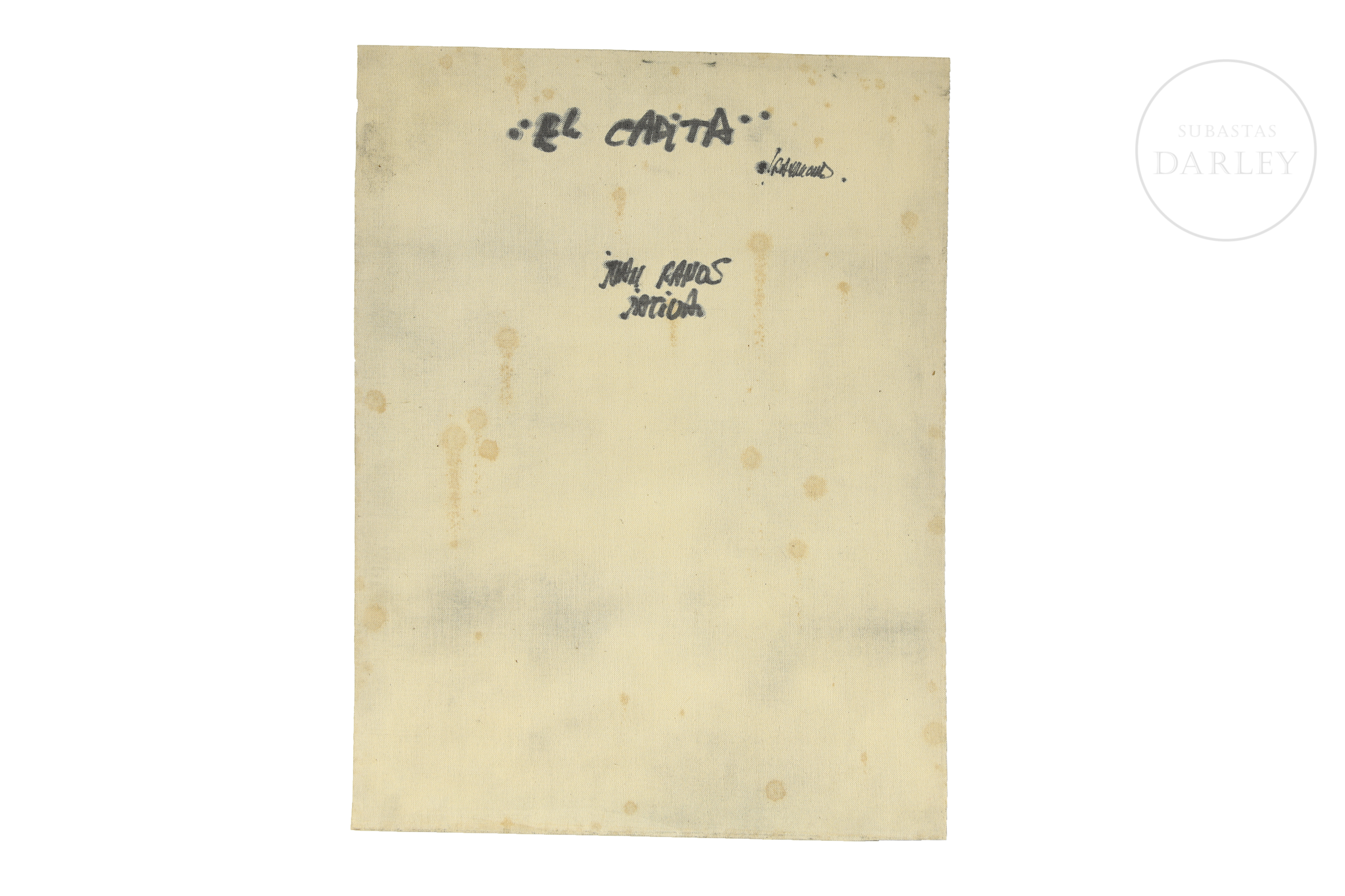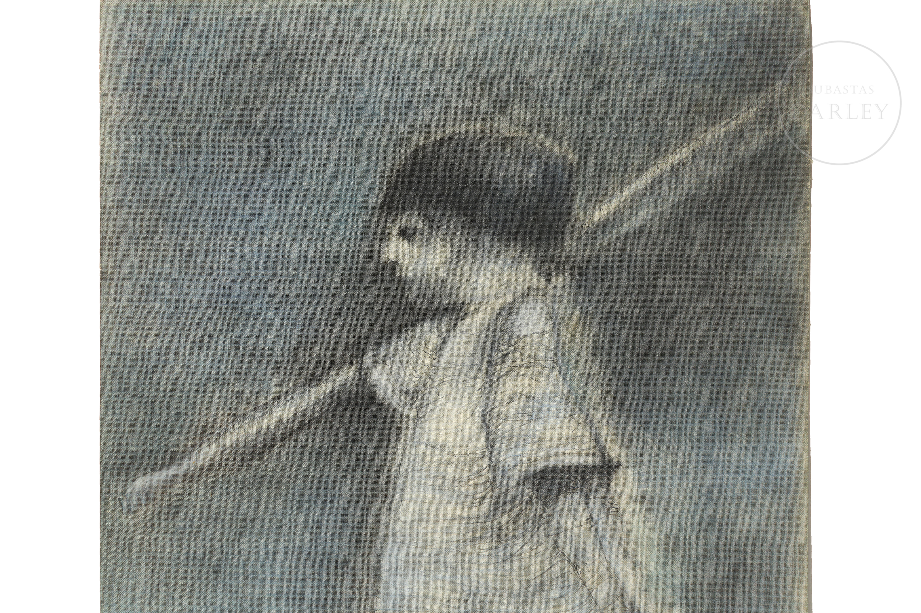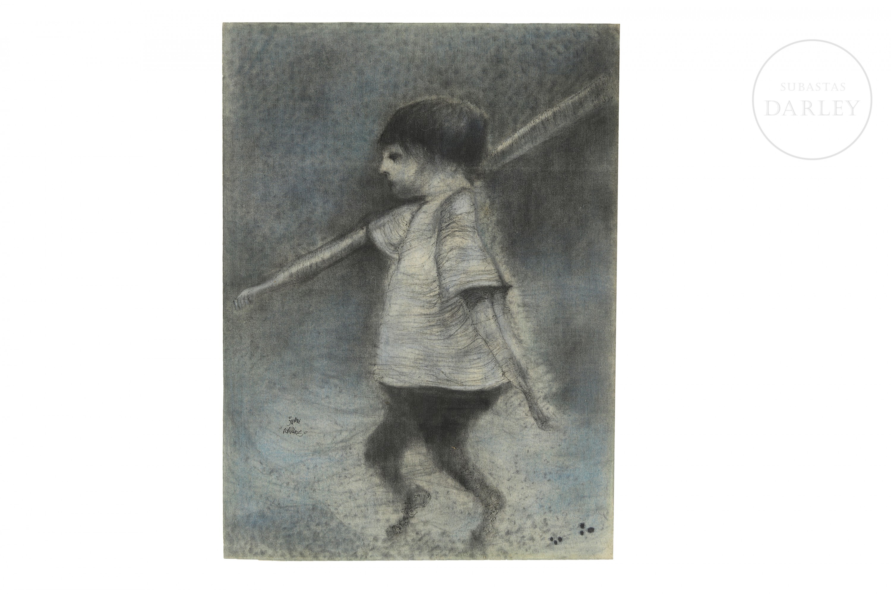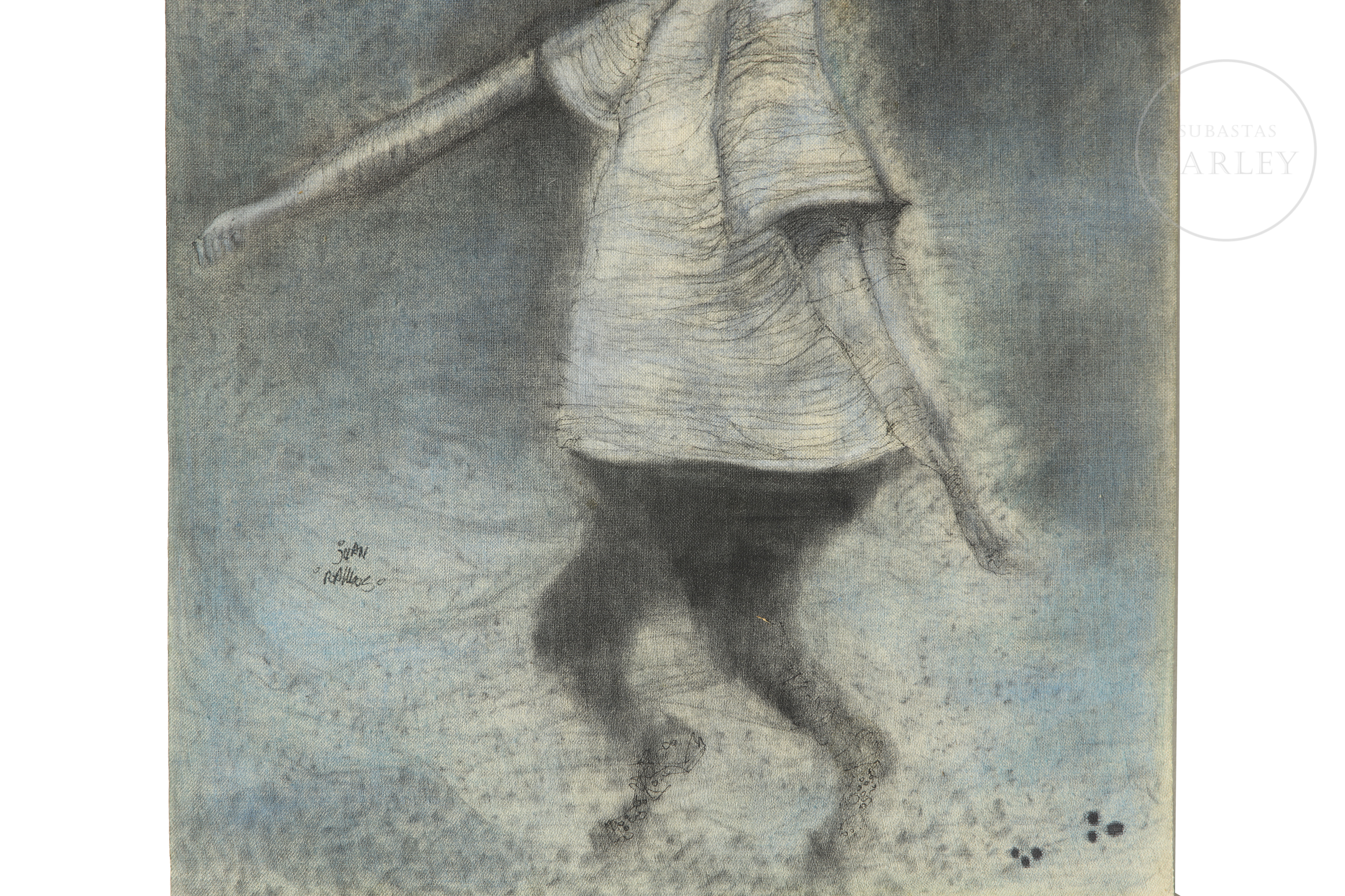 Técnica mixta sobre lienzo. Composición figurativa de carácter onírico que representa a un joven de perfil sosteniendo una larga vara sobre su hombro. Firmado "Juan Ramos" en el margen izquierdo. Firmado y titulado en el reverso.