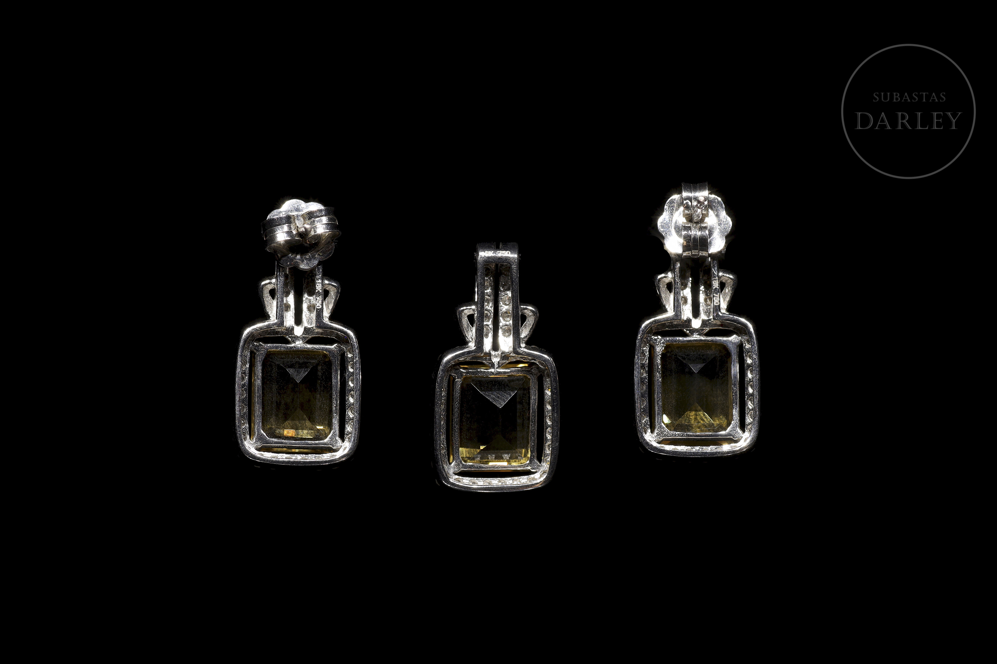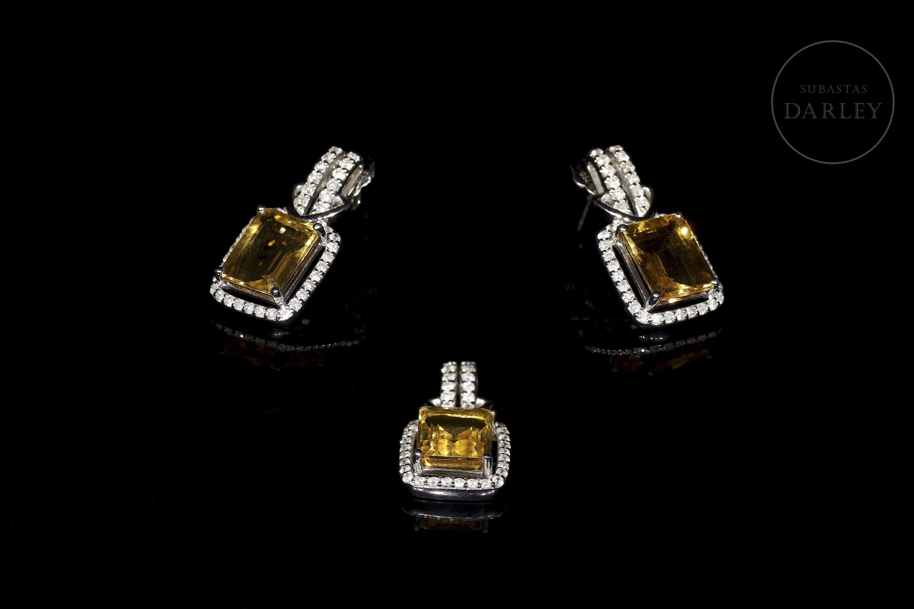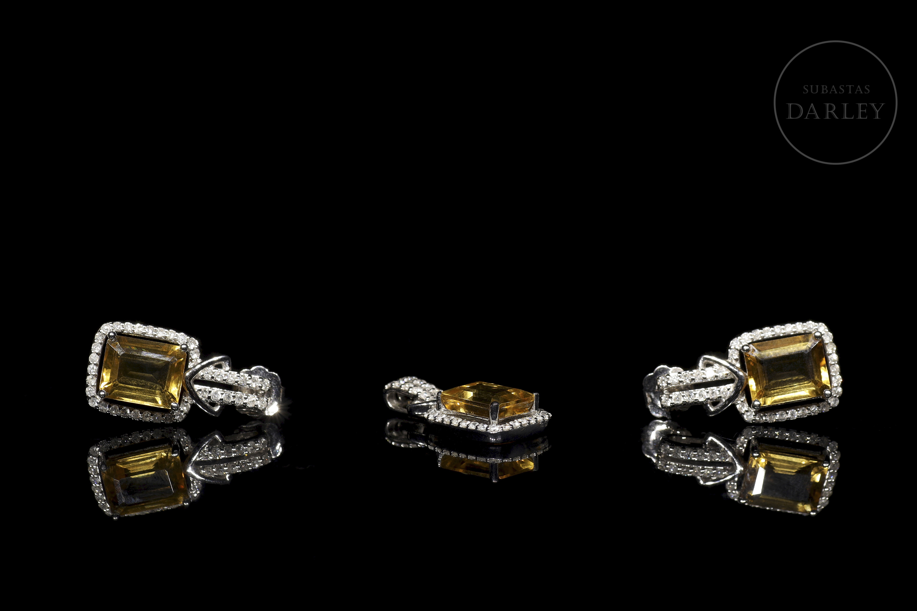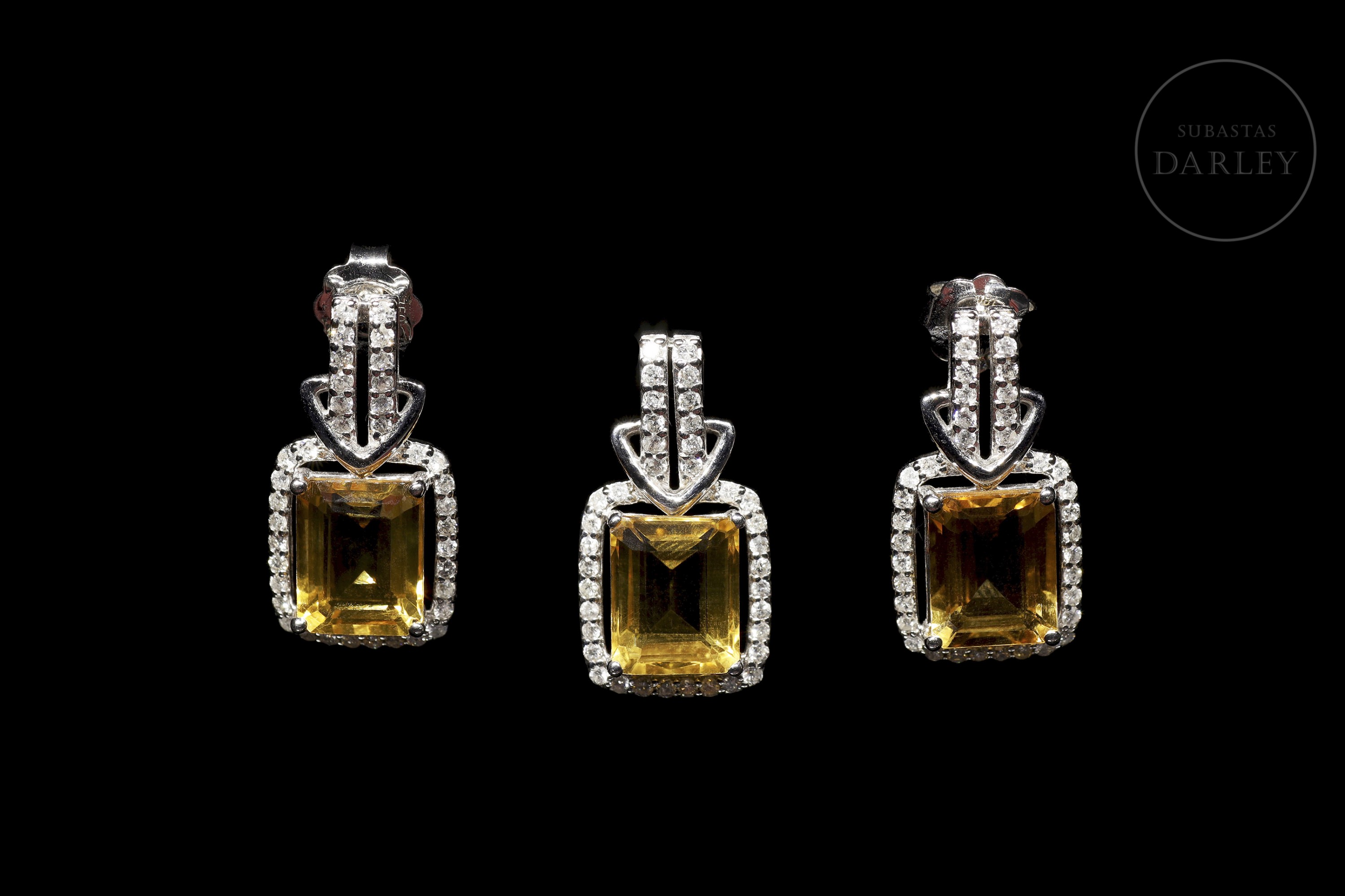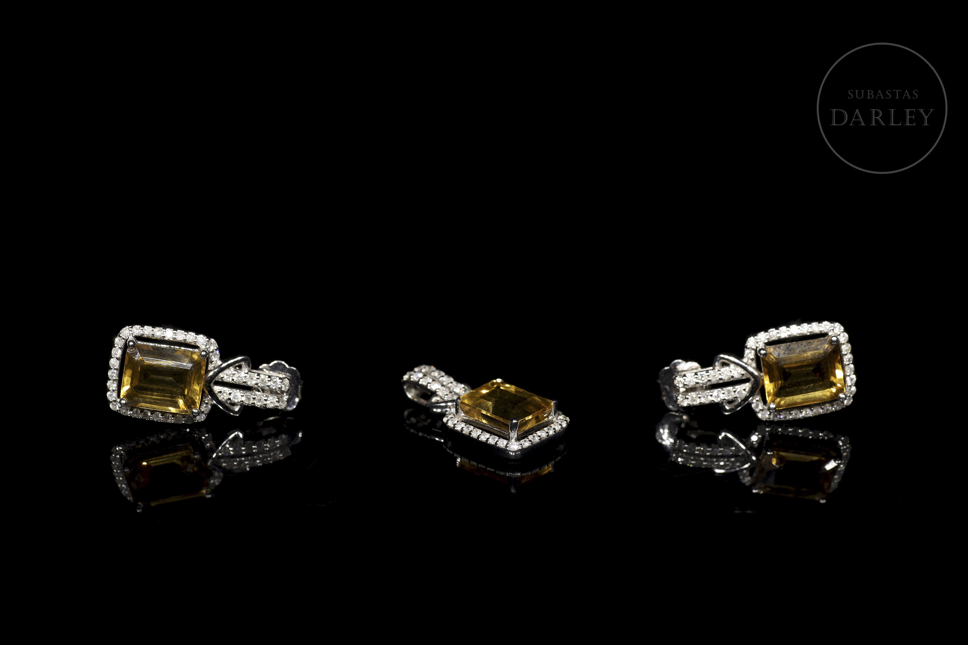 Juego de colgante y pendientes en oro blanco de 18k con citrinos y diamantes