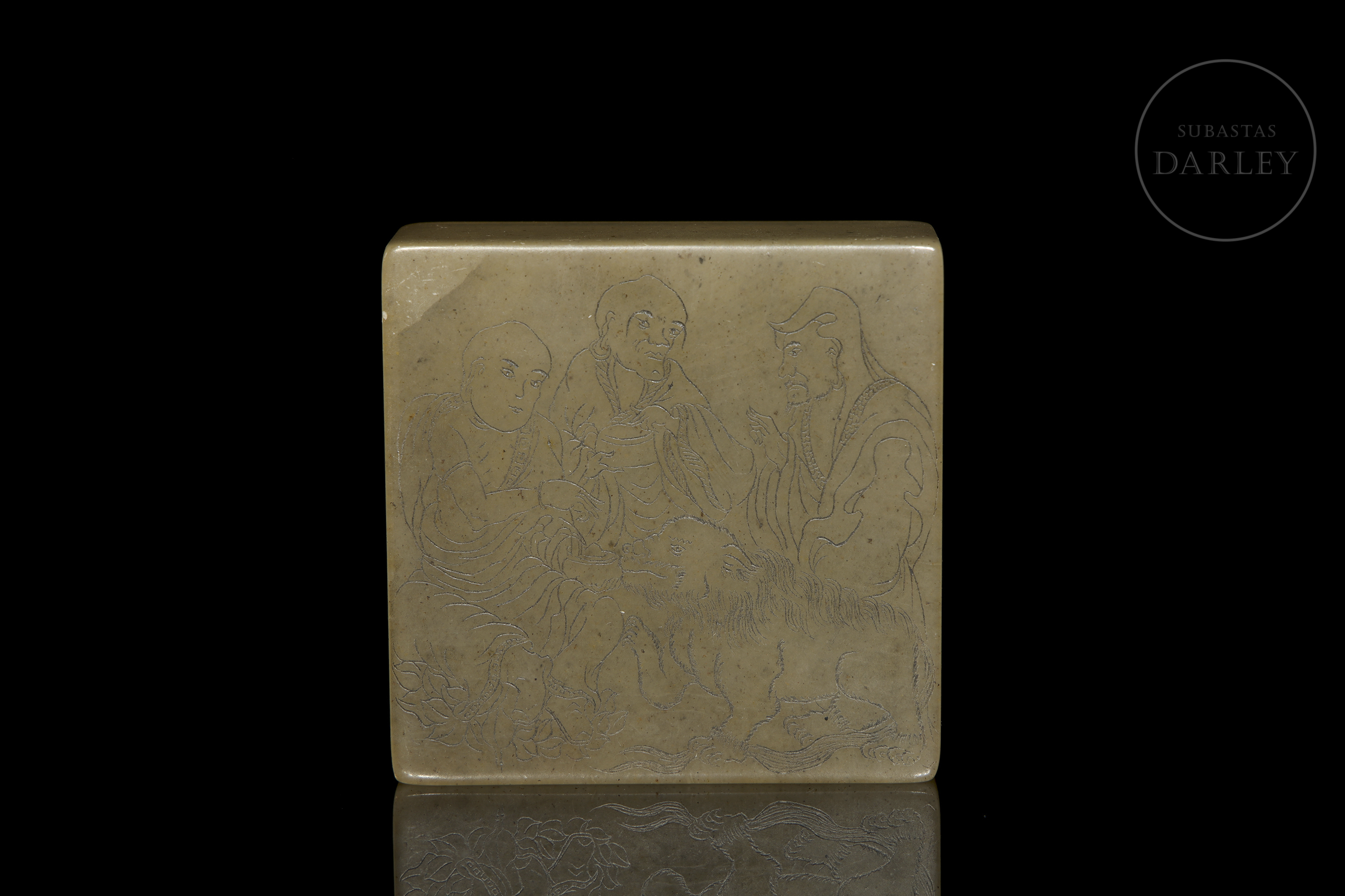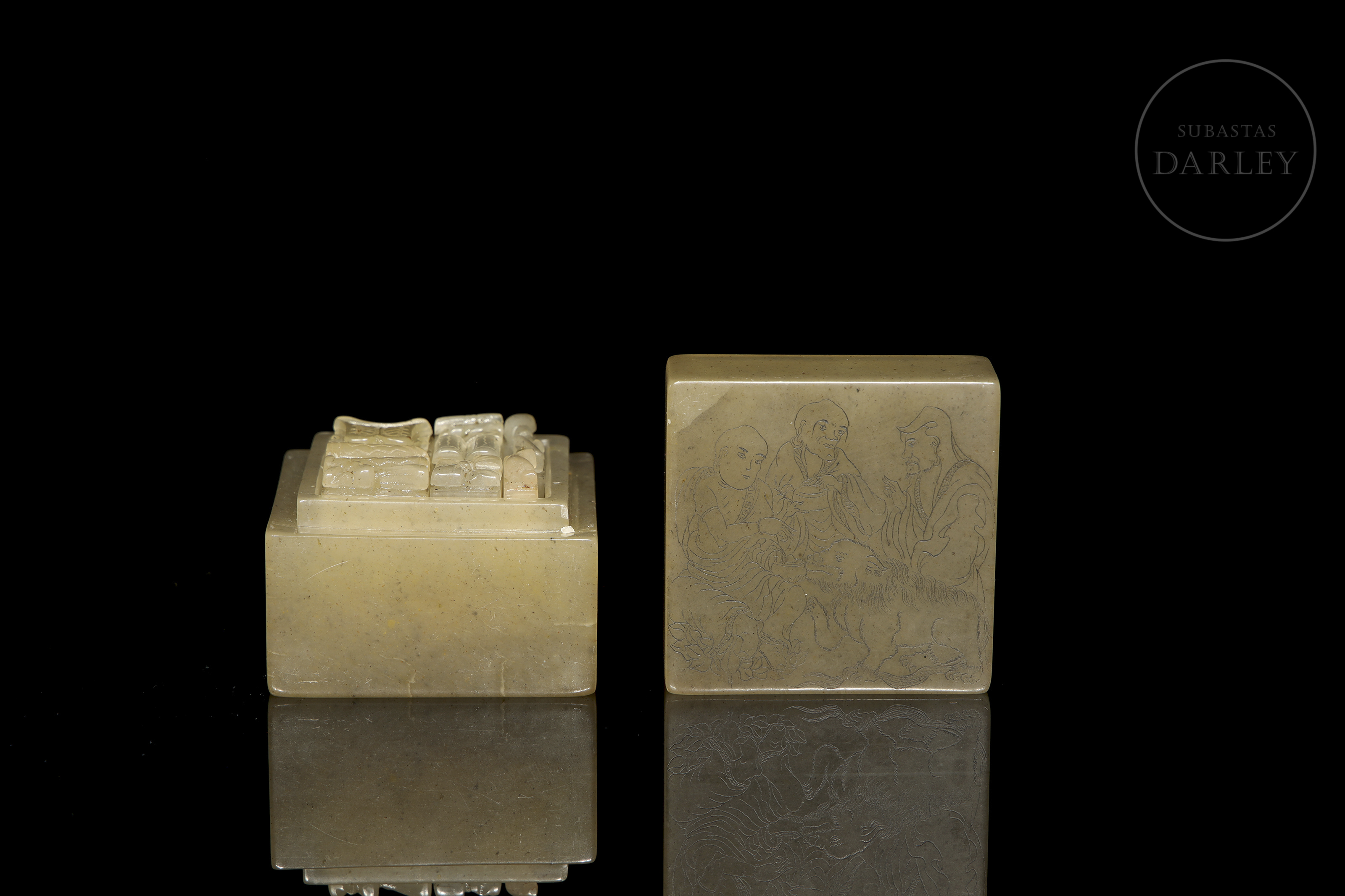 Compuesto por nueve sellos de jade de una tonalidad blanco-verdosa translúcida, cada uno rematado por una talla que representa diversos animales míticos. Los sellos presentan inscripciones incisas en sus laterales. Se presenta en su caja original de jade a juego, cuya tapa luce una escena grabada con tres sabios conversando en un jardín. Las bases de los sellos conservan el pigmento cinabrio en los caracteres de estilo sigilar. Dinastía Qing (1644–1912).