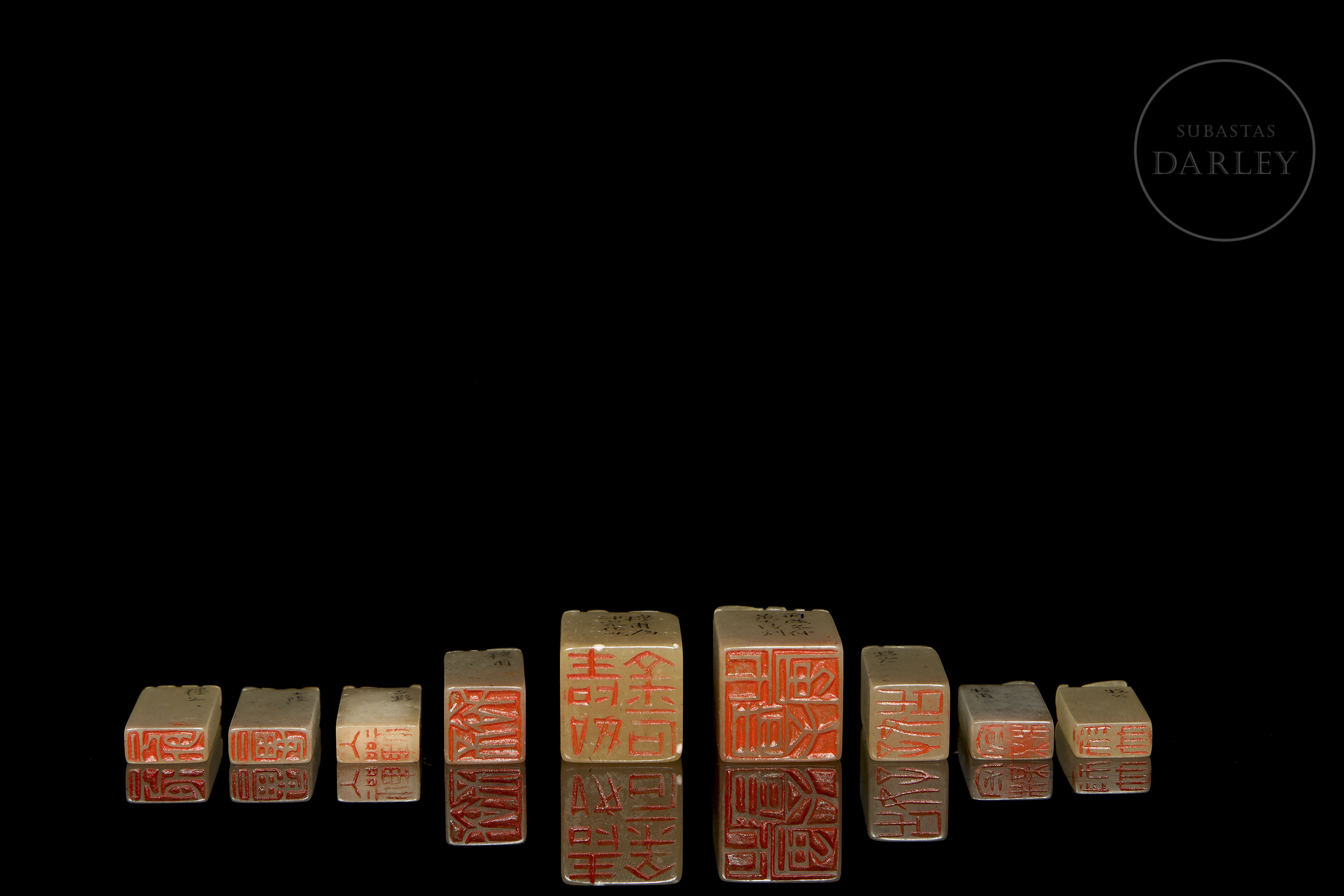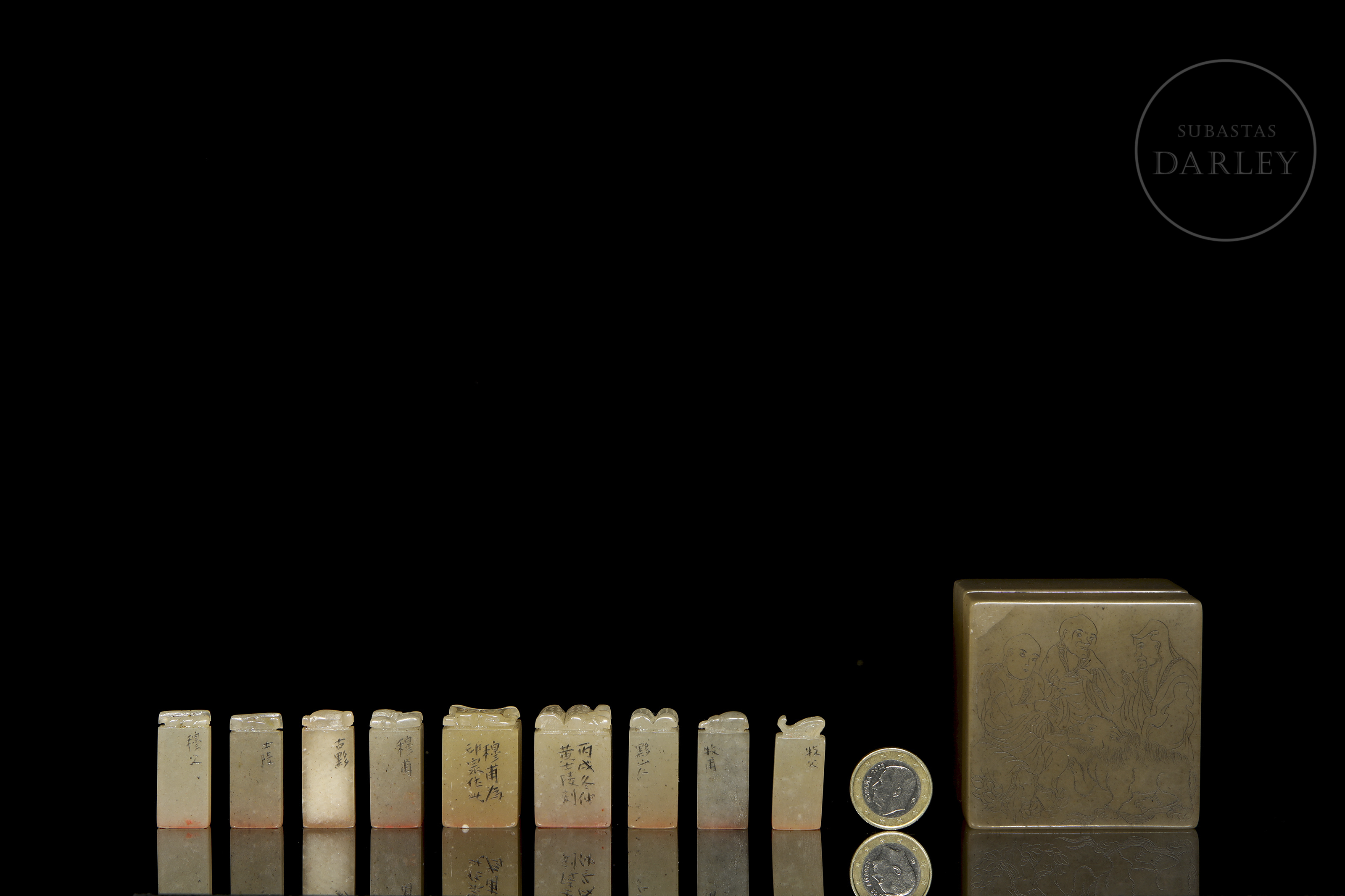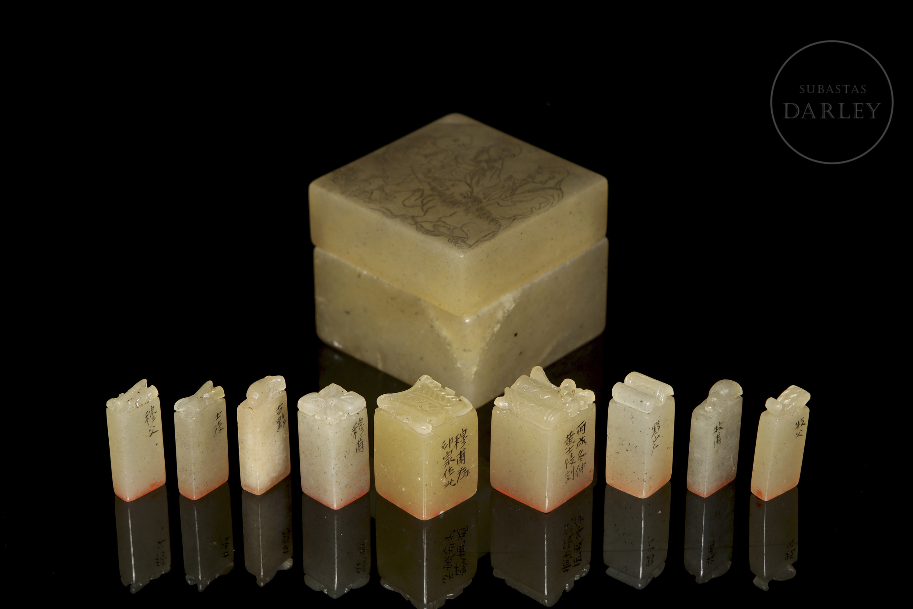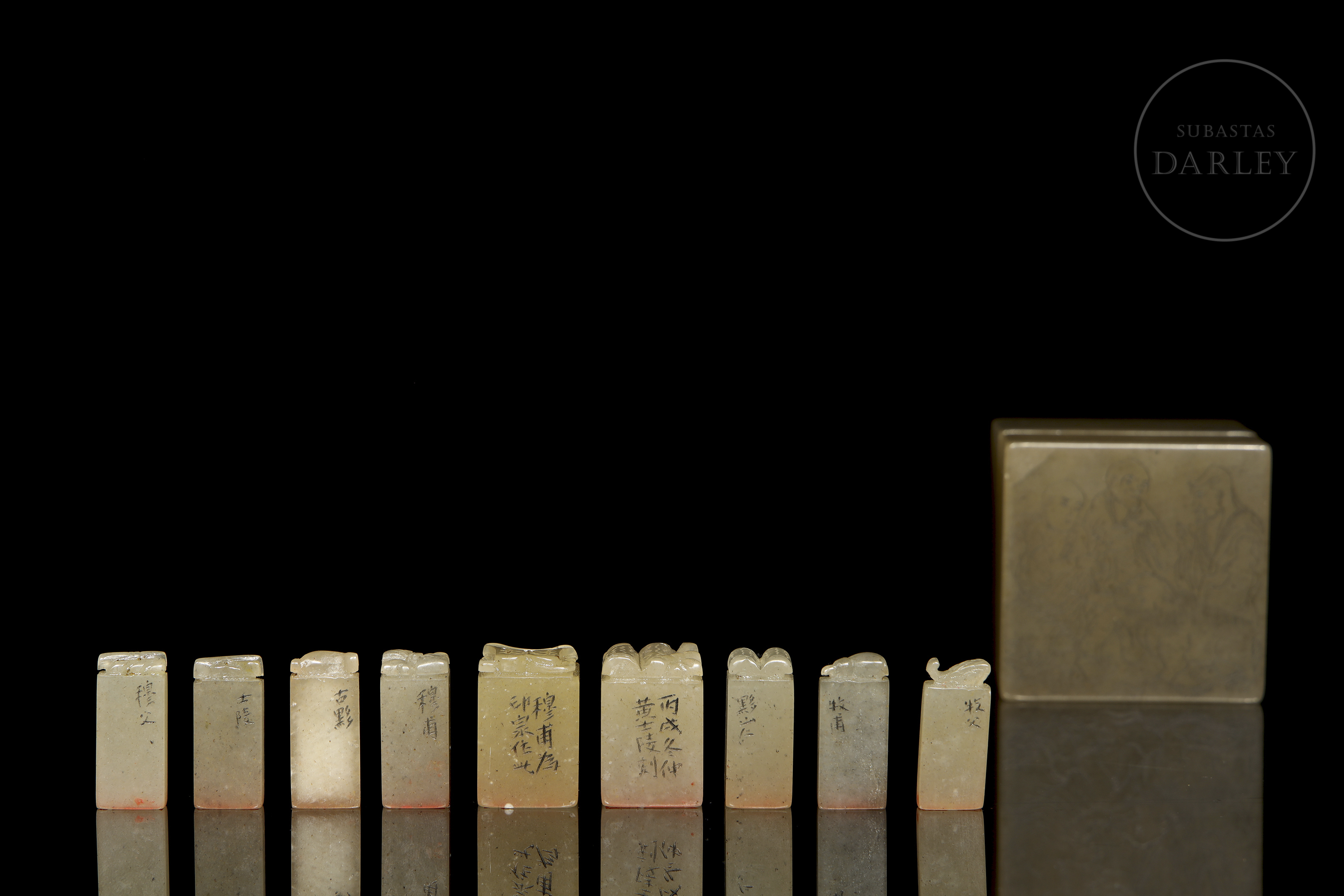 Juego de nueve sellos con caja de jade, dinastía Qing