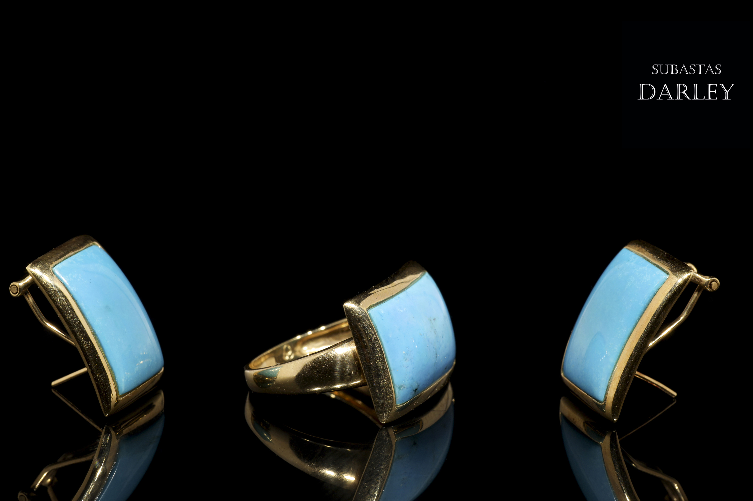 Juego de pendientes y anillo en oro amarillo 18 k presididos en el frente con una turquesa rectangular de medidas enmarcada por un bisel liso. Cierre de tipo pala Omega.