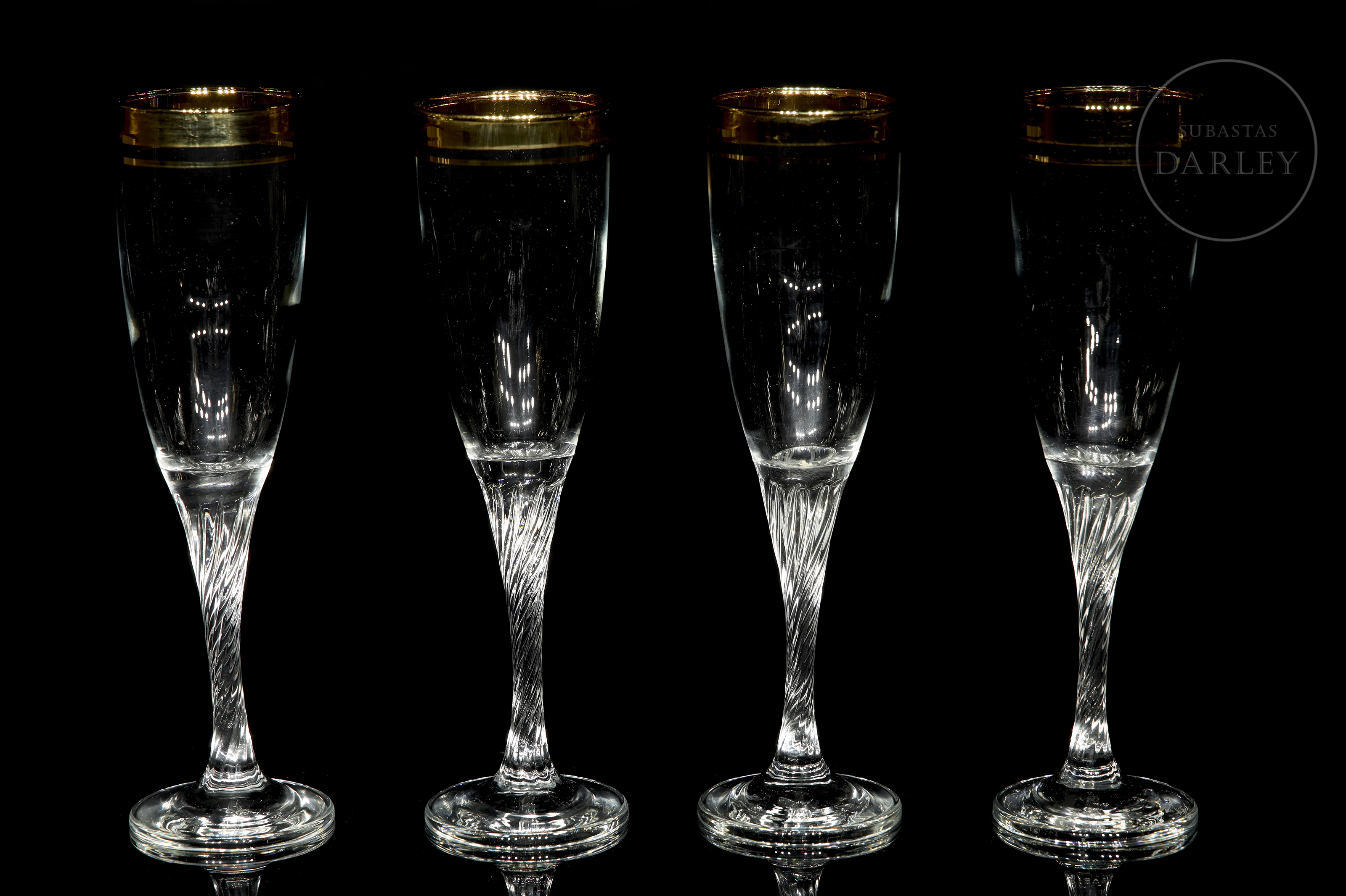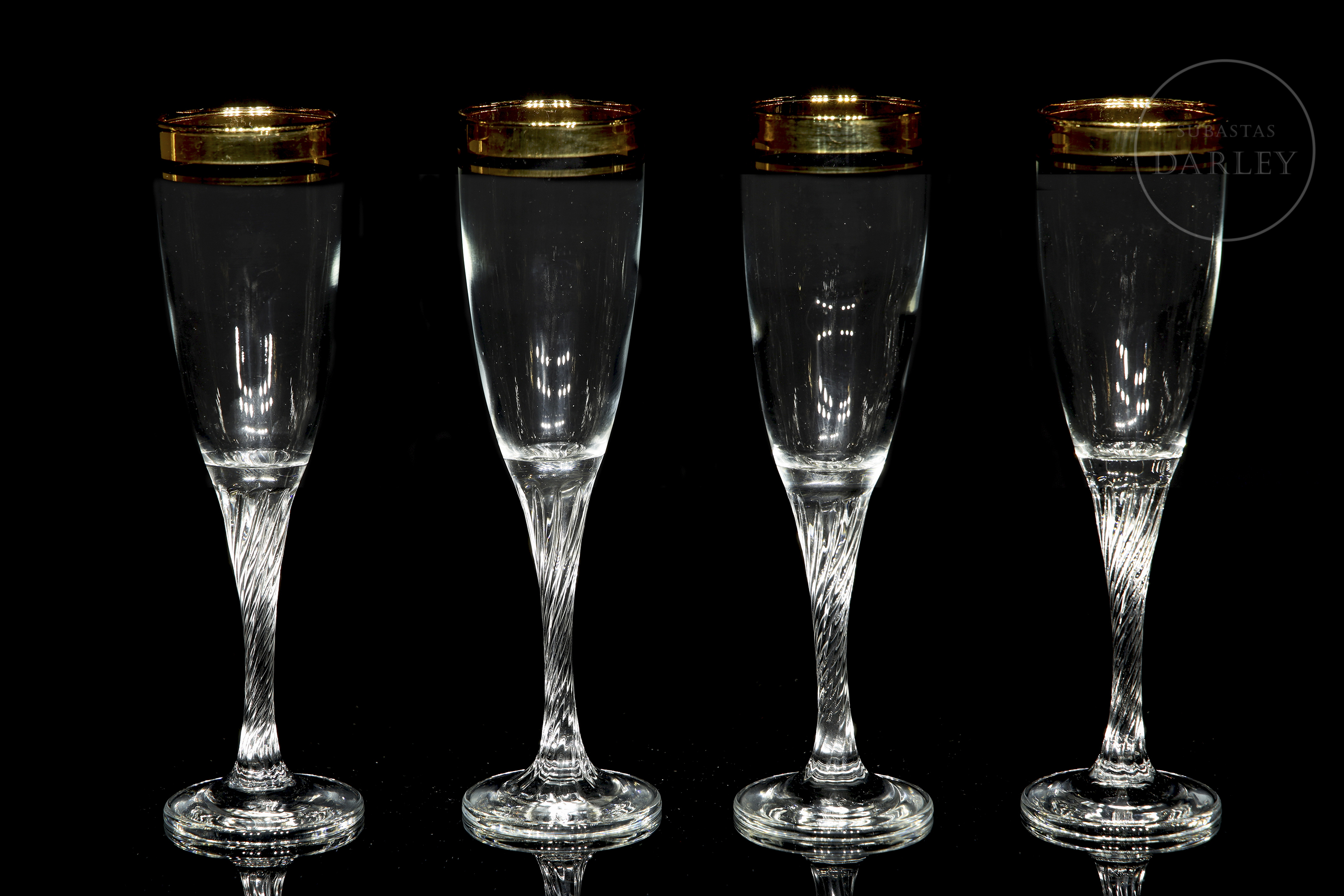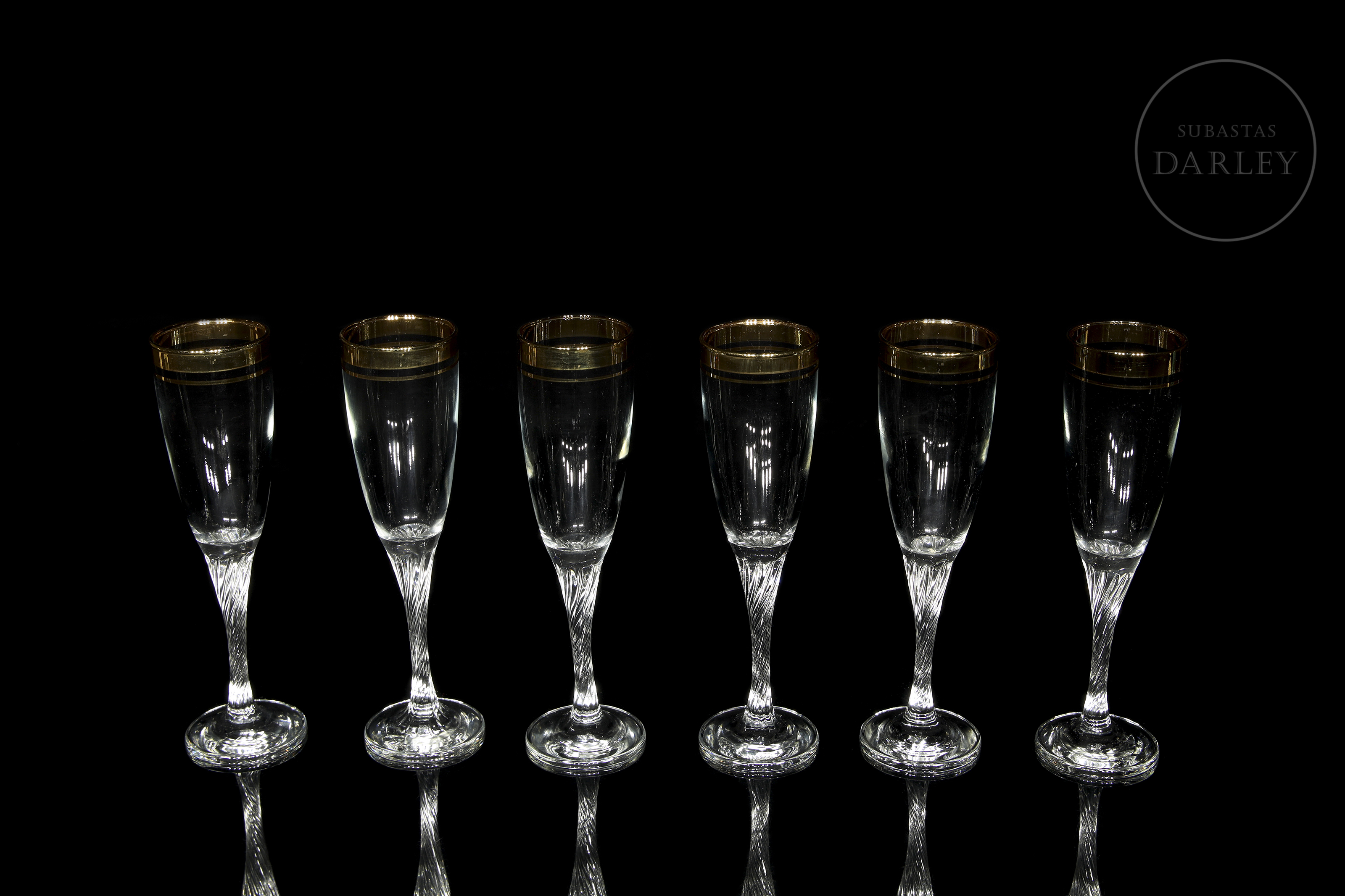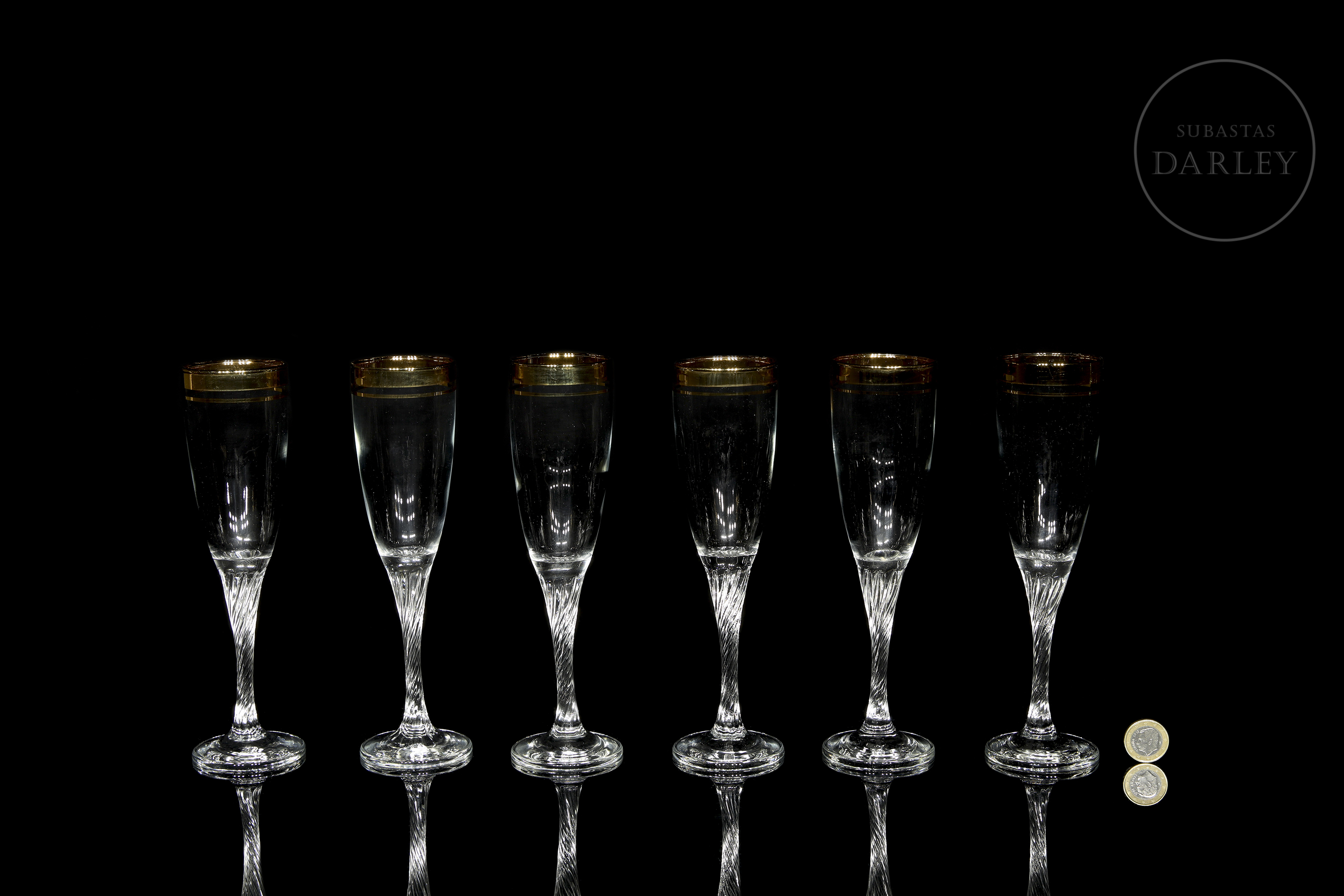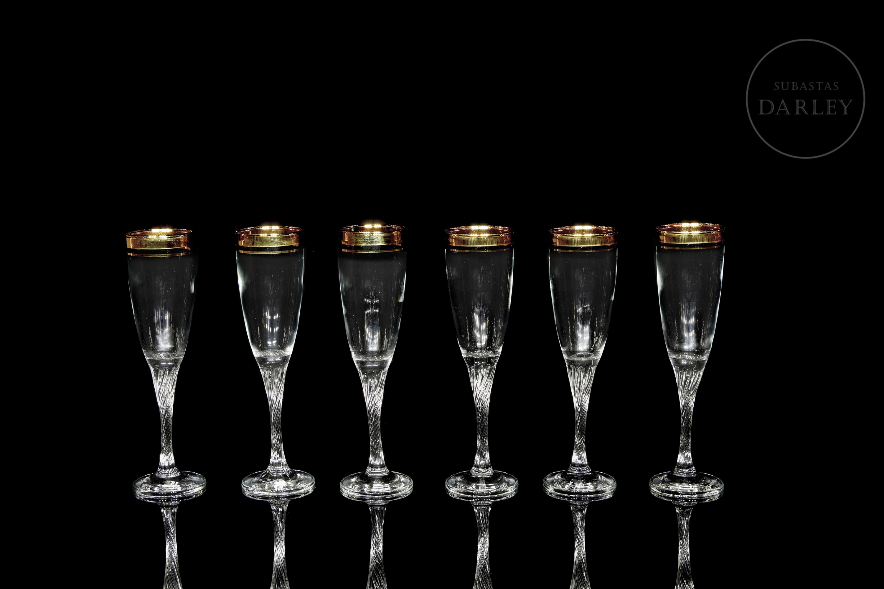 Conjunto de seis copas para cava de formato estilizado, con cáliz liso rematado por una banda dorada en el borde. Destacan por su fuste facetado de diseño salomónico.