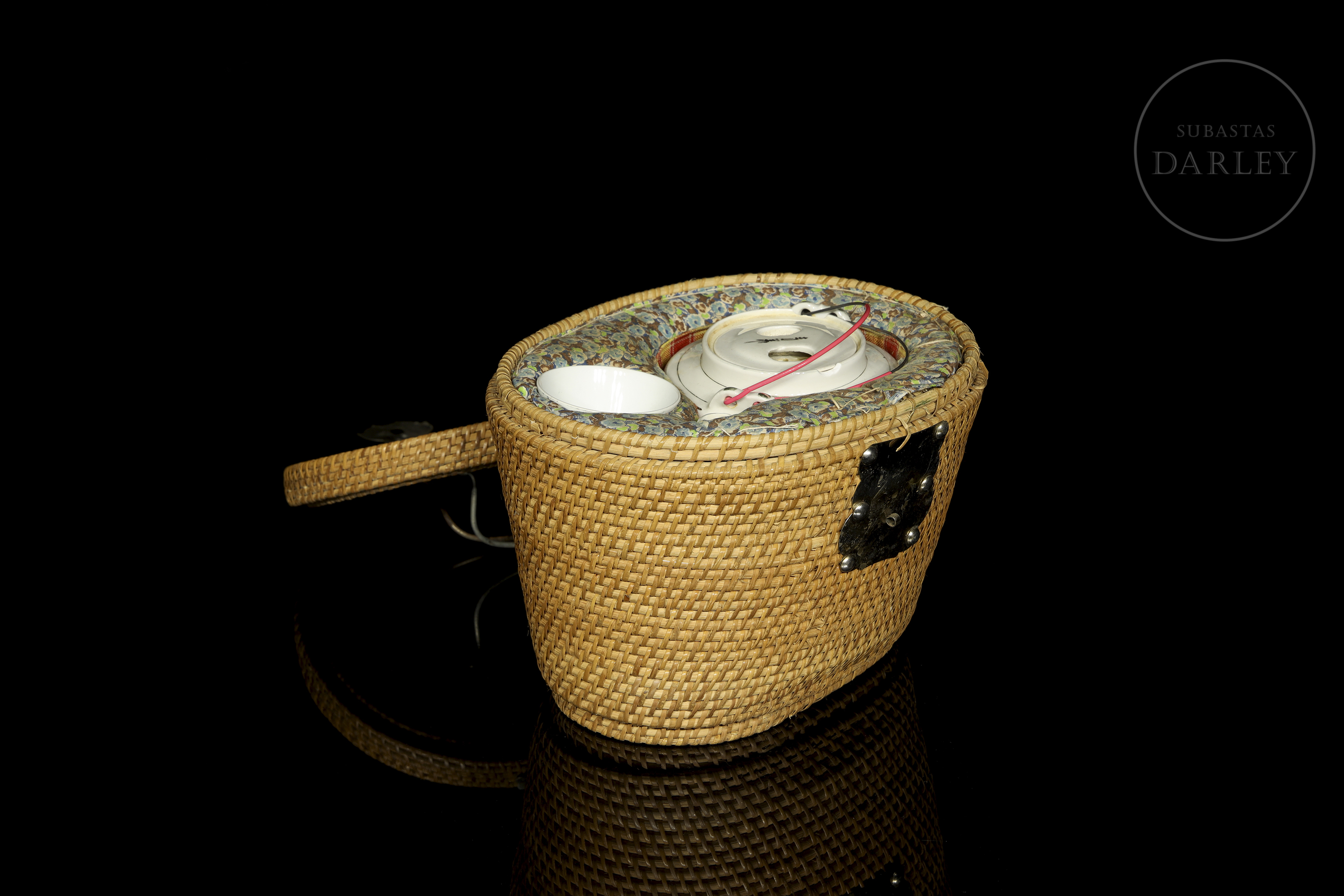 Juego de té de porcelana esmaltada con cesto de mimbre, s.XX