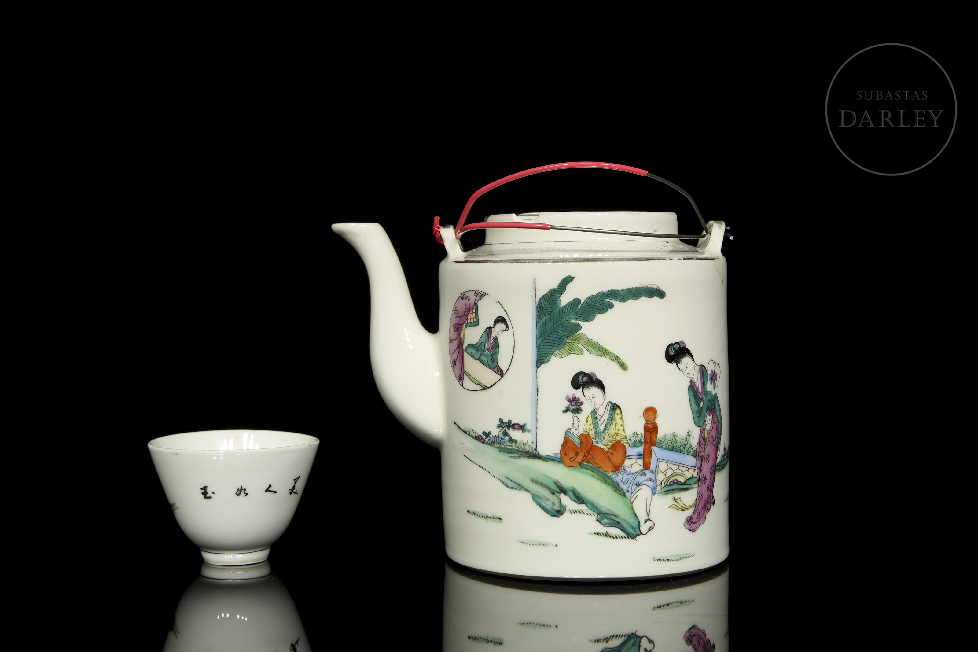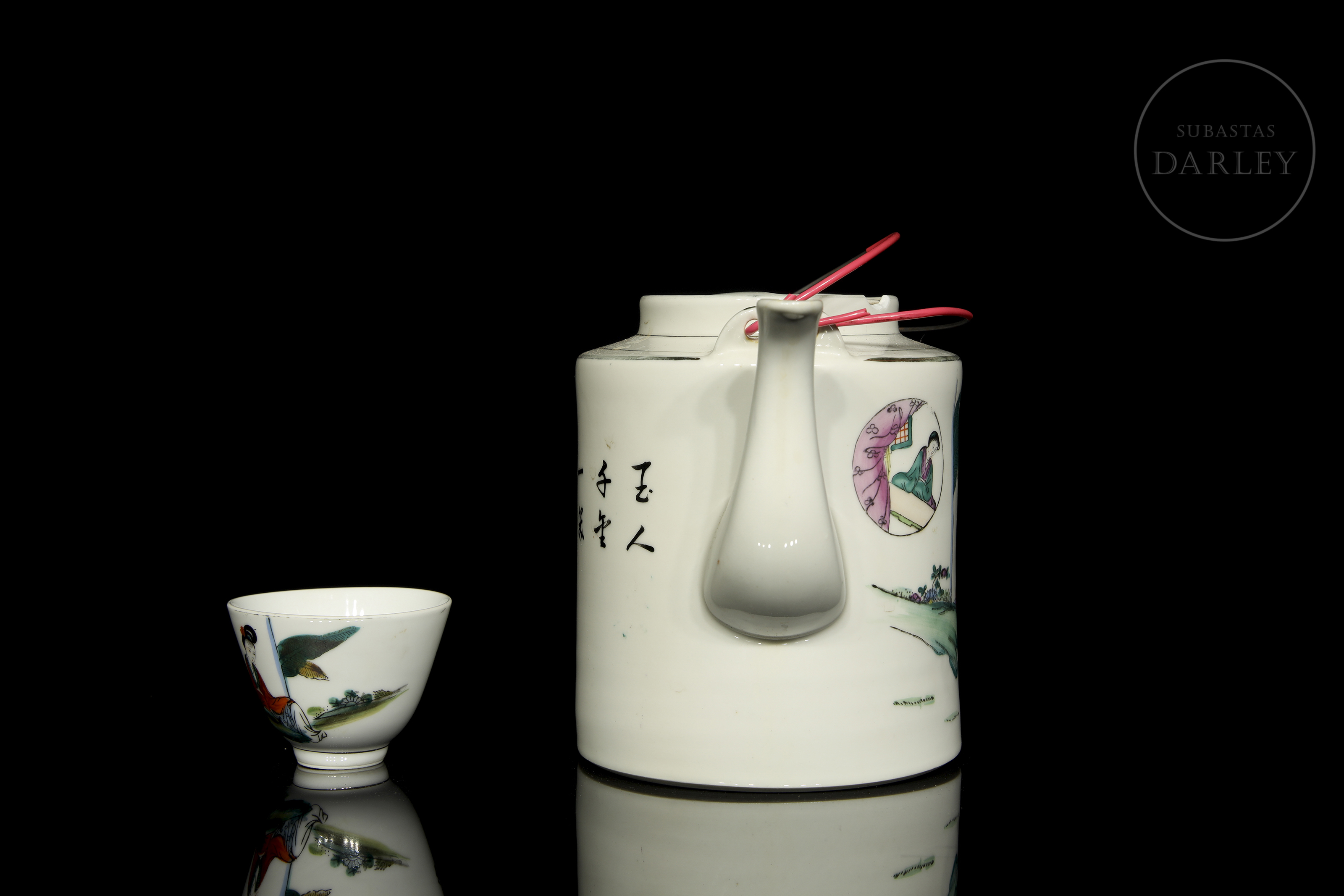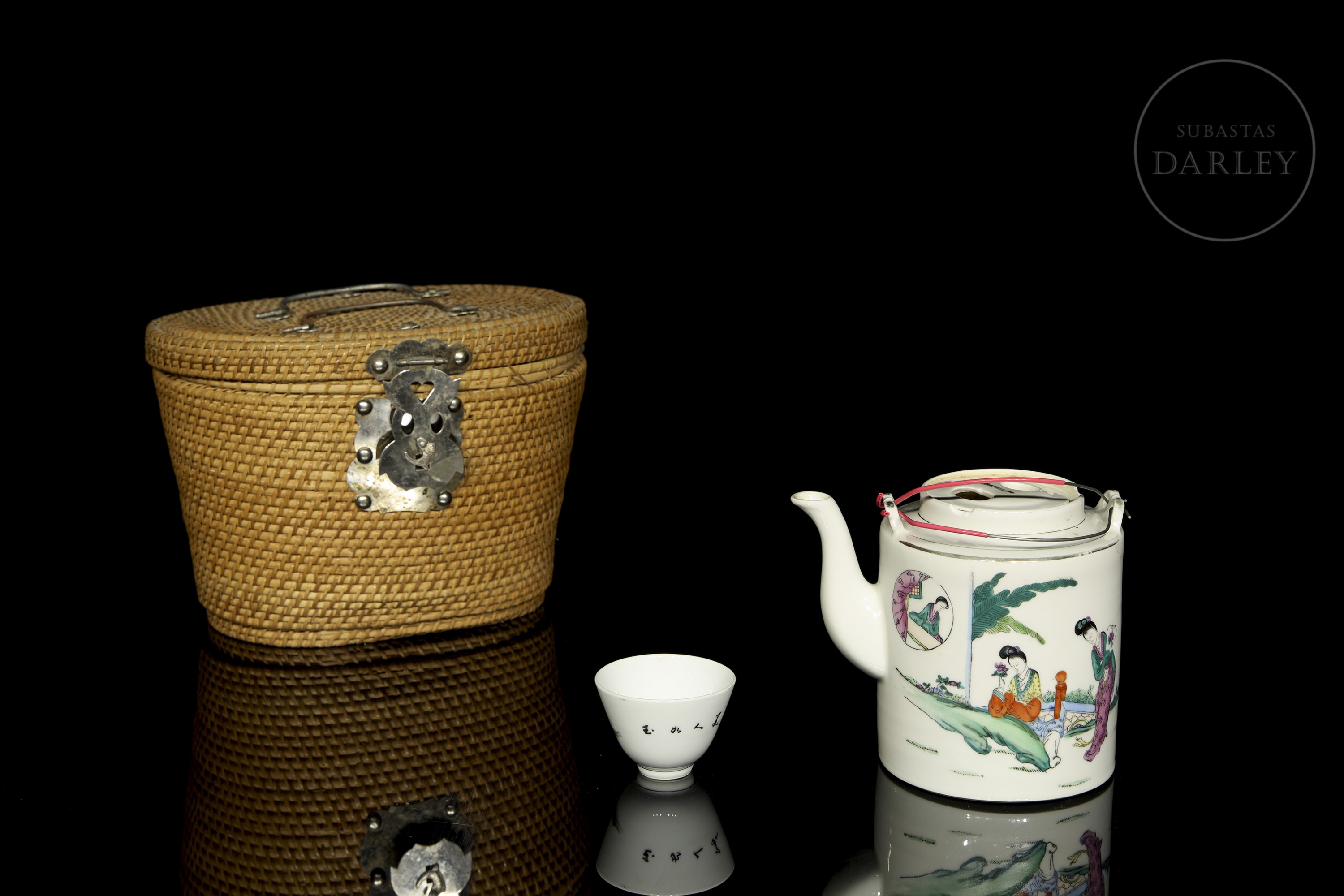 Juego de té de porcelana conformado por tetera, taza y un cesto. La tetera es cilíndrica, con pico curvo y un asa de metal; la taza de té posee la morfología tradicional de cuerpo hondo y paredes acampanadas. Decorado en esmalte con escenas y poemas. Con cesto de mimbre con tapa y cierres metálicos.