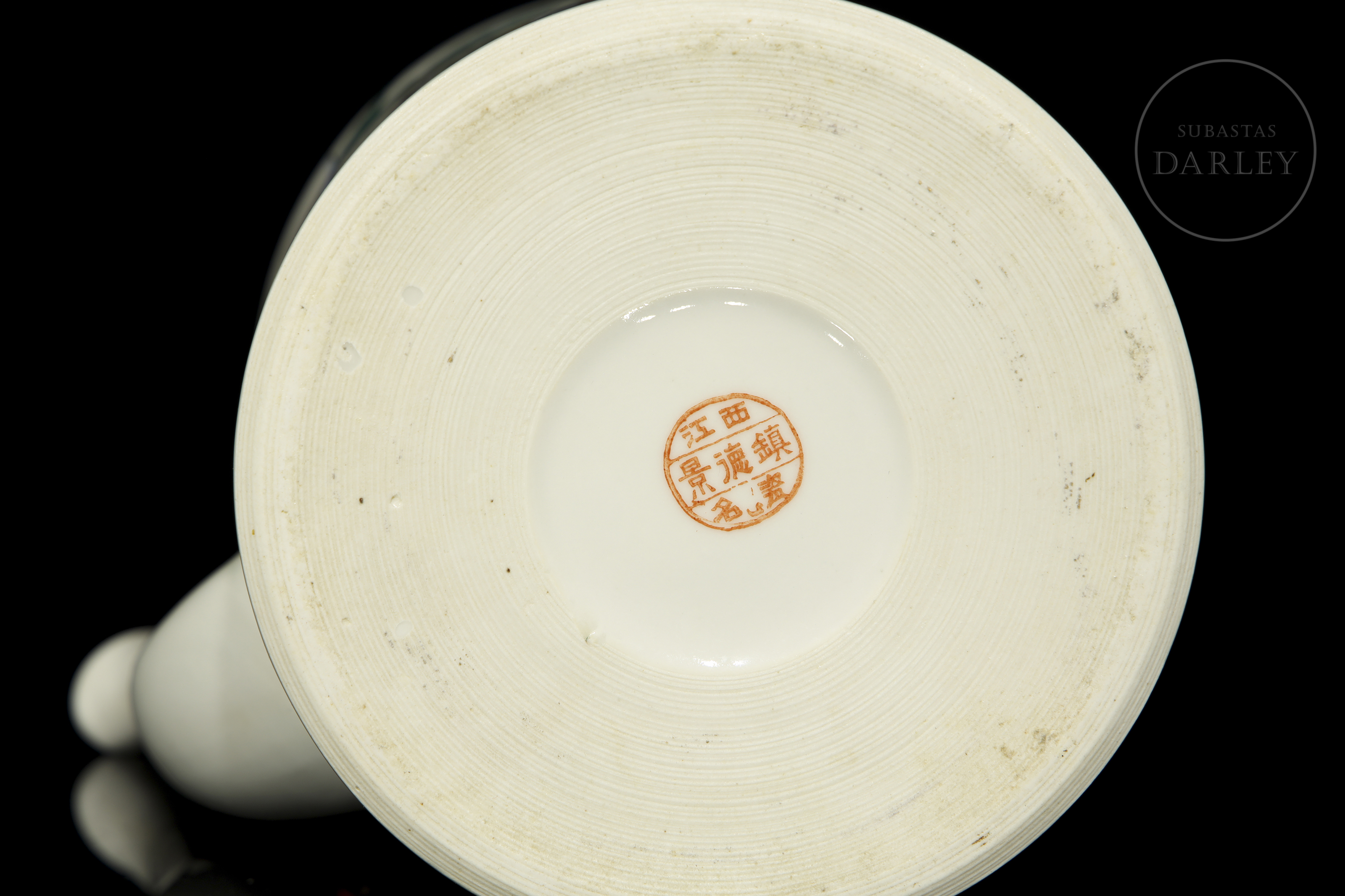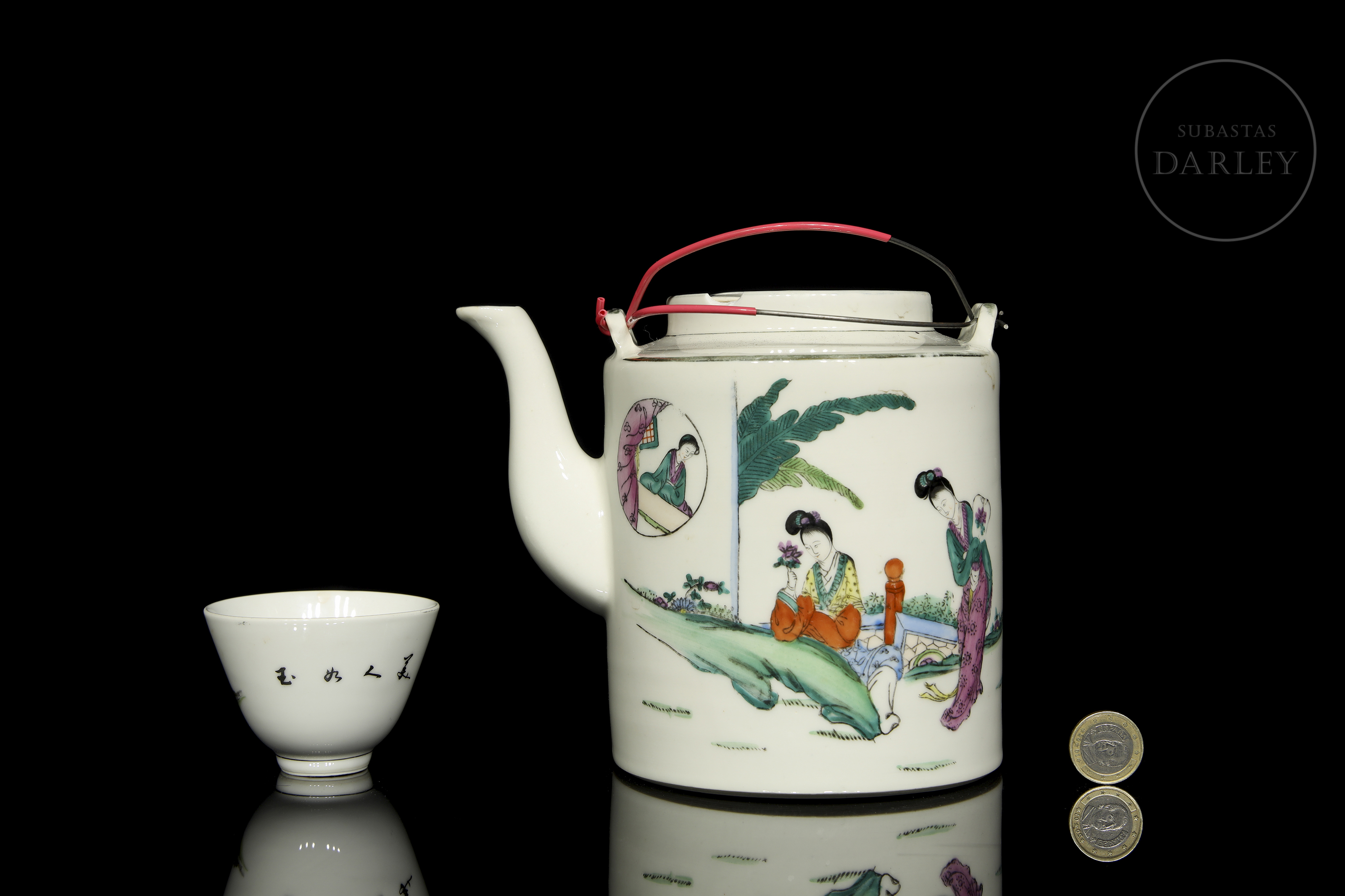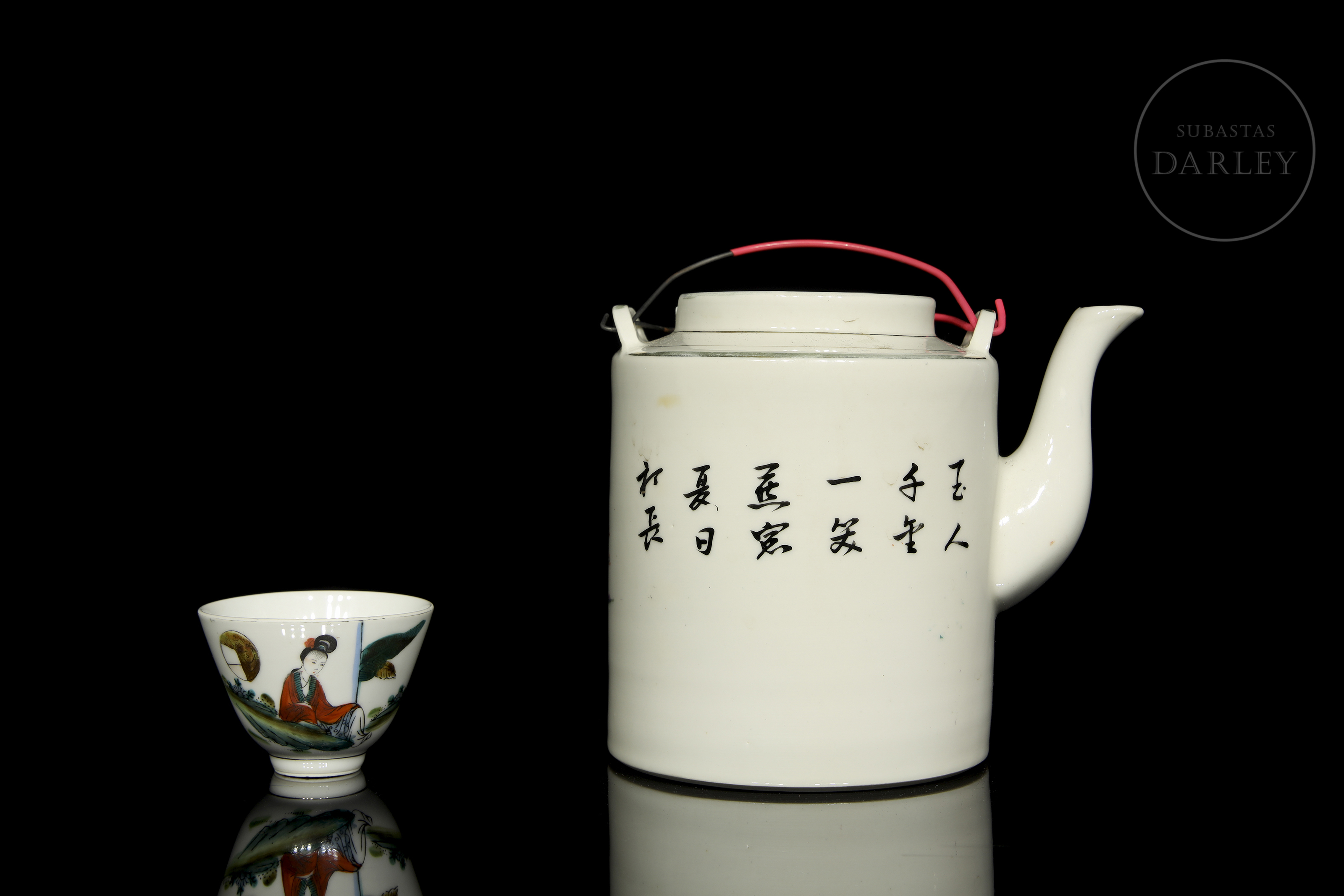 Juego de té de porcelana conformado por tetera, taza y un cesto. La tetera es cilíndrica, con pico curvo y un asa de metal; la taza de té posee la morfología tradicional de cuerpo hondo y paredes acampanadas. Decorado en esmalte con escenas y poemas. Con cesto de mimbre con tapa y cierres metálicos.