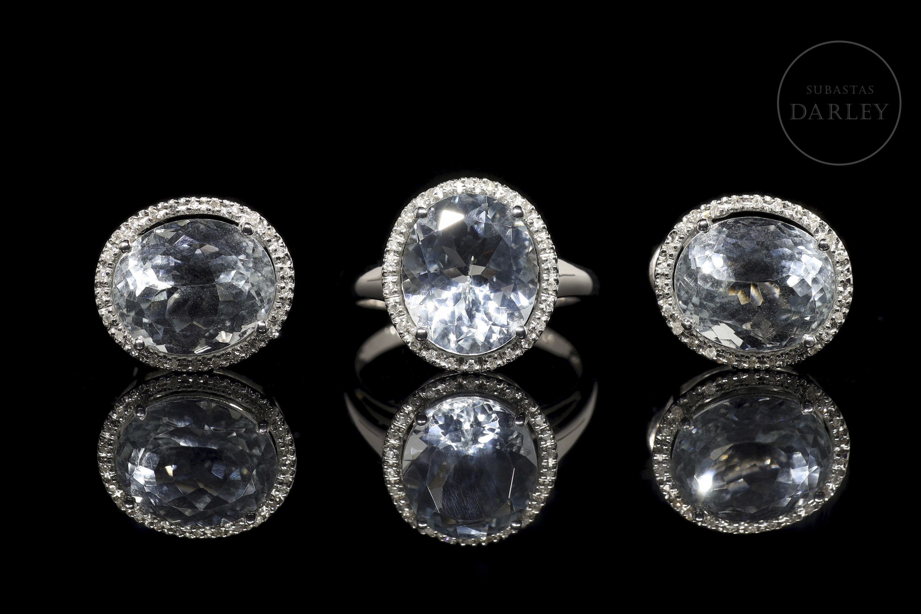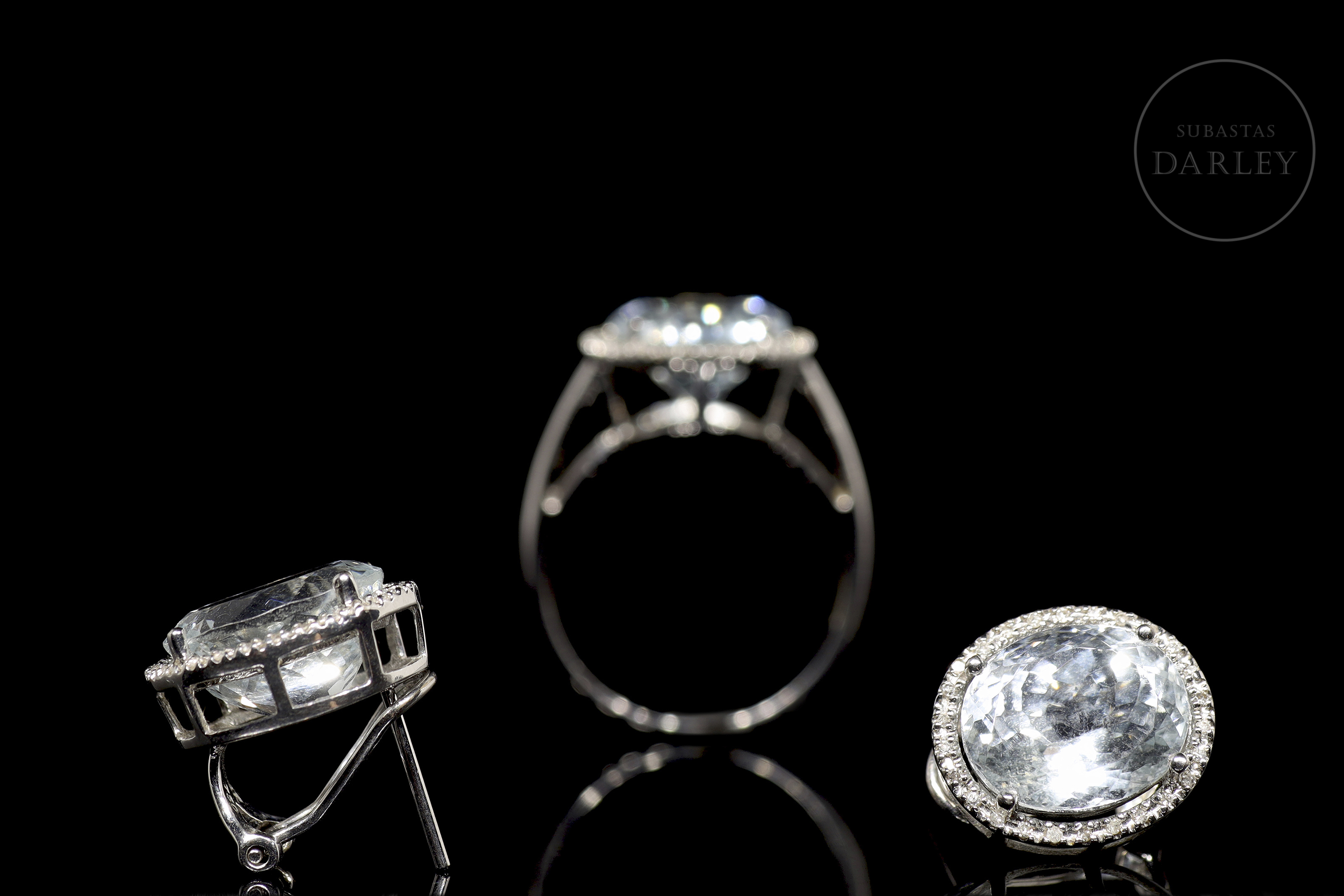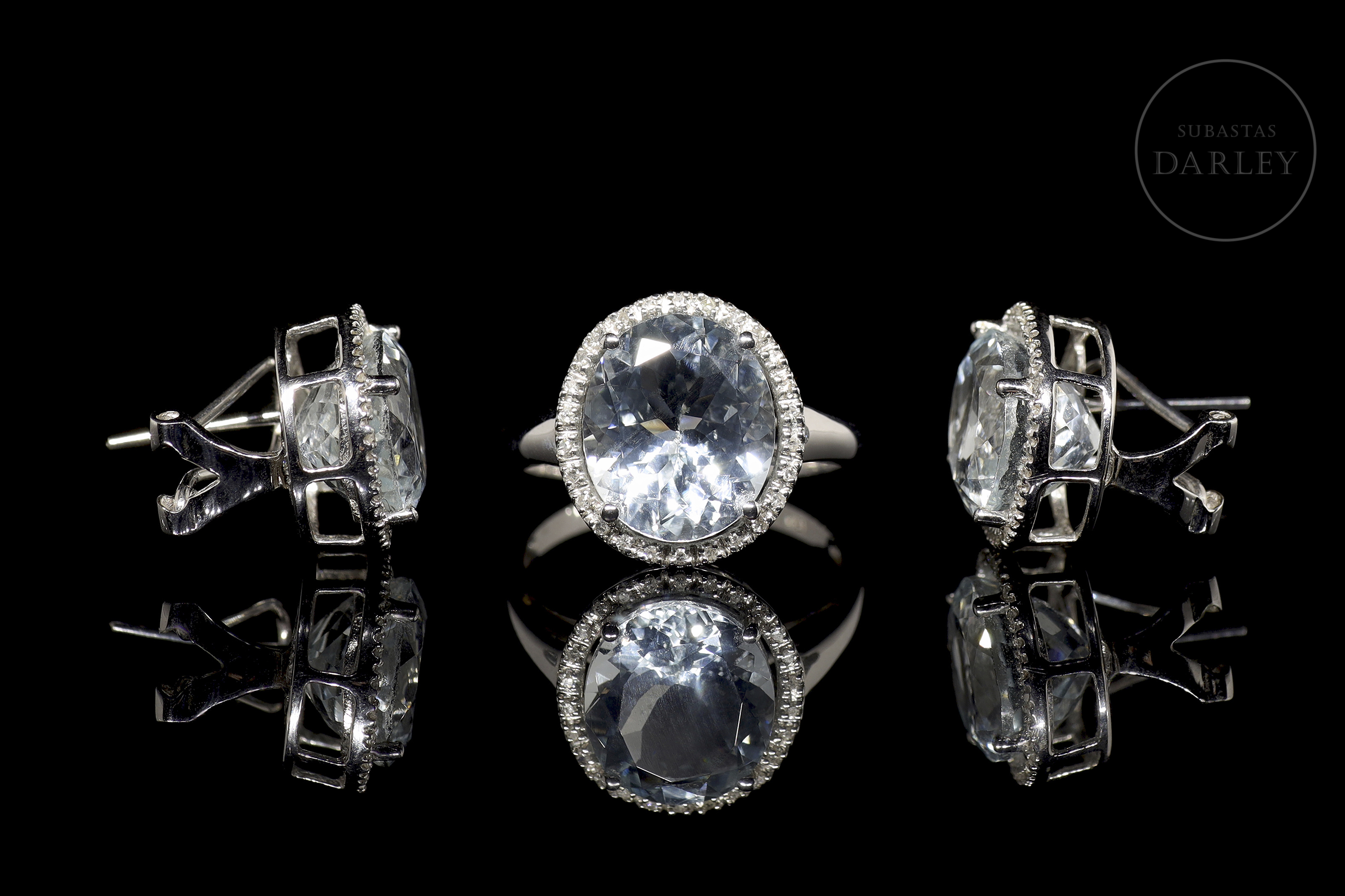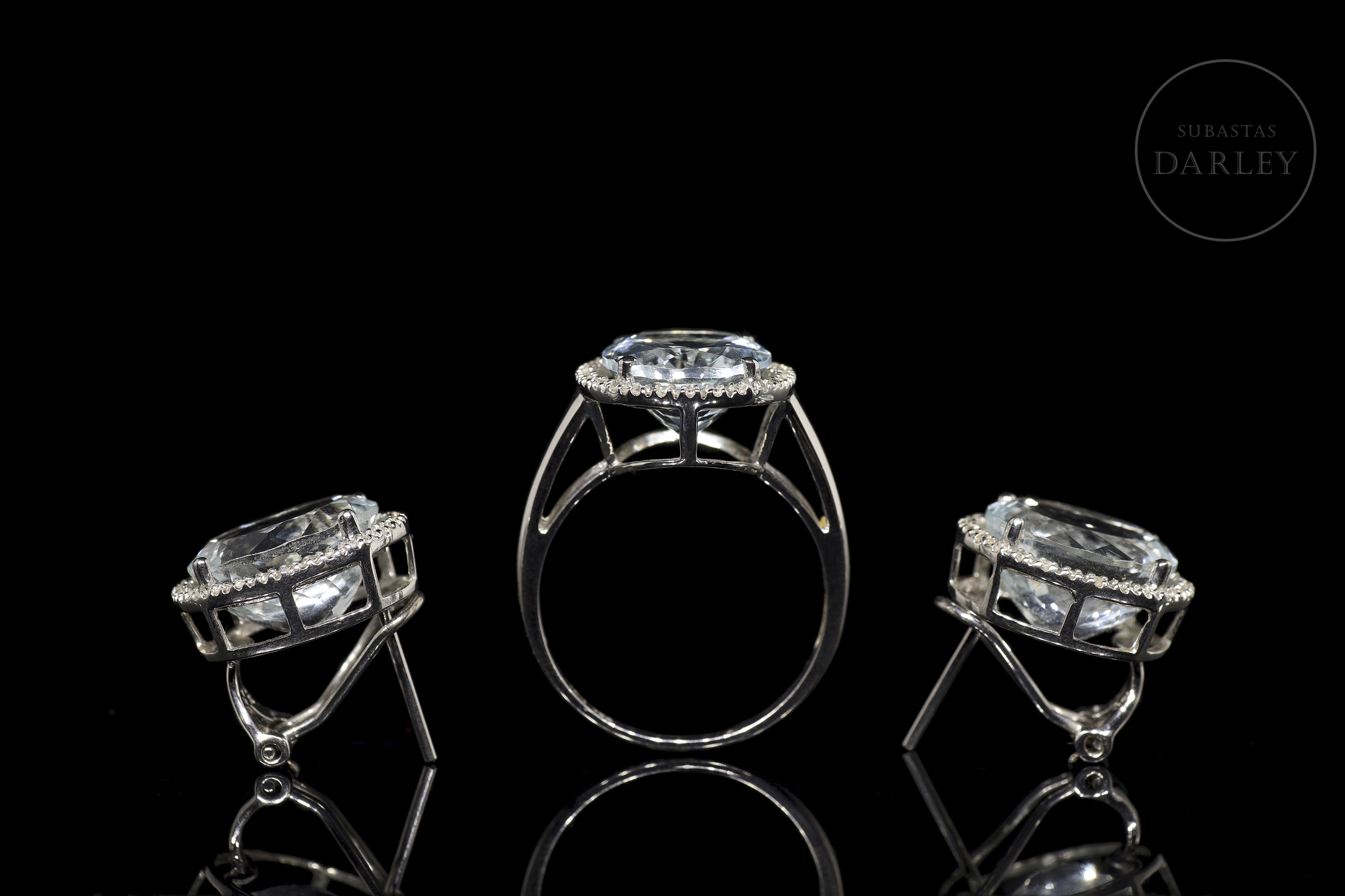Formado por pendientes y anillo a juego de oro blanco de 18k. El diseño se compone de una aguamarina central talla oval facetada con un peso total de 13 ct, enmarcada por un fino bisel cubierto por un total de 78 diamantes, talla brillante, de un peso total de 0,30 ct. Cierre de pala tipo omega.
