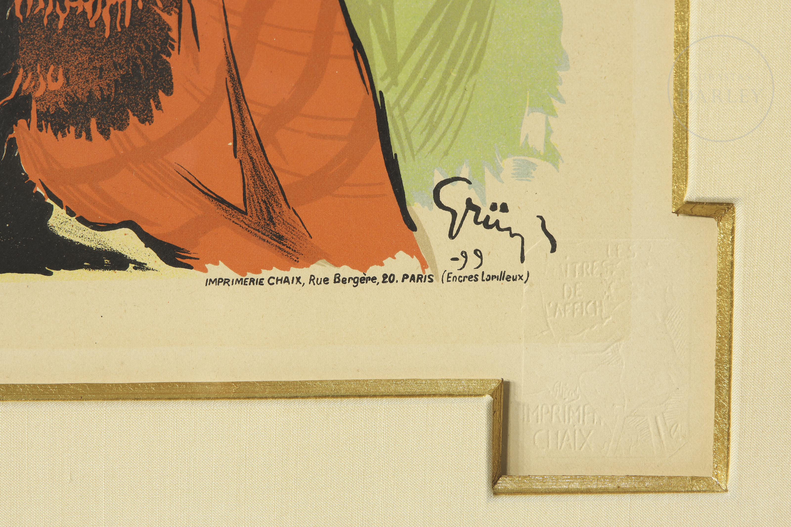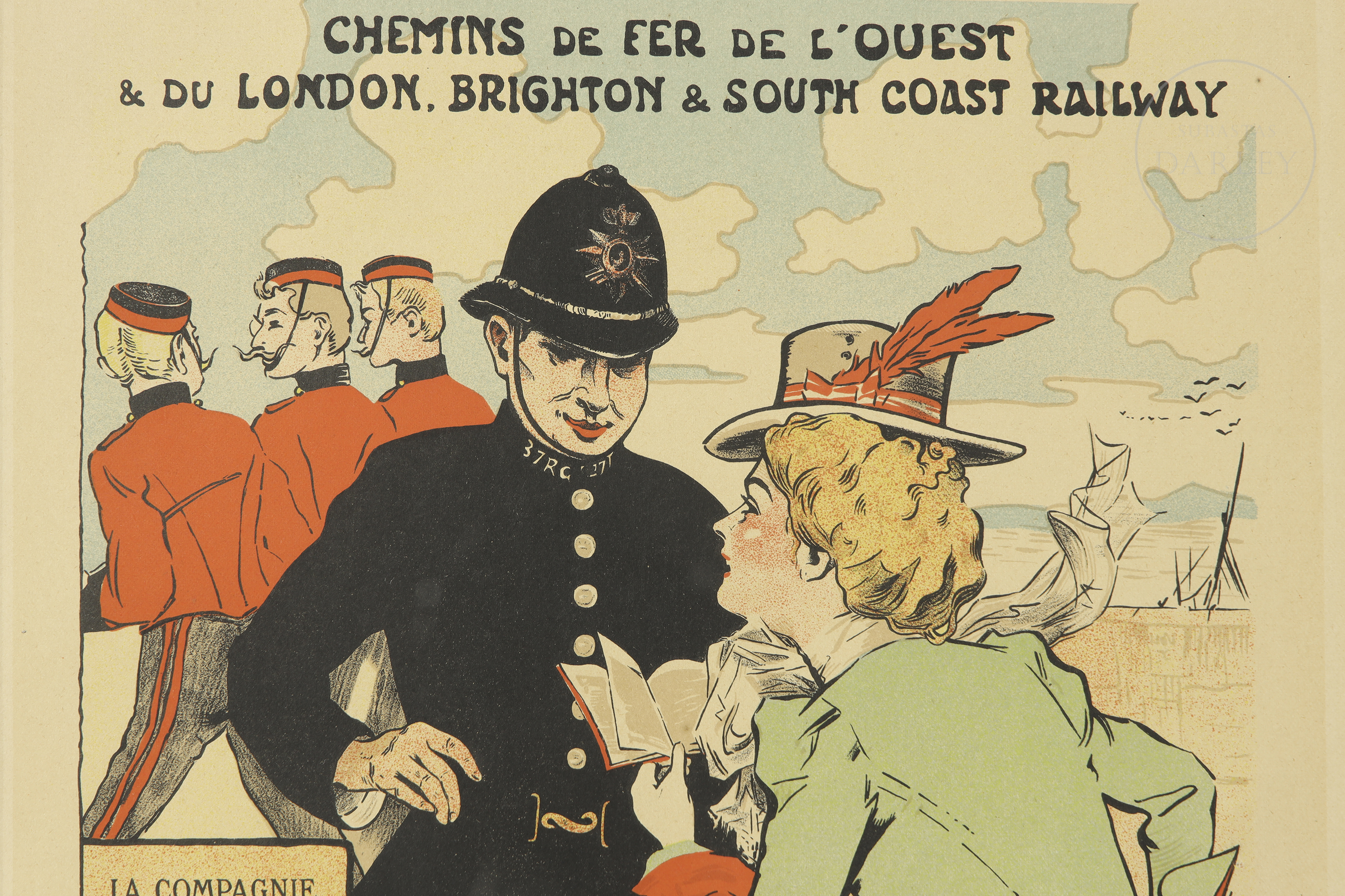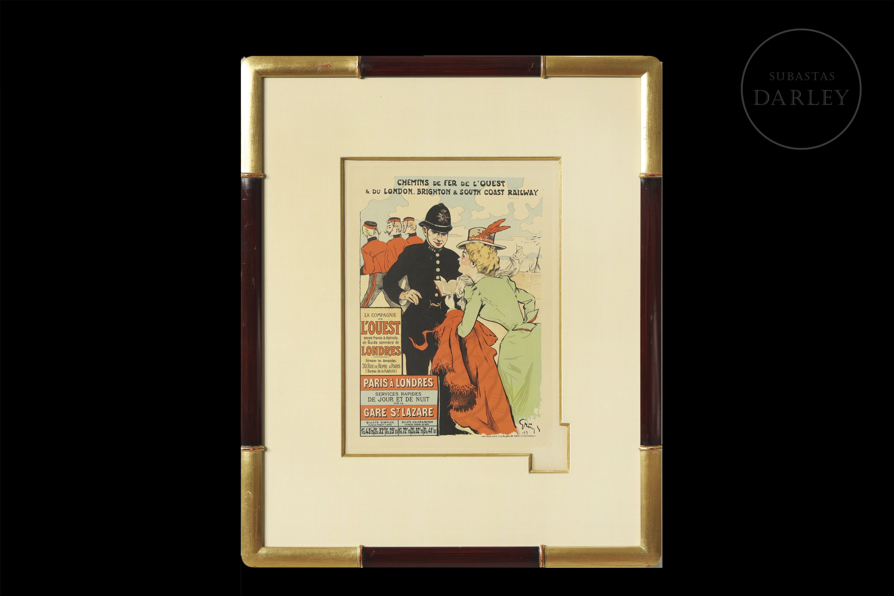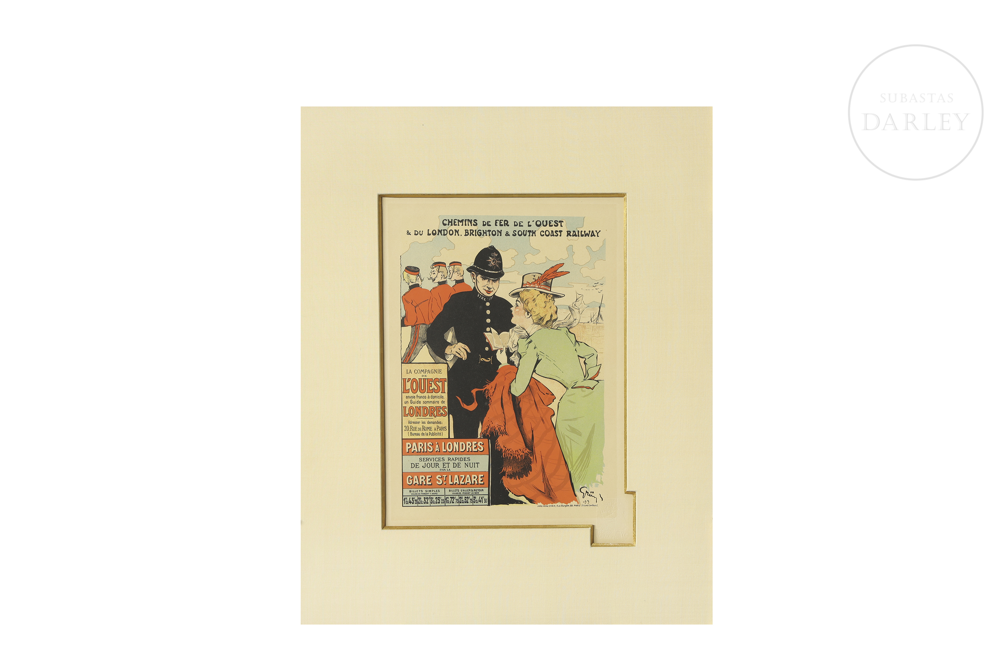 Litografía a color sobre papel Cartel publicitario original de época (Maîtres de l'Affiche) diseñado para la compañía de ferrocarriles "Chemins de Fer de l'Ouest & London Brighton & South Coast Railway". Firmado en plancha en el ángulo inferior derecho "Grün -99". Sello en seco "LES MAÎTRES DE L'AFFICHE / IMPRIMERIE CHAIX" en el margen inferior derecho.