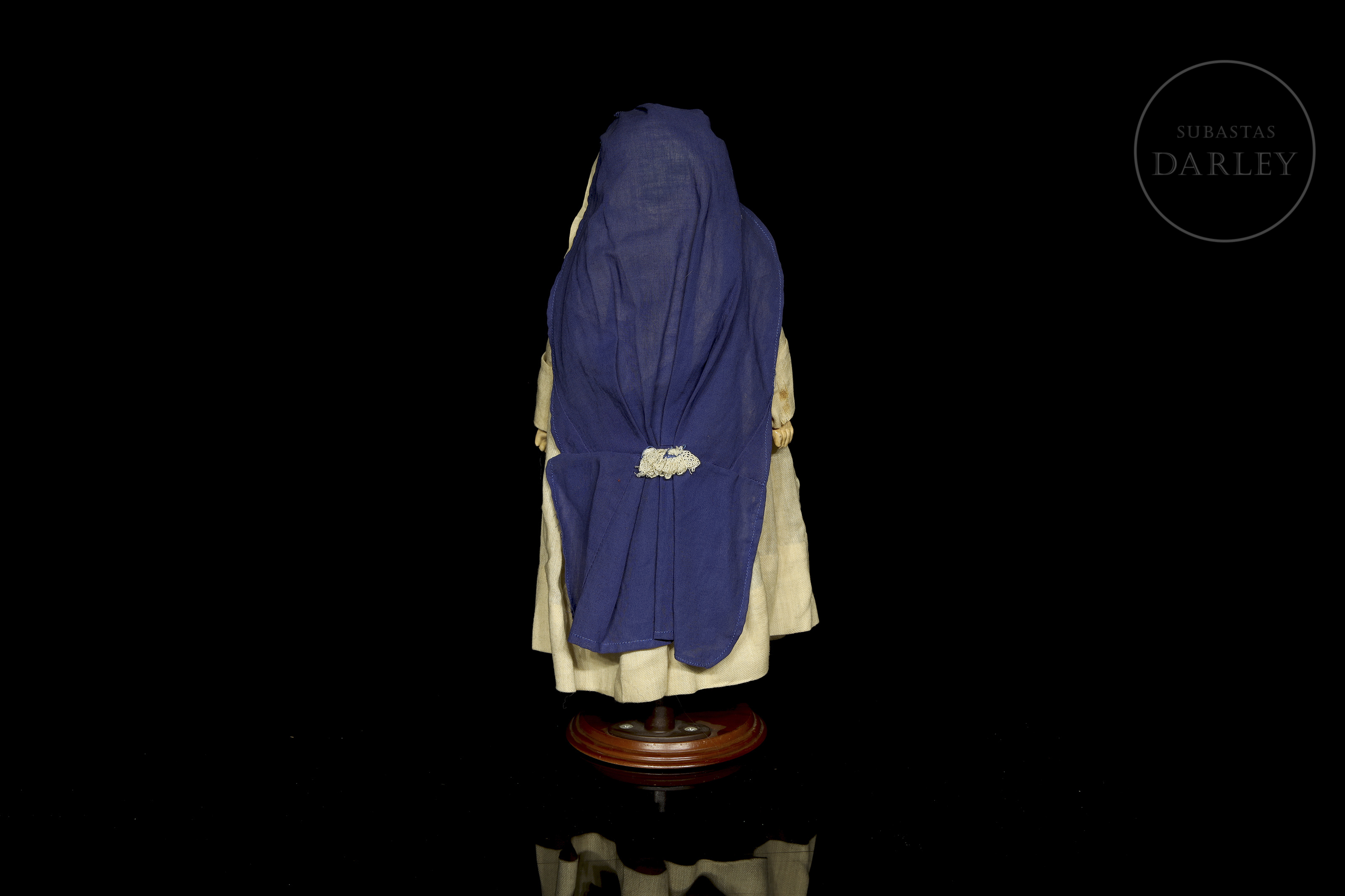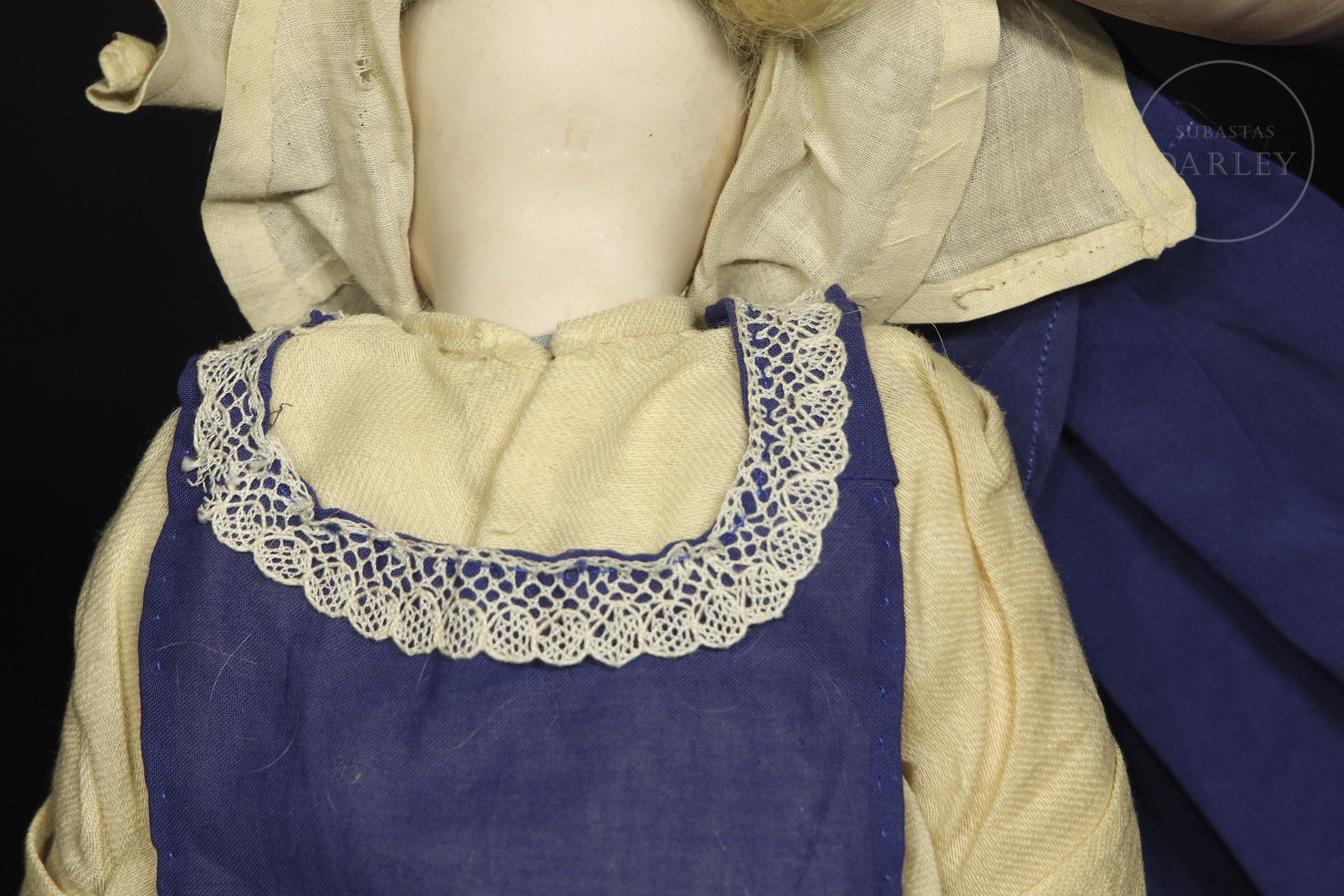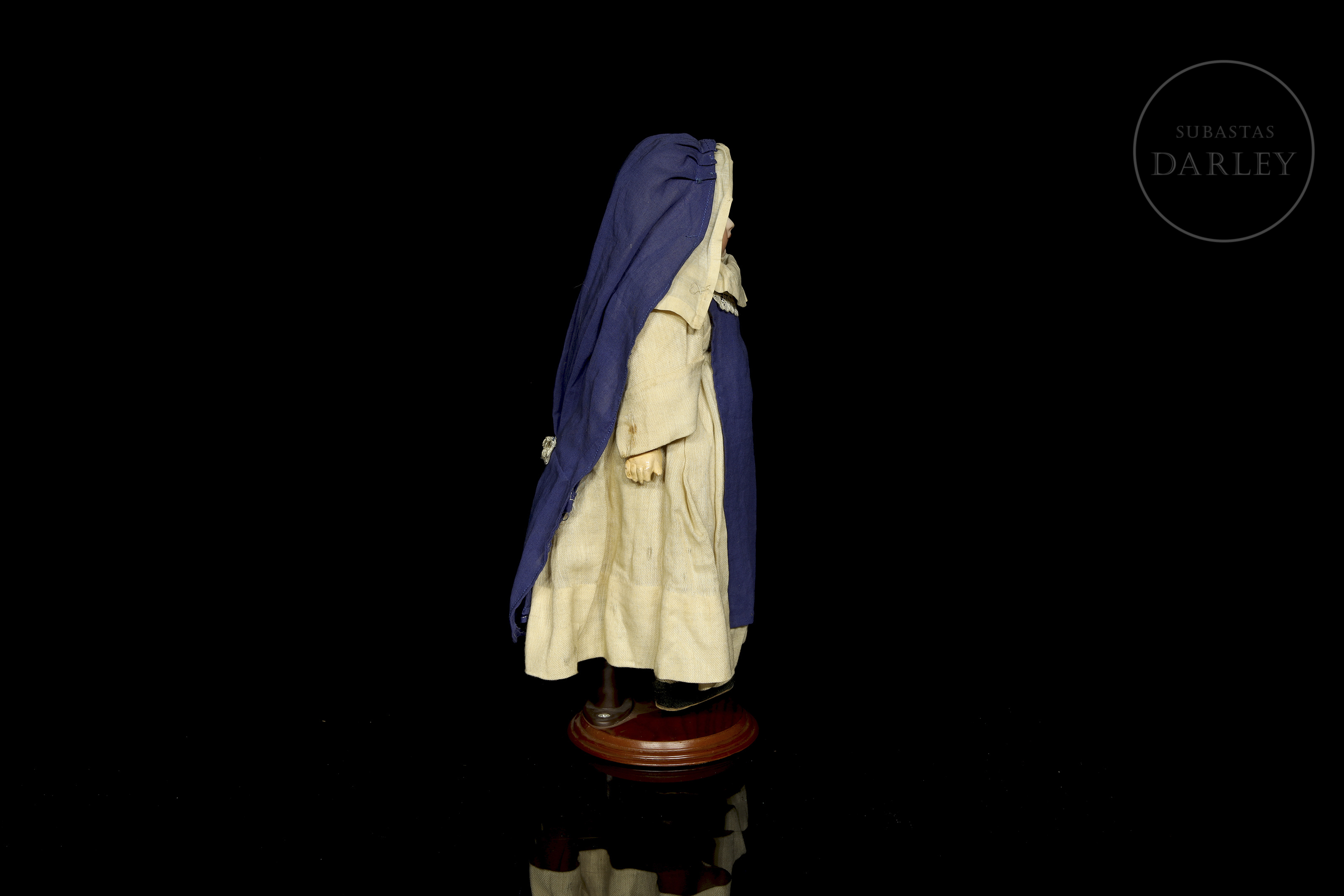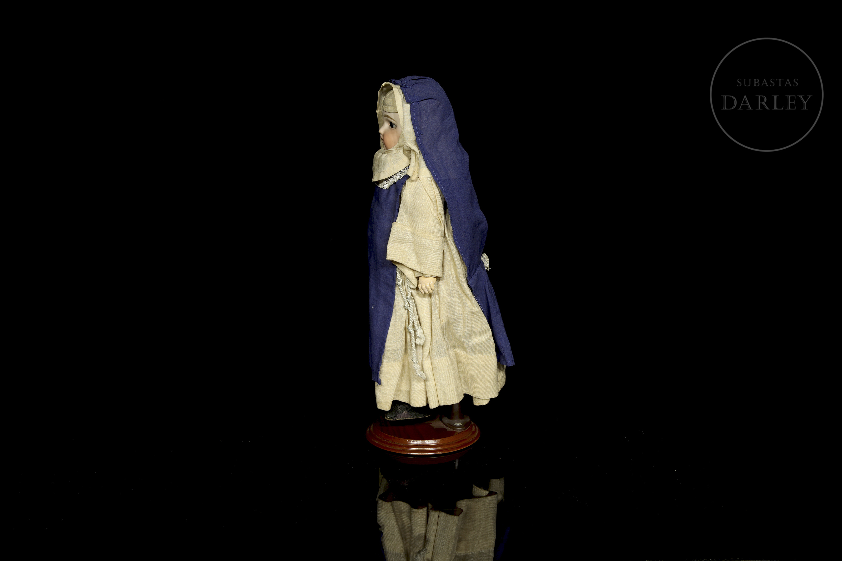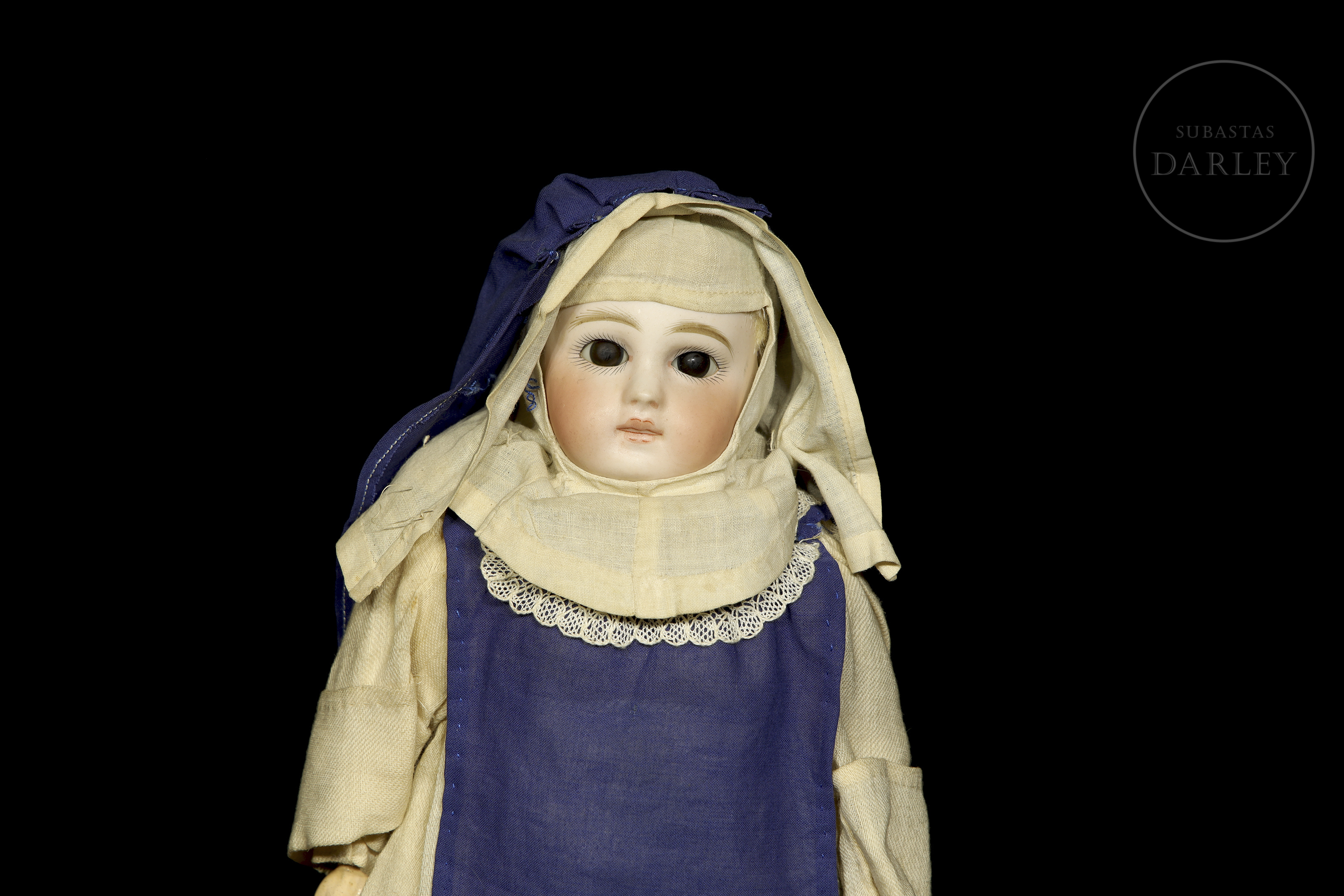 Célebre muñeca de carácter alemana, modelo "Mein Liebling" 117, con cabeza de biscuit fabricada por Simon & Halbig para Kammer & Reinhardt. Presenta una expresión realista intada a mano, con boca cerrada y cuerpo articulado de composición. Marca incisa en la nuca: "K & R / Simon & Halbig / 117". Viste su indumentaria original de época: un hábito de monja o enfermera compuesto por una túnica beige con delantal azul, cofia y calzado.