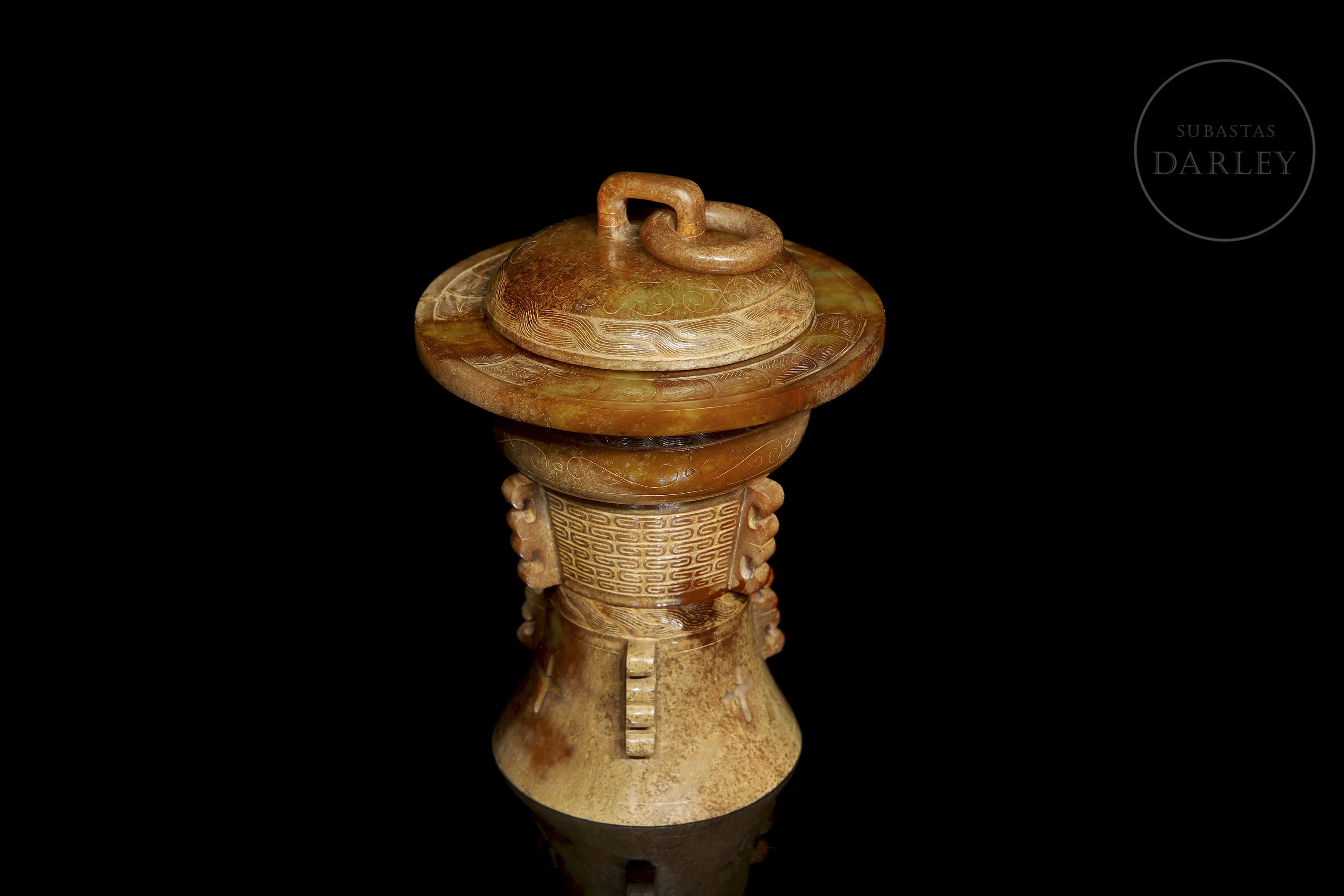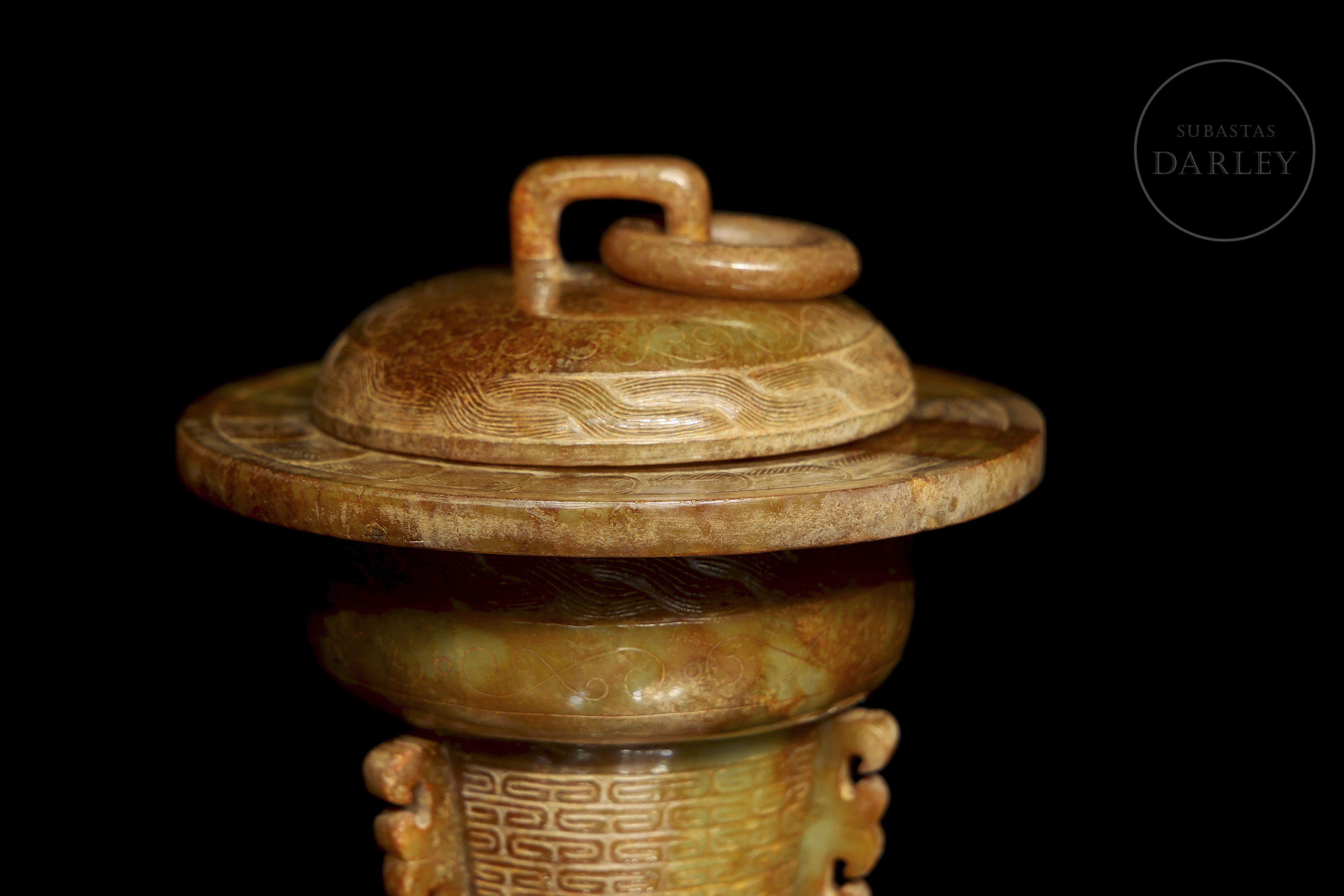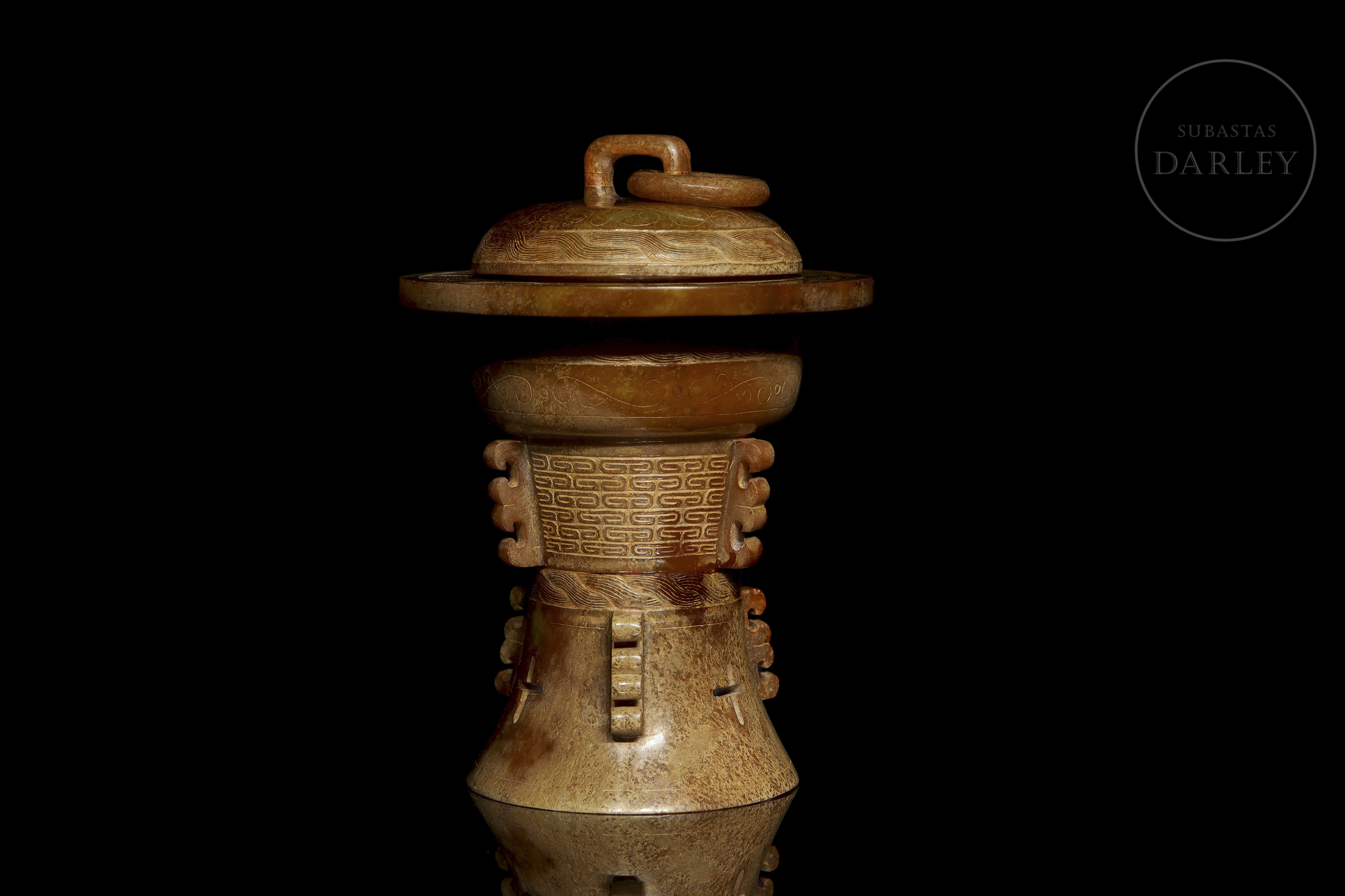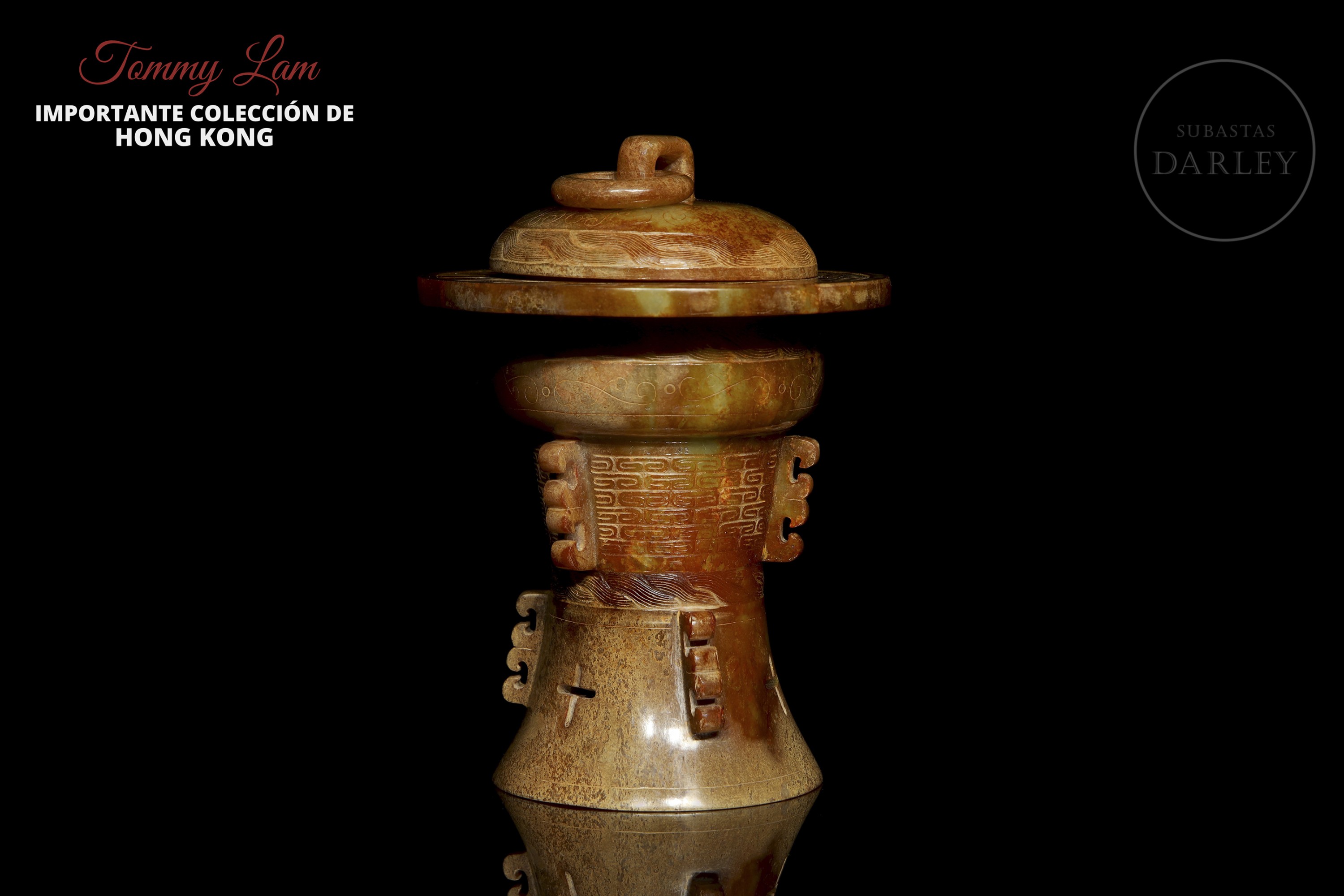 Lámpara de aceite de jade amarillo, realizada en nefrita de una tonalidad amarillo miel con una profusa pátina y marcadas alteraciones minerales en tonos ocre y marrón rojizo. La pieza presenta una estructura arquitectónica compuesta por una base cónica calada, un cuerpo central bulboso, adornado con bandas de motivos geométricos, y un ala superior ancha con borde elevado. Posee una tapa semiesférica rematada por un asa en forma de anilla entrelazada, decorada con finos bajorrelieves de nubes y ondas. Destaca la complejidad técnica de su ornamentación, que incluye crestas caladas laterales. Estas lámparas de jade eran objetos suntuarios de altísimo rango, destinados al uso ritual o doméstico de la aristocracia real. Periodo Reinos Combatientes (475–221 a.C.) o posterior.