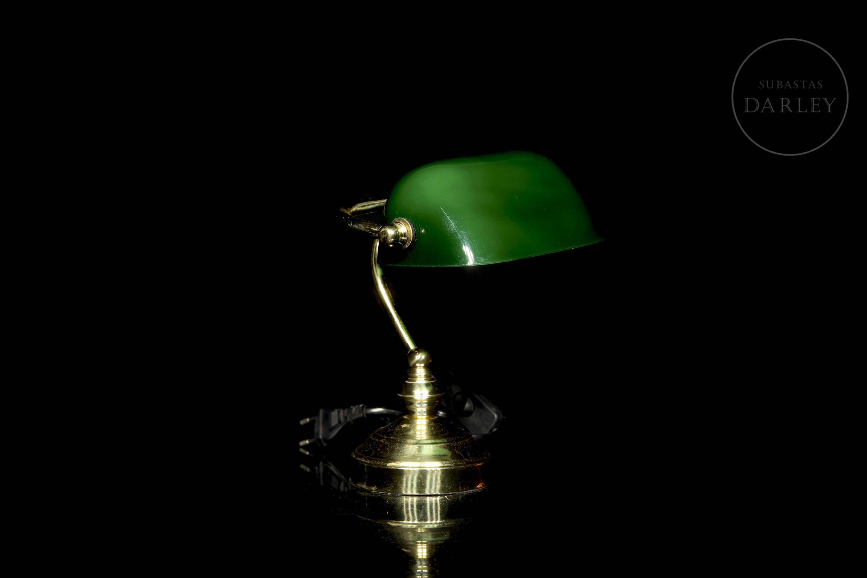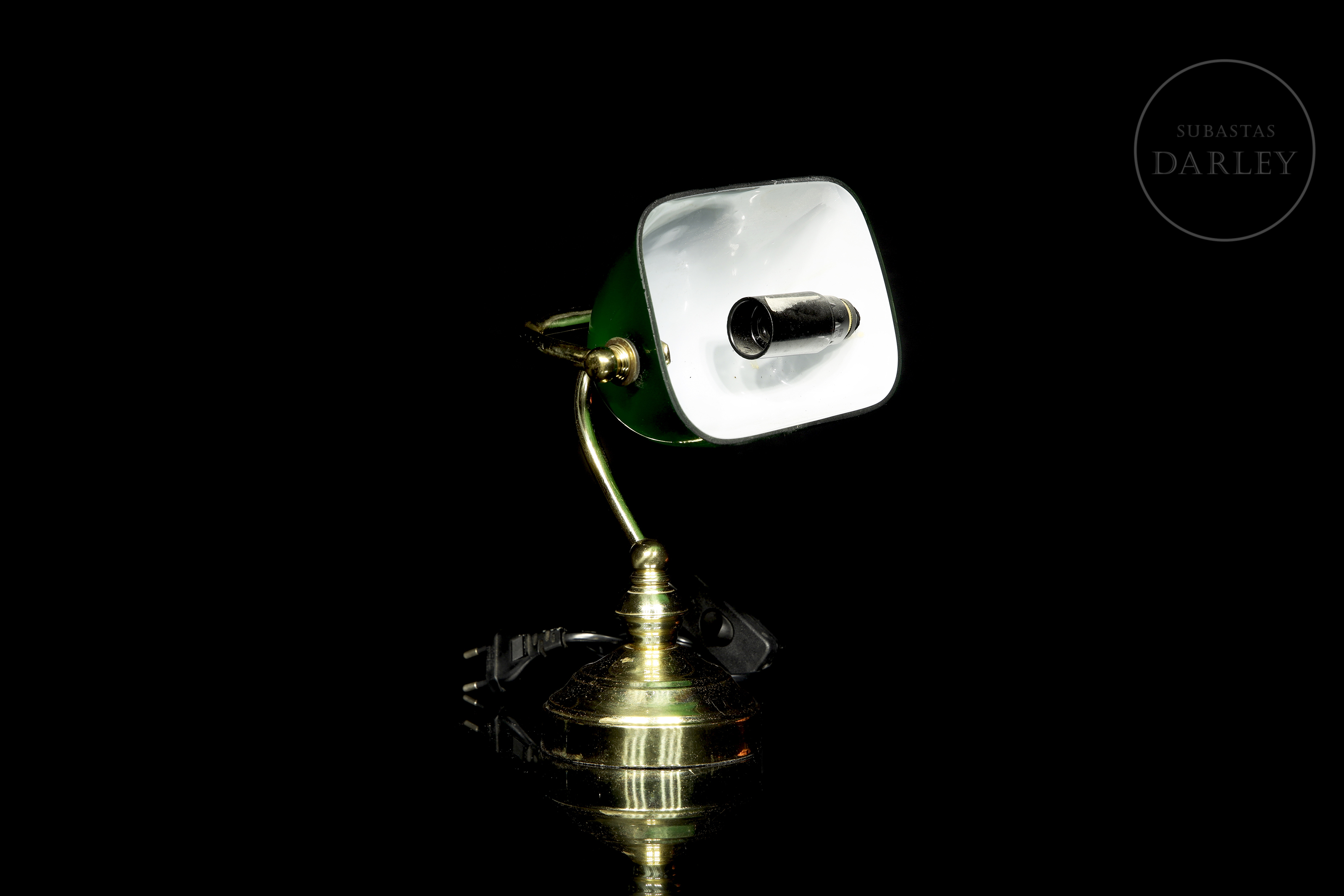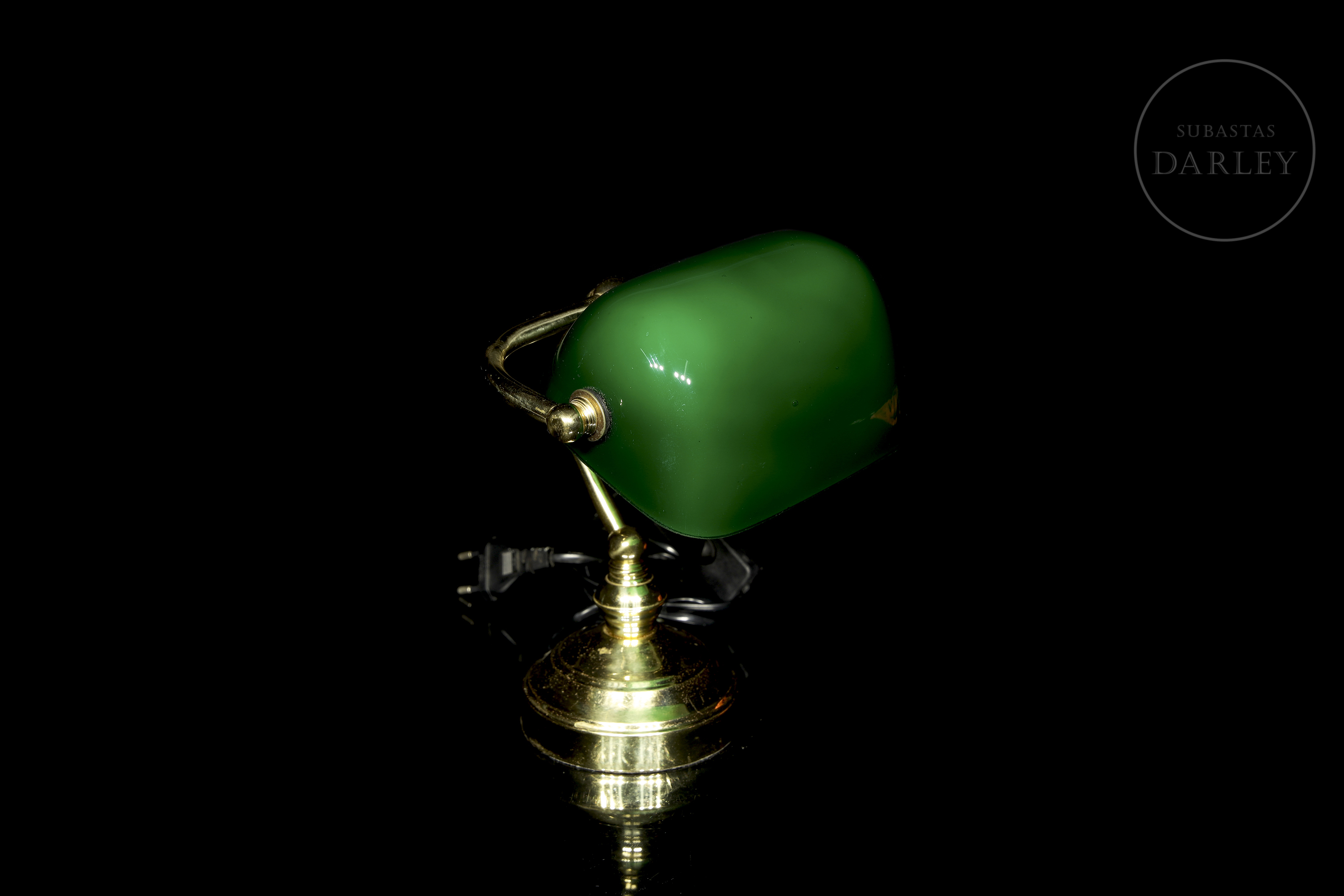 Pequeña lámpara de escritorio de estilo "banquero" o Emeralite, con pantalla basculante de vidrio verde e interior opalino blanco. El fuste curvado y la base circular están realizados en latón con un acabado brillante, conservando el sistema eléctrico original con interruptor de cable.