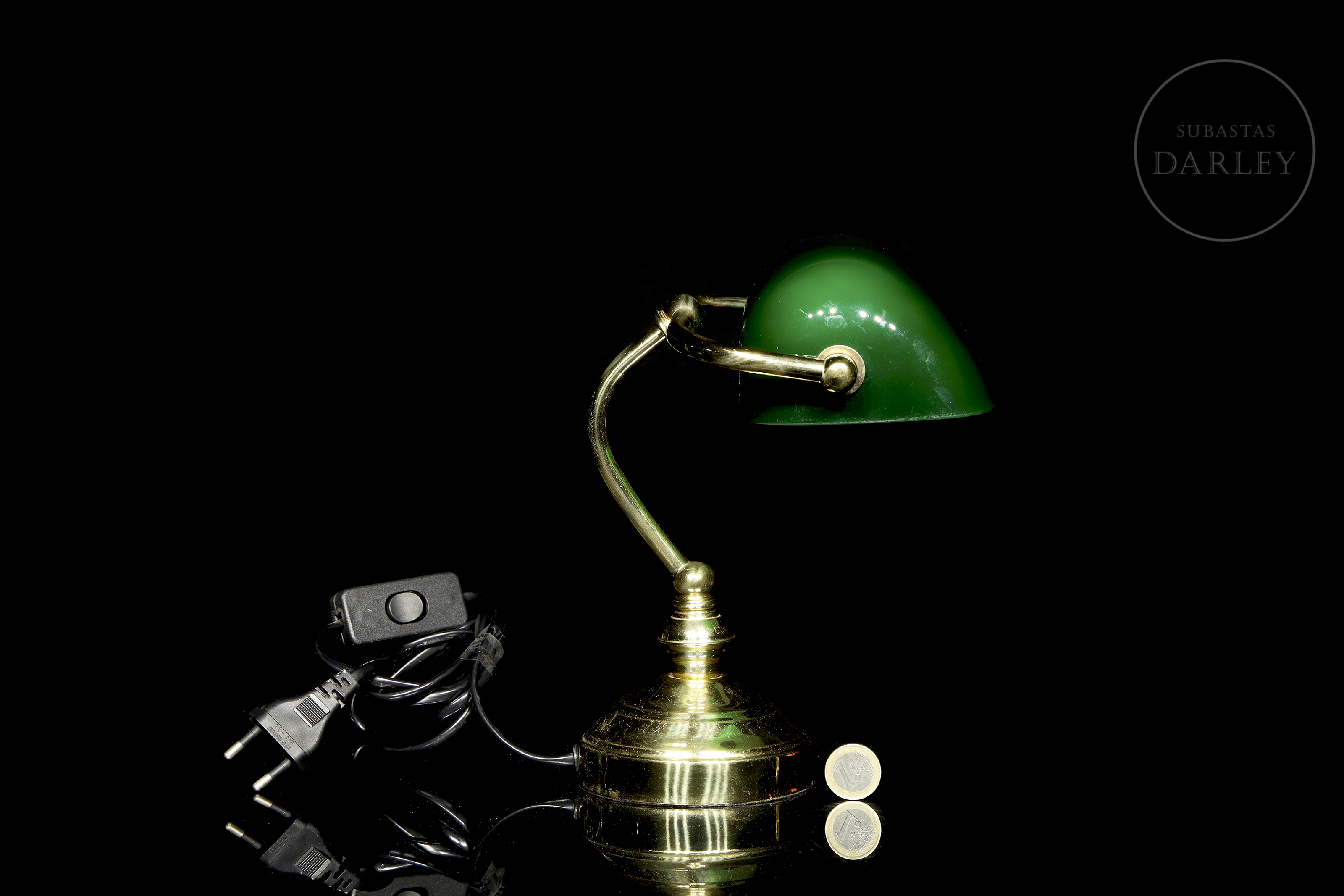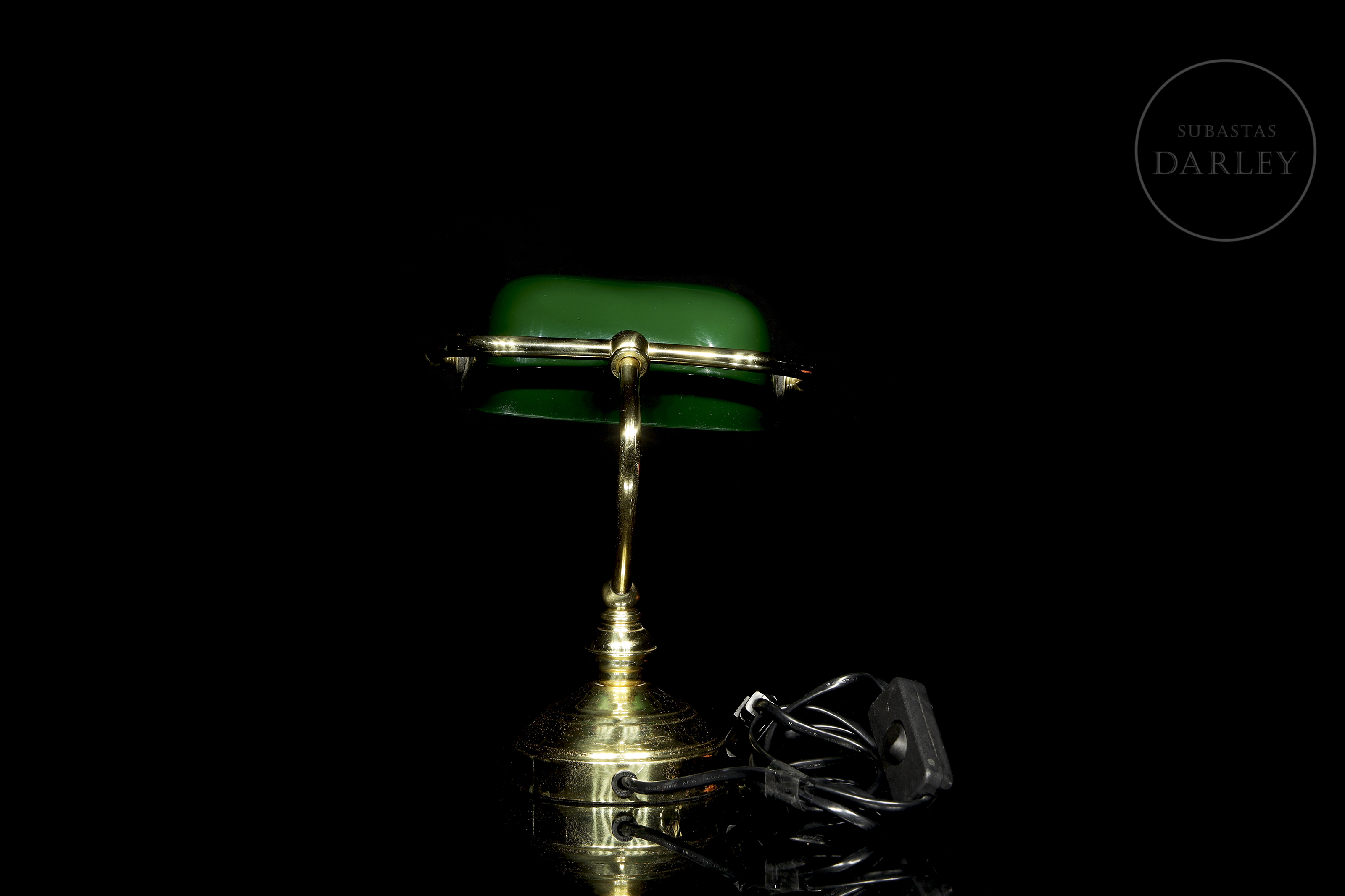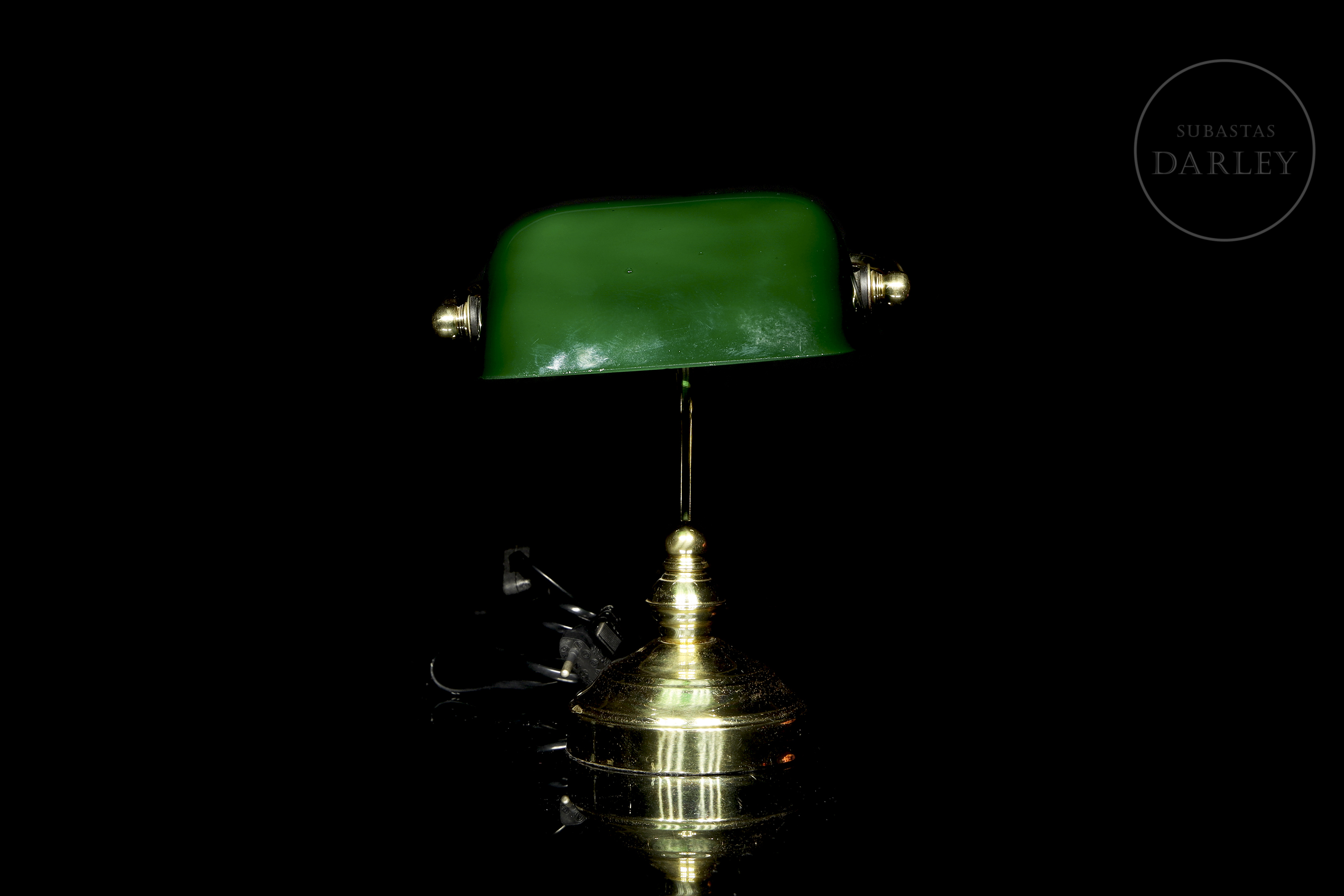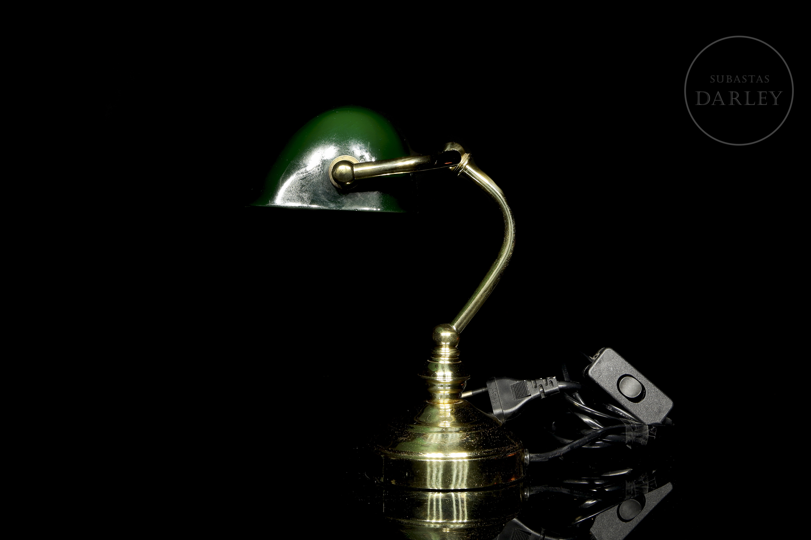 Pequeña lámpara de escritorio de estilo "banquero" o Emeralite, con pantalla basculante de vidrio verde e interior opalino blanco. El fuste curvado y la base circular están realizados en latón con un acabado brillante, conservando el sistema eléctrico original con interruptor de cable.