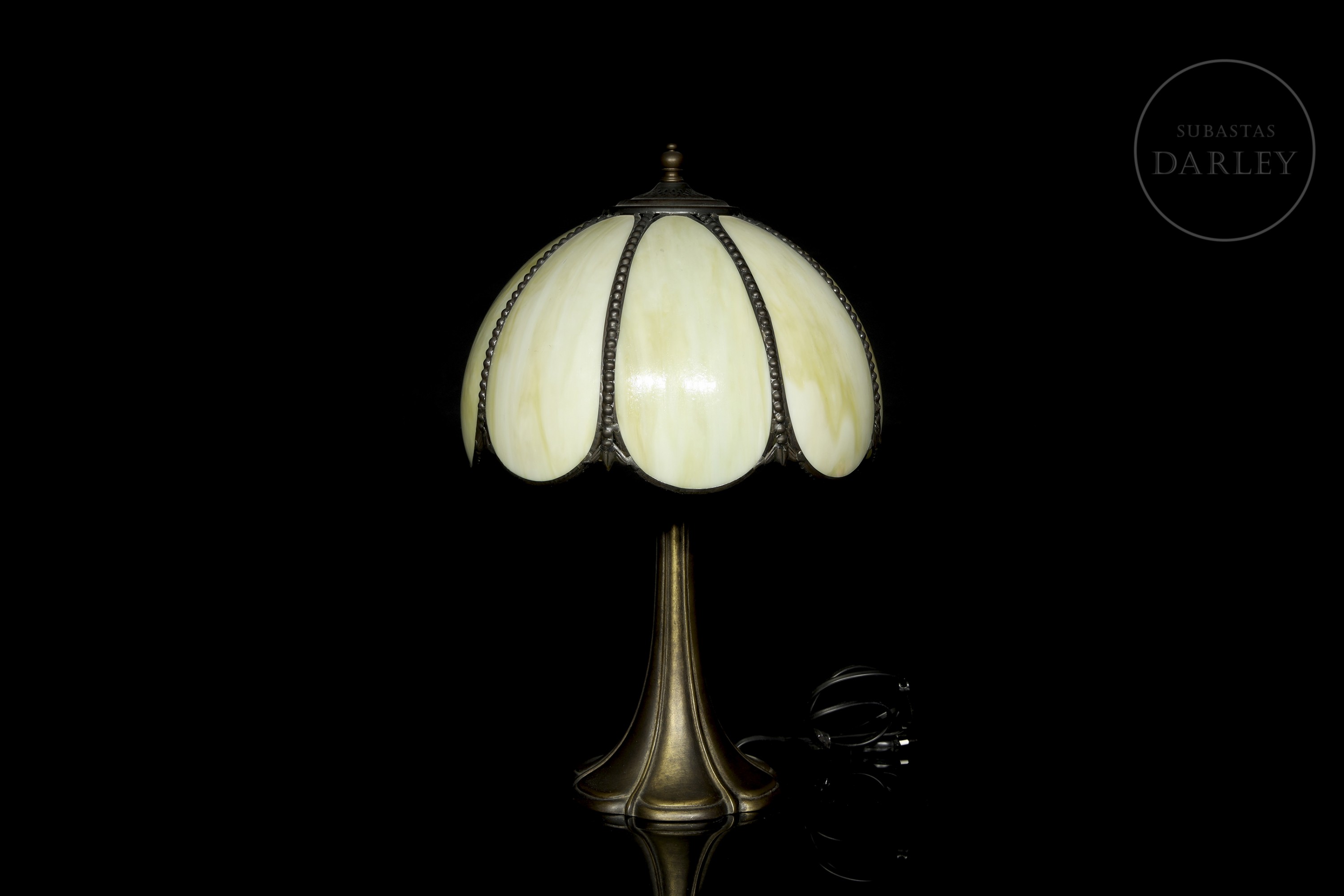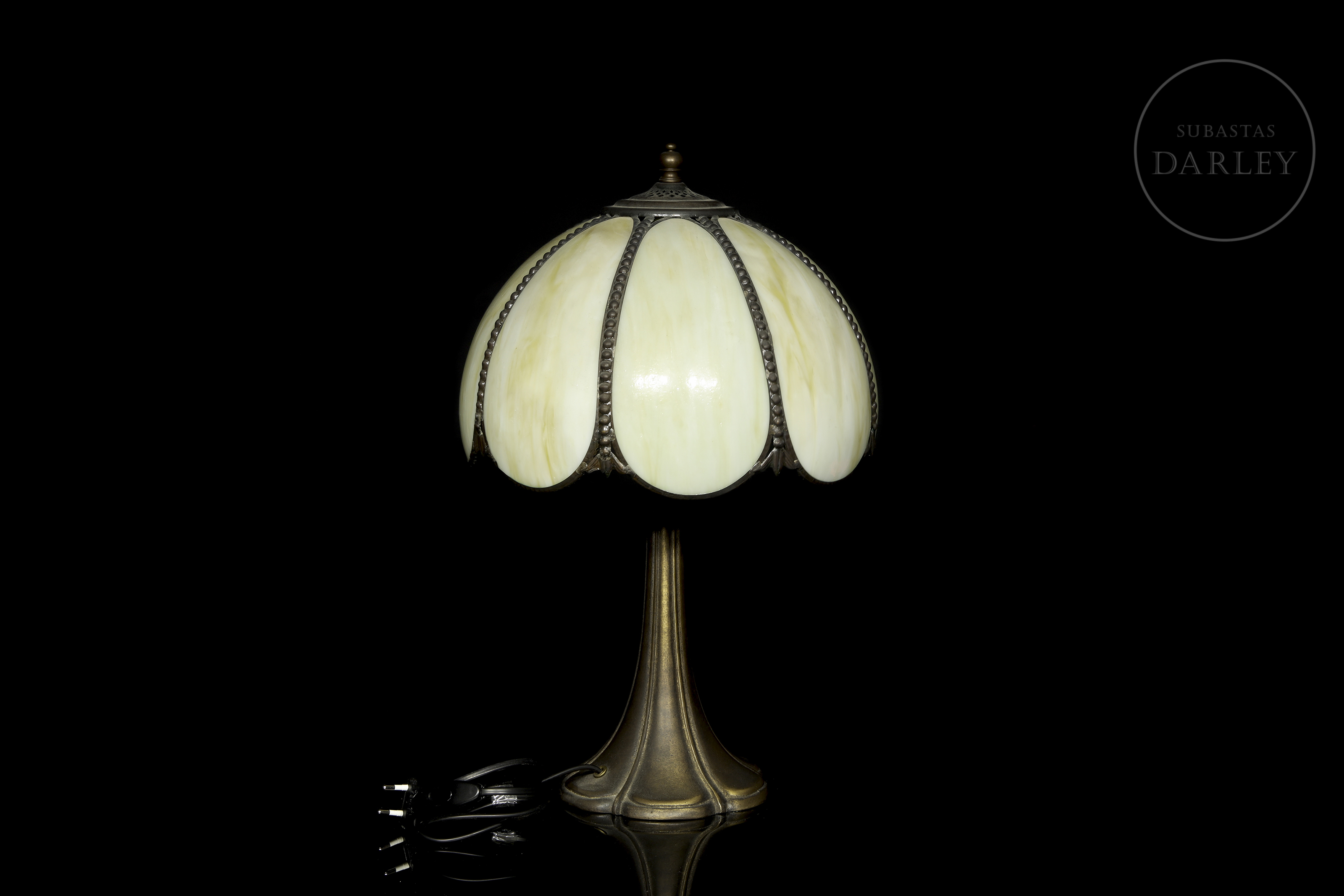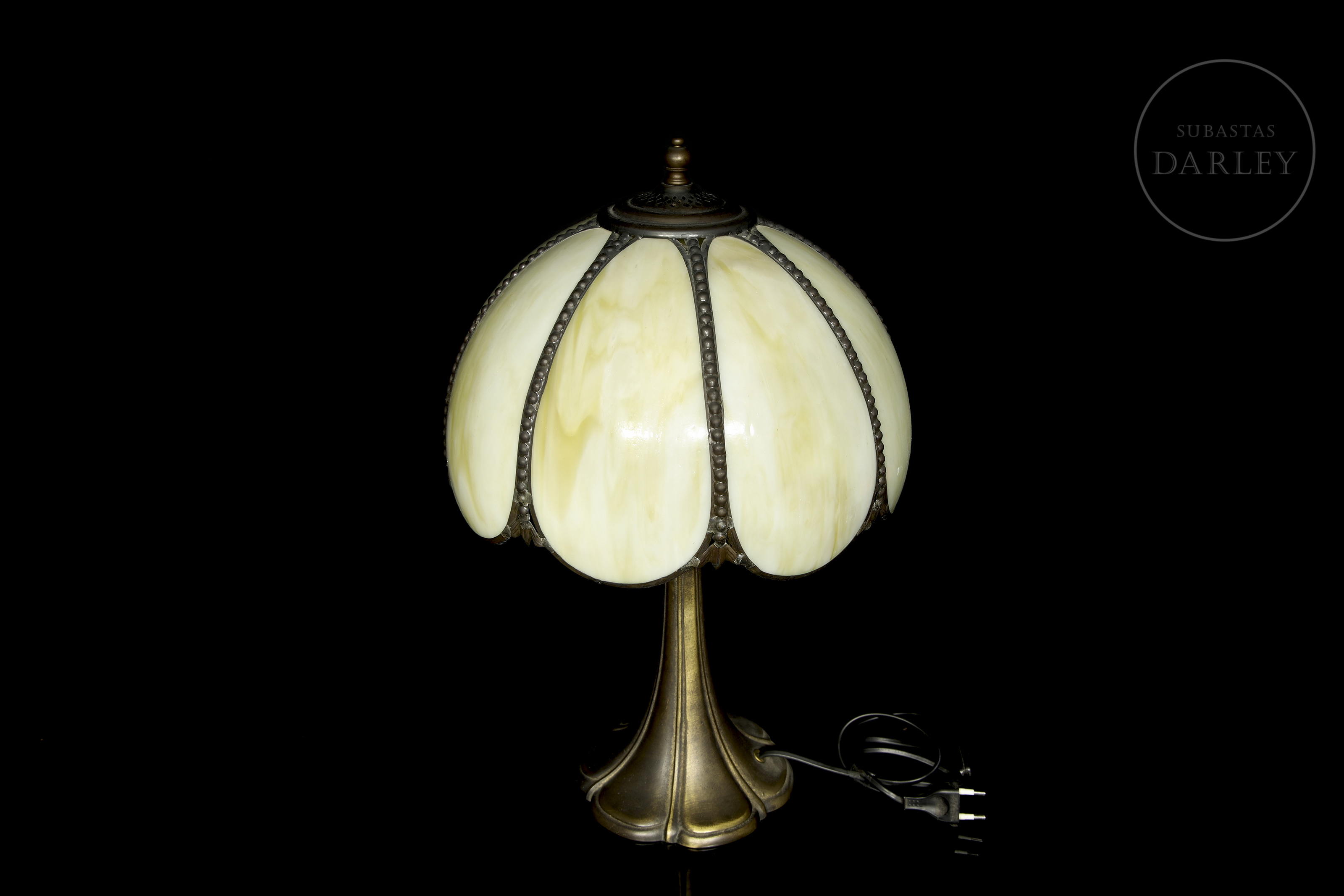 Lámpara con pantalla semiesférica compuesta por seis gajos de vidrio opalino en tonos crema, unidos por una estructura metálica con remate de cuentas. La base, de fundición metálica con pátina oscura, presenta una silueta acampanada y orgánica.