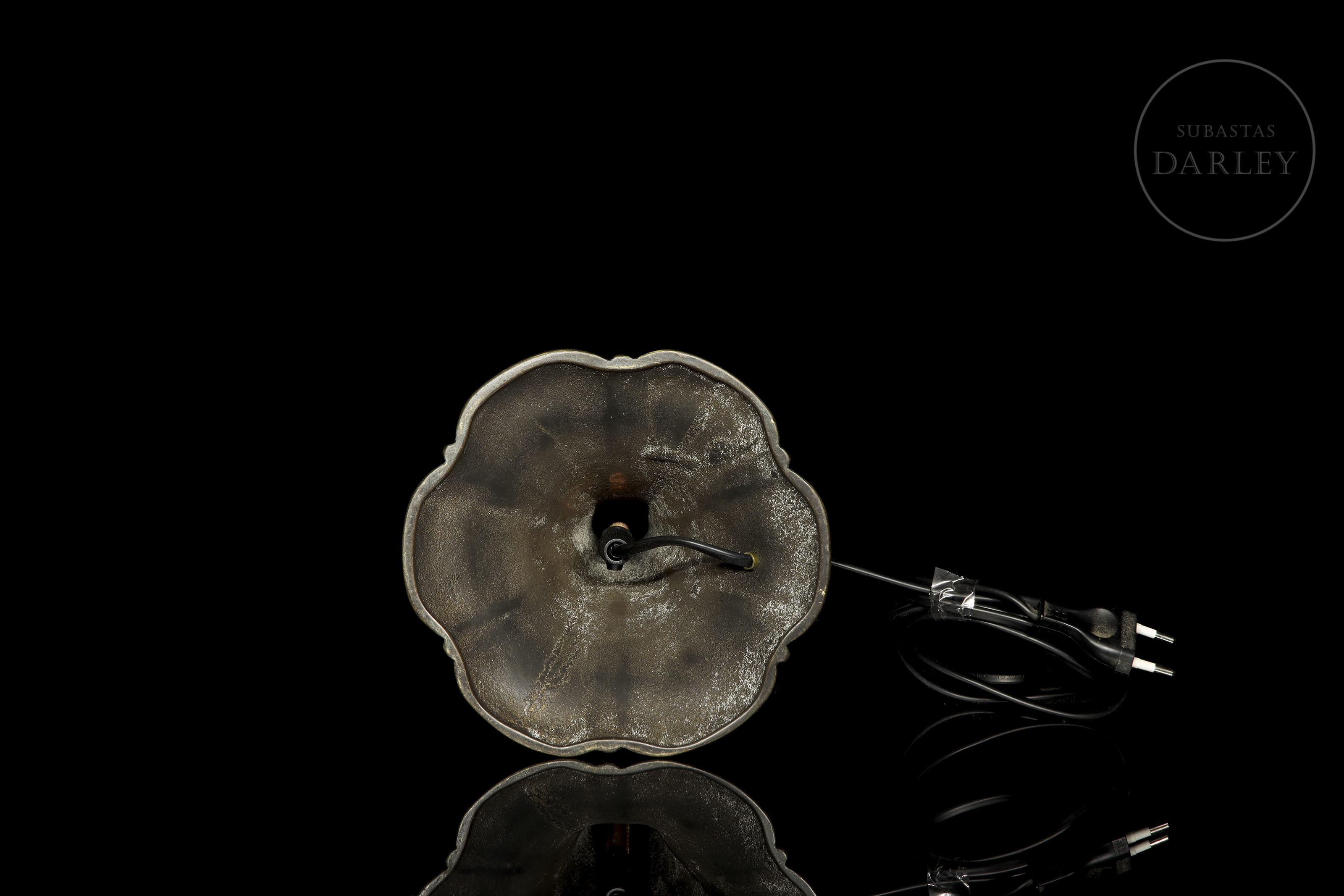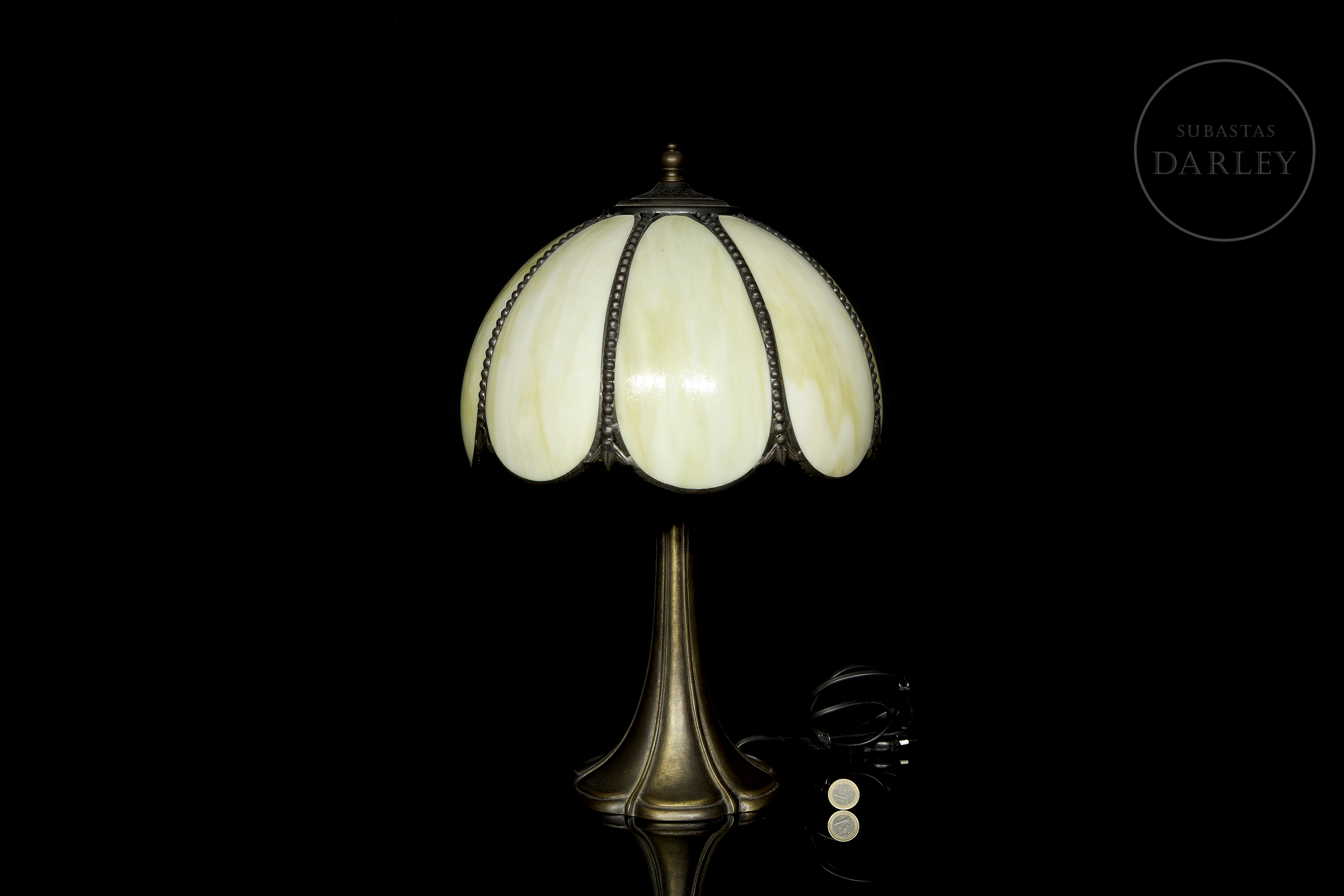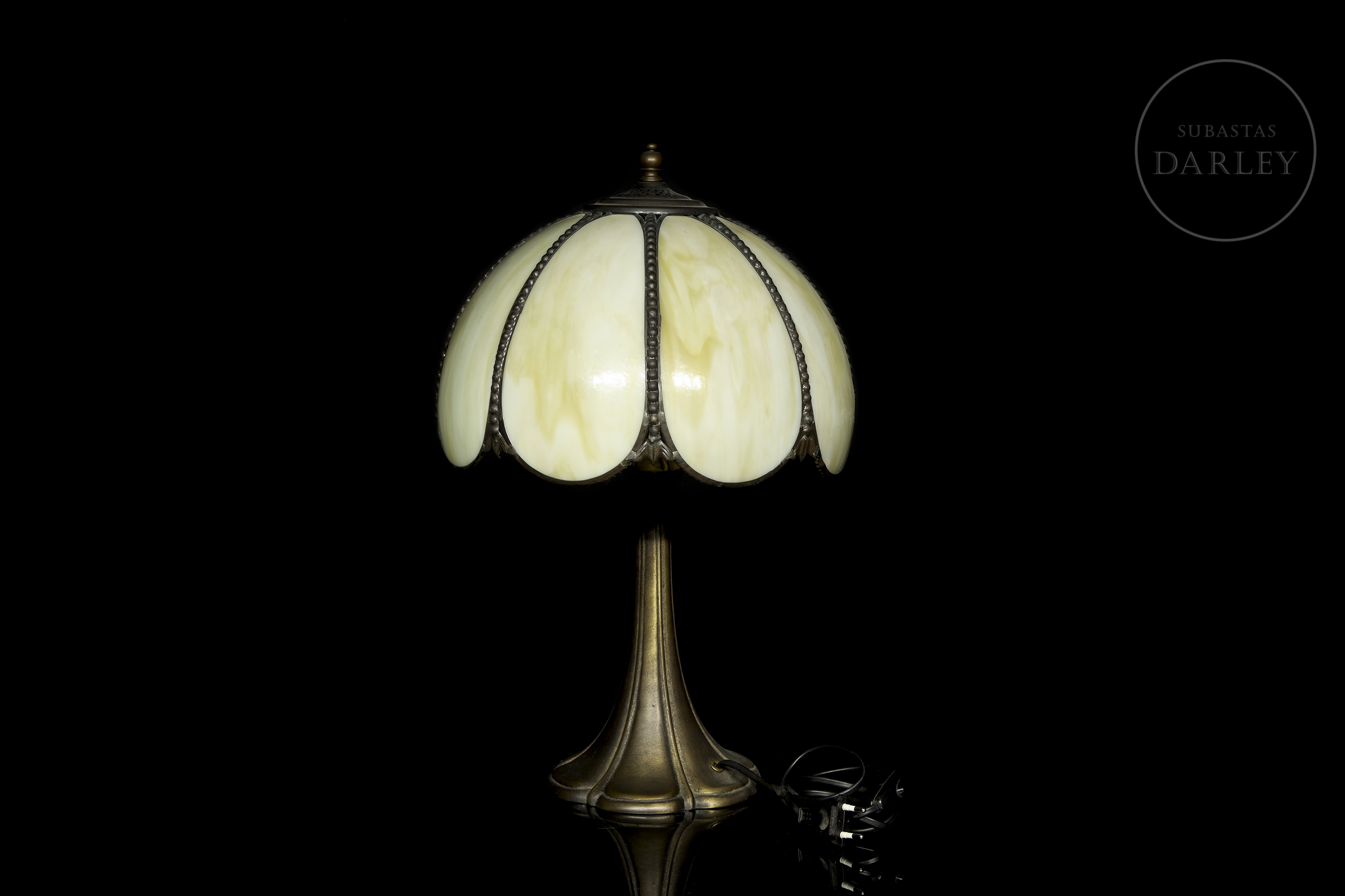 Lámpara con pantalla semiesférica compuesta por seis gajos de vidrio opalino en tonos crema, unidos por una estructura metálica con remate de cuentas. La base, de fundición metálica con pátina oscura, presenta una silueta acampanada y orgánica.