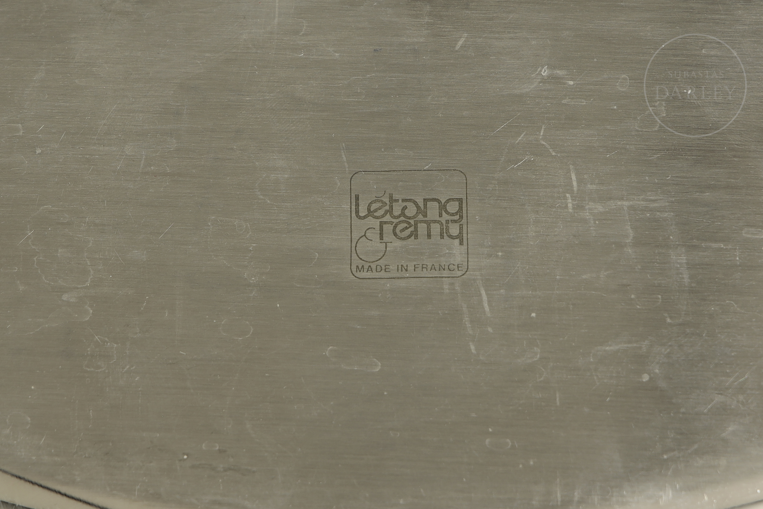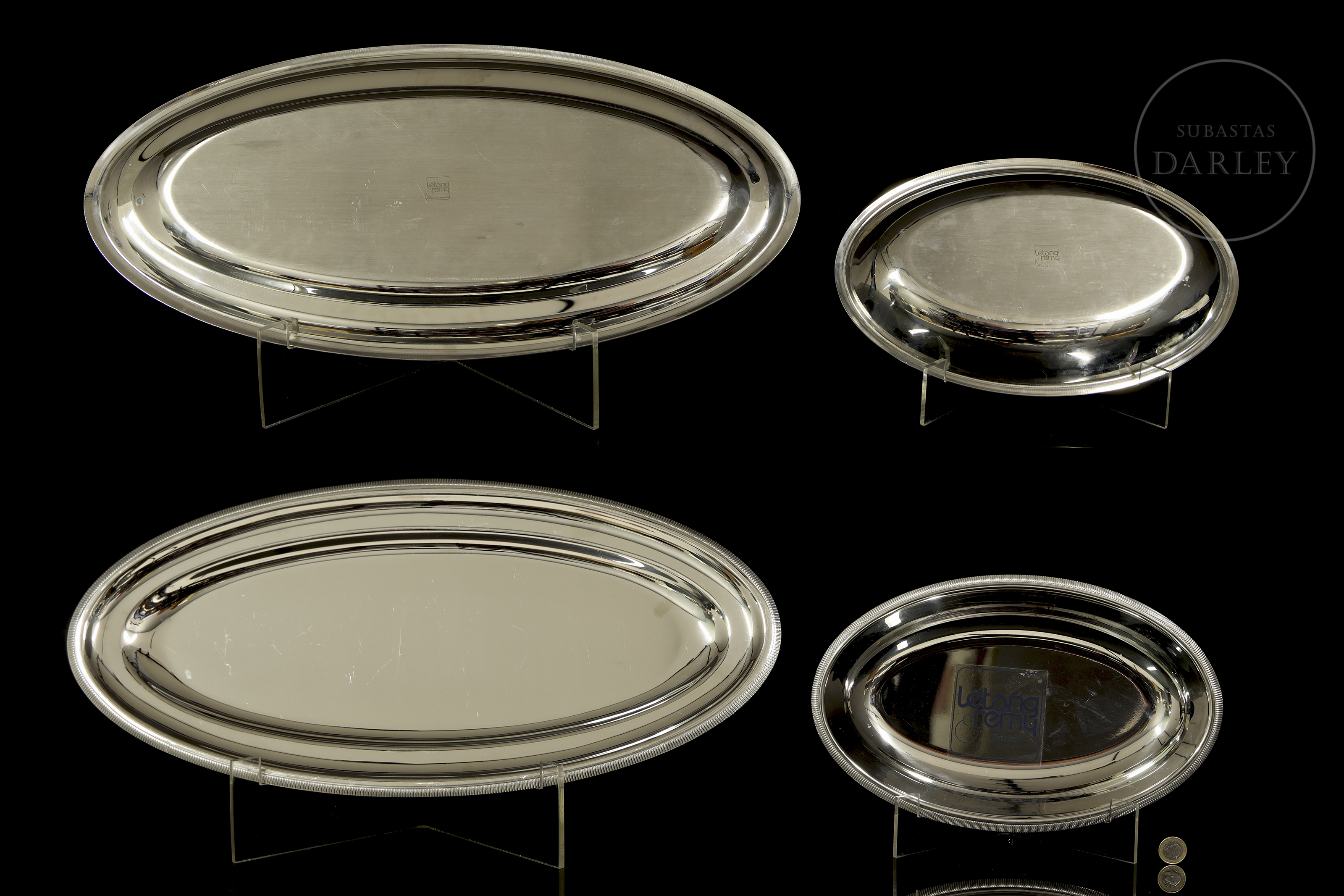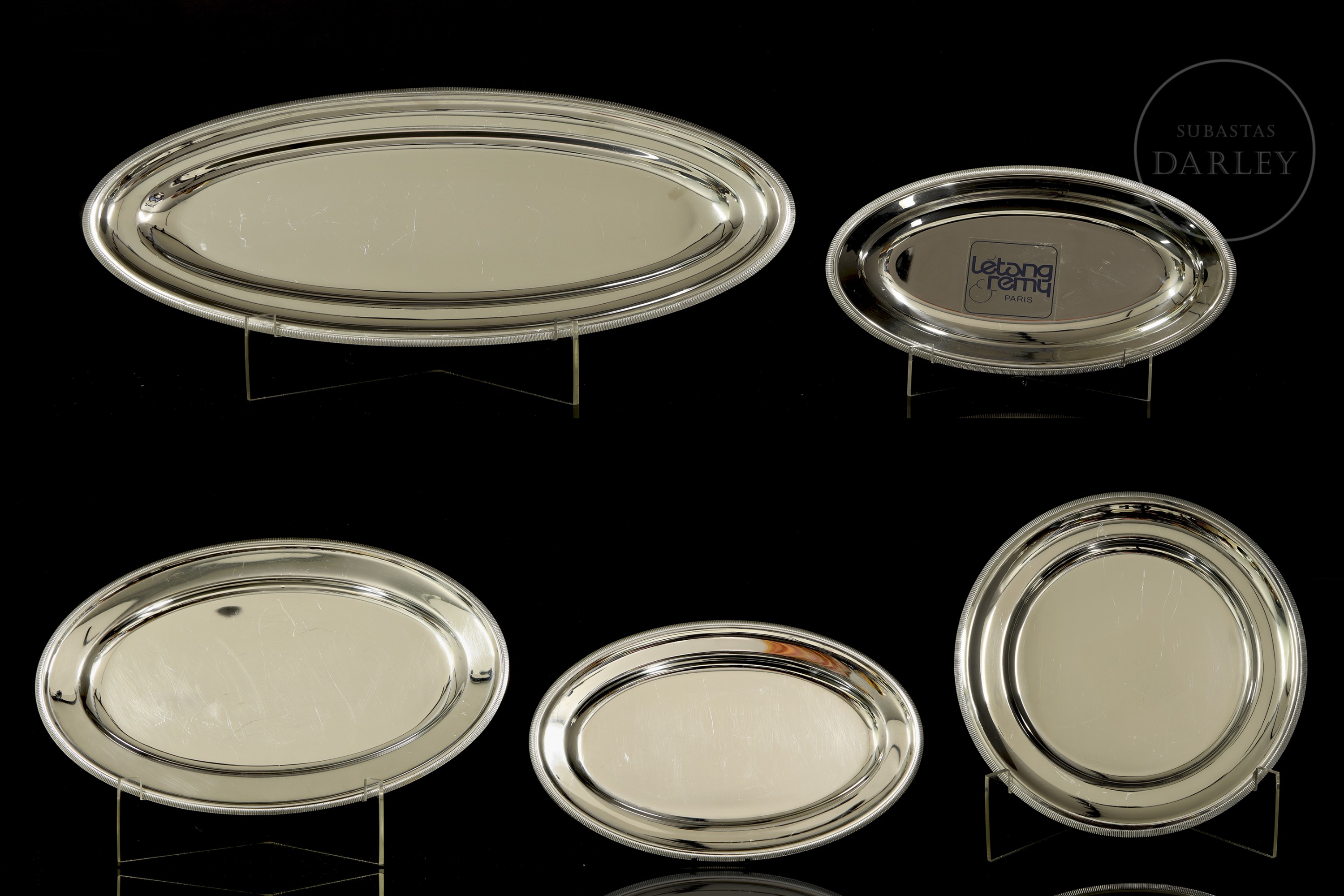 Lote compuesto por cinco bandejas de acero inoxidable, de la firma francesa Letang & Remy. El conjunto presenta un diseño sobrio de formas elípticas y circulares con un borde finamente moldurado. Con marcas de fabricación en la base.