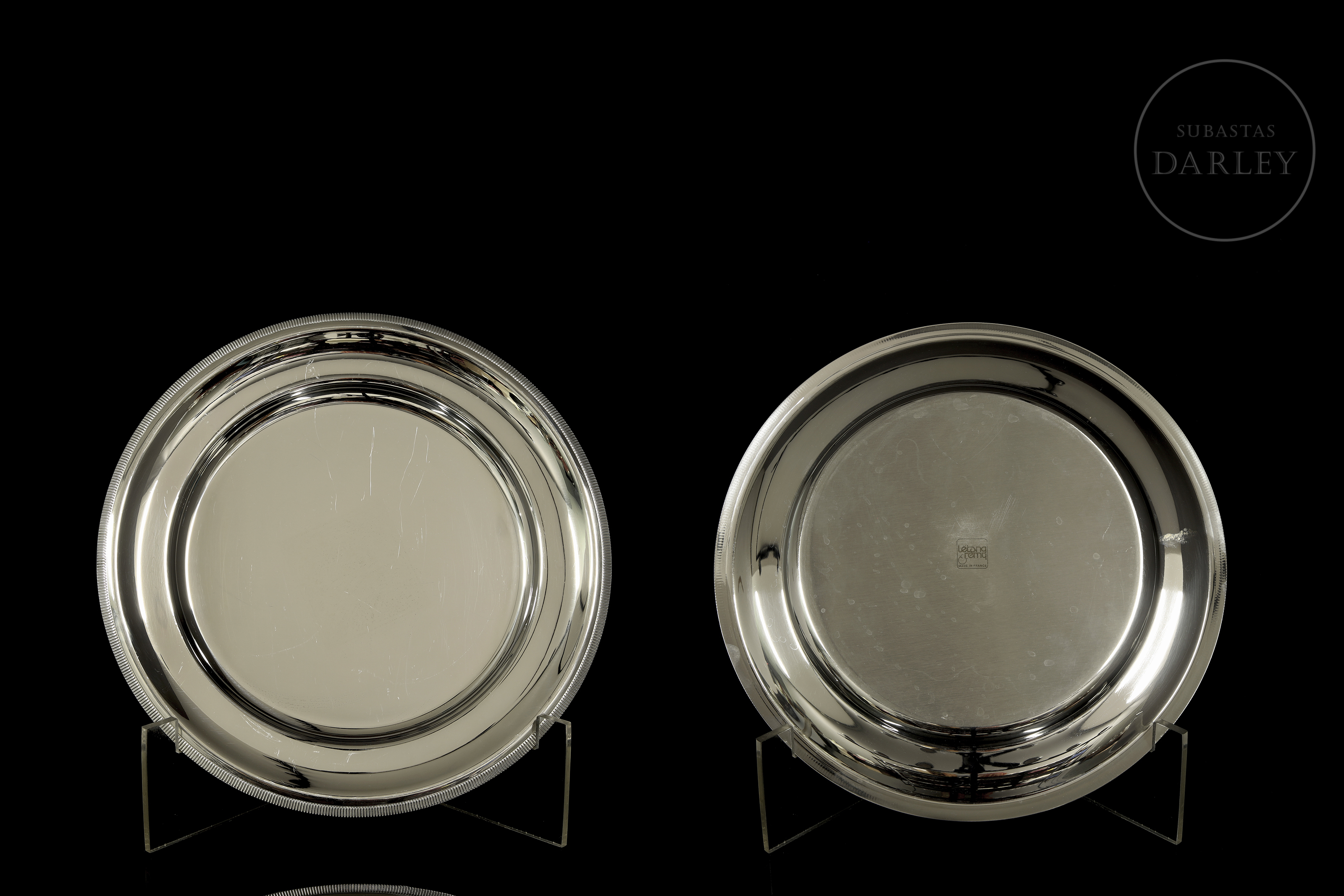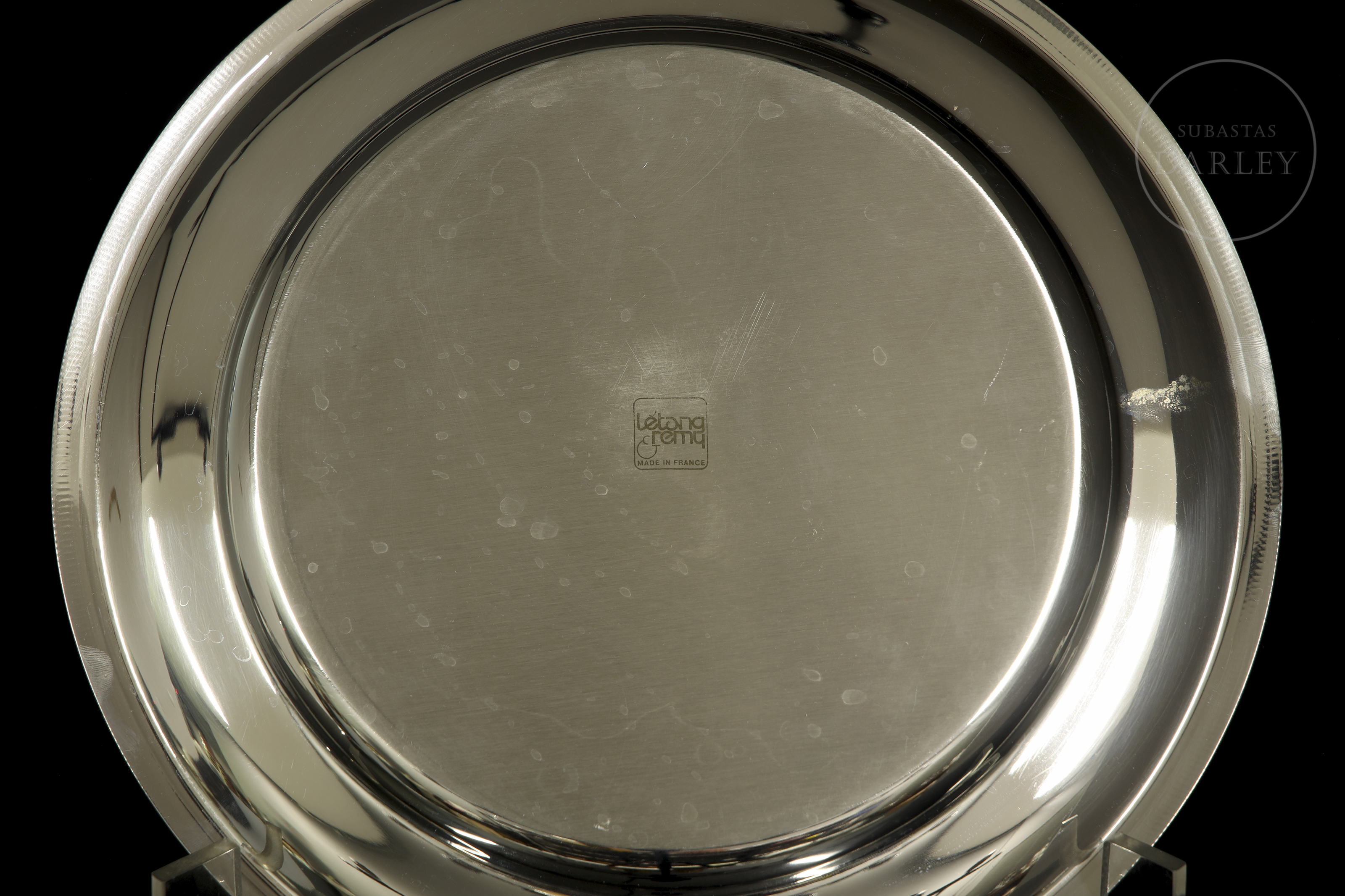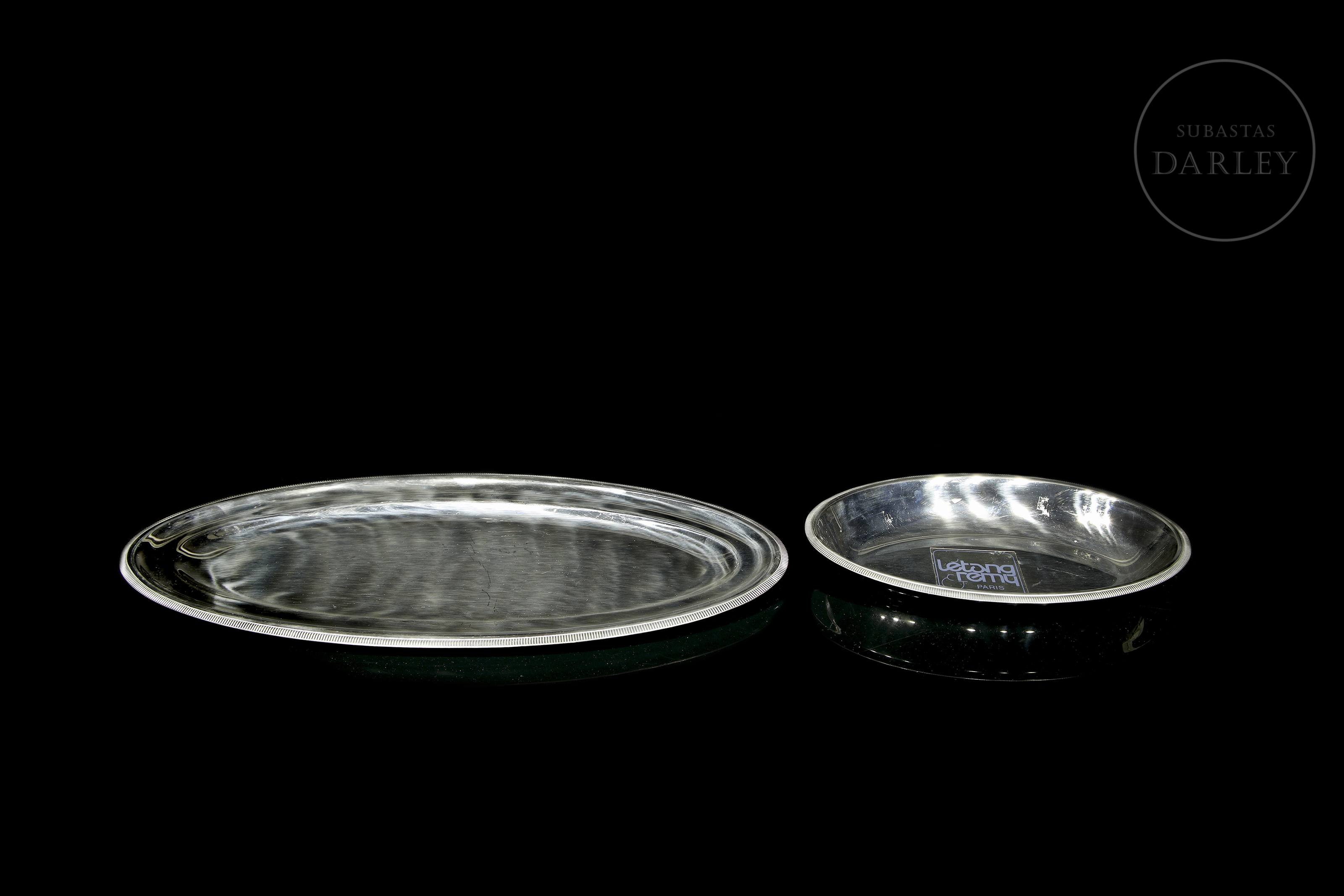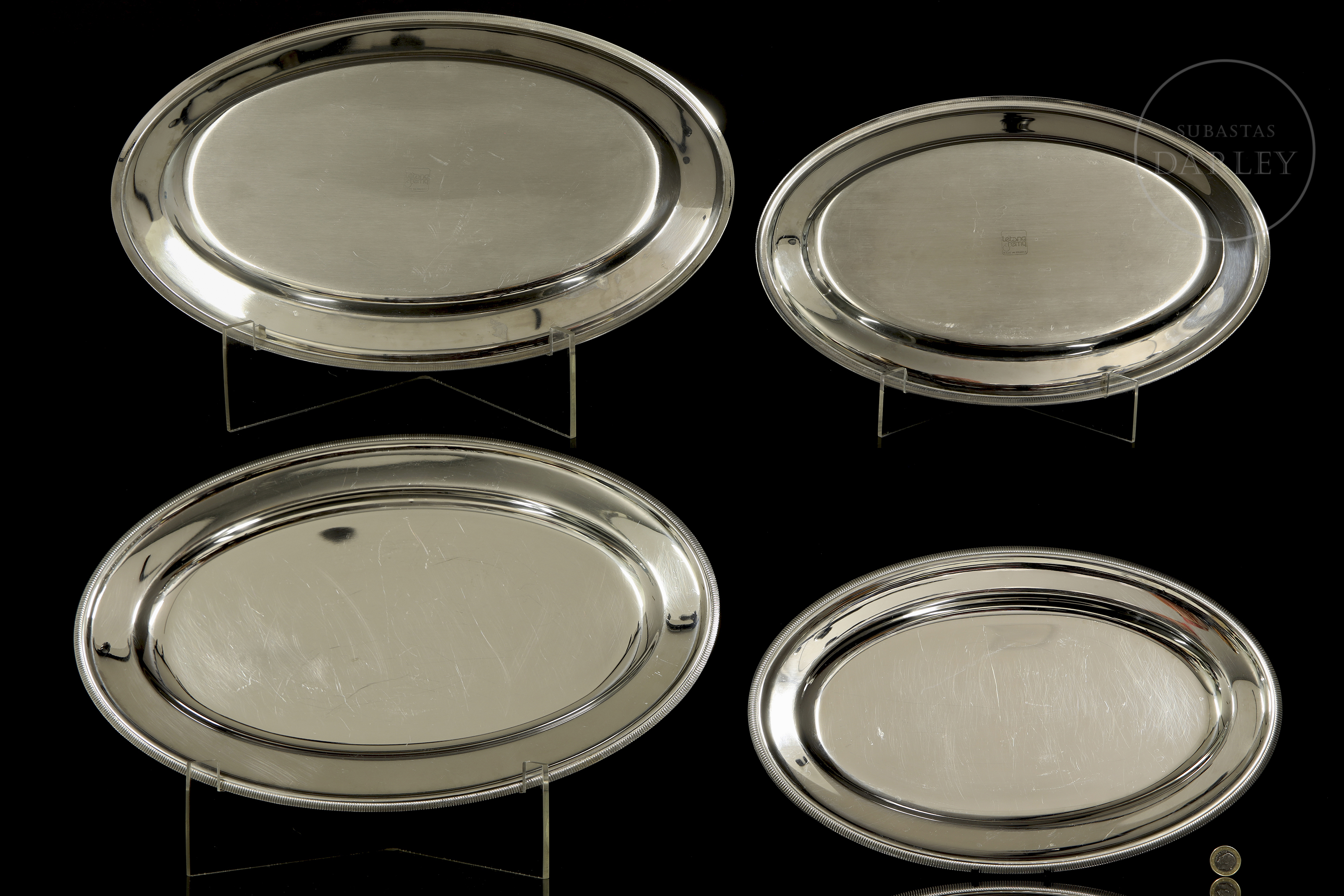 Lote compuesto por cinco bandejas de acero inoxidable, de la firma francesa Letang & Remy. El conjunto presenta un diseño sobrio de formas elípticas y circulares con un borde finamente moldurado. Con marcas de fabricación en la base.