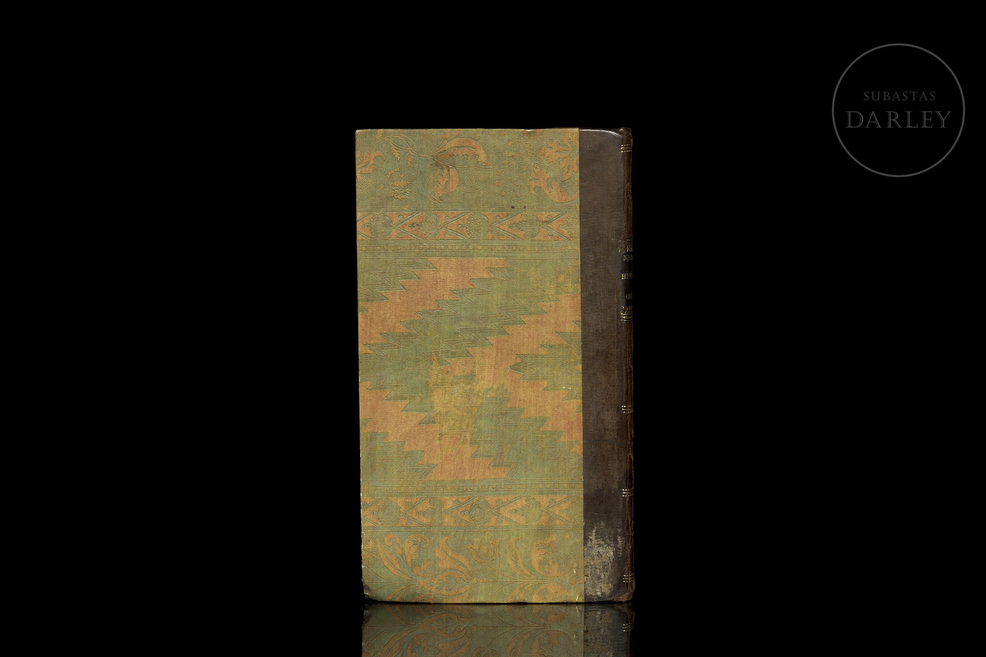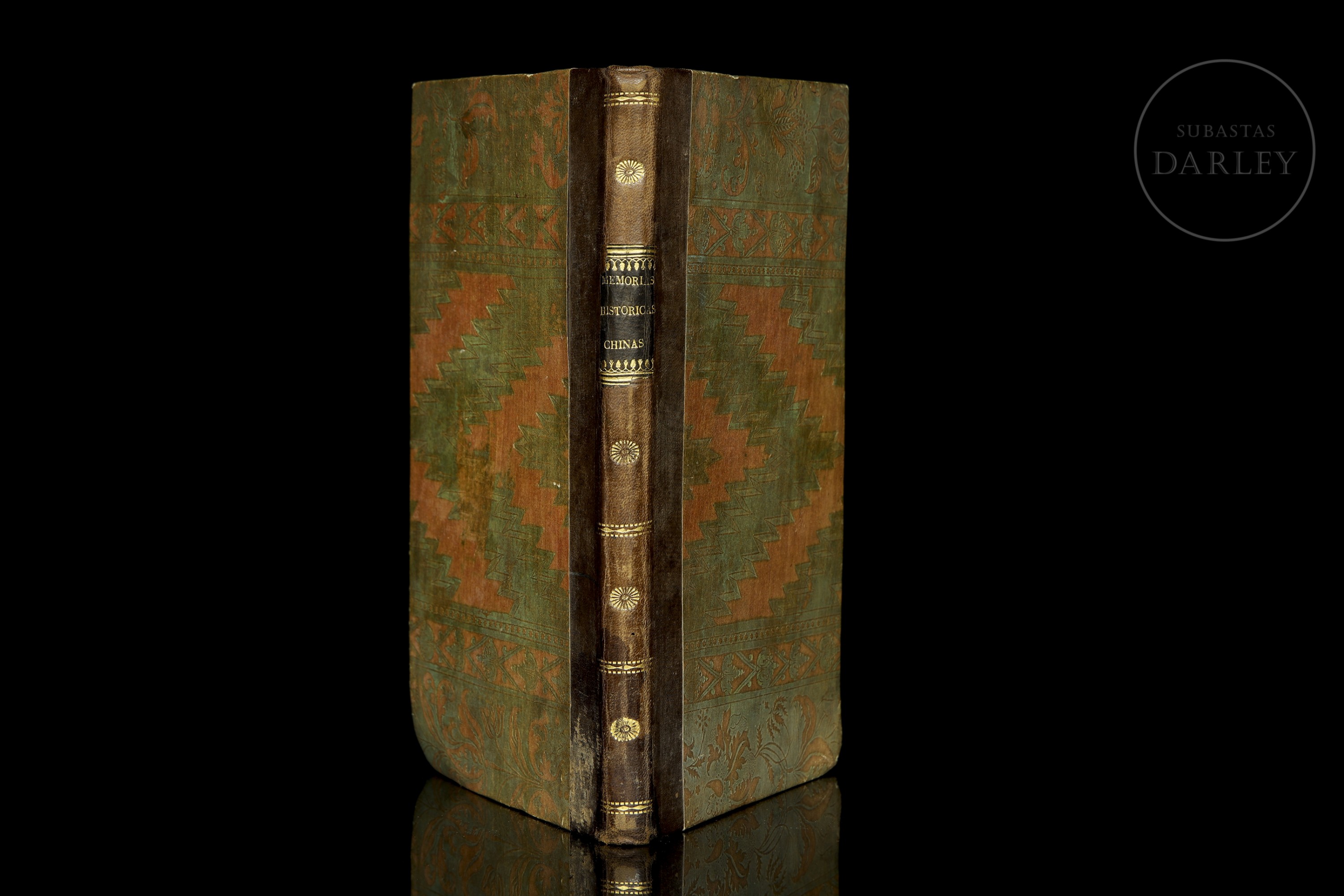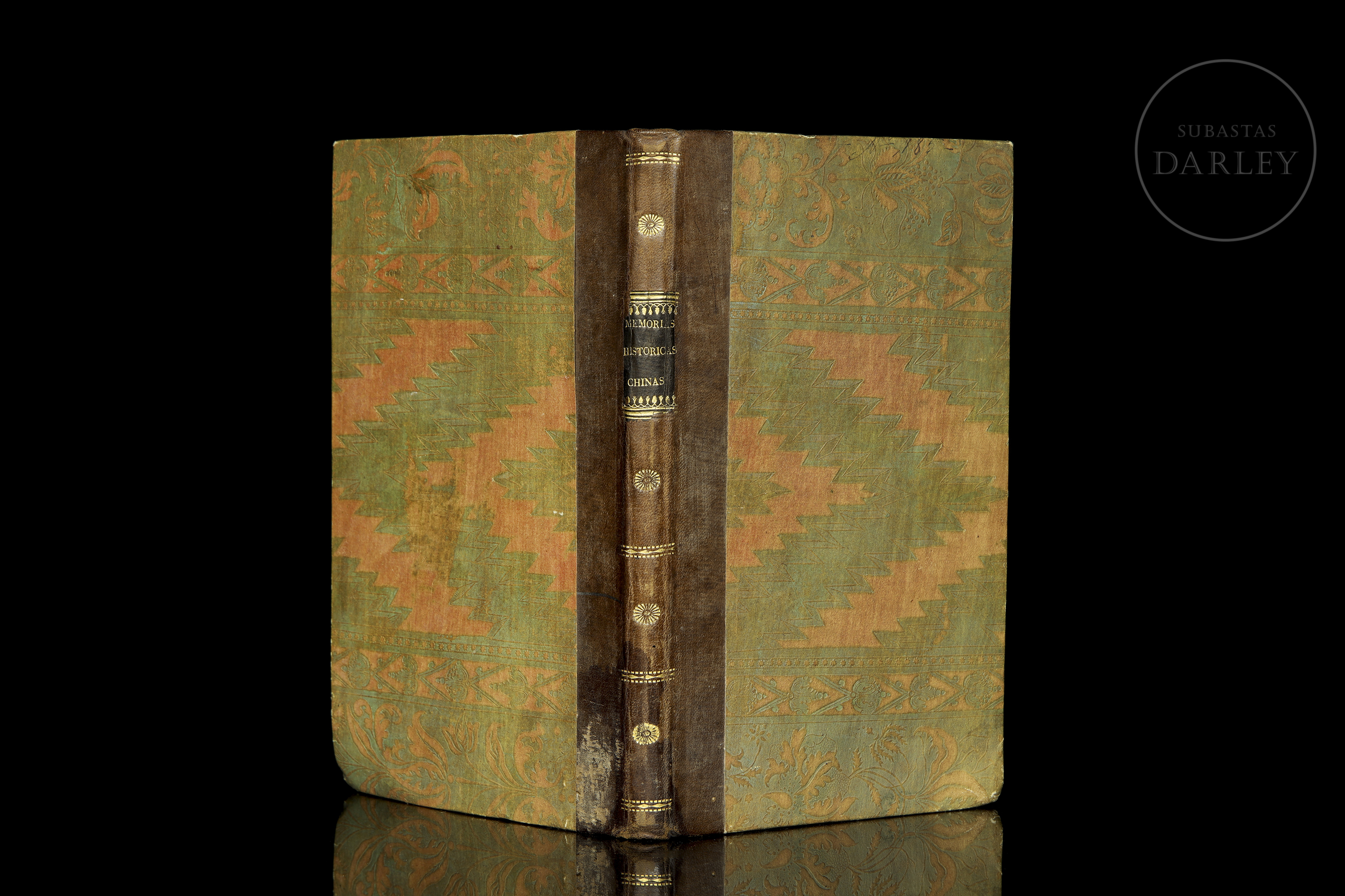 Encuadernado en media piel con lomo de cuero marrón decorado con filetes y florones dorados, y planos revestidos en papel jaspeado con motivos geométricos y vegetales en tonos verdes y anaranjados. El interior contiene texto estampado en caracteres chinos mediante xilografía tradicional sobre papel fino. En buen estado de conservación.
